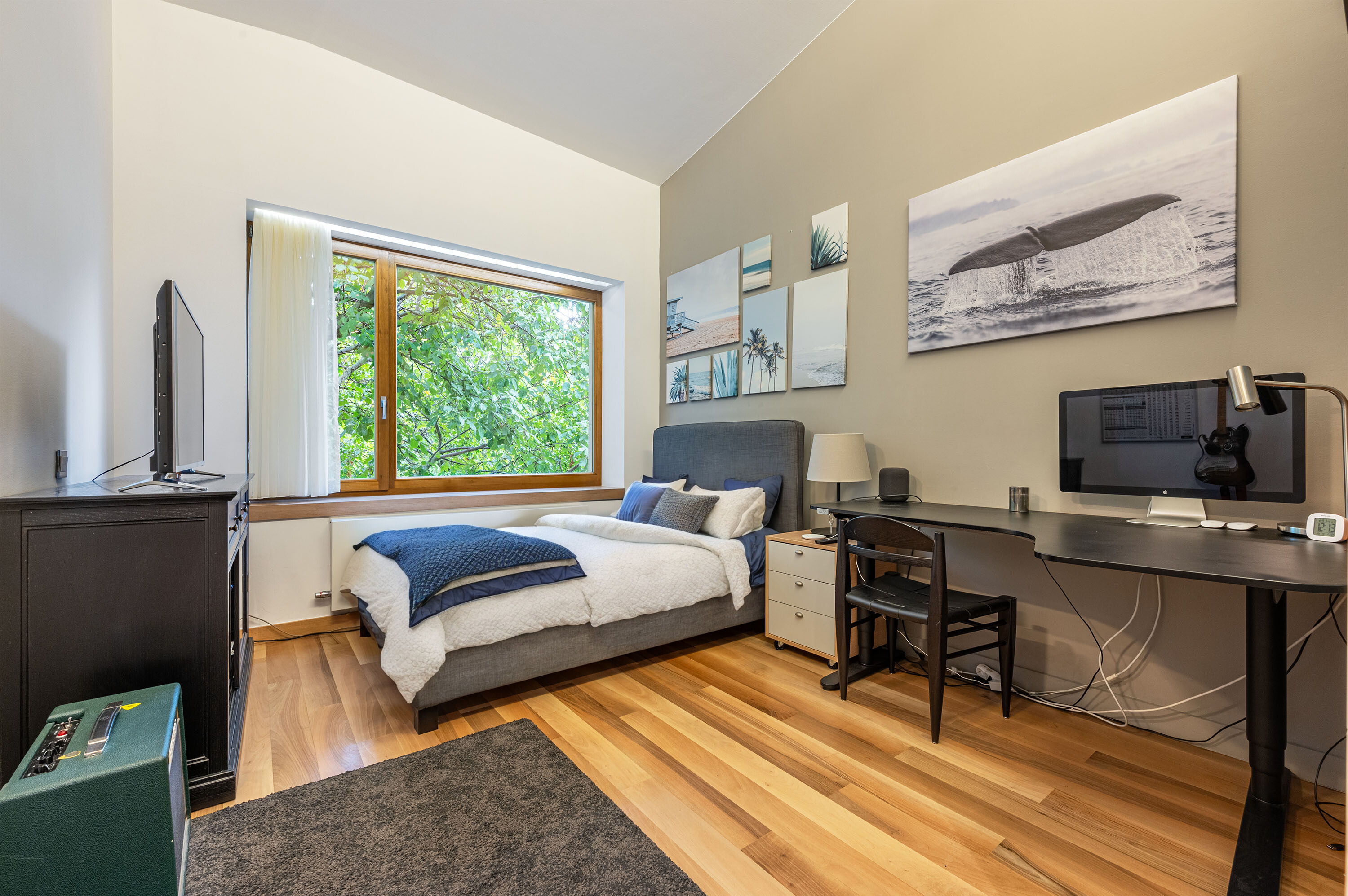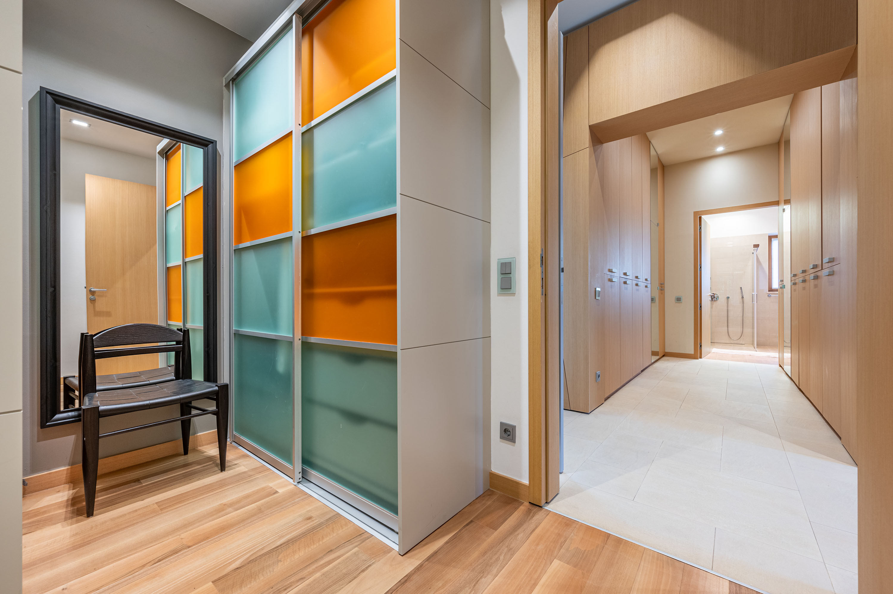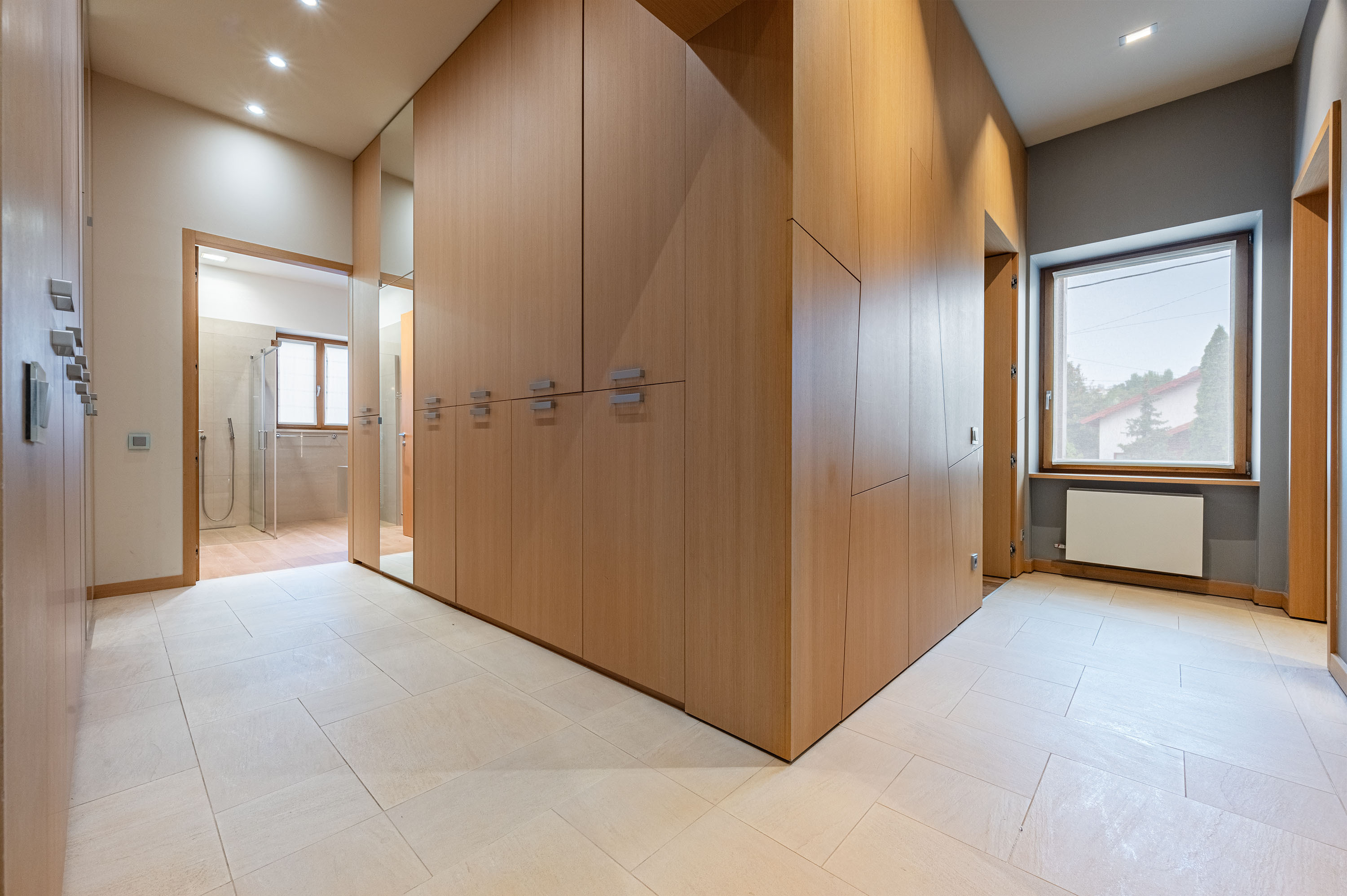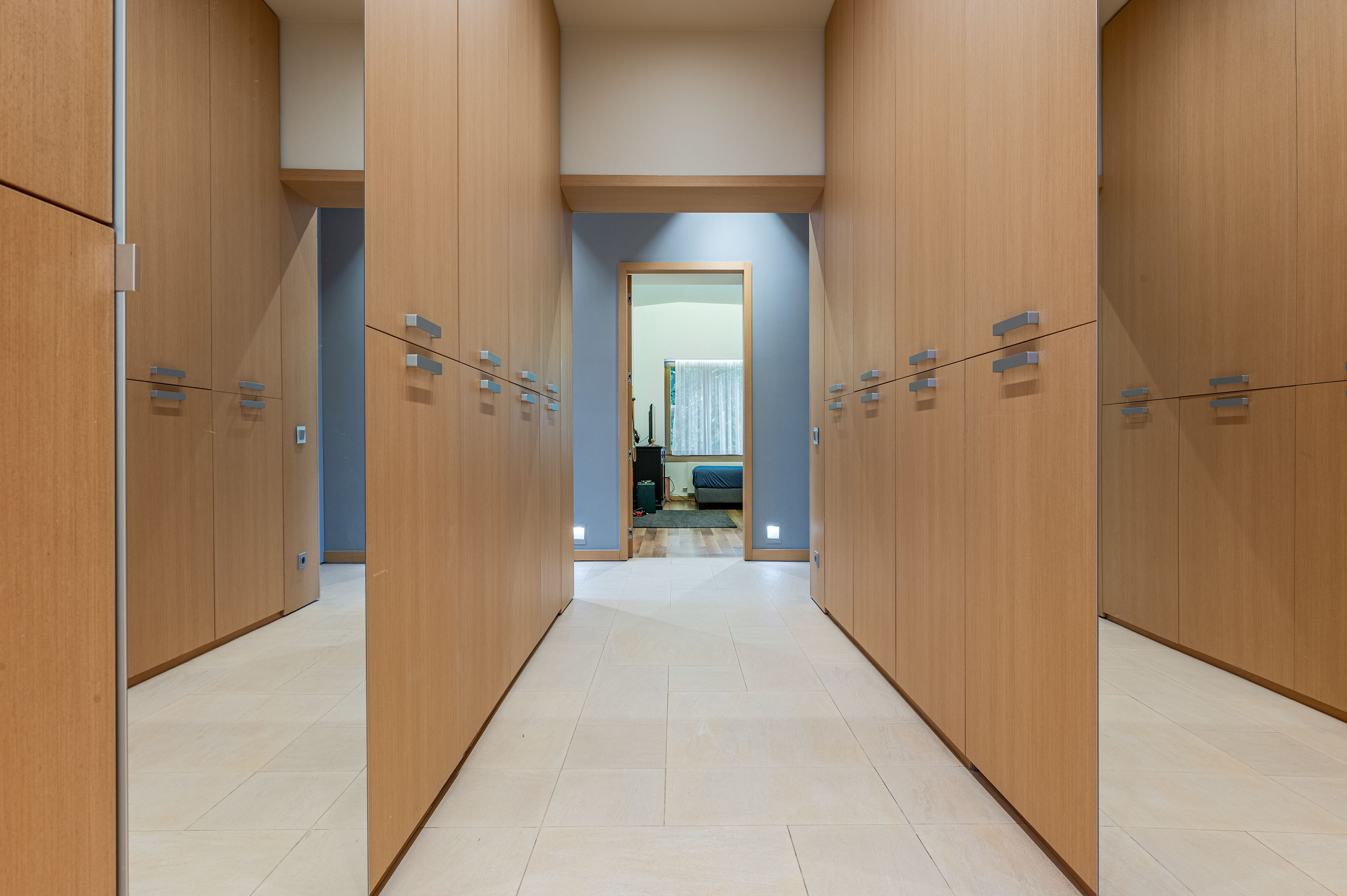 The bedrooms are located upstairs. Each is equipped with a large walk-in closet or wardrobe system. Each has a bathroom.