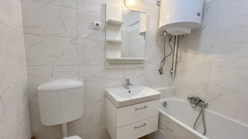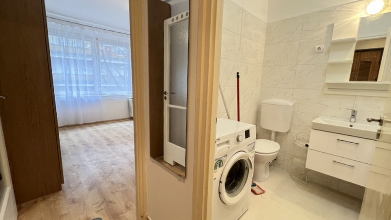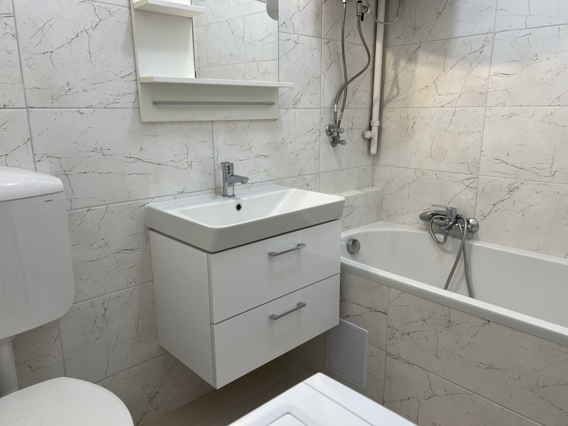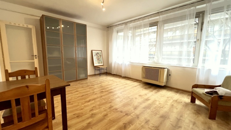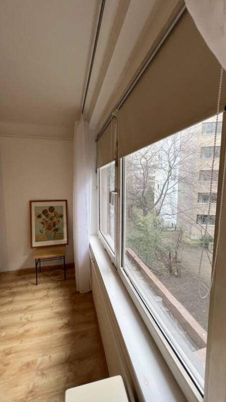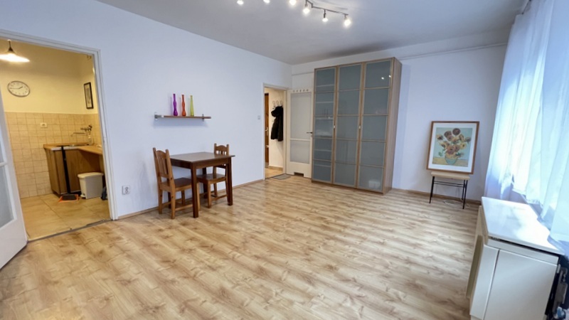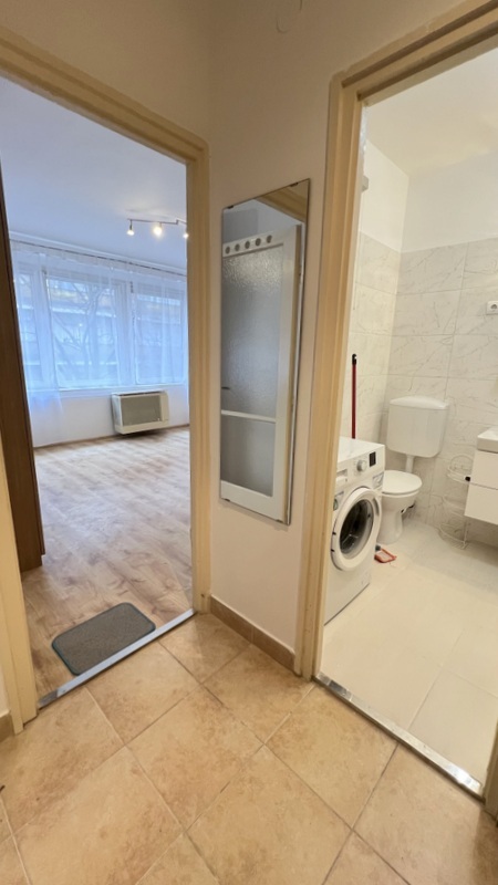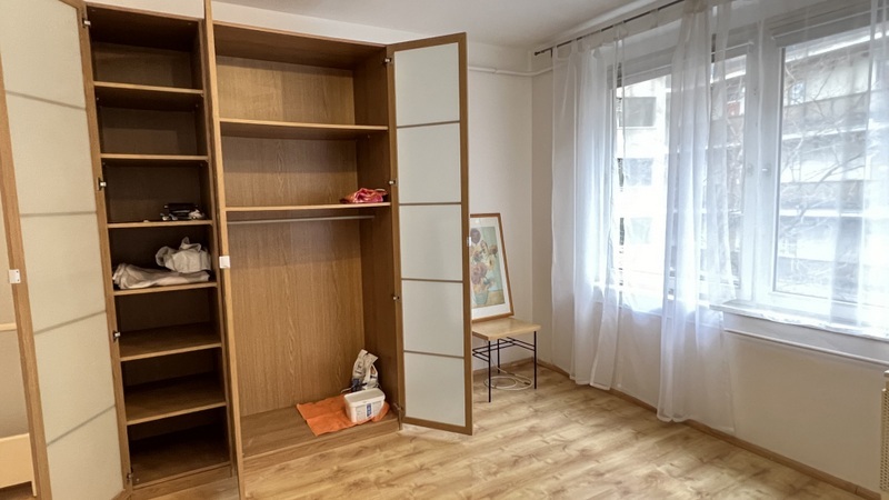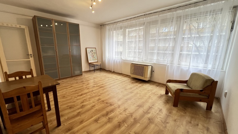 A lakás elosztása szerint: előszoba, onnan nyílik a frissen felújított fürdőszoba káddal és WC-vel. A fürdőszobafelújítás utáni első lakóját várja a lakás. Az előszobából a szoba (cca. 20nm) nyílik, amelyet szép laminált padló borít. A szoba teljes hosszában ablakos. Az ablakokon sötétítő roló is található. A nyílászárók a teli fás, zöld, zárt, csendes belső kertre néznek. Az ablakok előtt nagyméretű beton balkonládák találhatók, amelyekbe a bérlő ültethet bármilyen növényt, akár mini veteményt. A szobában található még egy gardróbszekrény is és egy két személyes ebédlőasztal.