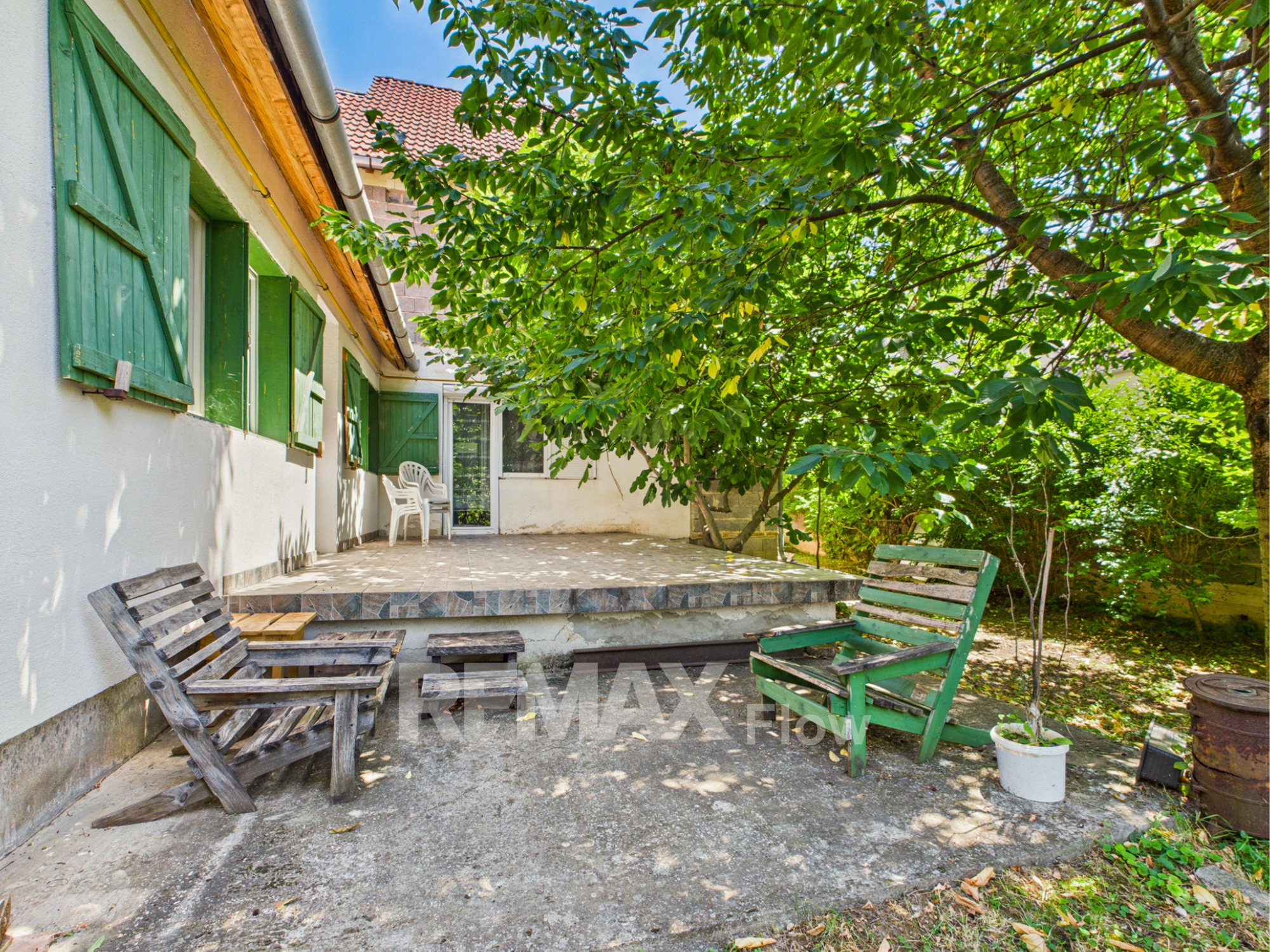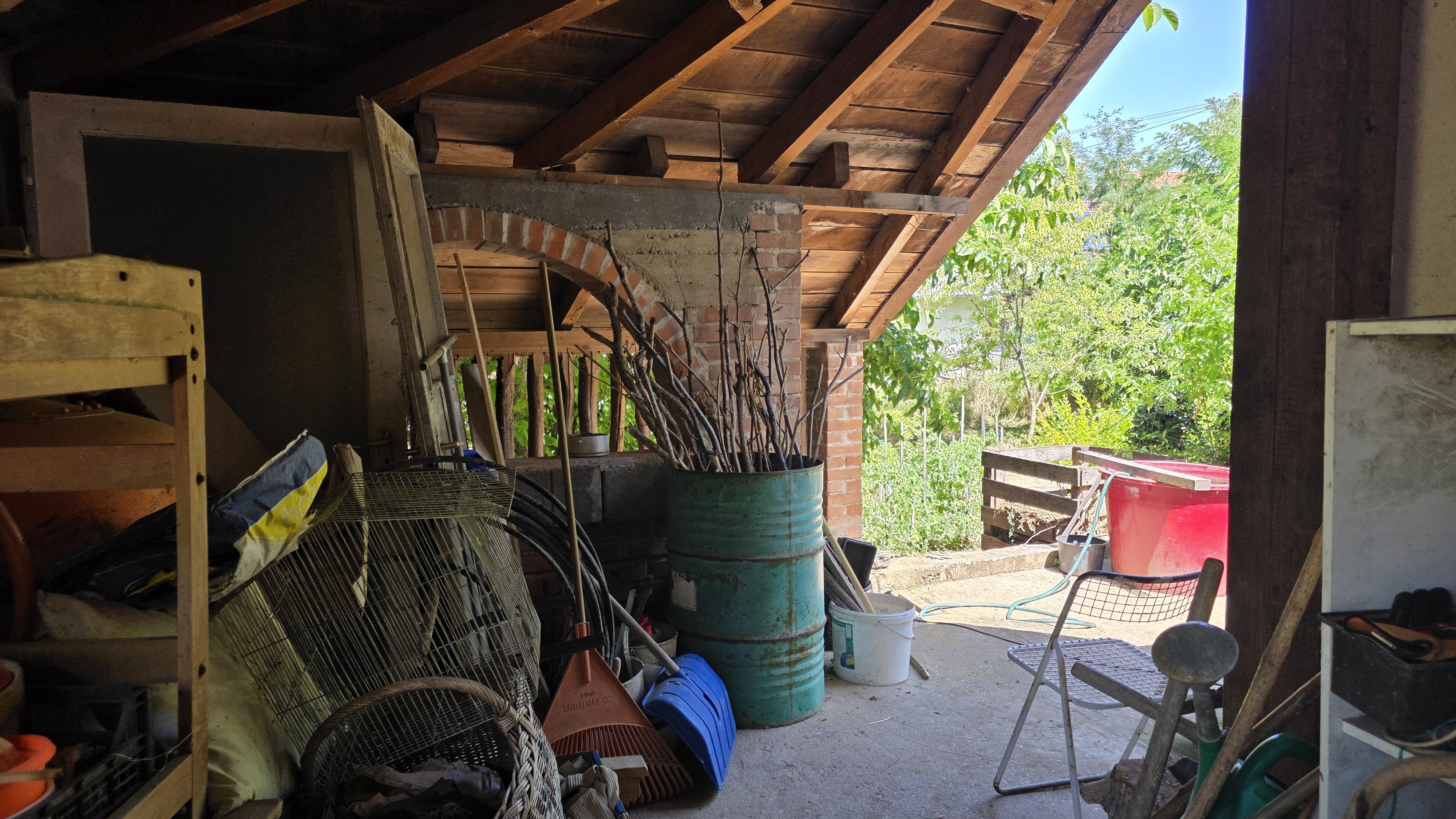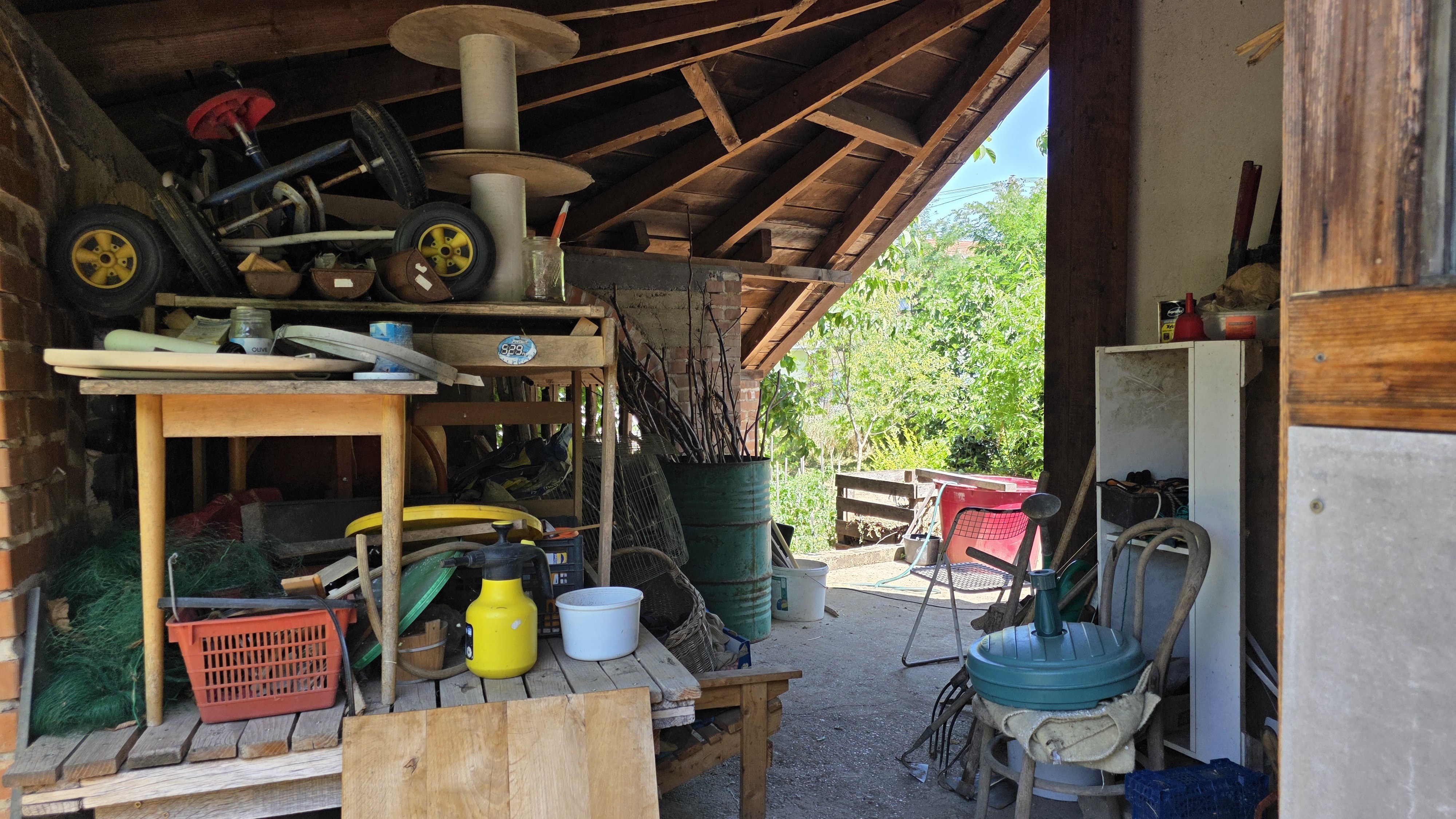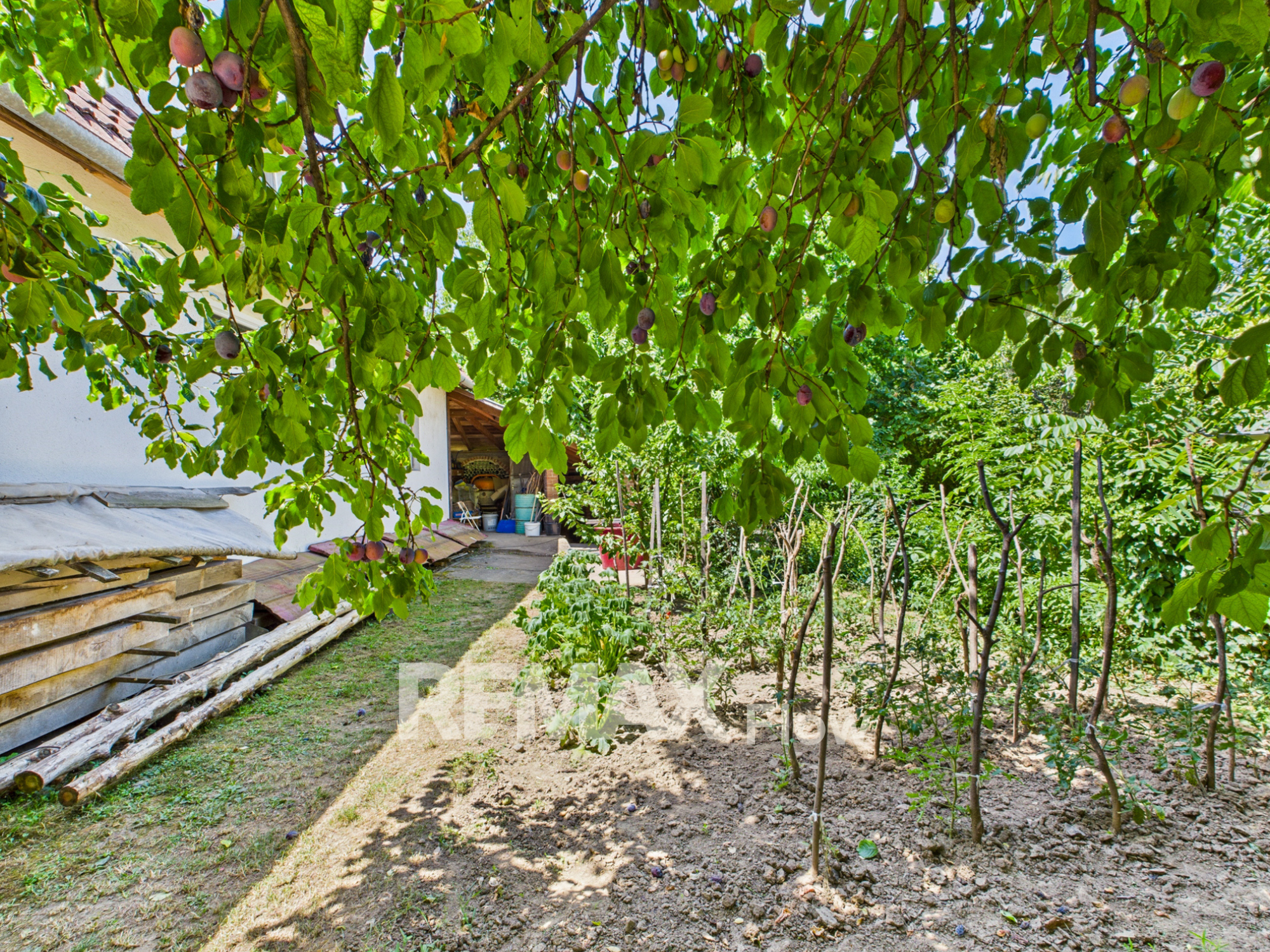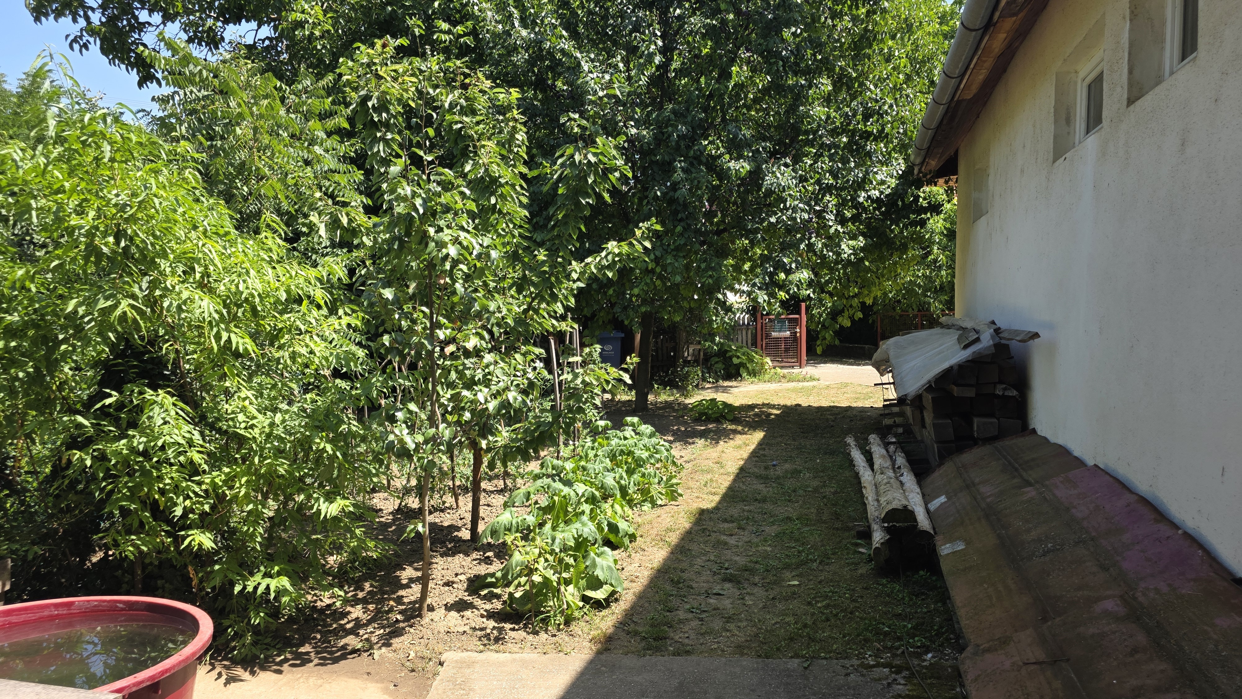 Az 768 m²-es, gondozott telken veteményes, gyümölcsfák és egy 5-6 méter mély ásott kút is található. A házhoz tartozik továbbá egy garázs, pince, valamint egy fedett tároló is.