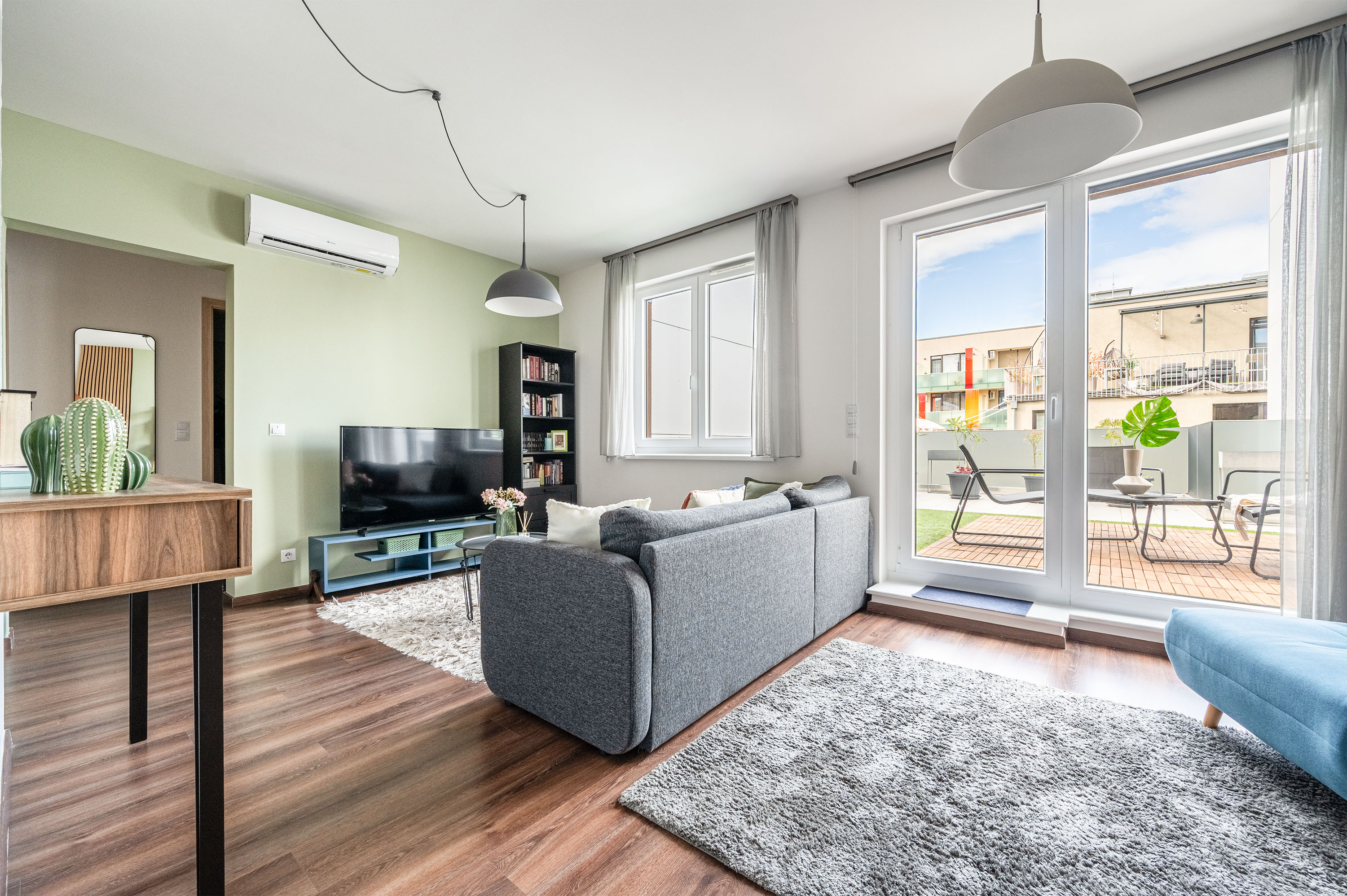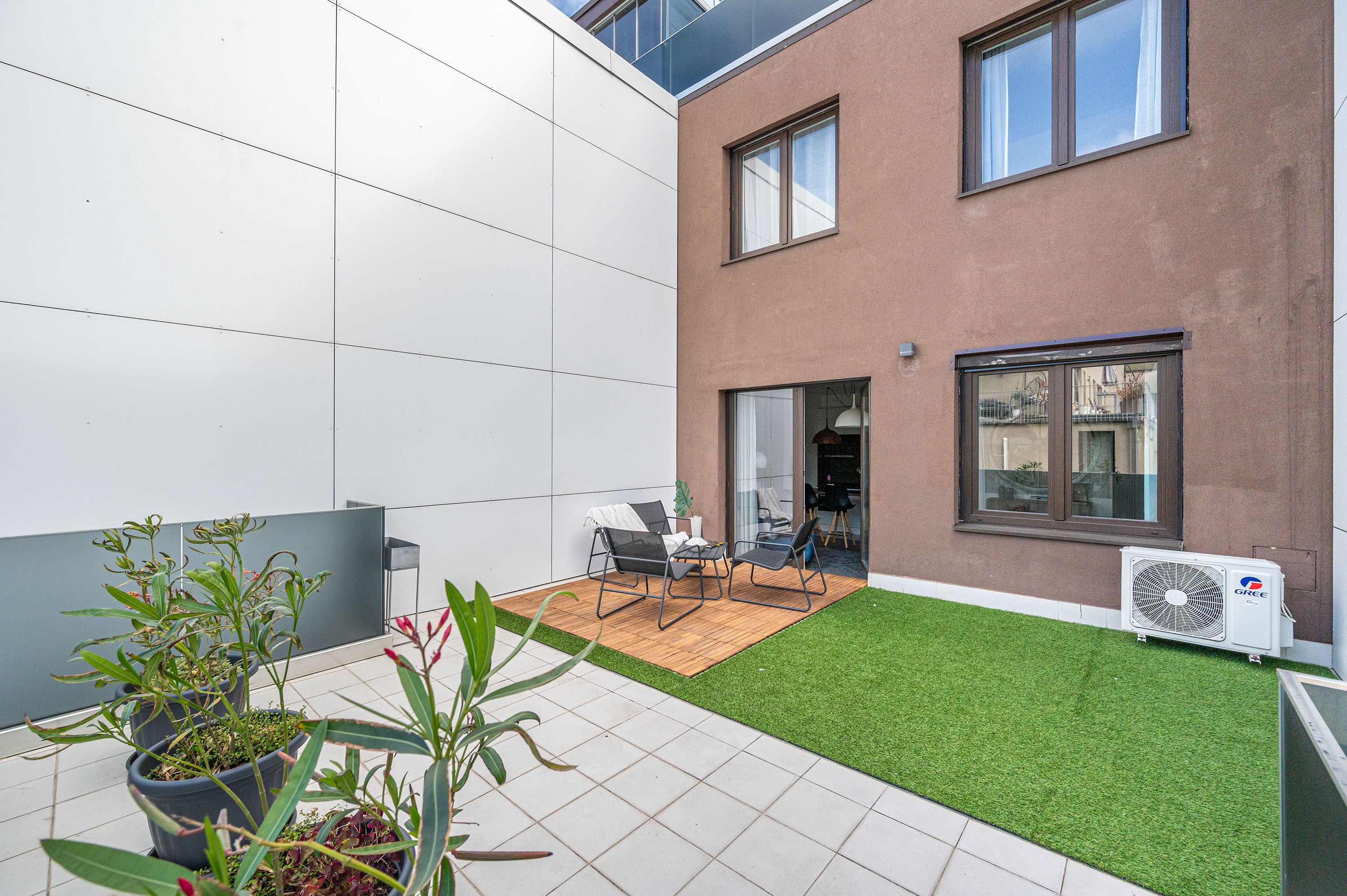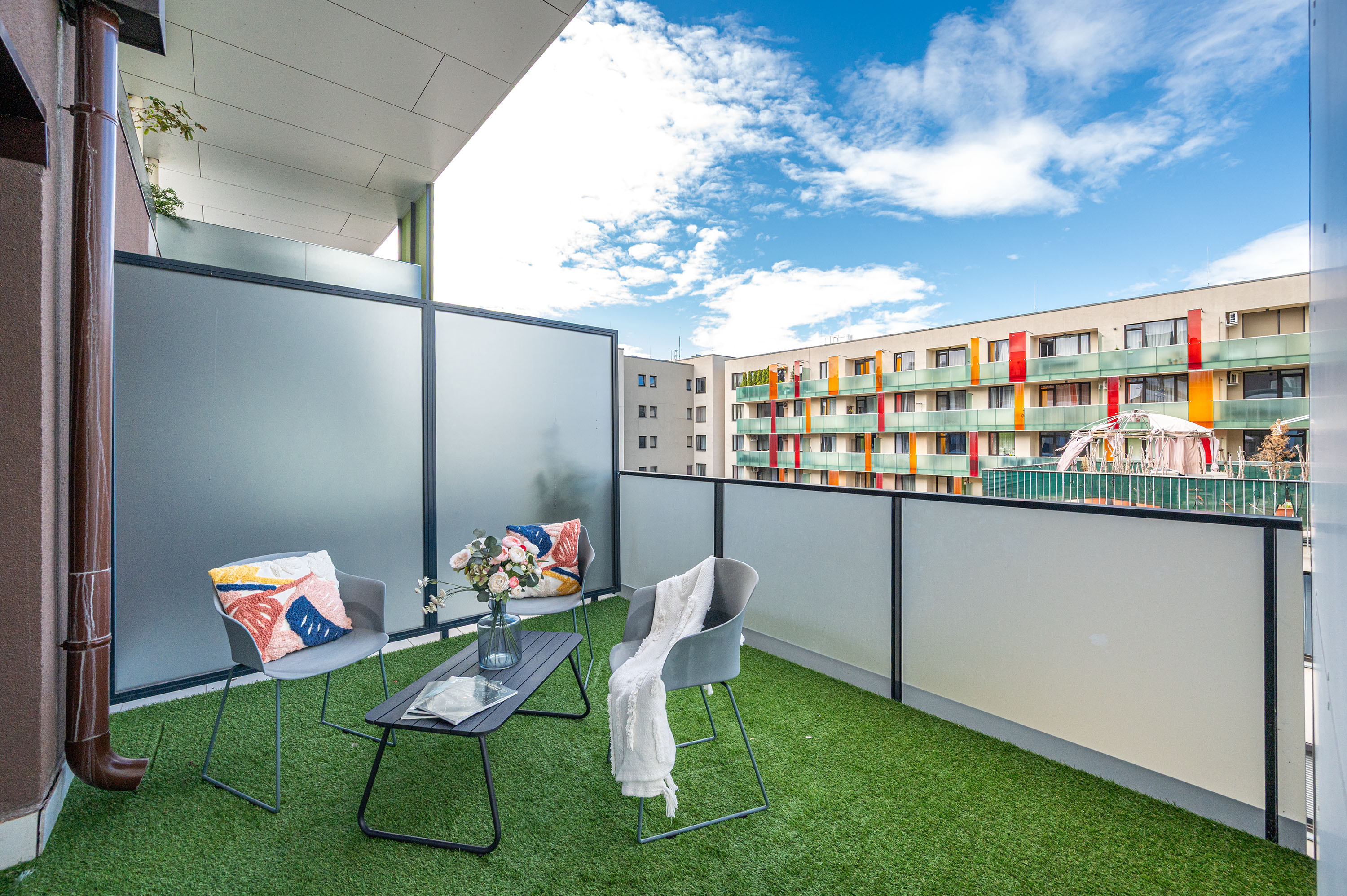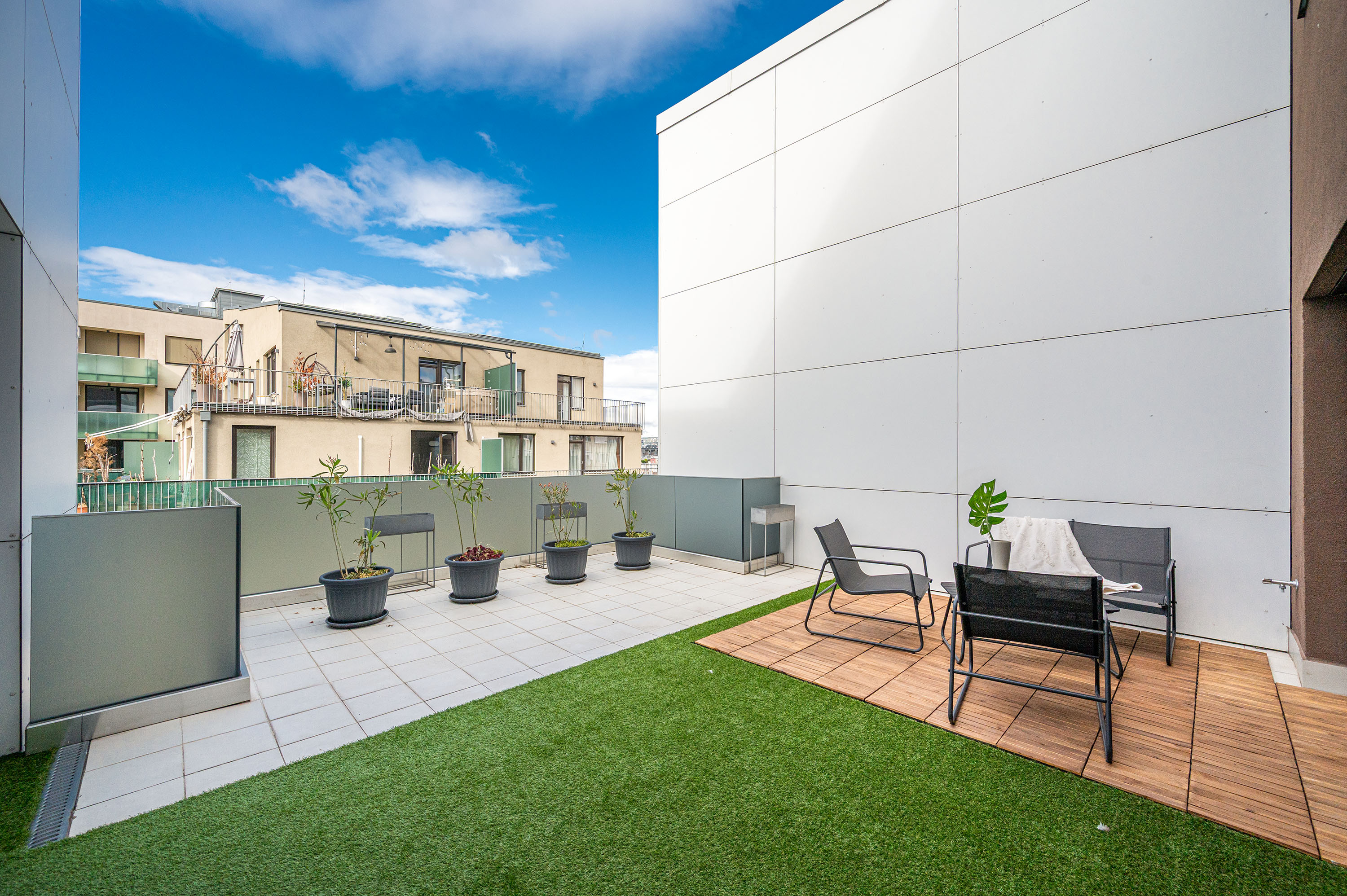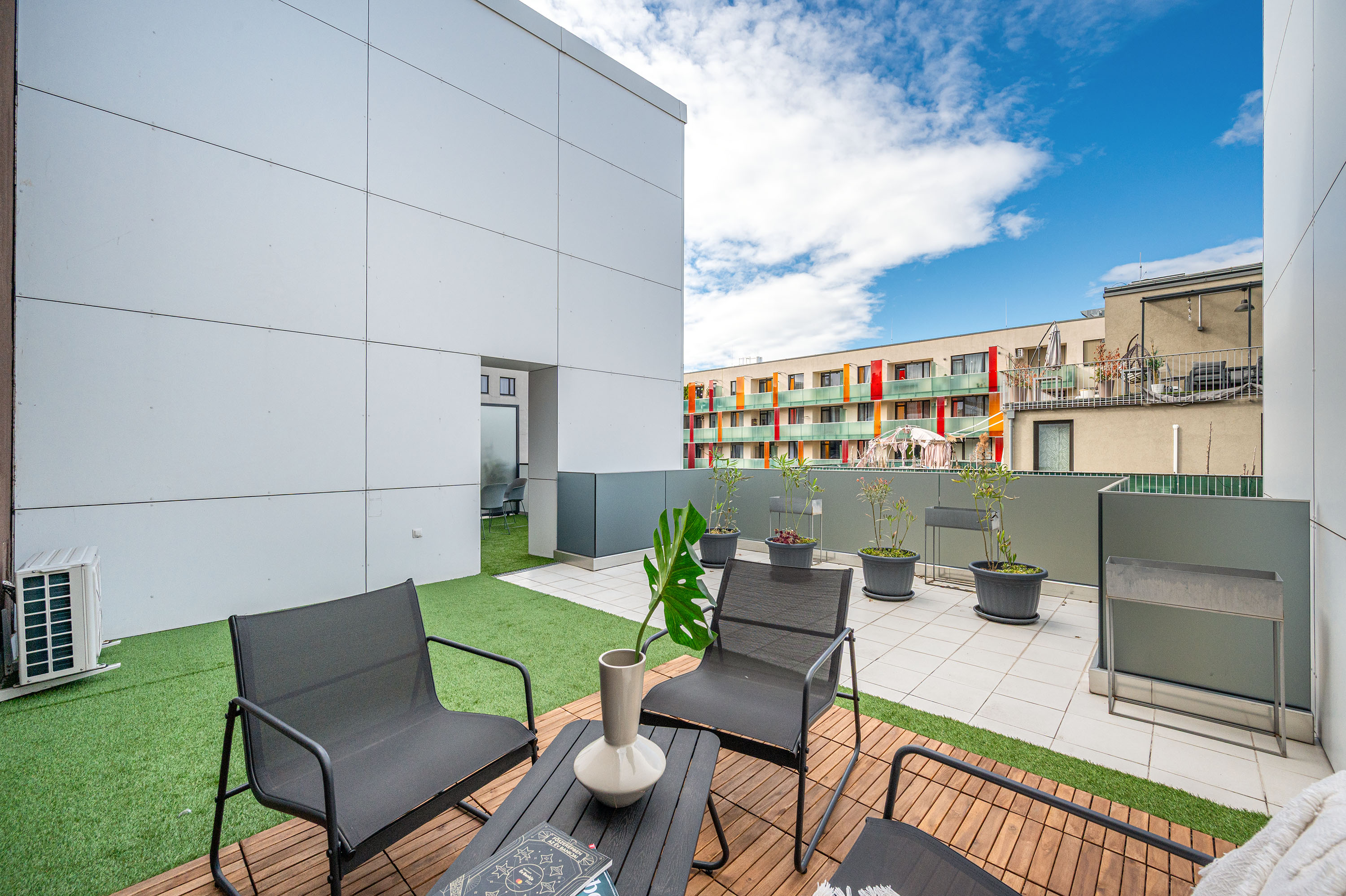 A lakás terasza egy csendes utcára néz (Leonardo da Vinci utca)