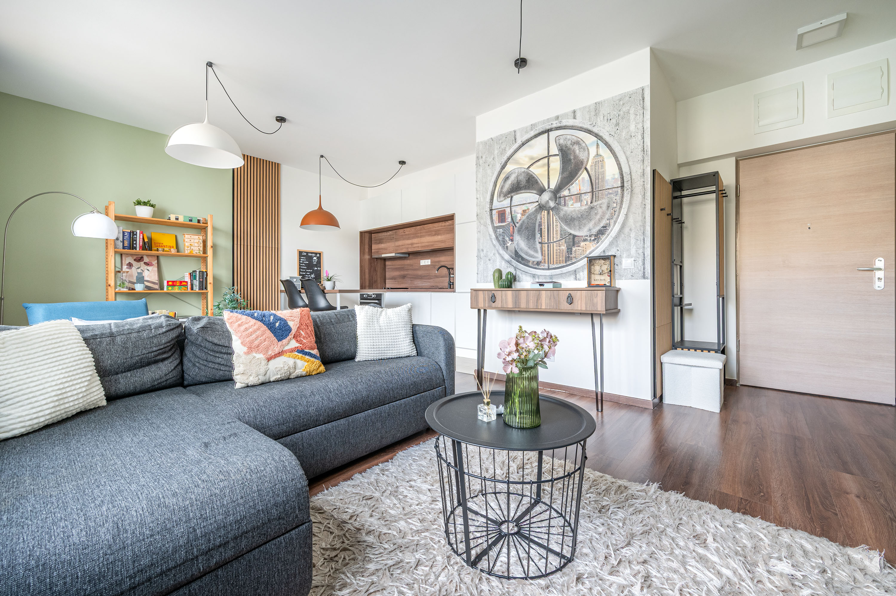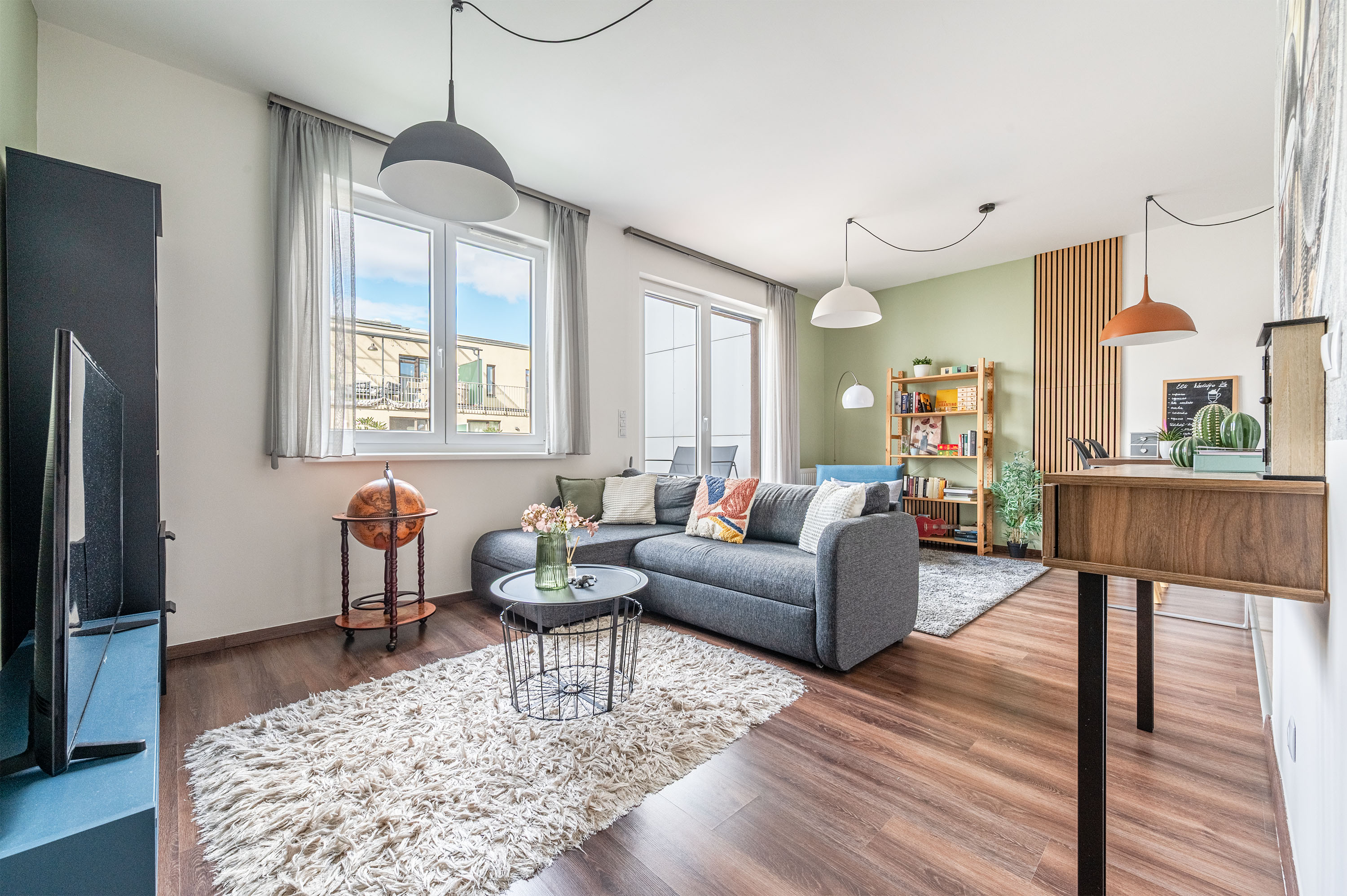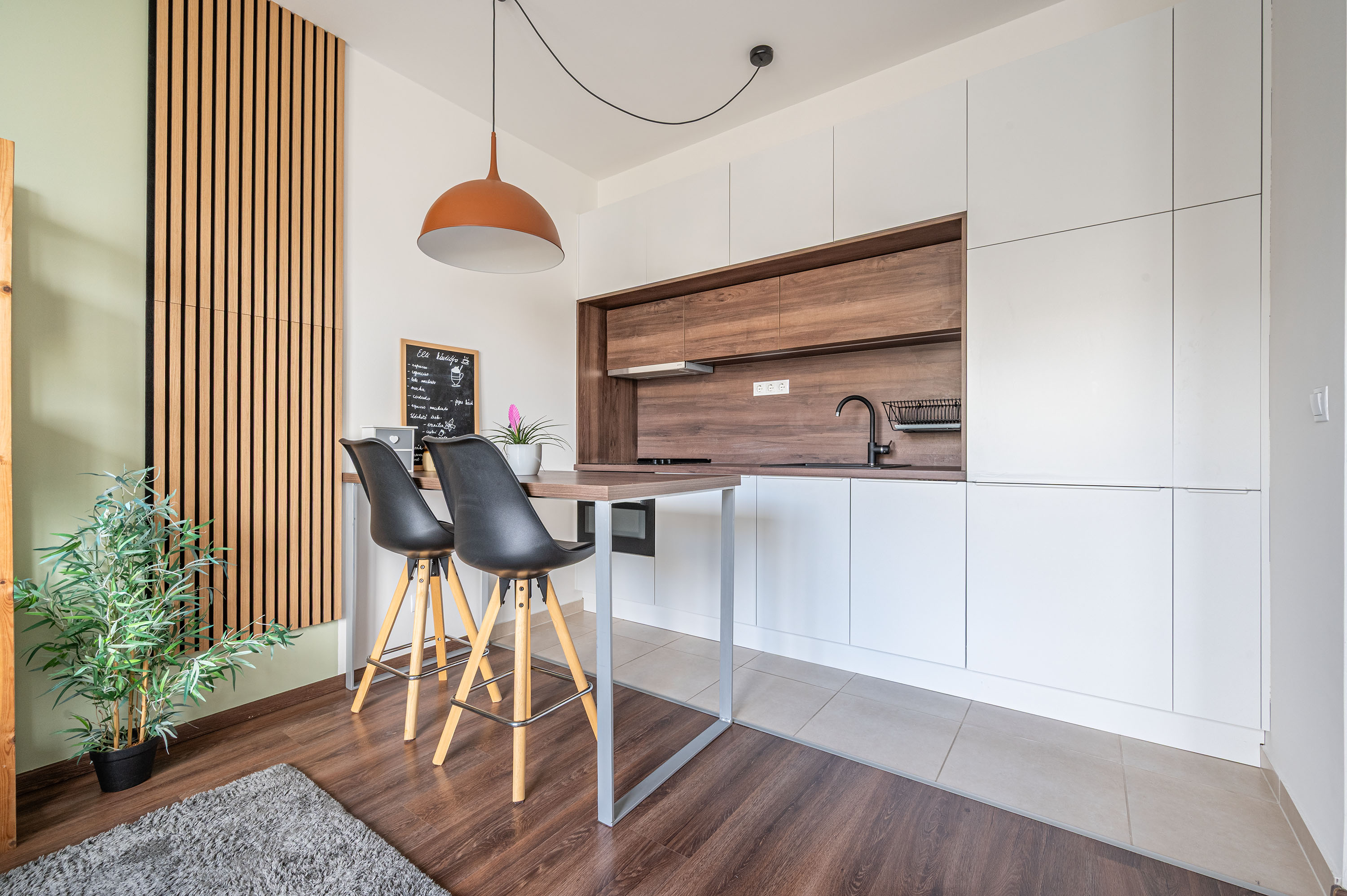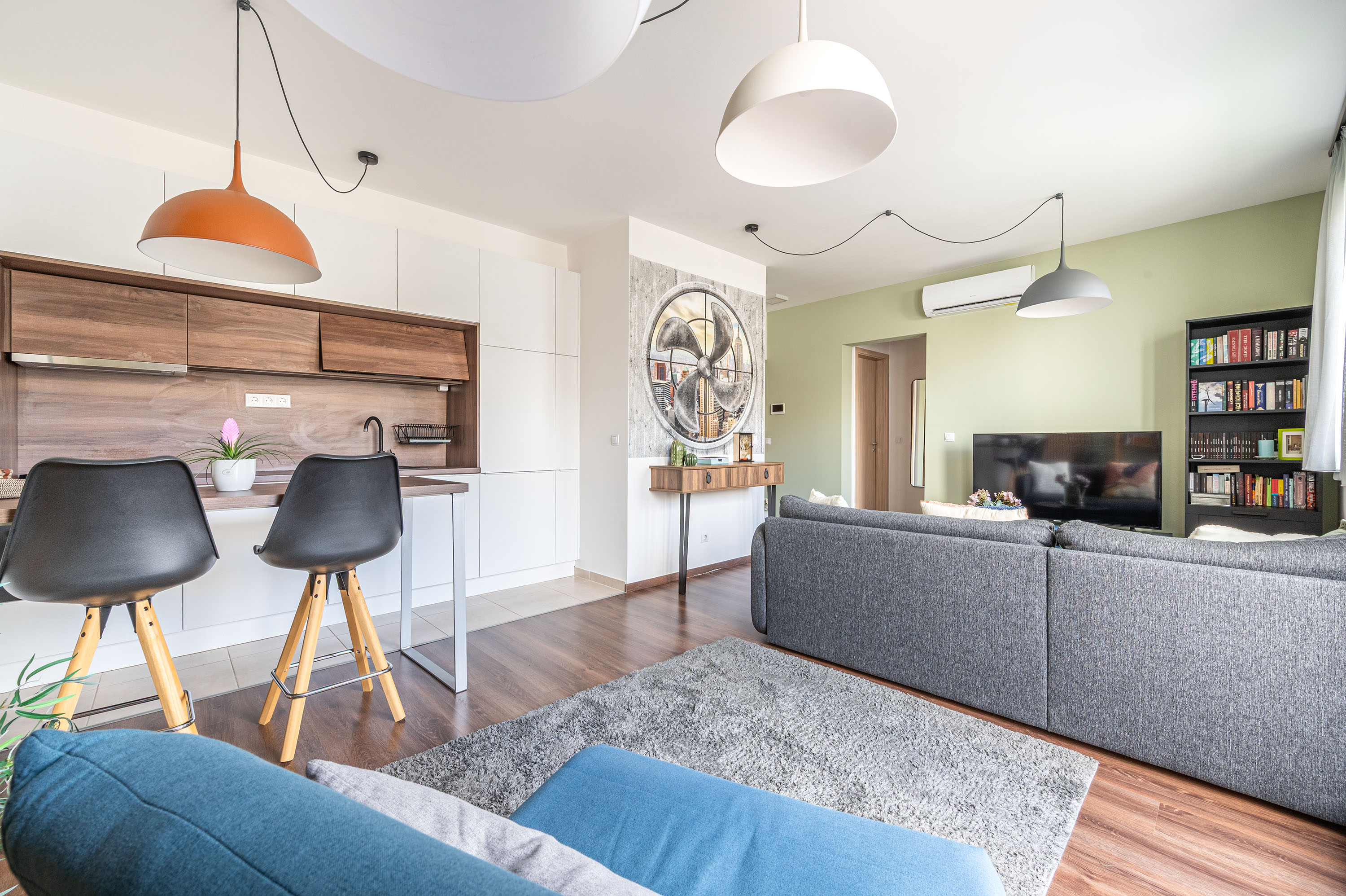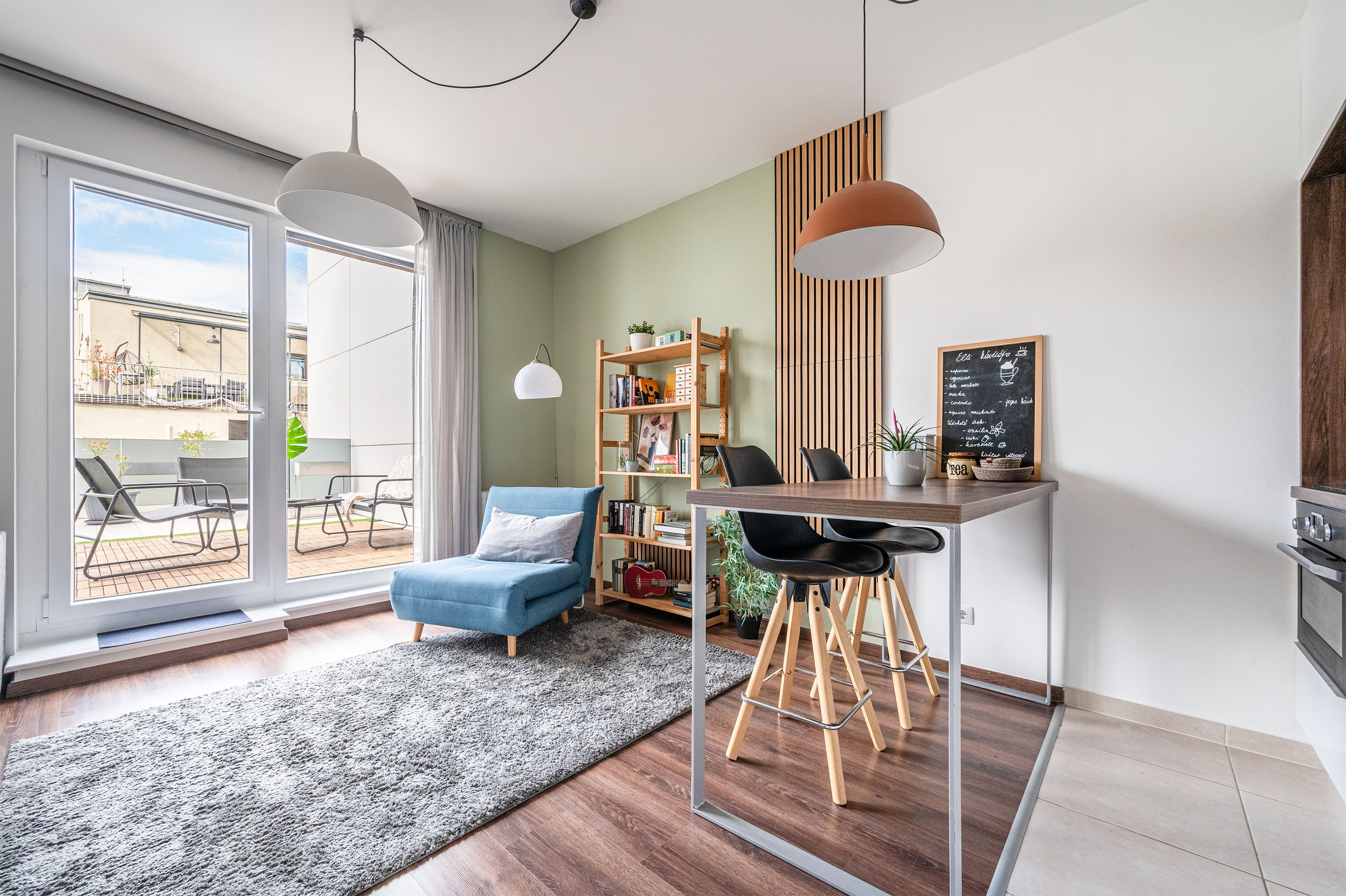 A lakás nappalija nagyon tágas, nagyméretű. A mennyezetig beépített konyhabútor egyedileg tervezett, konyhai gépekkel felszerelt.