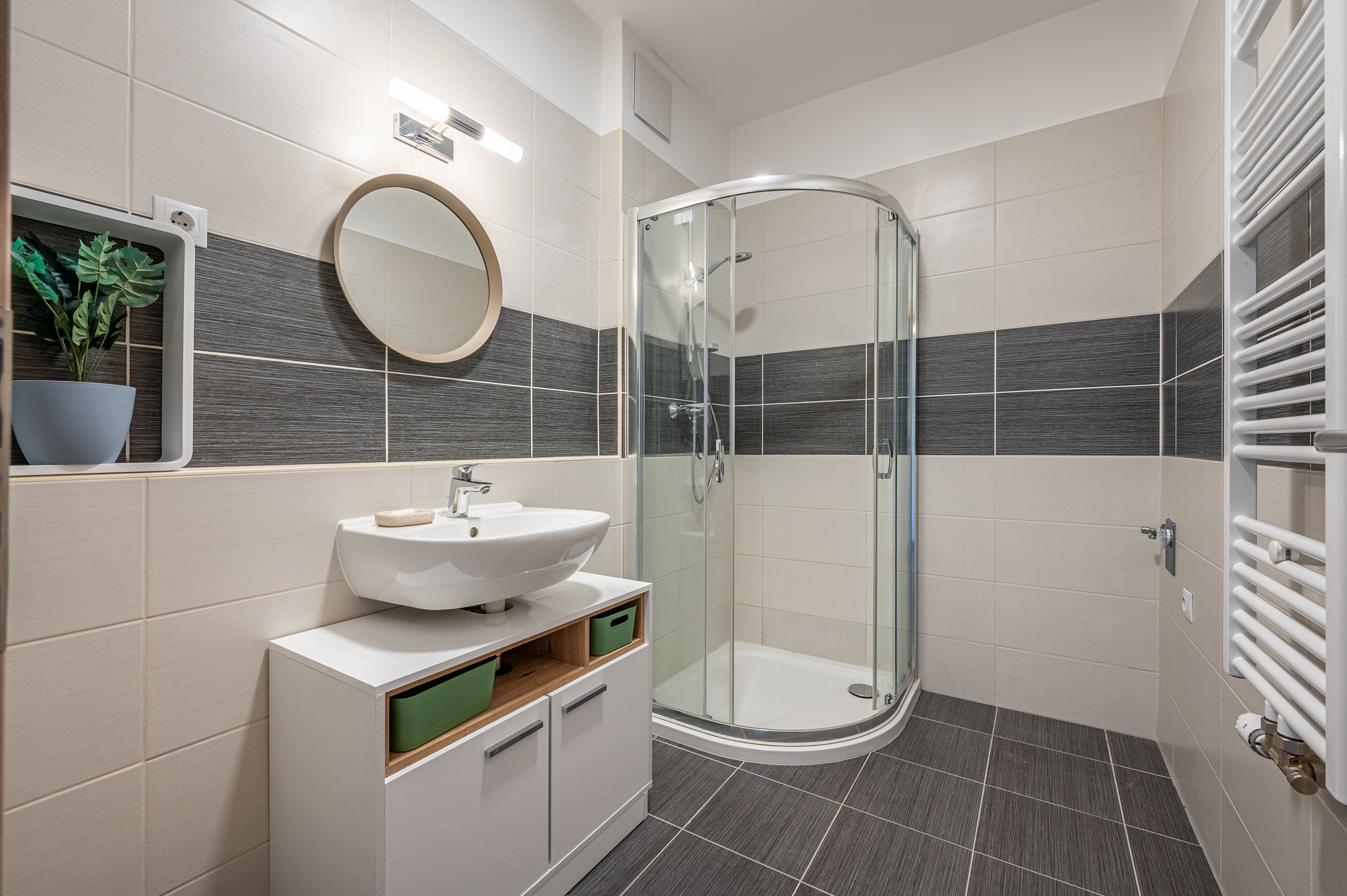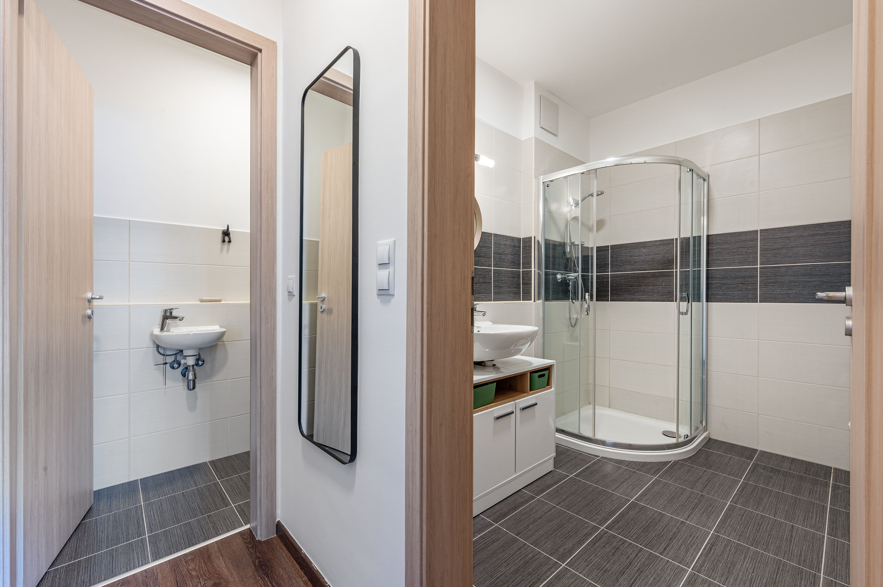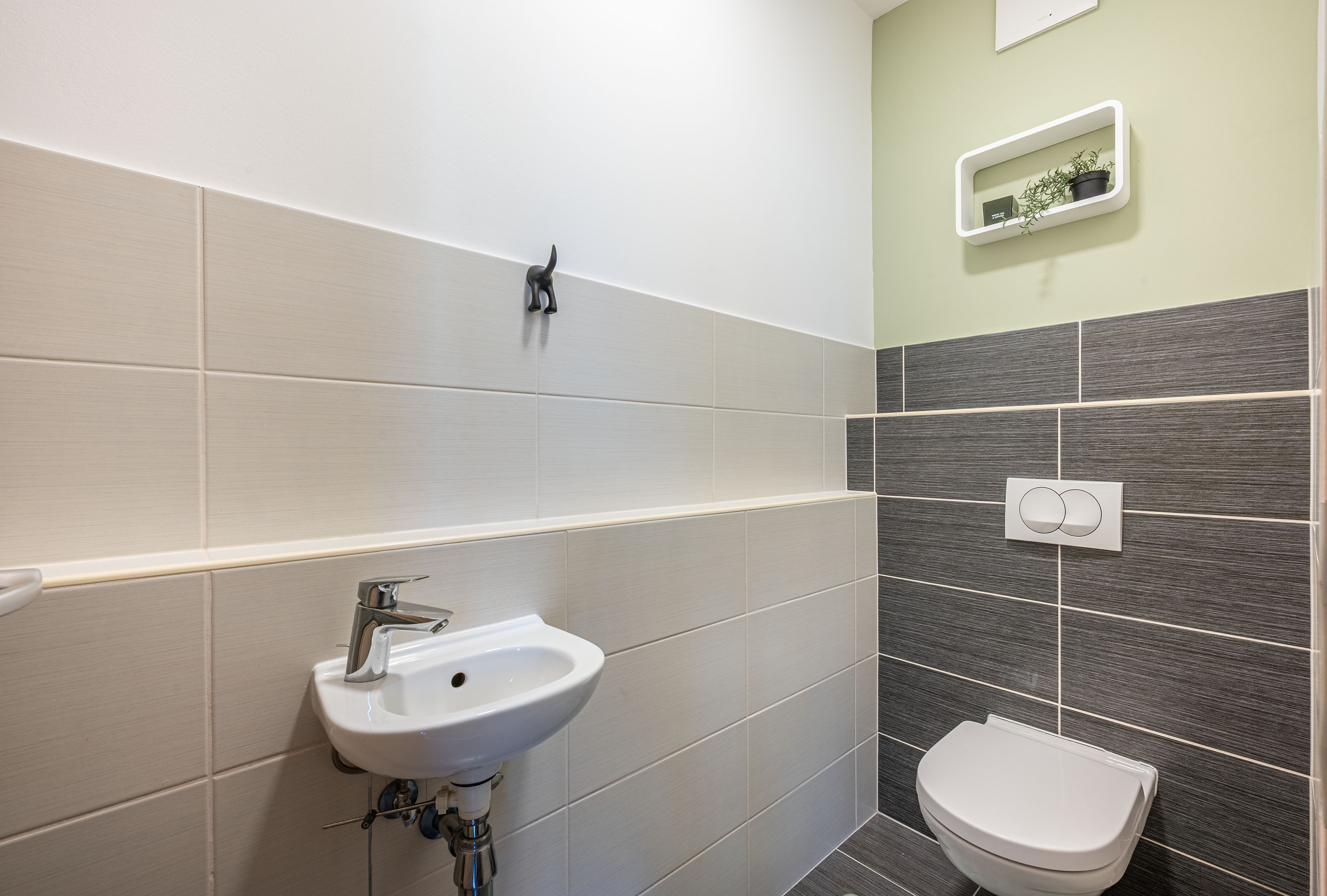 Az ingatlan 2 szobából (1 hálószoba egy nappali), 1WC-ből, fürdőszobából és dupla teraszból áll(43m2). A fürdőszoba épített walk-in zuhannyal felszerelt.