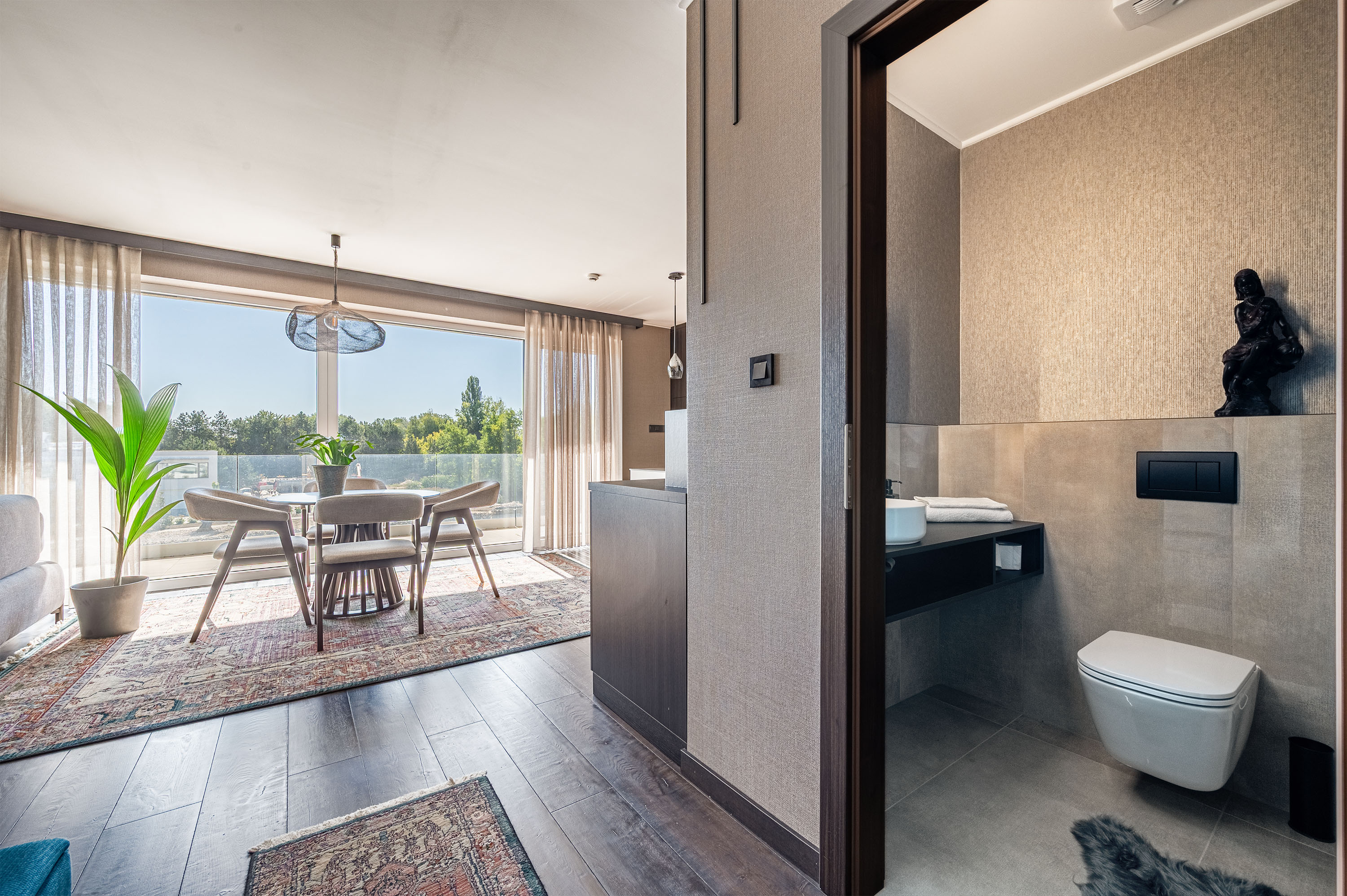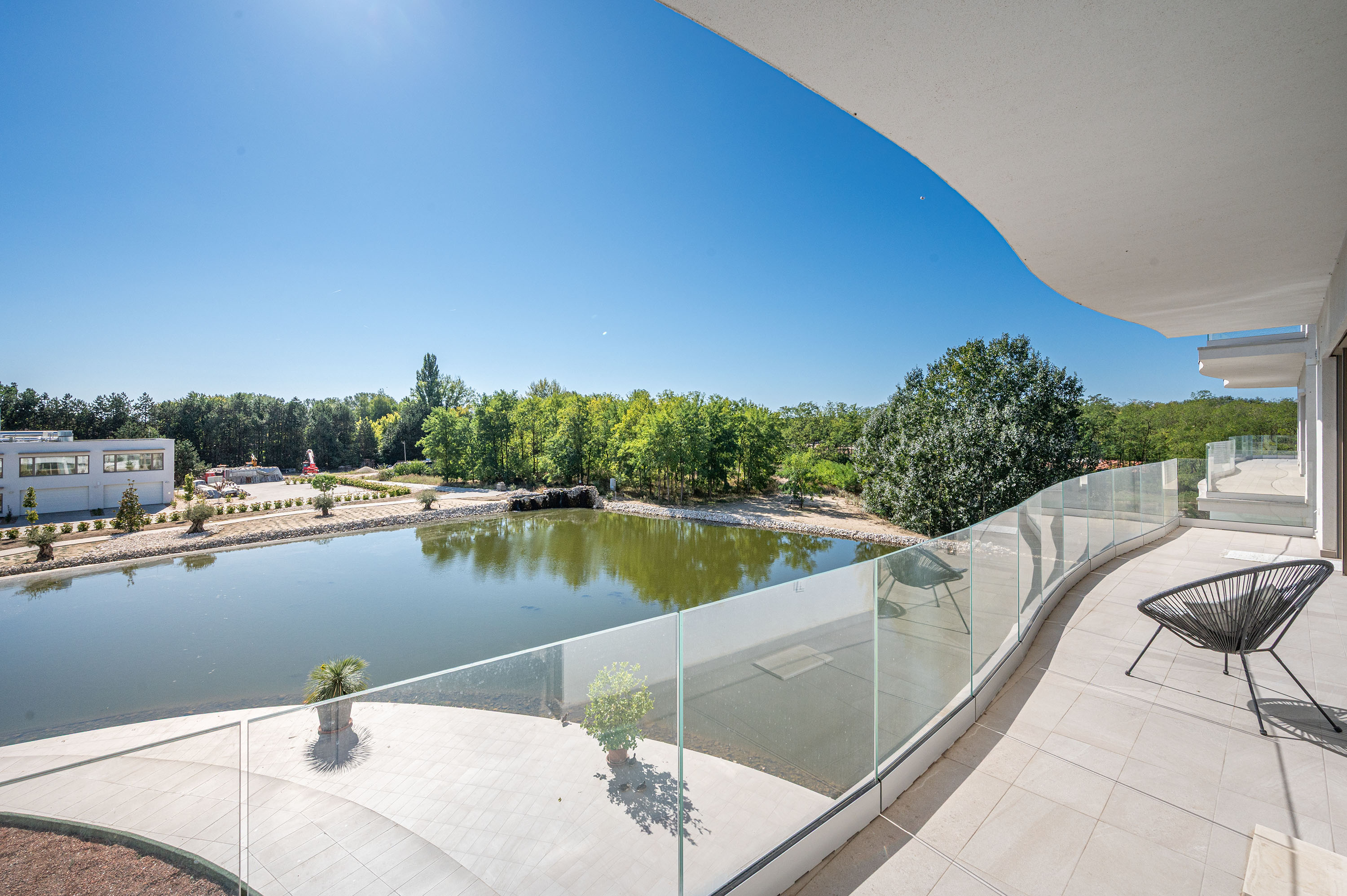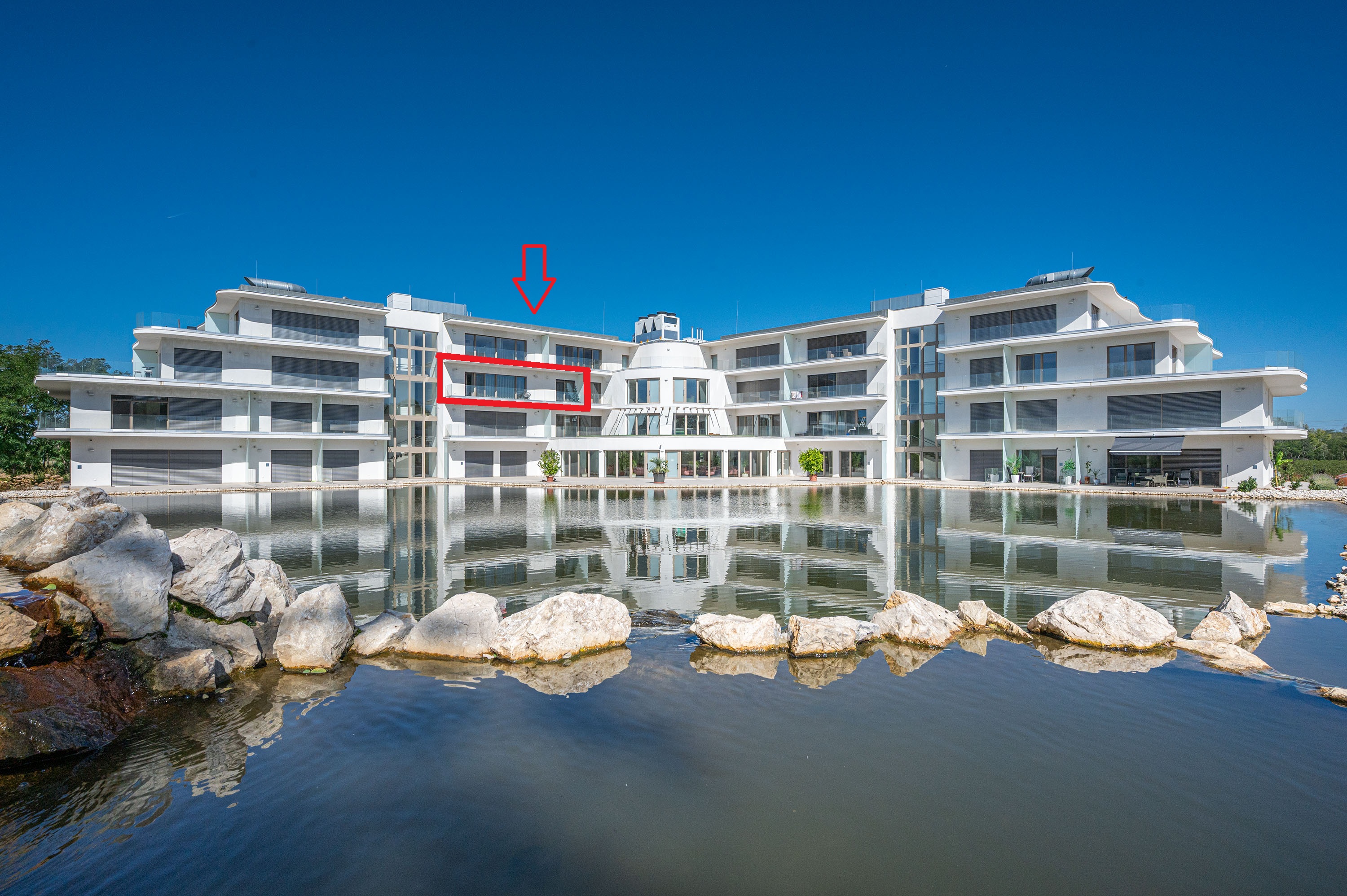 Az ingatlant teljes hosszában üvegfelület határolja, amely a saját erkélyre, a tóra és a környező arborétumra néz. A lakásnak nem csak önálló nagyméretű konyhája van, hanem hozzá tartozó kamra, saját mosó- szárítógép, külön tágas mosdó bidével, fürdőszoba térben álló káddal és akadálymentes épített zuhannyal, a hálószoba pedig saját gardróbszobával rendelkezik.