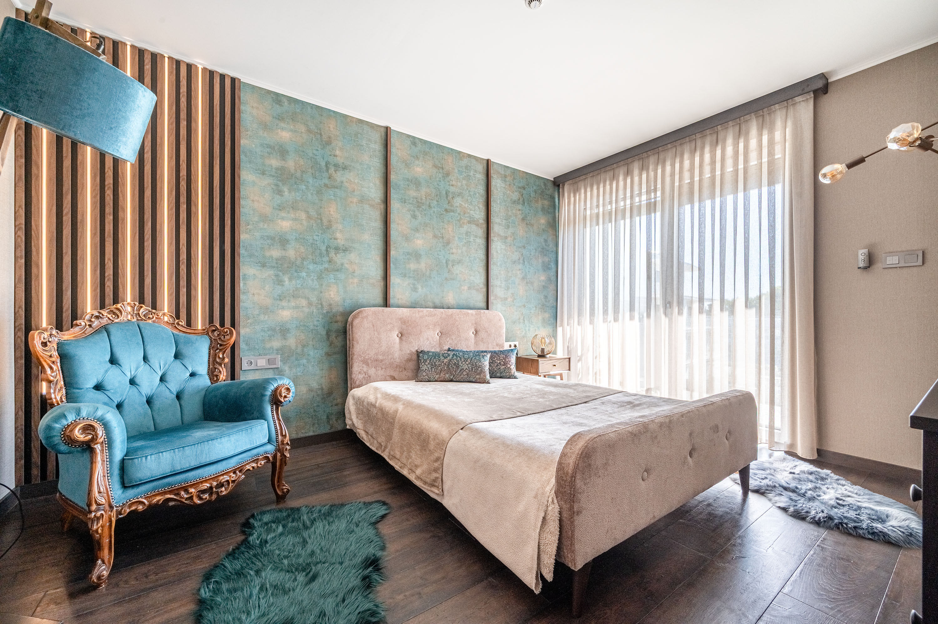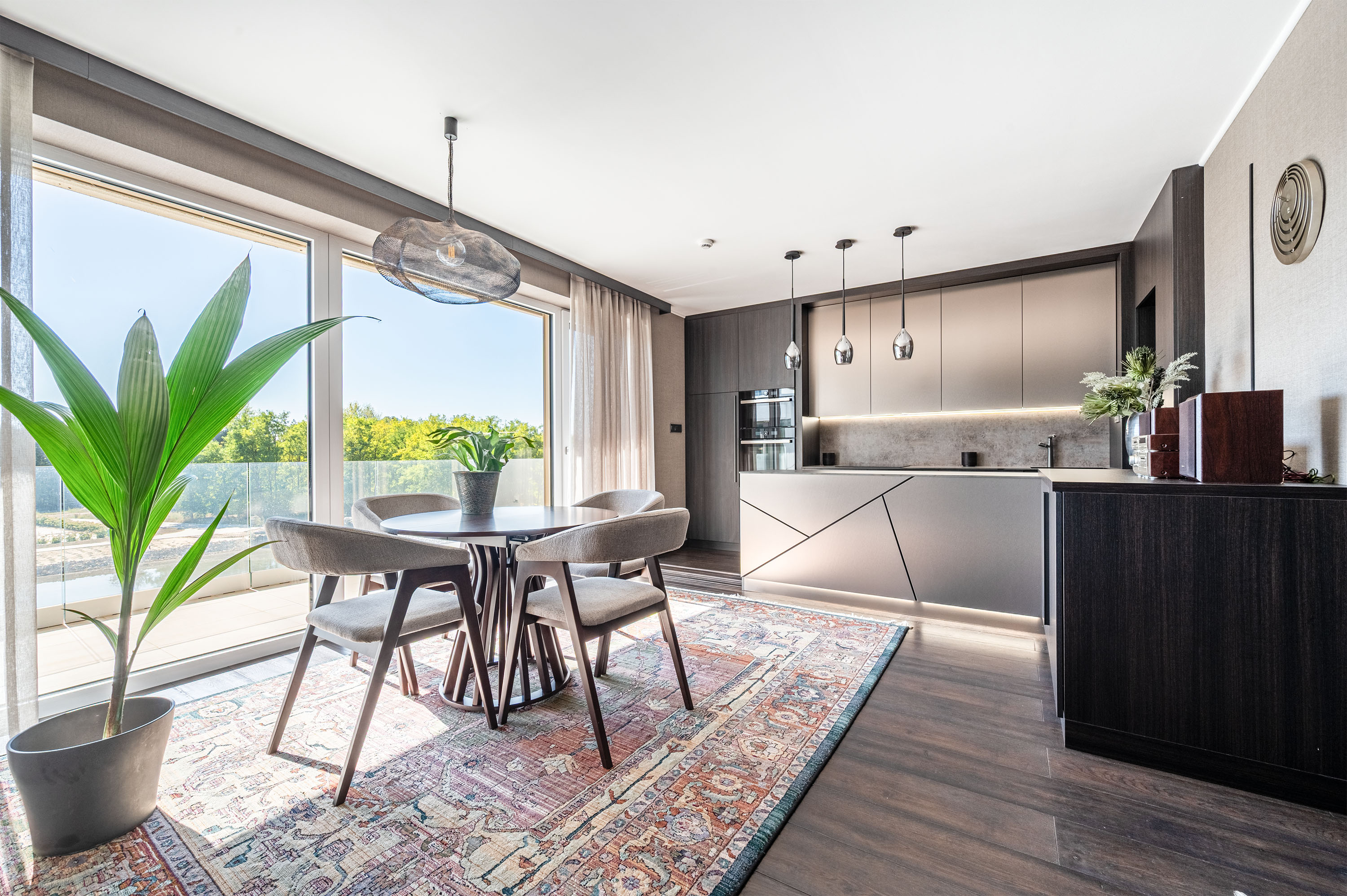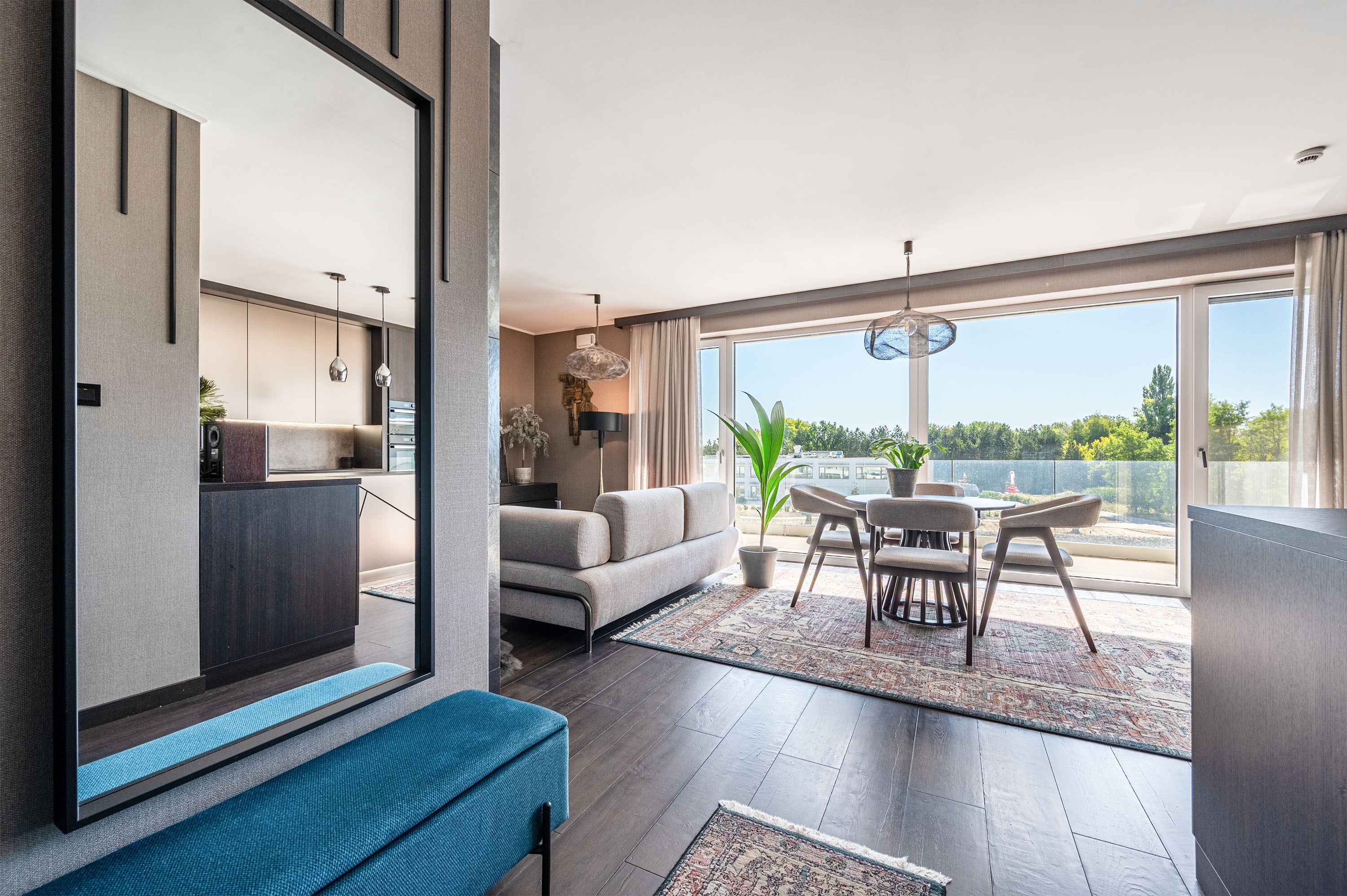 Az ingatlant teljes hosszában üvegfelület határolja, amely a saját erkélyre, a tóra és a környező arborétumra néz. A lakásnak nem csak önálló nagyméretű konyhája van, hanem hozzá tartozó kamra, saját mosó- szárítógép, külön tágas mosdó bidével, fürdőszoba térben álló káddal és akadálymentes épített zuhannyal, a hálószoba pedig saját gardróbszobával rendelkezik.