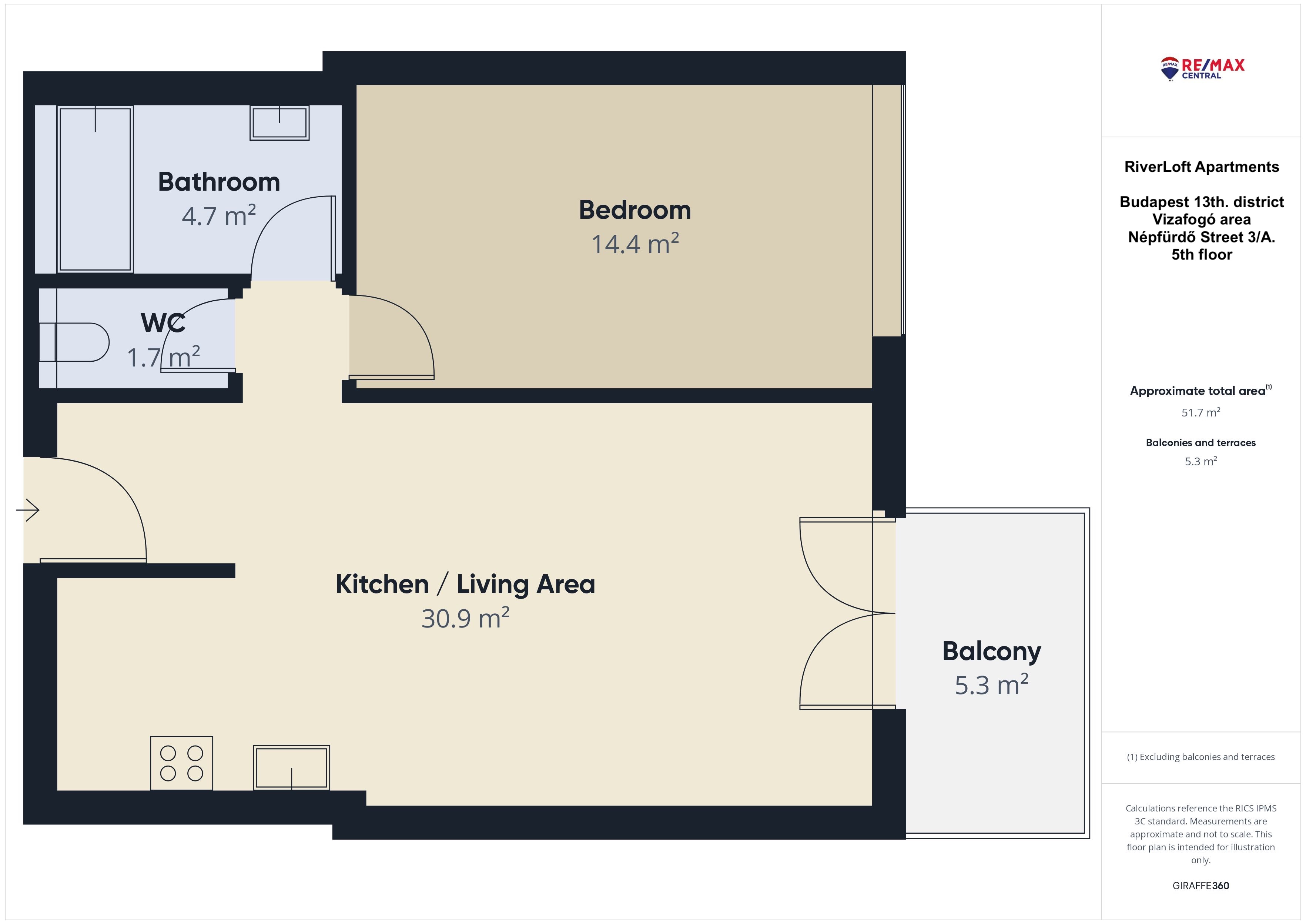 Ez az 52nm-es, 1 hálós lakás a modern igényeknek megfelelően lett kialakítva, a 2007-ben épült RiverLoft apartmanház 5. emeletén található. Csendes, kulturált lakóközösség jellemzi a házat. A társasházban lévő uszodával, szaunával és edzőteremmel felszerelt Wellness központot a lakók díjmentesen használhatják.