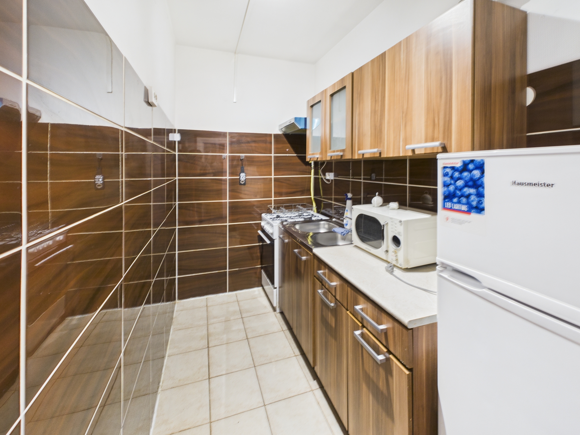 A konyha alsó - felső szekrényekkel és szagelszívóval ellátott, illetve a tűzhely és hűtő is a vételár részét képezi.