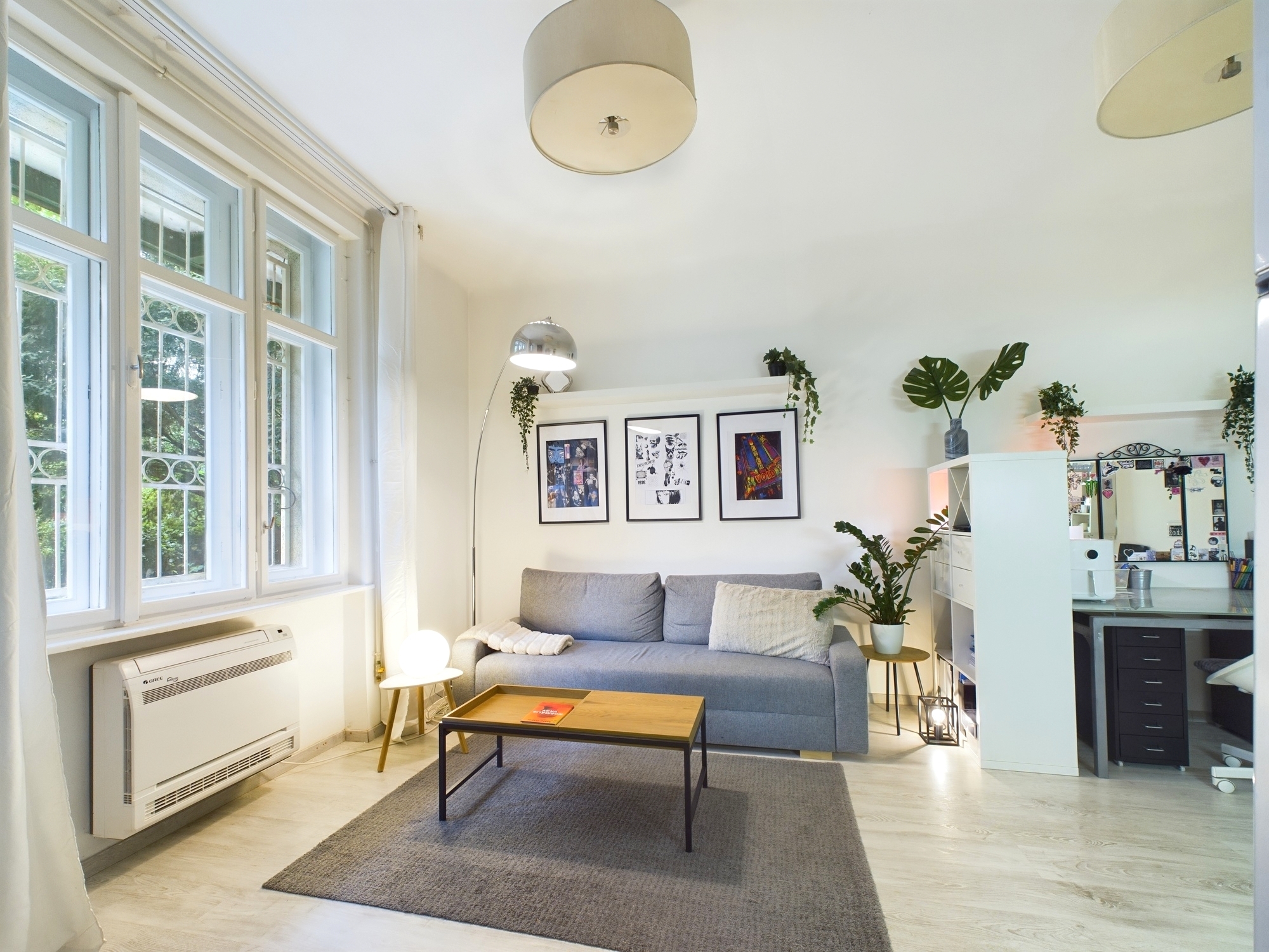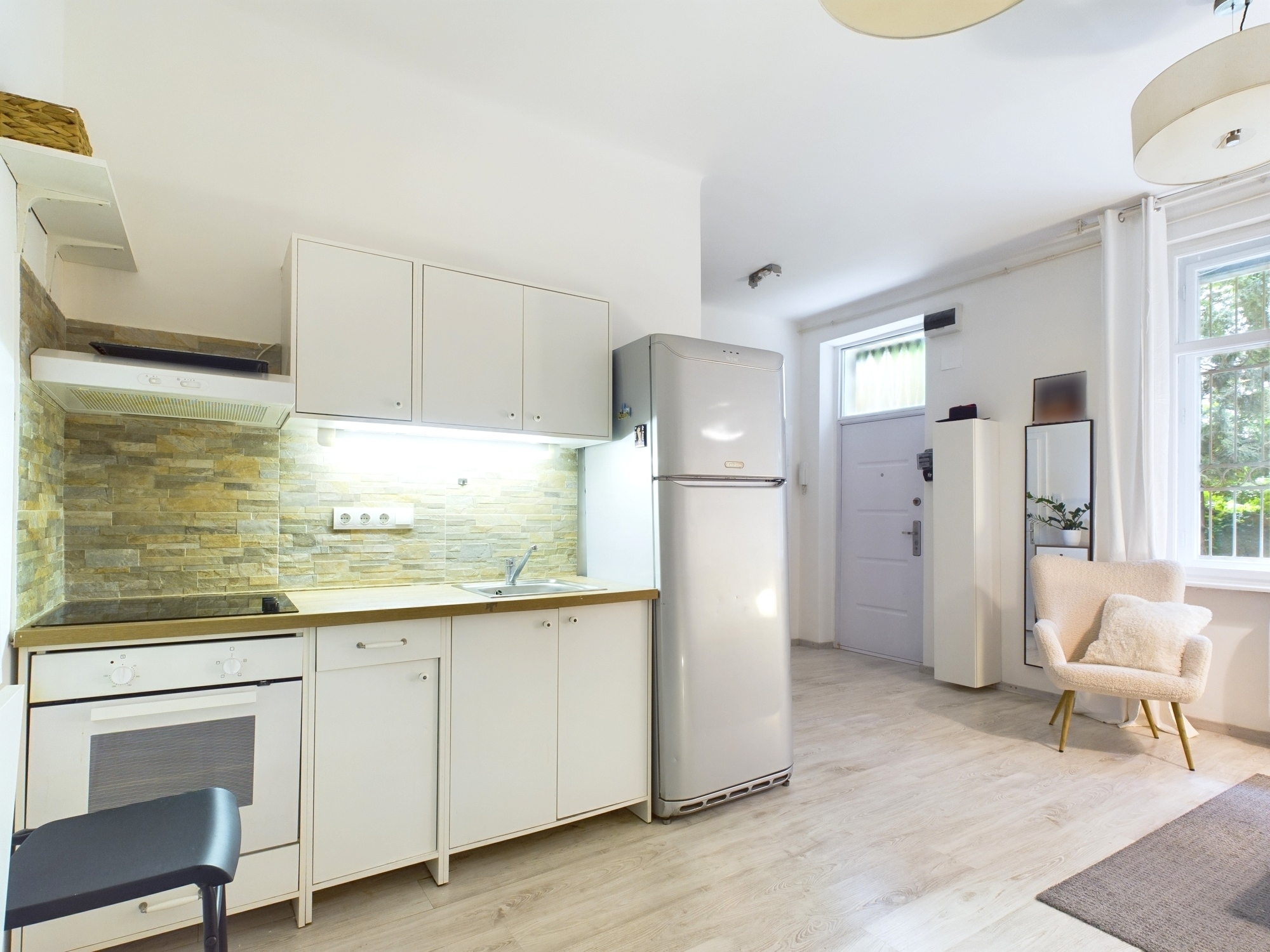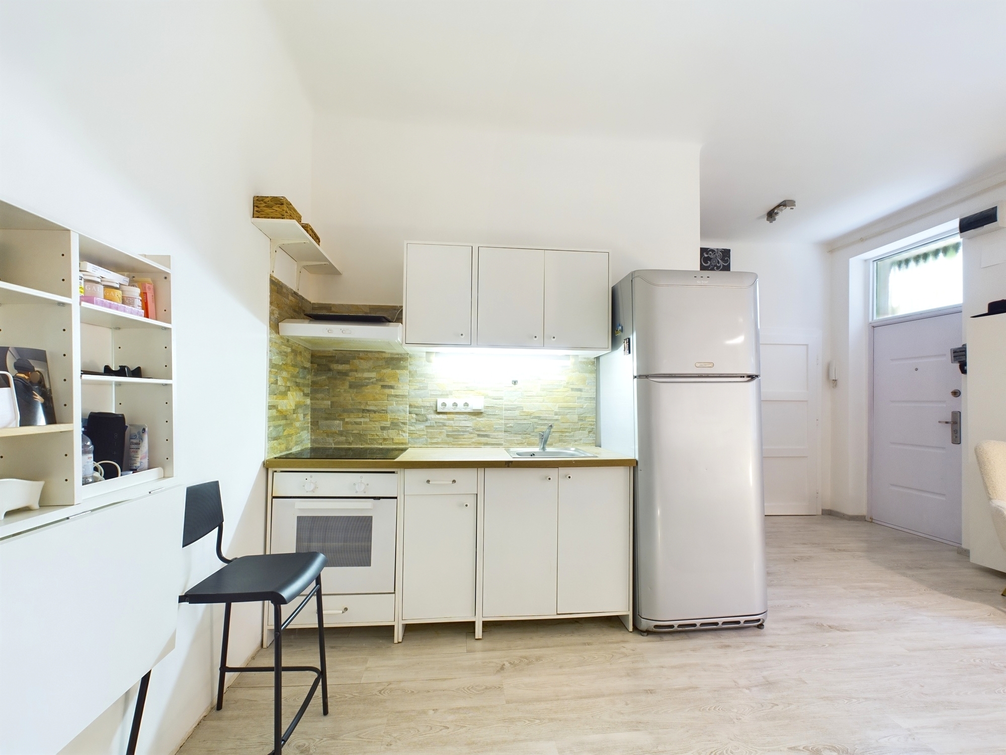 The condominium consists of a normal sized entrance hall, living room with American kitchen, 1 separate bedroom and 1 bathroom with built-in shower. The heating is electric, hot water is supplied by a boiler, and there is air conditioning with heating and cooling.