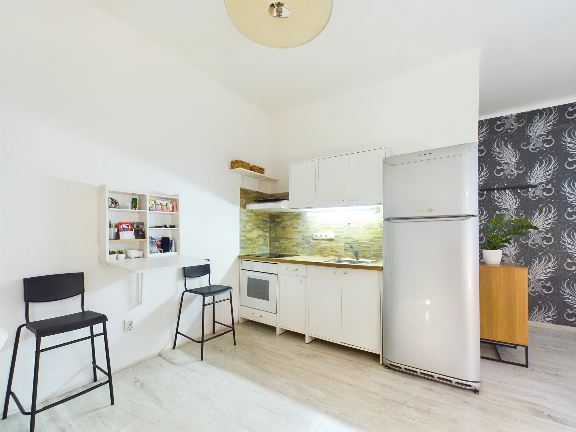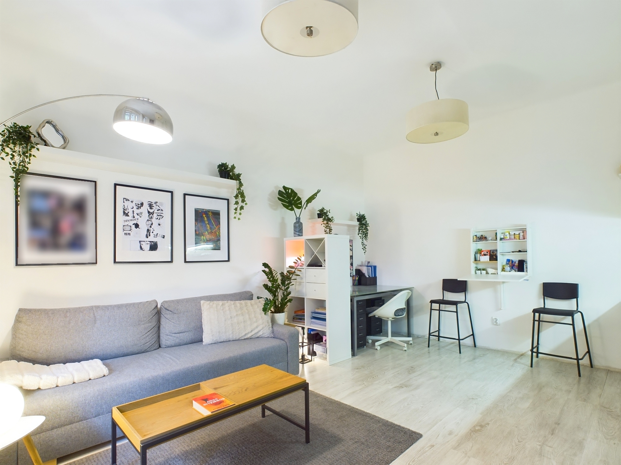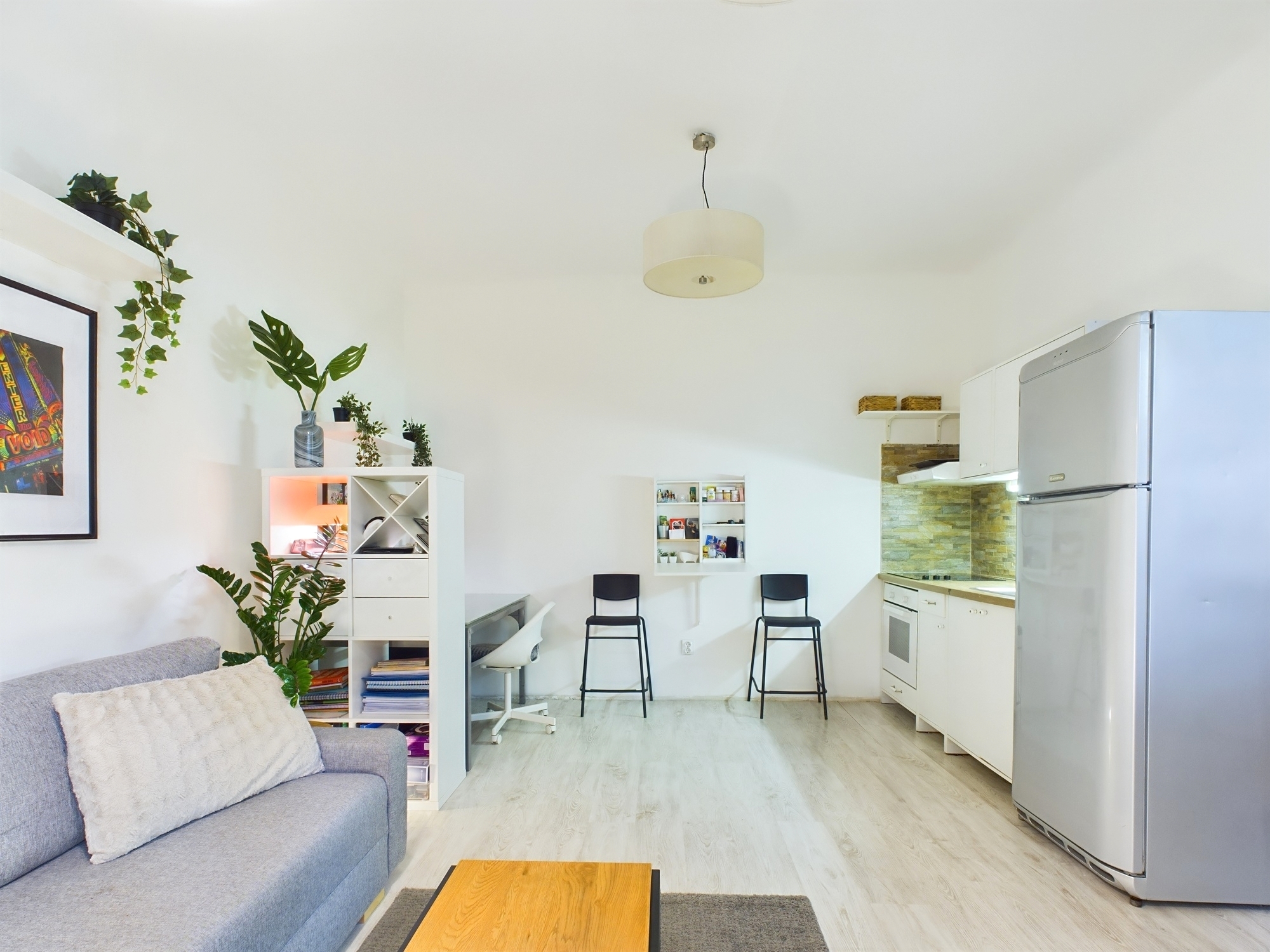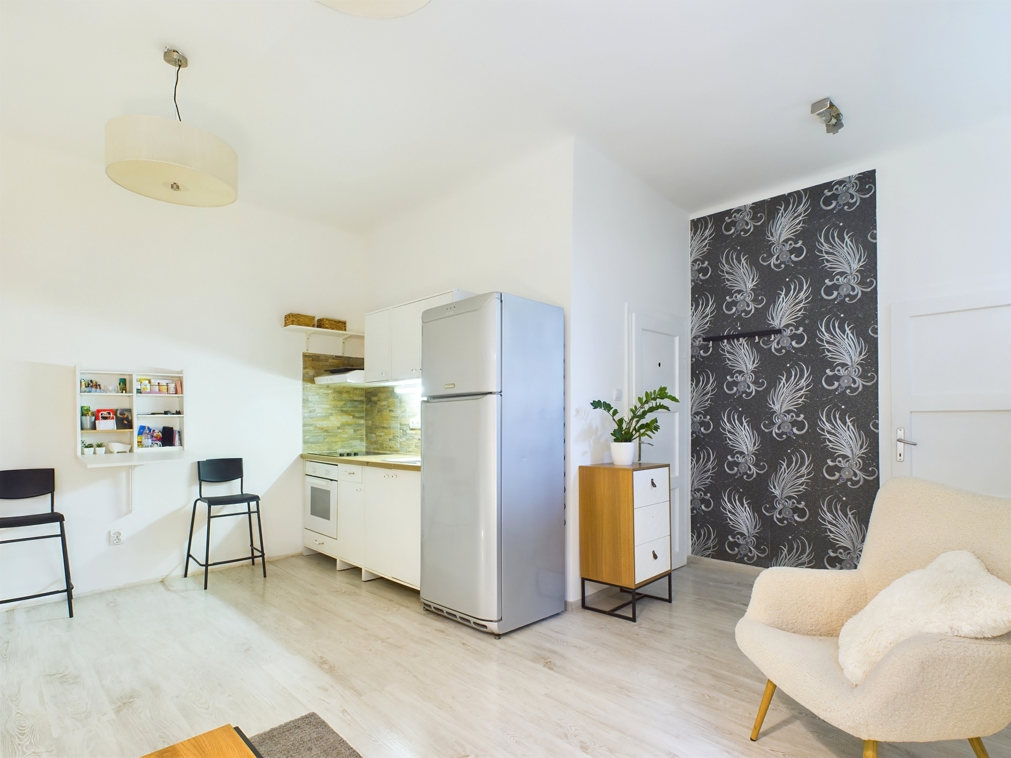 The condominium consists of a normal sized entrance hall, living room with American kitchen, 1 separate bedroom and 1 bathroom with built-in shower. The heating is electric, hot water is supplied by a boiler, and there is air conditioning with heating and cooling.