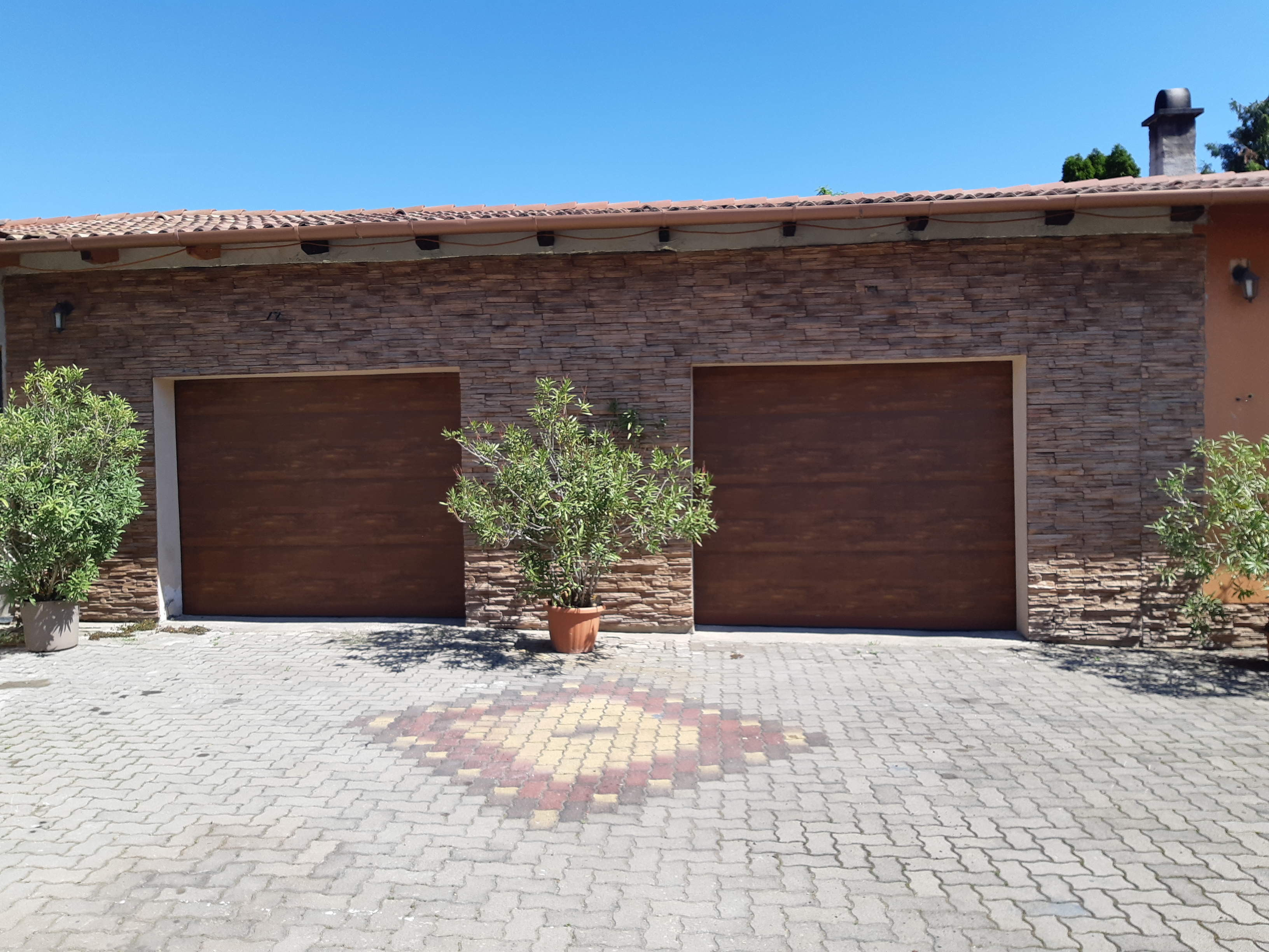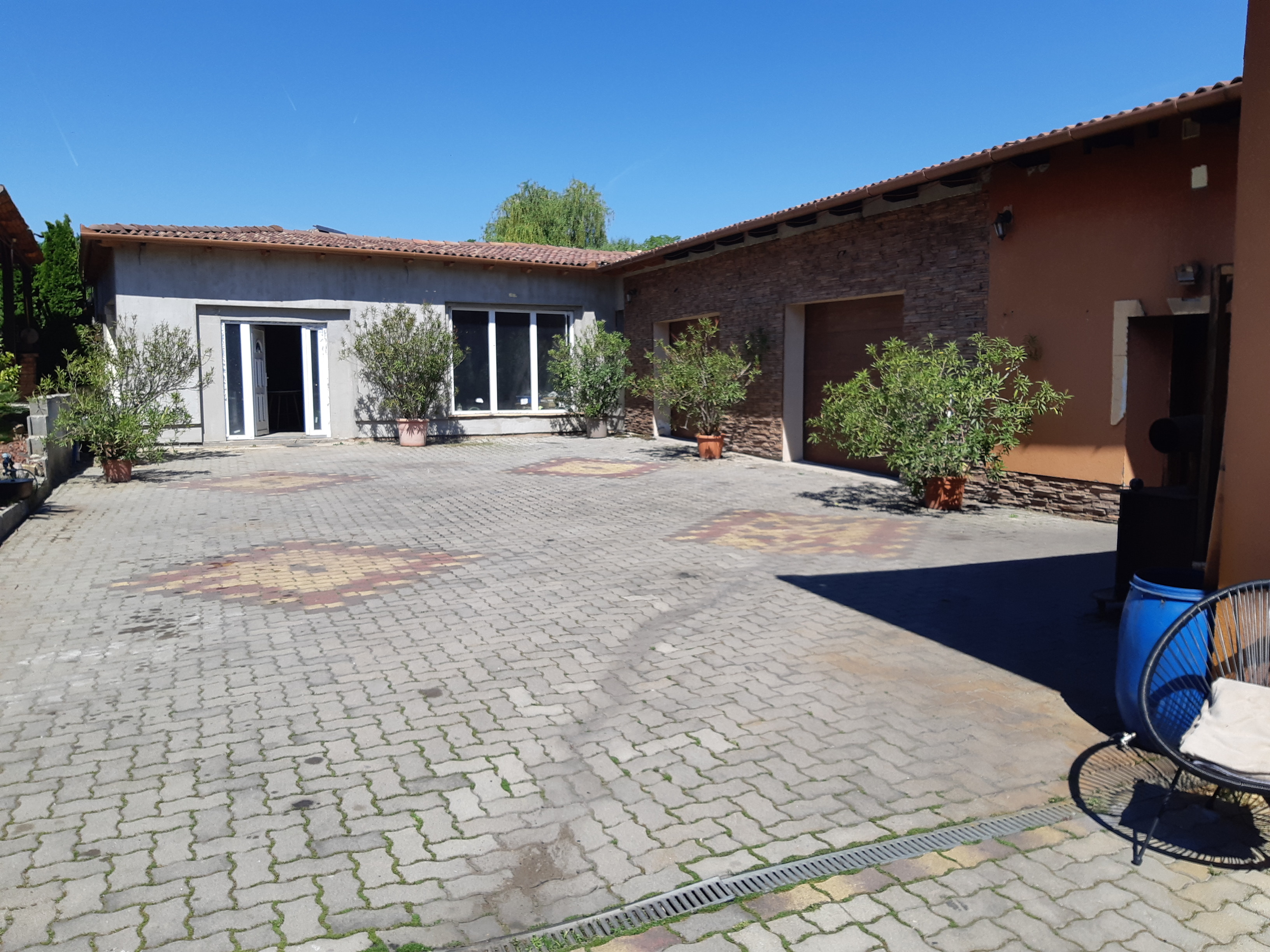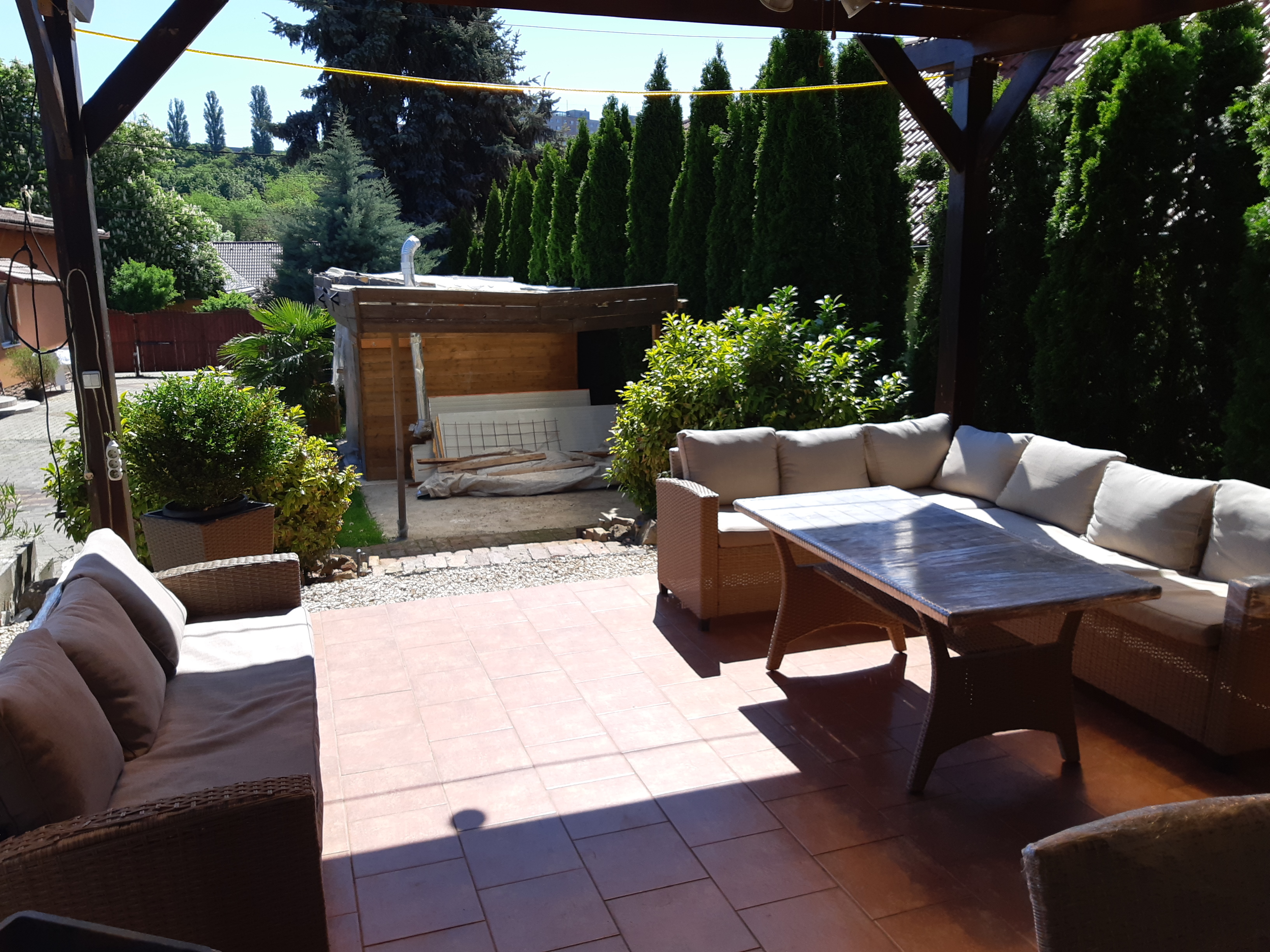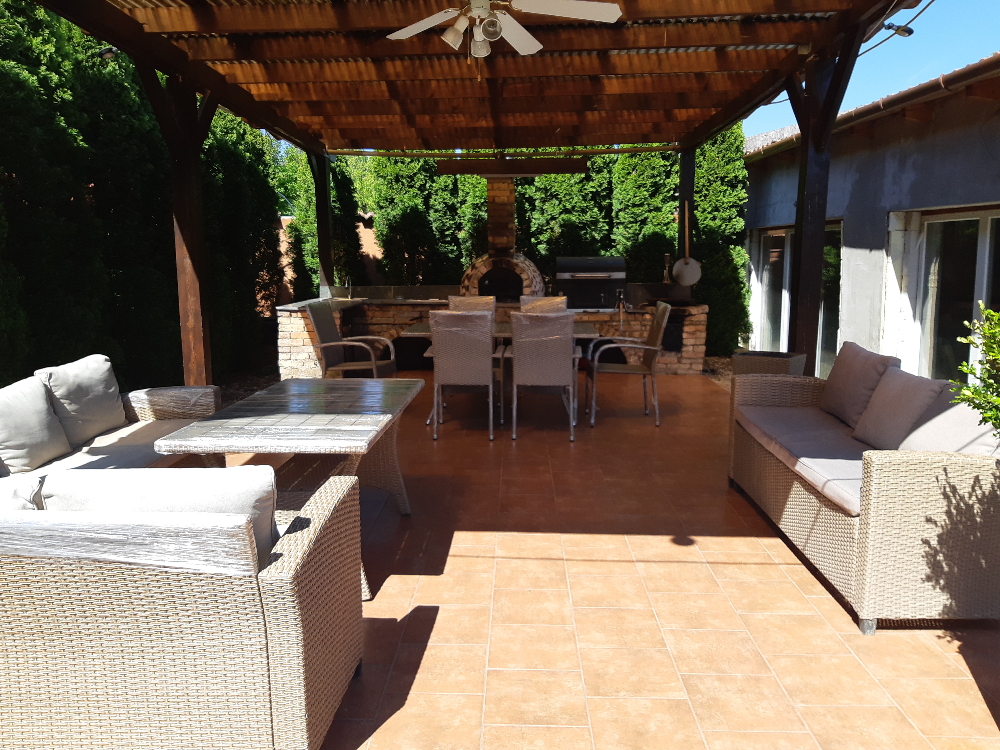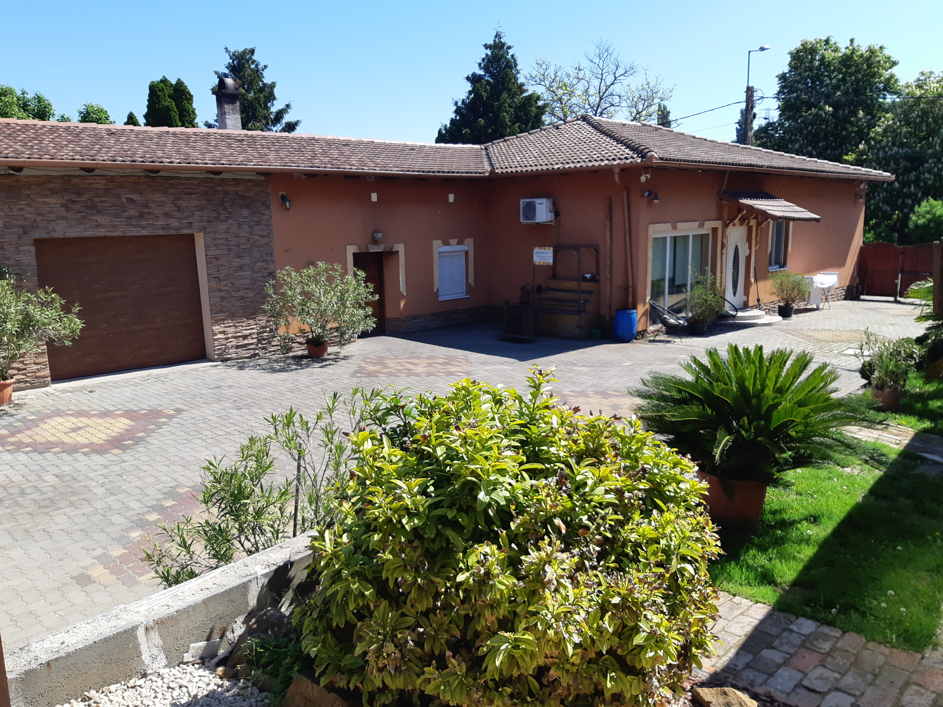 A házhoz tartozik egy dupla garázs, egy grill terasz, valamint egy 100 m²-es melléképület, amely további lakrész kialakítására is alkalmas lehet.