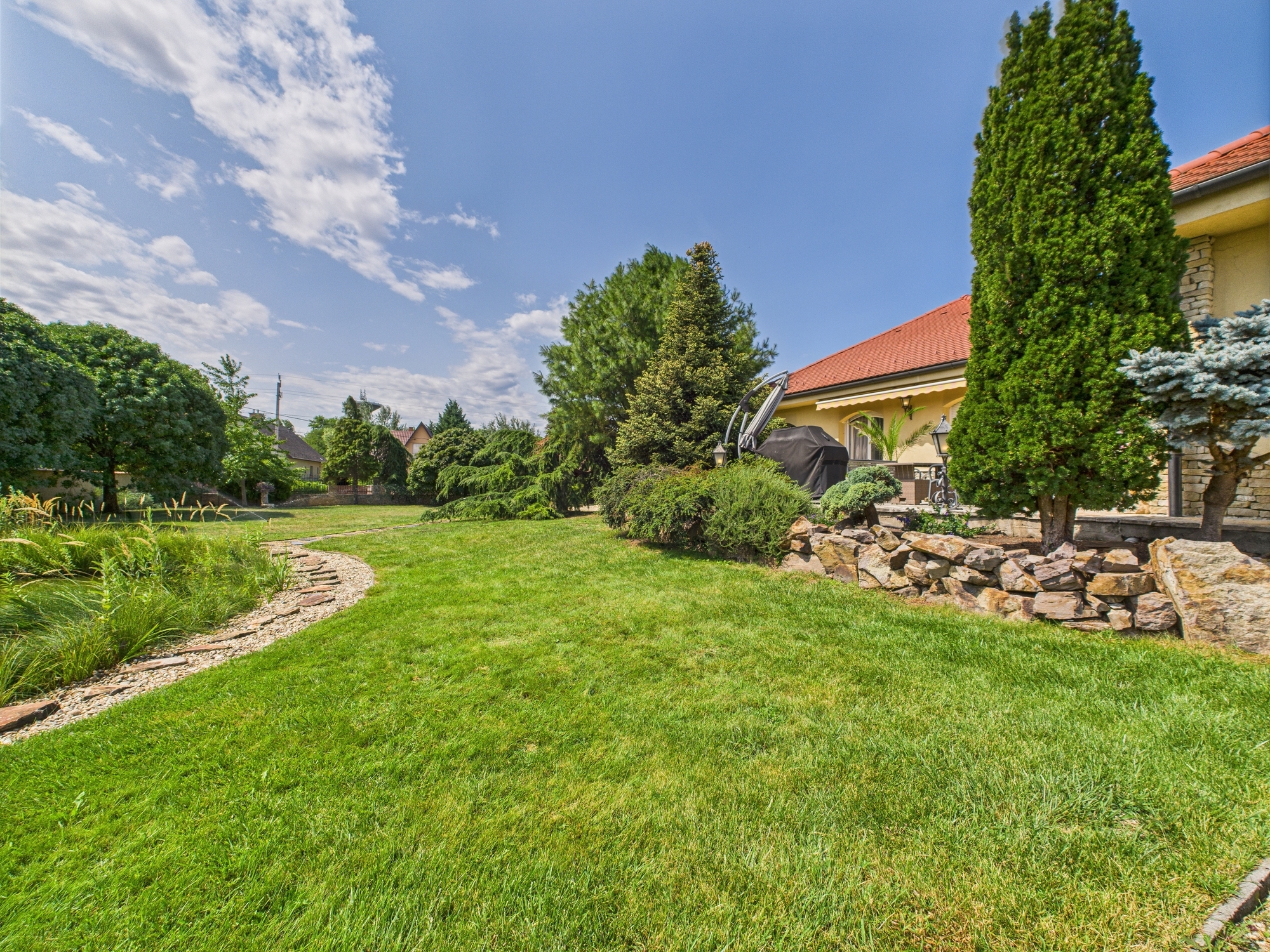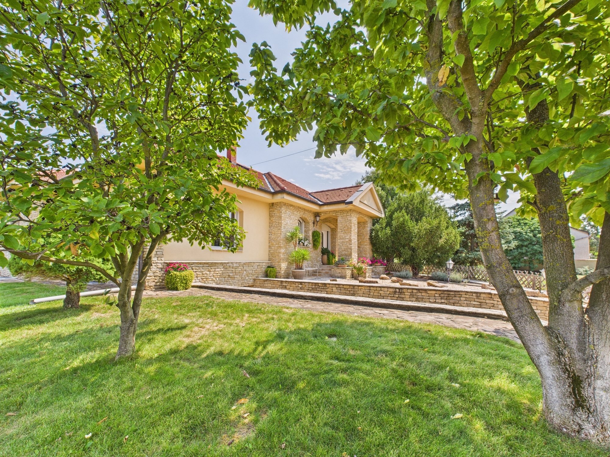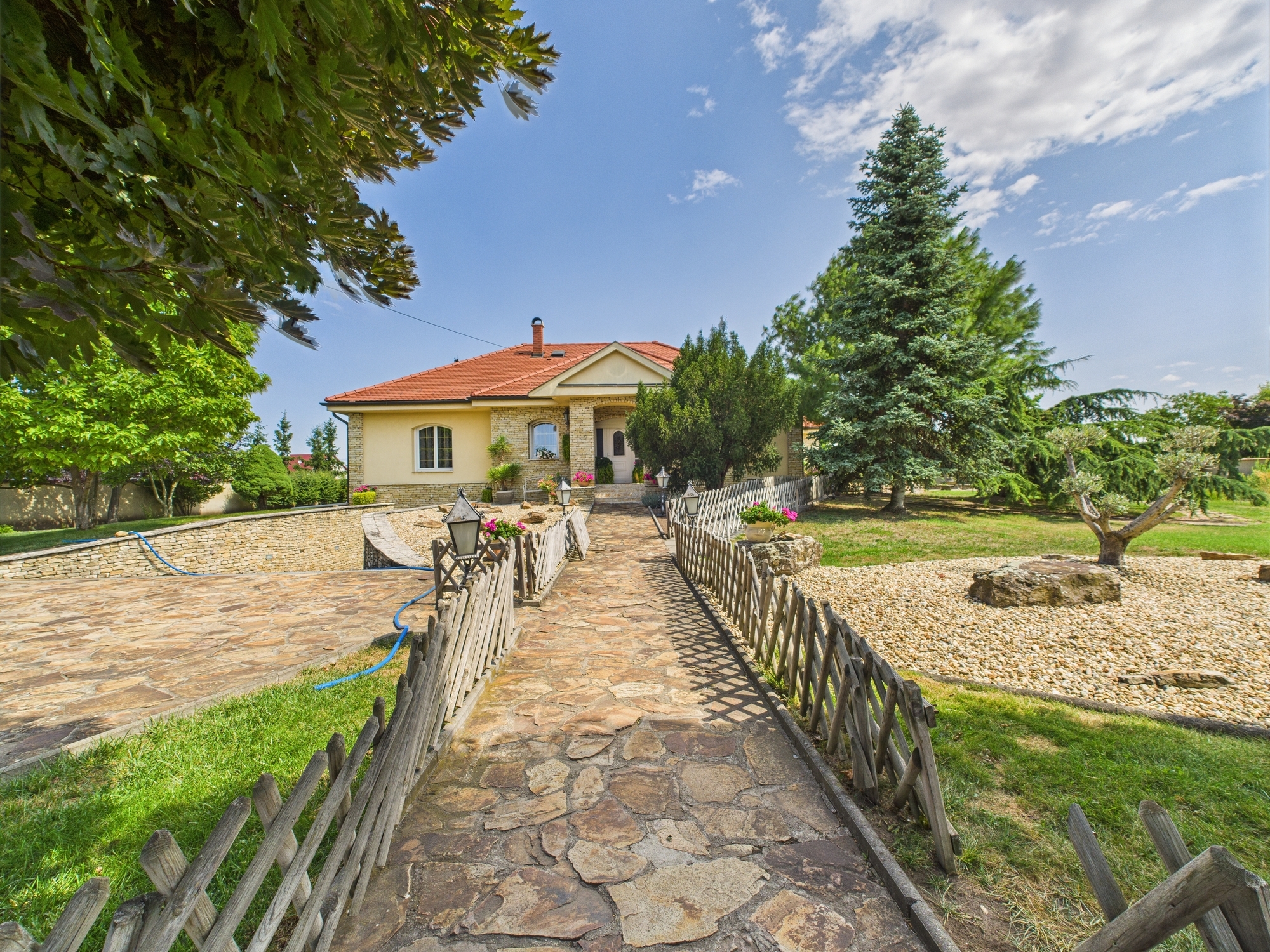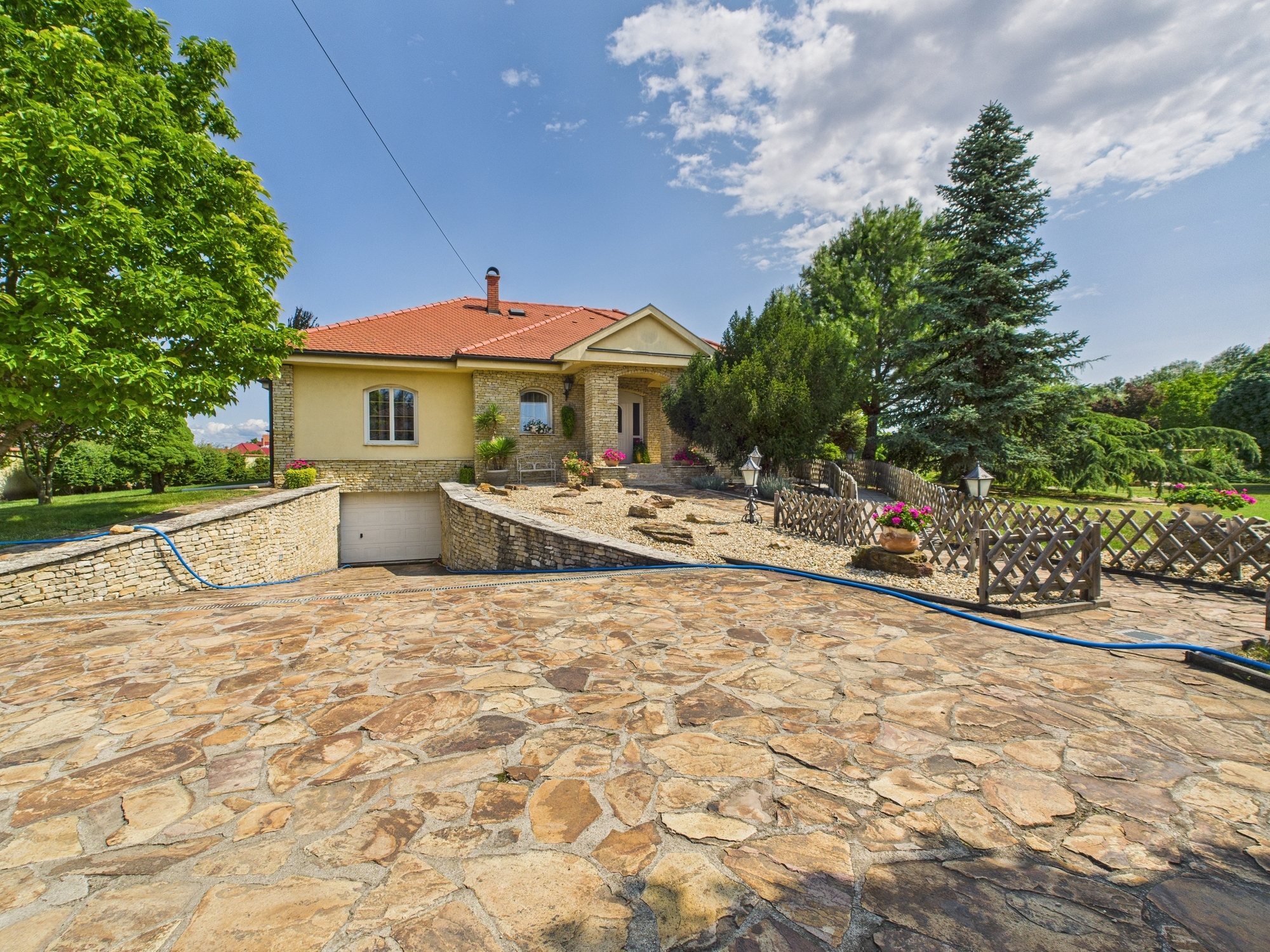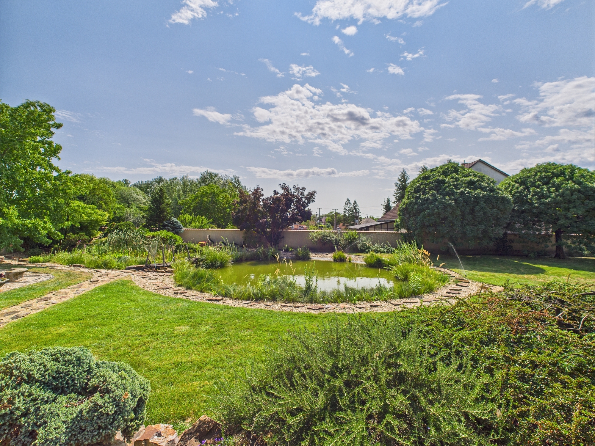 • 3300 m² parkosított kert, saját kerti tóval, természetes kőburkolatos udvarral – valódi birtokérzet.