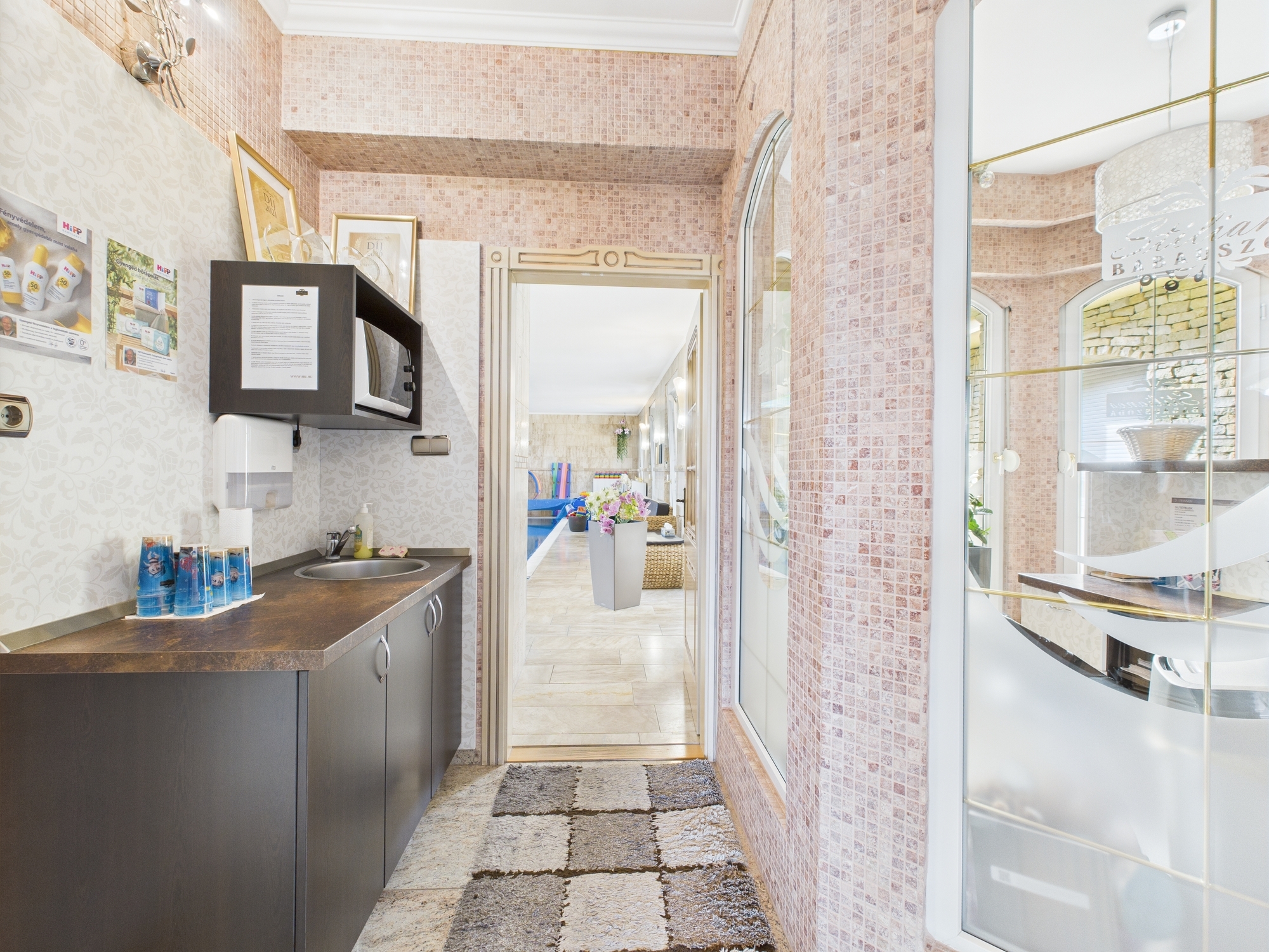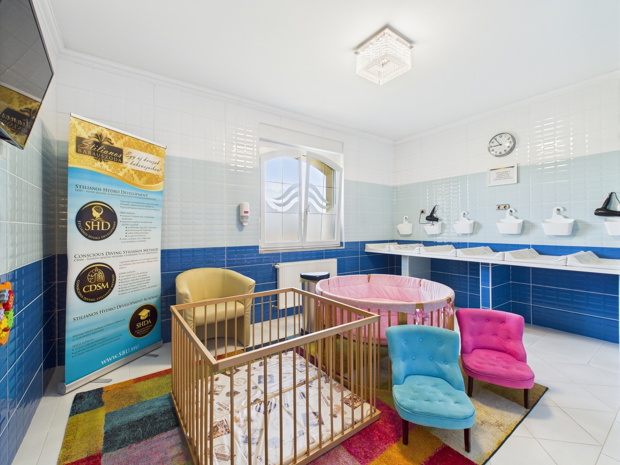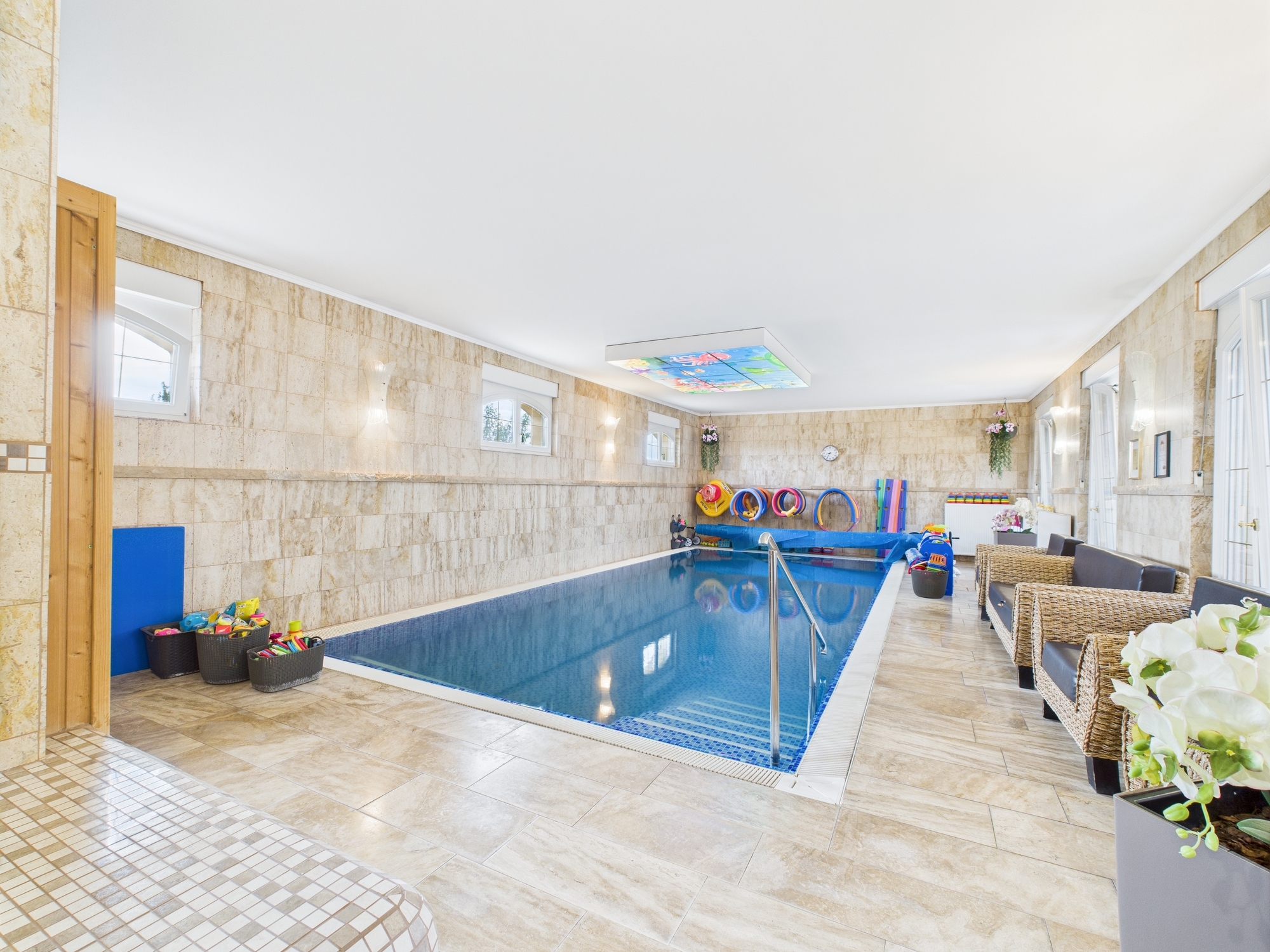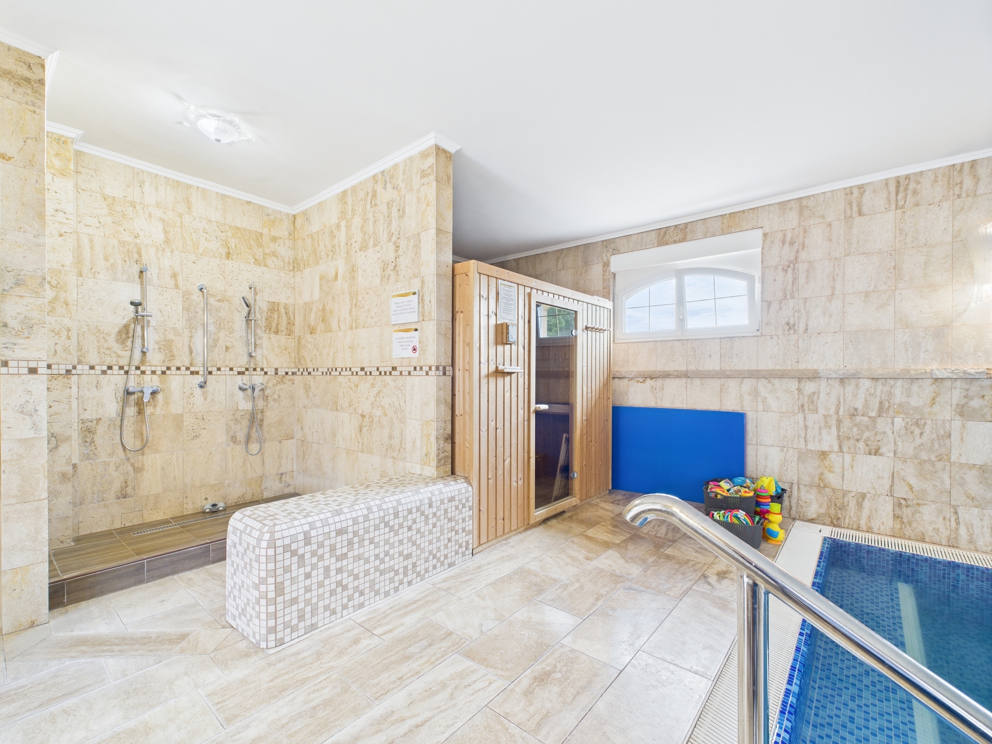 • Beltéri medence babaúszásra, hidroterápiára, rekreációra – szaunával és öltözőkkel kiegészítve.