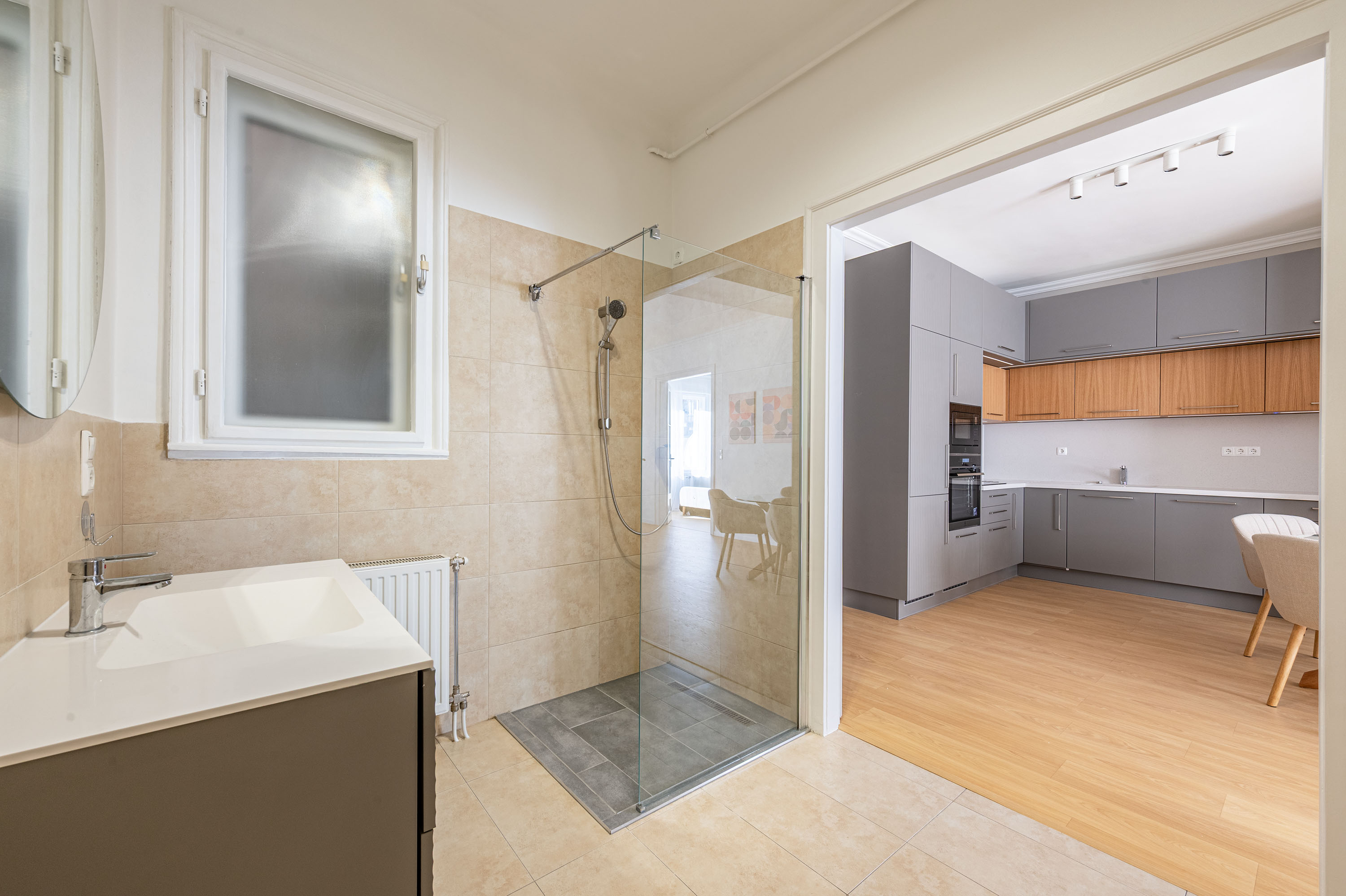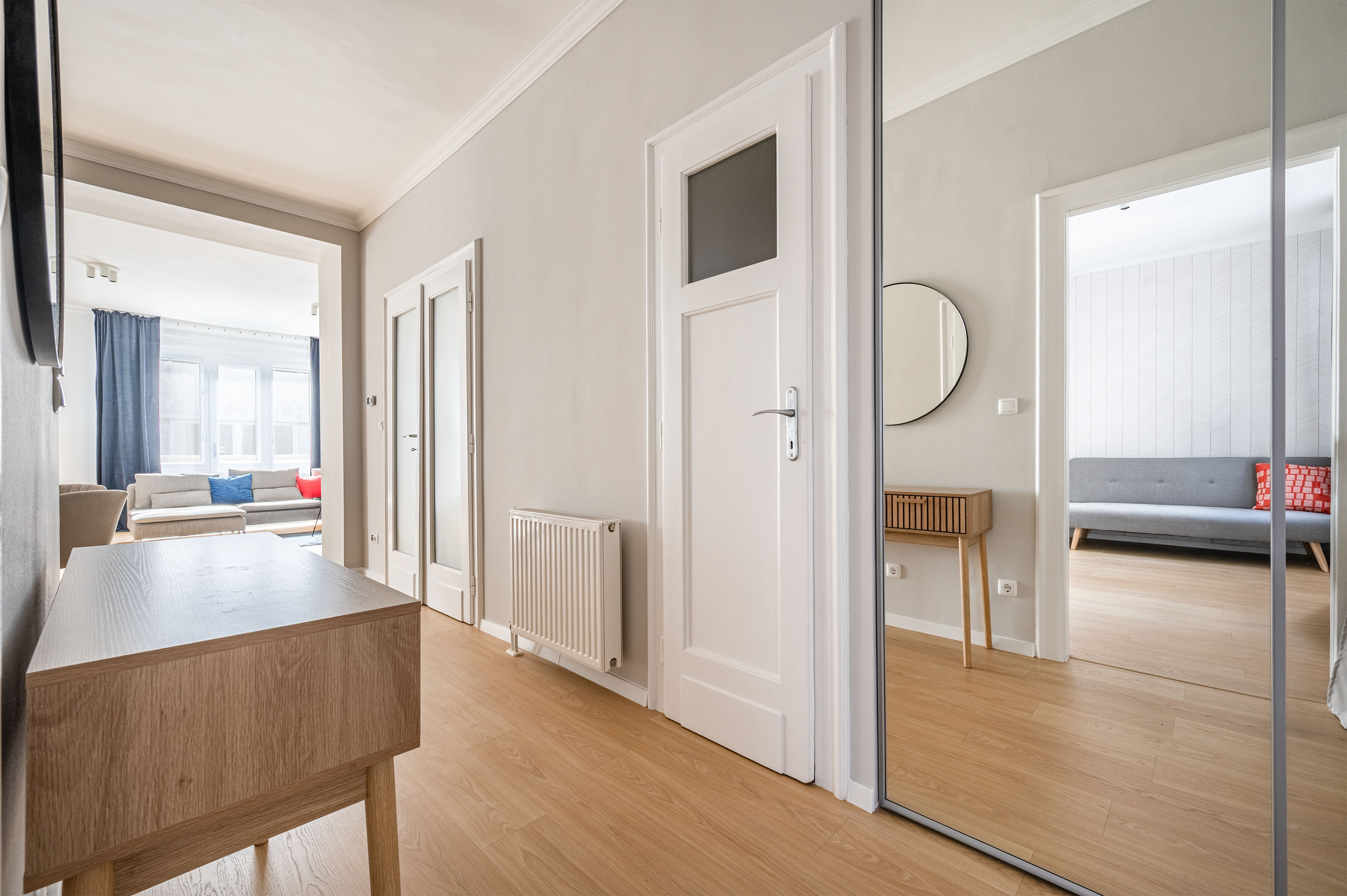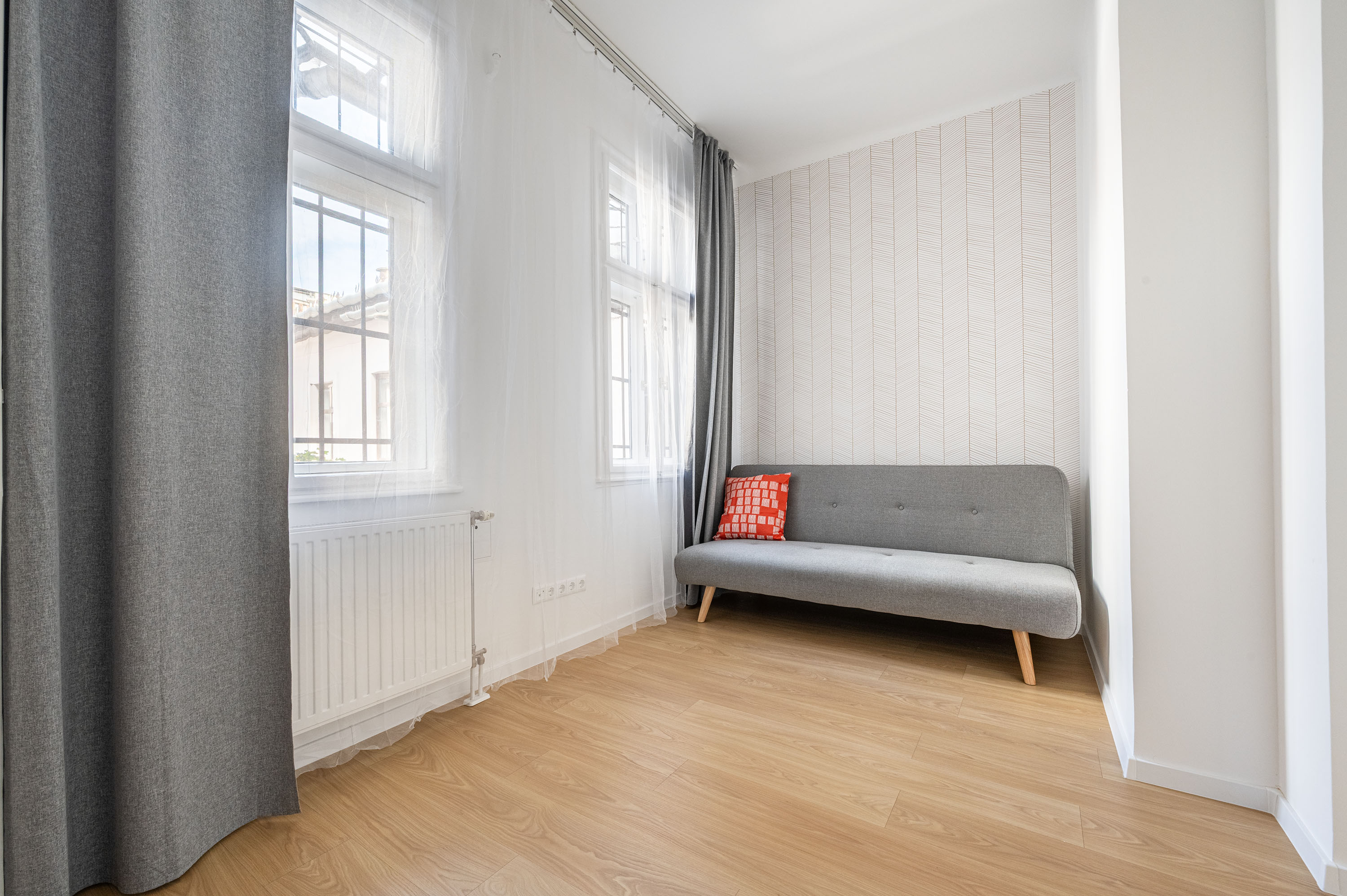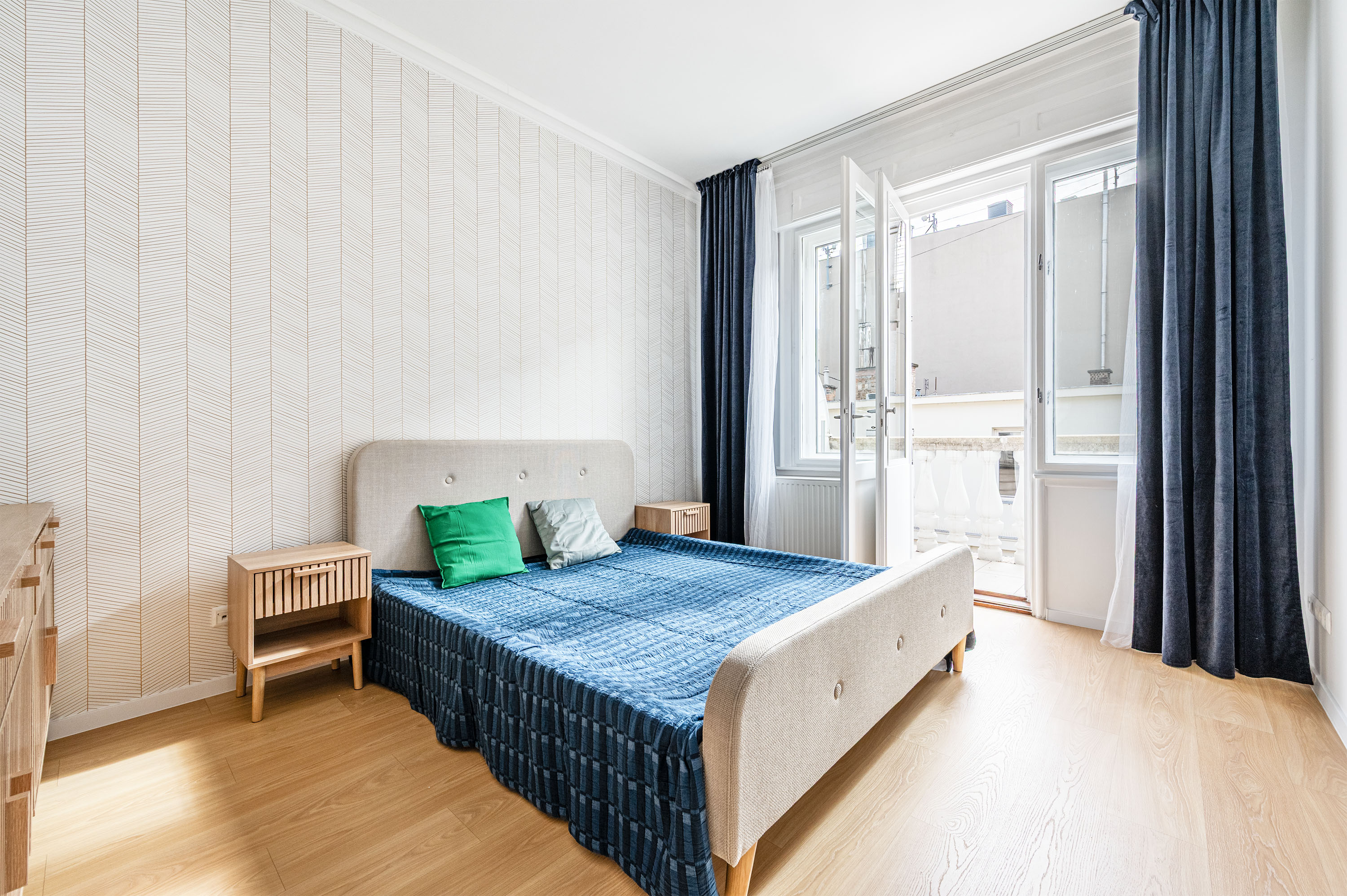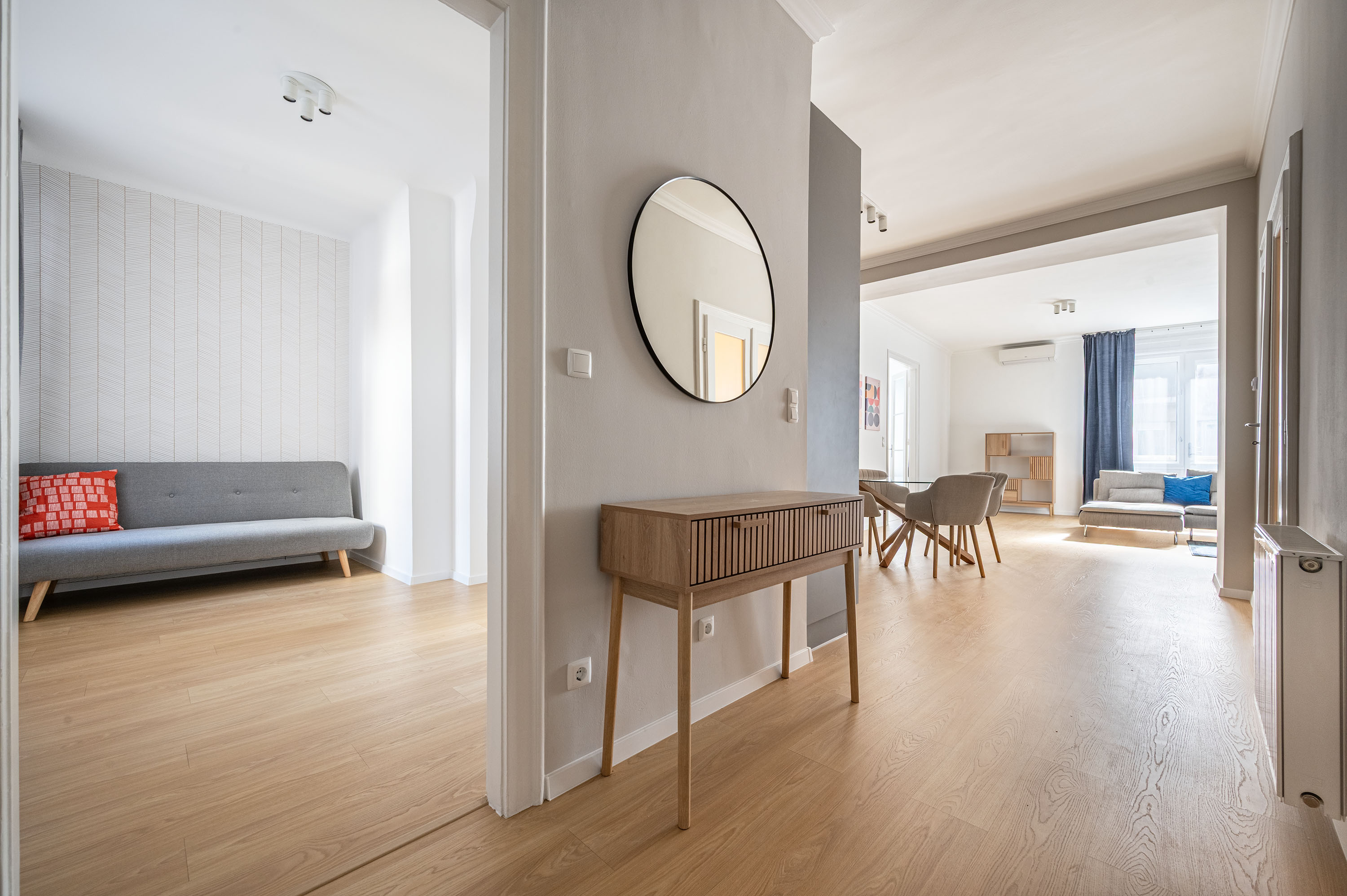 A lakás nagy ablakfelületeinek köszönhetően rendkívül világos, tágas terekkel és kellemes hangulattal rendelkezik. A Váci utca, a Duna-korzó és a Vörösmarty tér néhány lépésre található – ideális választás azok számára, akik szeretik a belváros pezsgését.