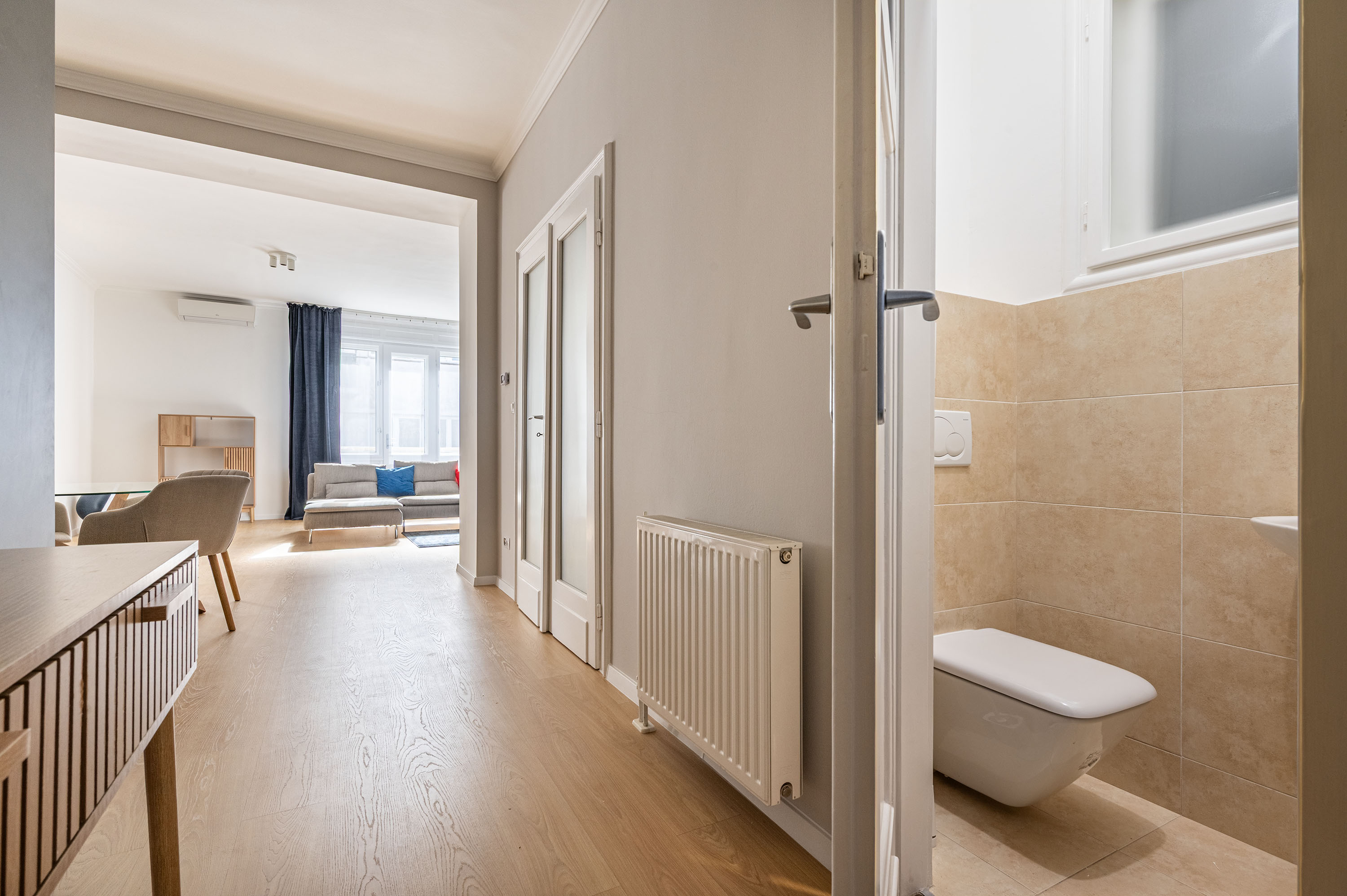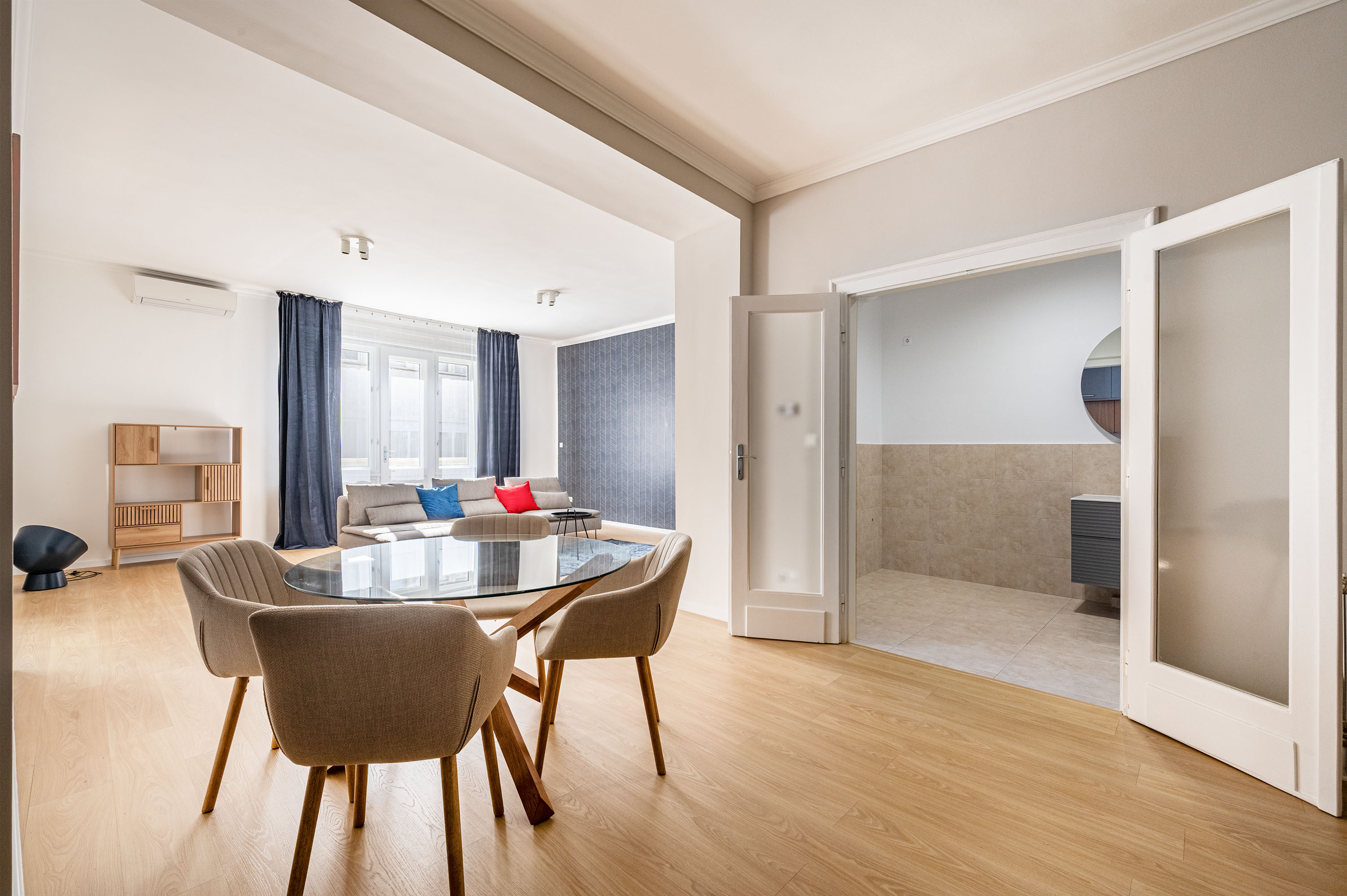 Budapest belvárosának egyik legkiemelkedőbb lokációjában, a Régi Posta utcában, a Váci utca és a Duna korzó közvetlen közelében kínálunk eladásra egy 91 m²-es, teljeskörűen felújított, világos lakást 10 m²-es terasszal és pincei tárolóval.