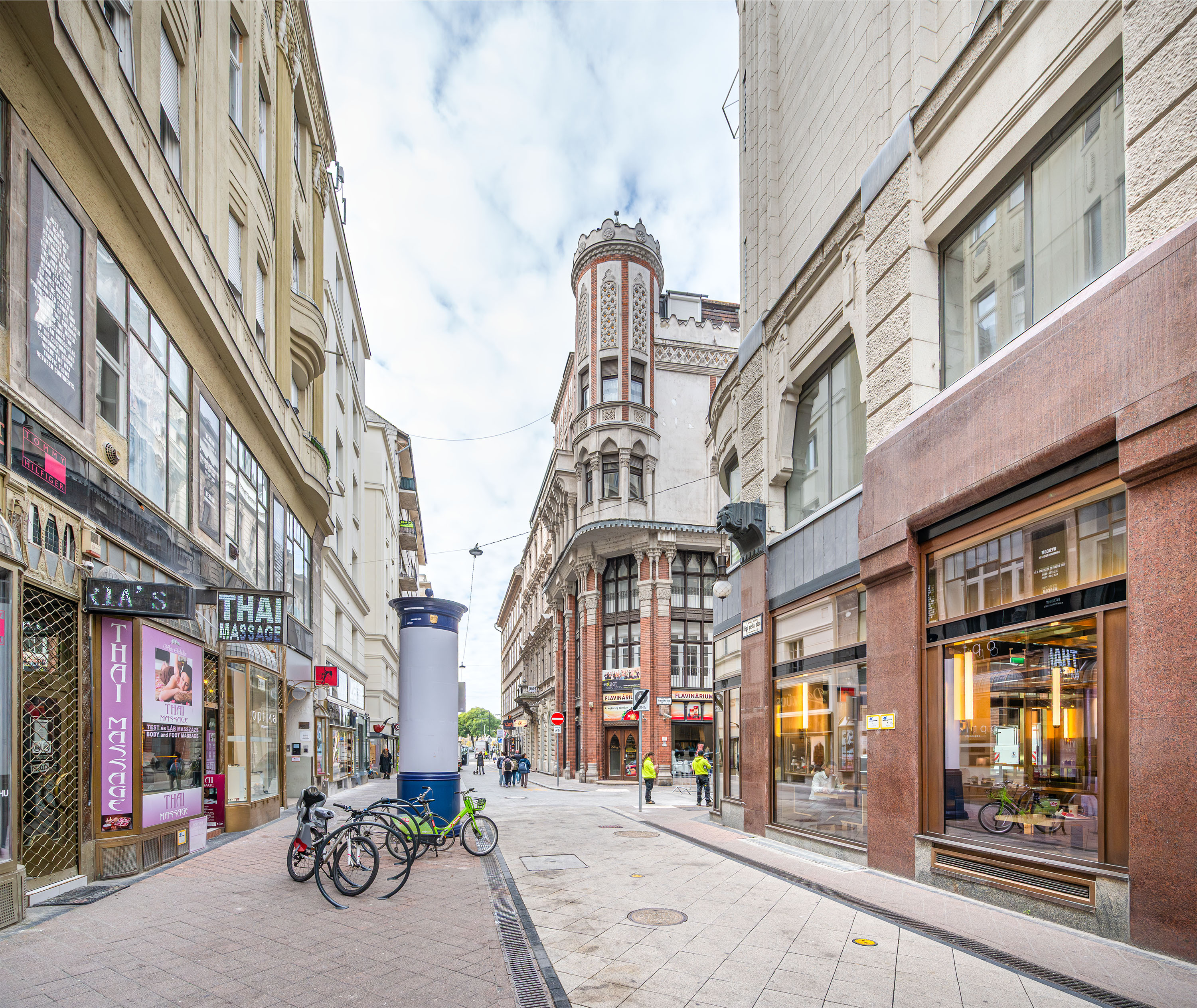 A földszinti utcai szárnyak eredetileg is üzletként épültek, hiszen a LENZ testvérek gyarmatáru - nagykereskedéssel foglalkoztak és az épületben nyitott üzlet az elsők között volt a Pest, Buda és Óbuda egyesítéséből született Budapesten.