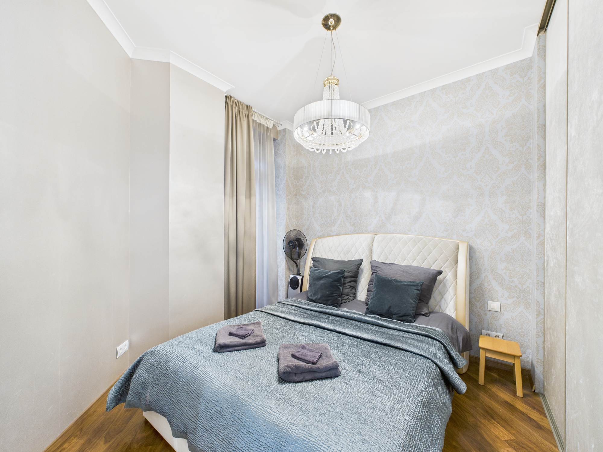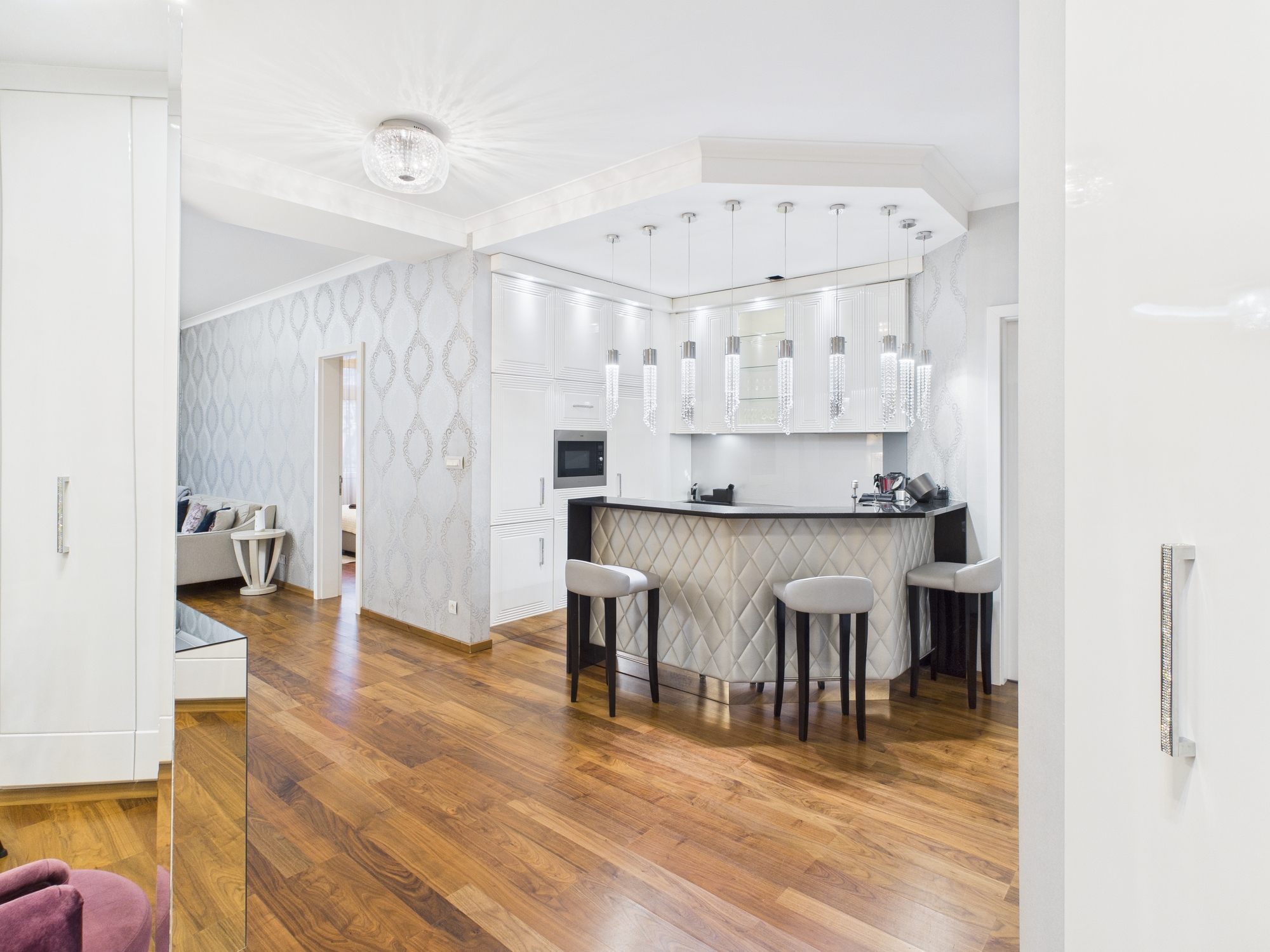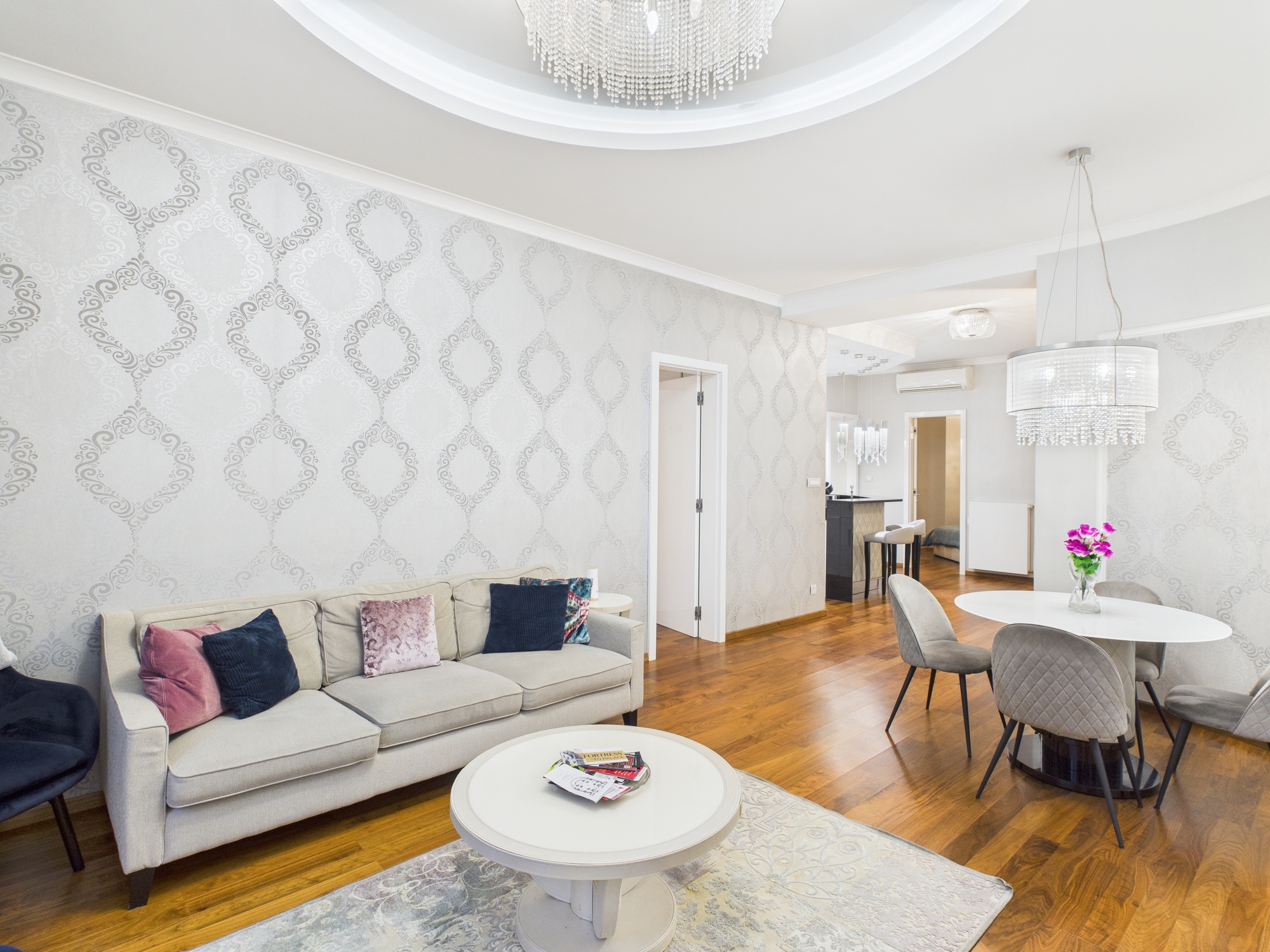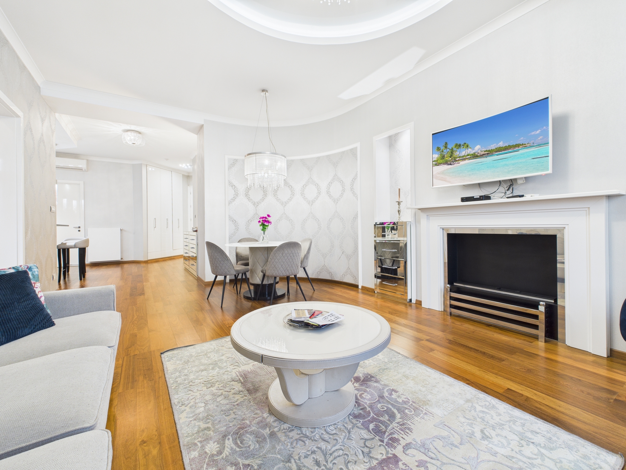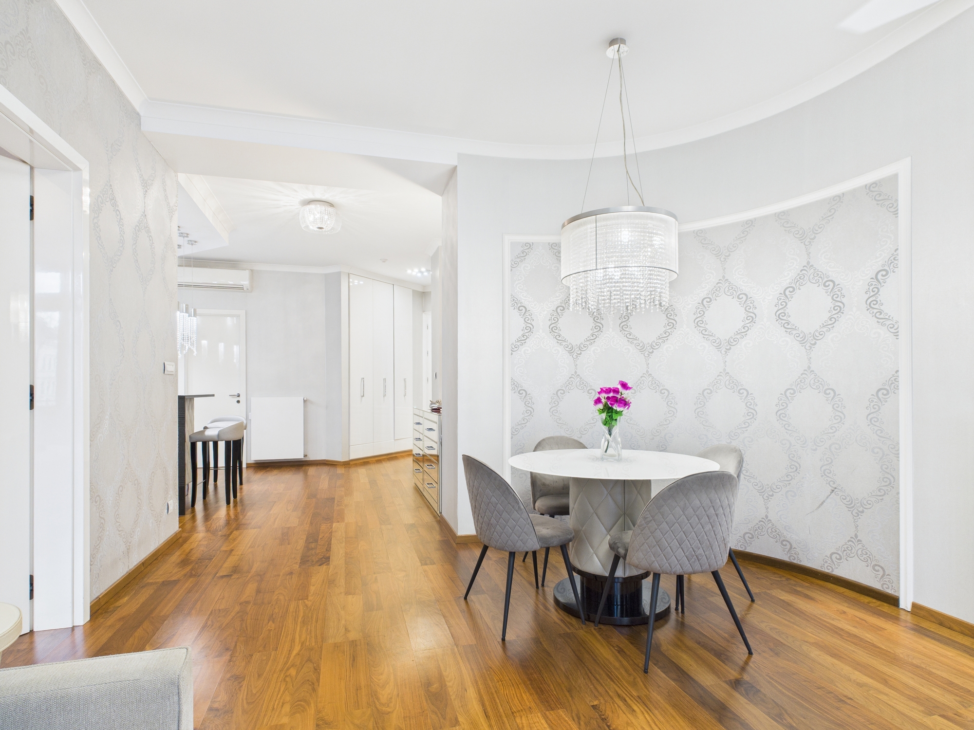 The property is finished with high-quality parquet flooring and tiles, which blend seamlessly with the apartment’s overall style.