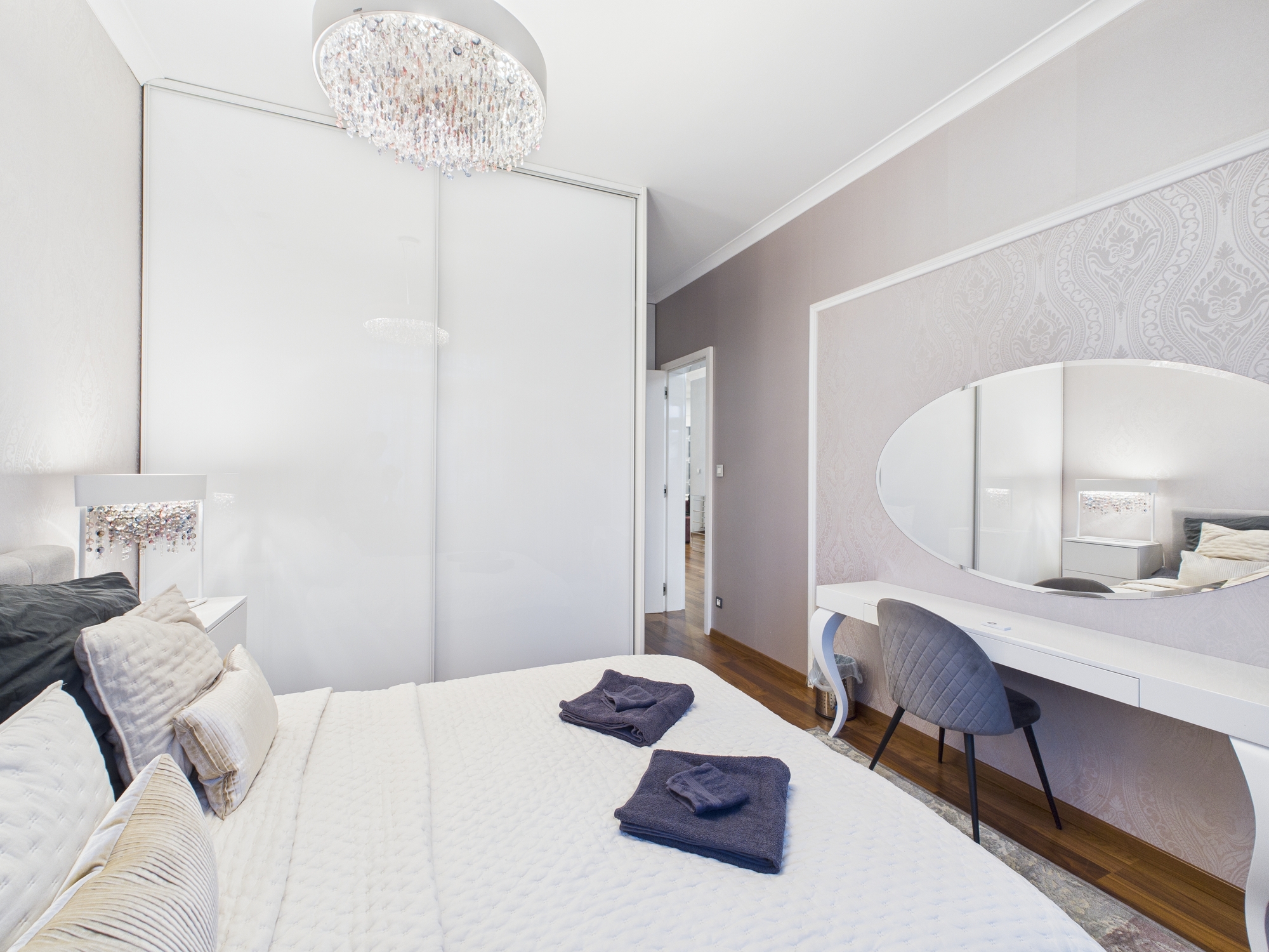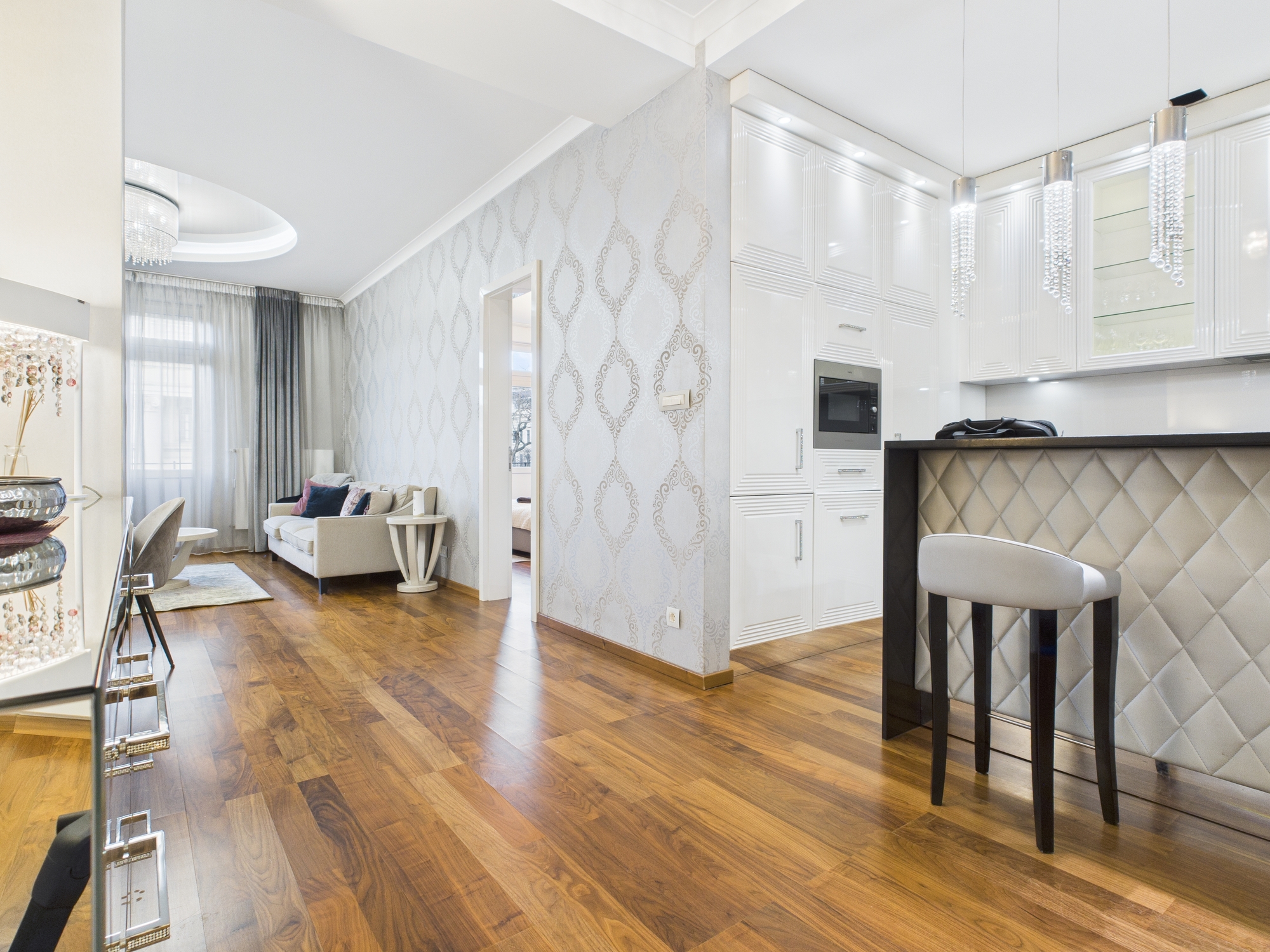 Az ingatlanban két hálószoba, egy napfényben úszó, reprezentatív nappali, két elegáns fürdőszoba és egy modern, igényesen kialakított konyha található.