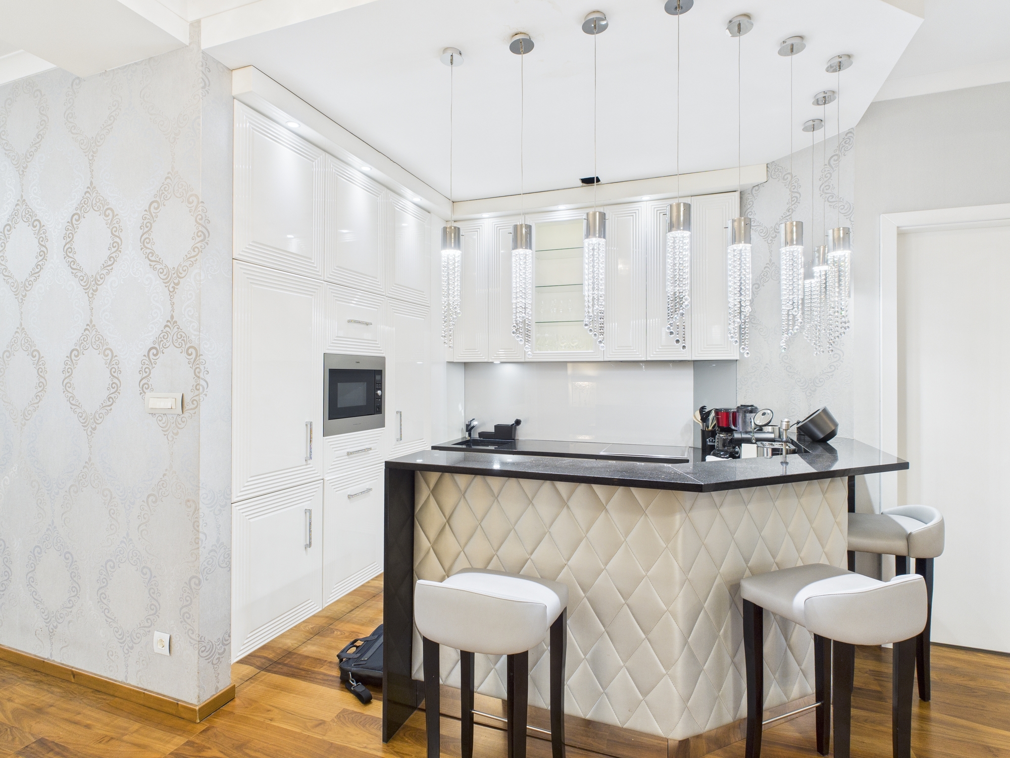A konyha prémium AEG háztartási gépekkel van berendezve, amelyek a letisztult dizájnt és a megbízható minőséget képviselik.