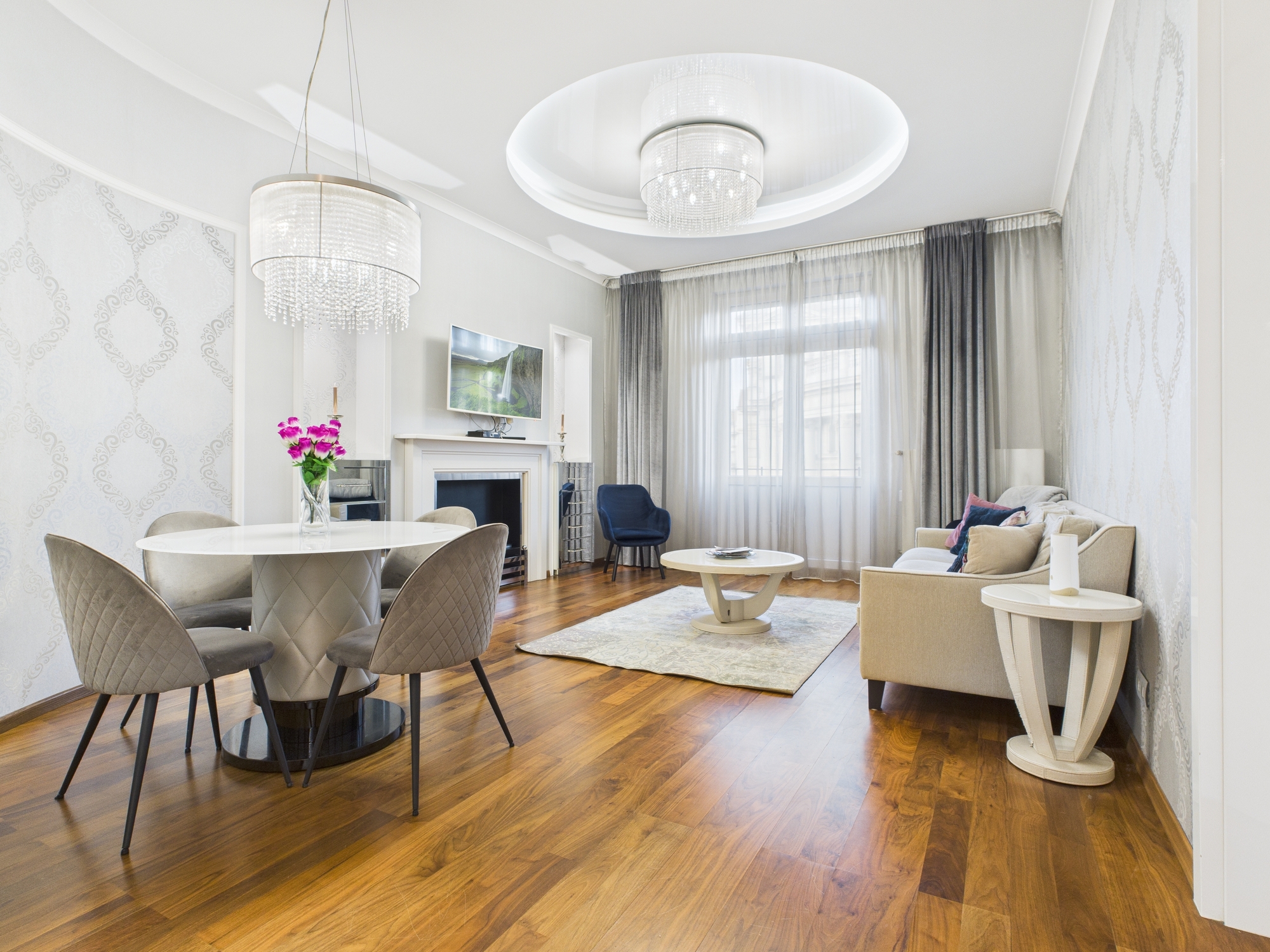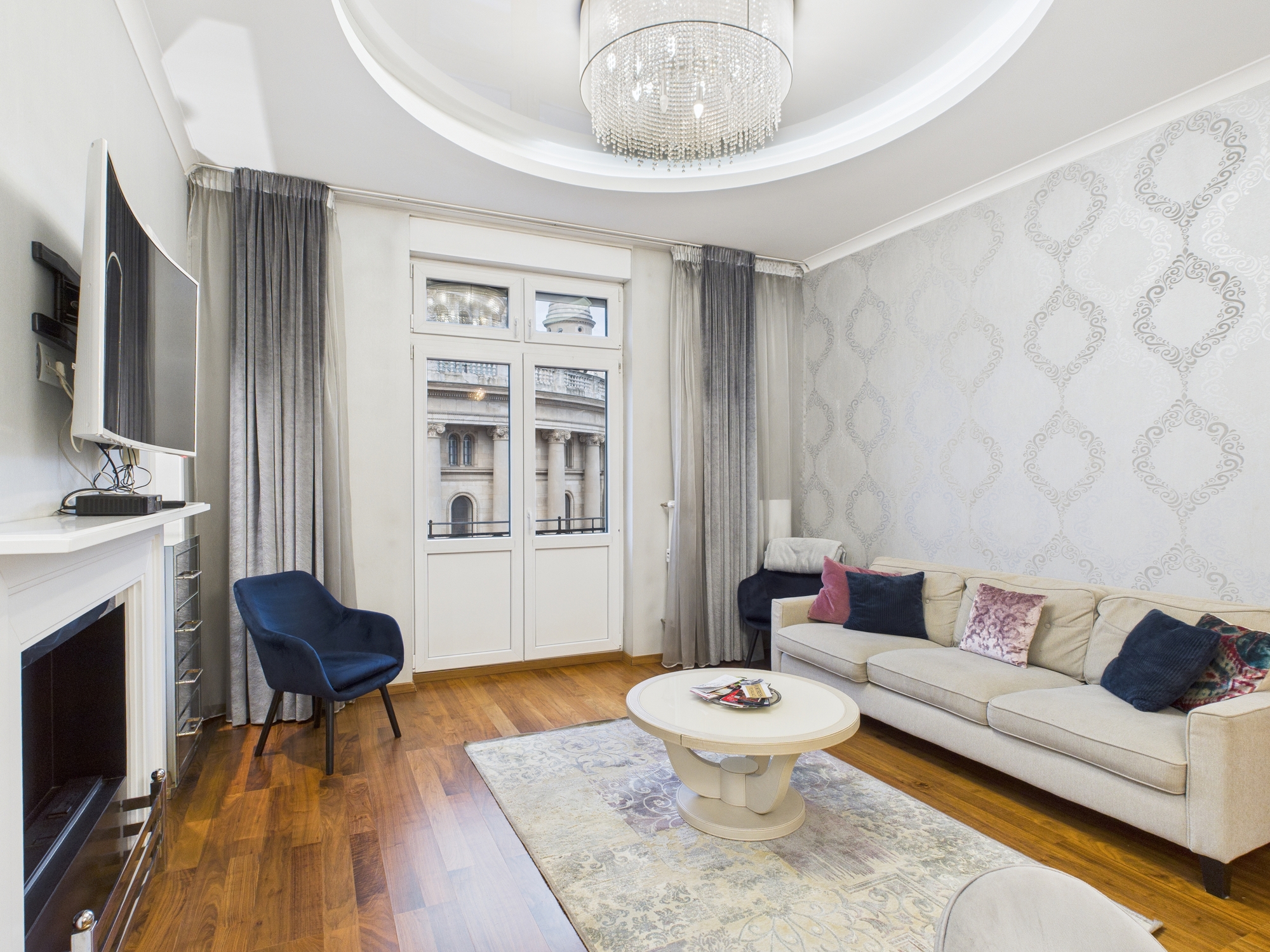 One of the apartment’s most valuable attributes is its breathtaking panoramic view, enjoyed through large windows that flood the interiors with natural light throughout the day. The refined elegance of the classic bourgeois style, combined with quality finishes and bright interiors, creates a truly distinctive and inviting atmosphere.