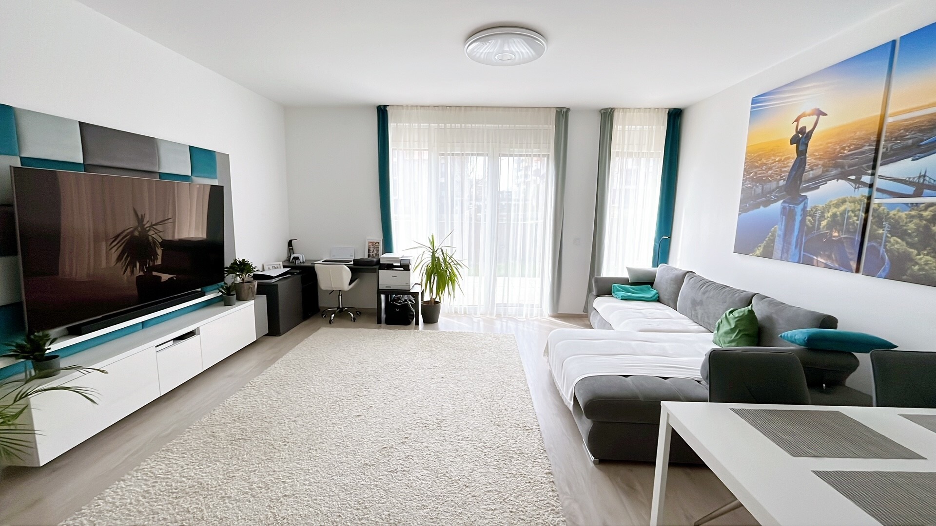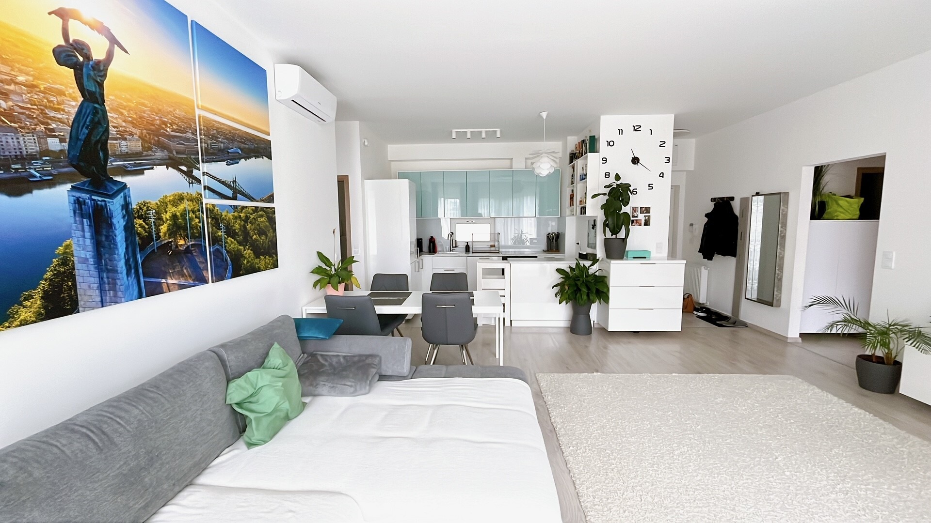 FOR RENT in the XI. district, Sasad Liget Residential Park, in the 7th phase of a very well distributed, GARDEN, LARGE, 100 sqm terrace, living room + 2 bedrooms, double comfort, American kitchen, 2 bathrooms, new construction apartment. The apartment is PARTLY FURNISHED with the following furniture: