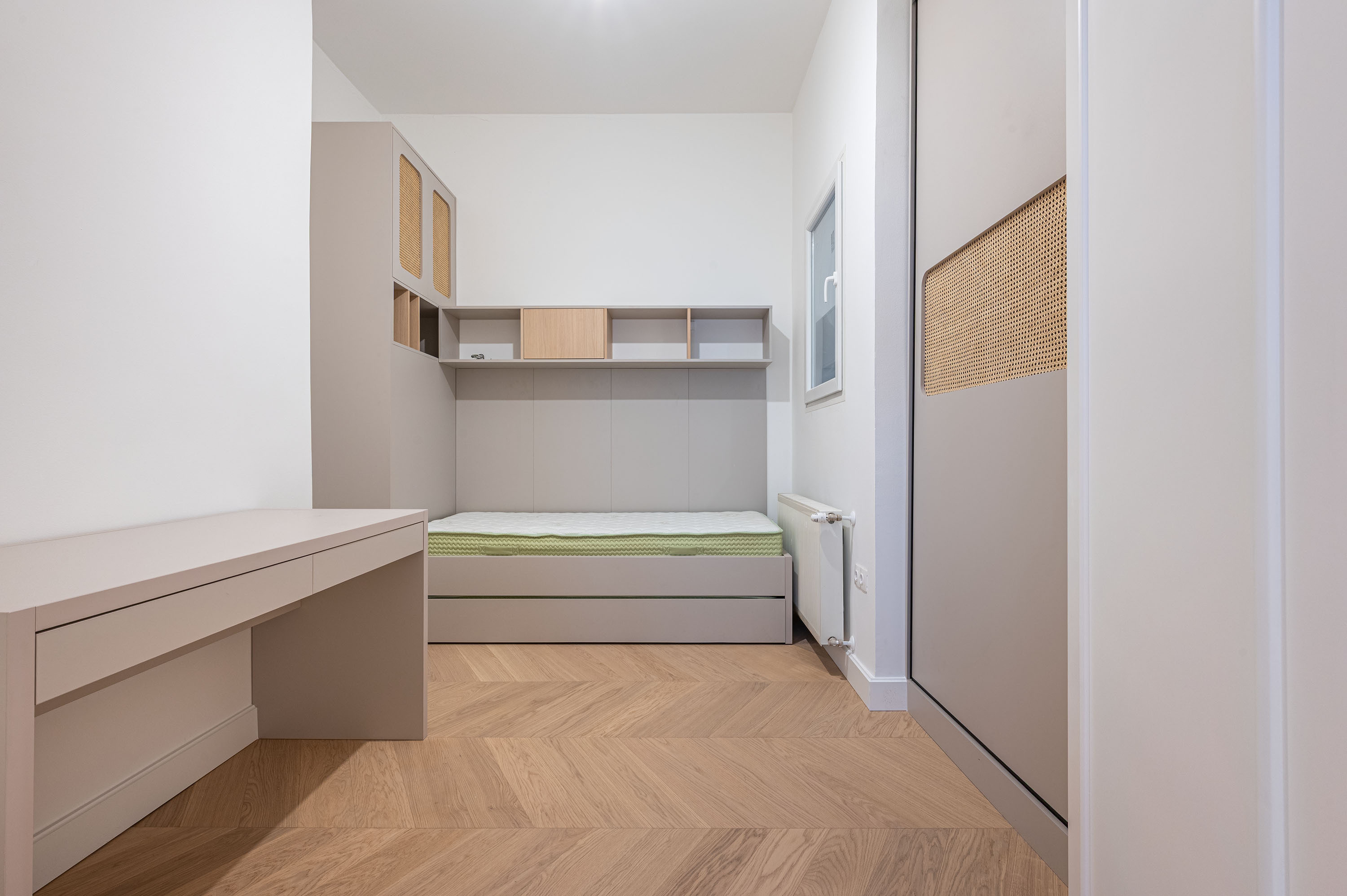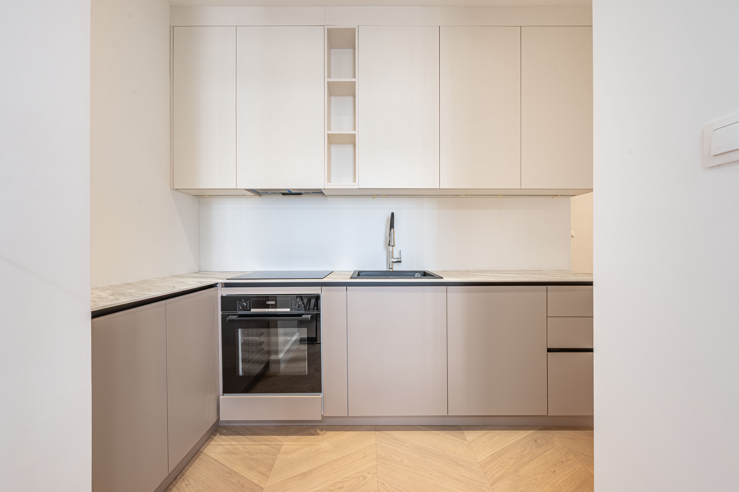 Az ingatlan teljesen bútorozott, ízlésesen berendezett. A nappaliban ülőgarnitúra, dohányzóasztal, étkezőasztal és könyvespolc található. A hálószobában franciaágy, komód és ruhásszekrény biztosítja a kényelmet, míg a kisebb szoba dolgozó- vagy vendégfunkcióra is alkalmas. A konyha modern gépekkel felszerelt: beépített főzőlap és sütő, hűtőszekrény, mosogatógép, valamint külön mosógép is rendelkezésre áll. A nyílászárókra motoros, távirányítós redőnyök kerültek, melyek egyszerre növelik a komfortot és a biztonságot.