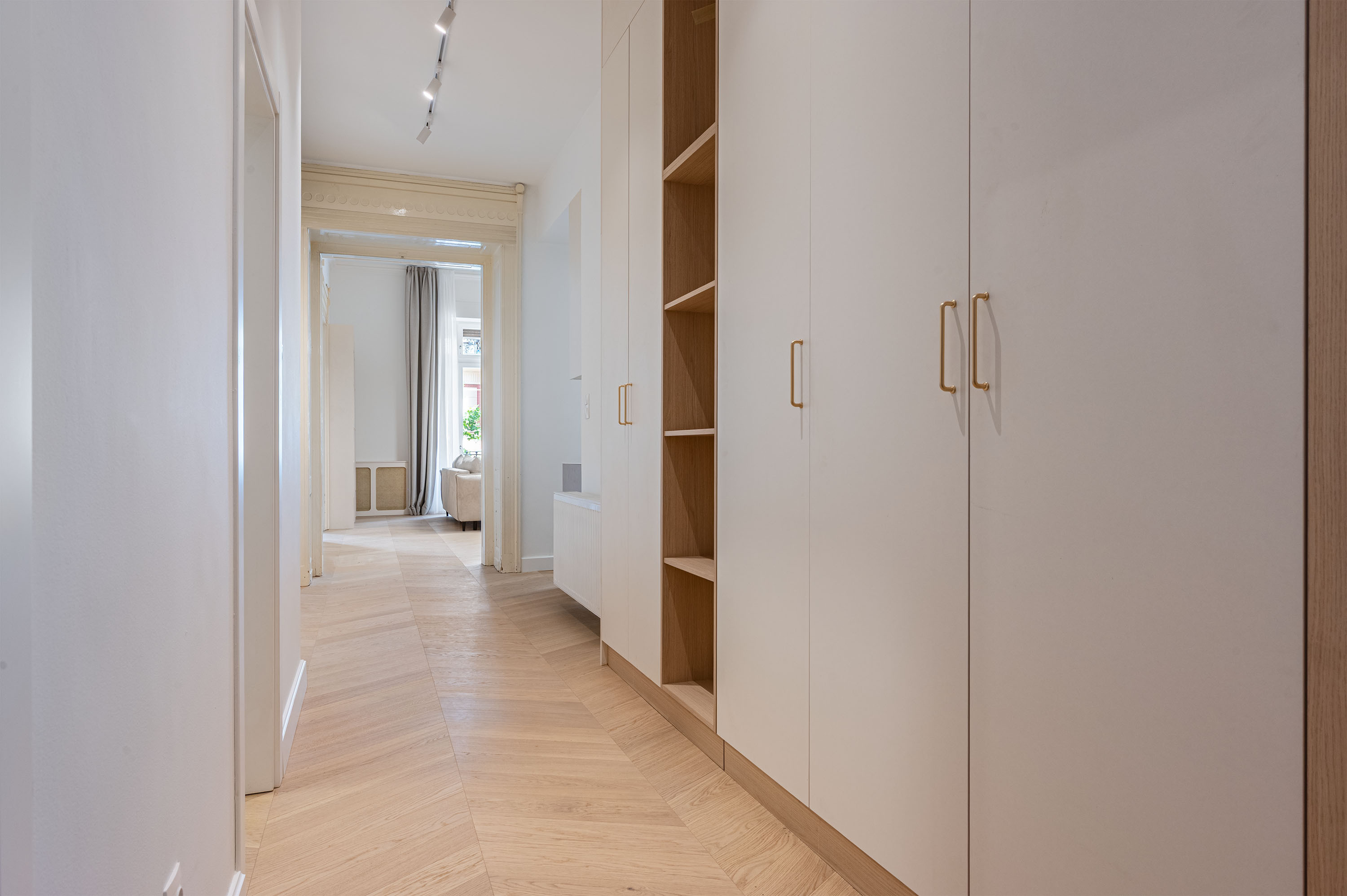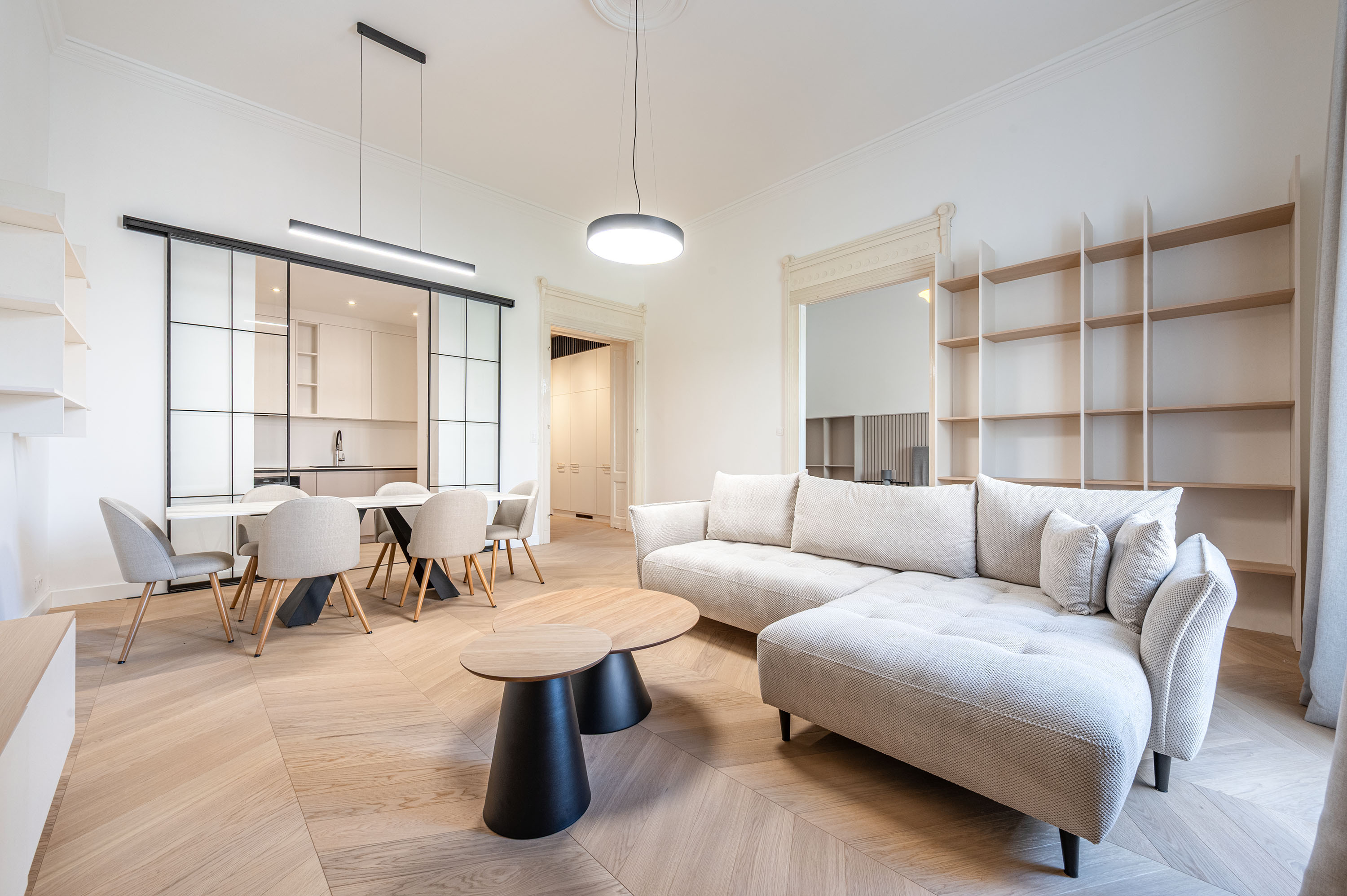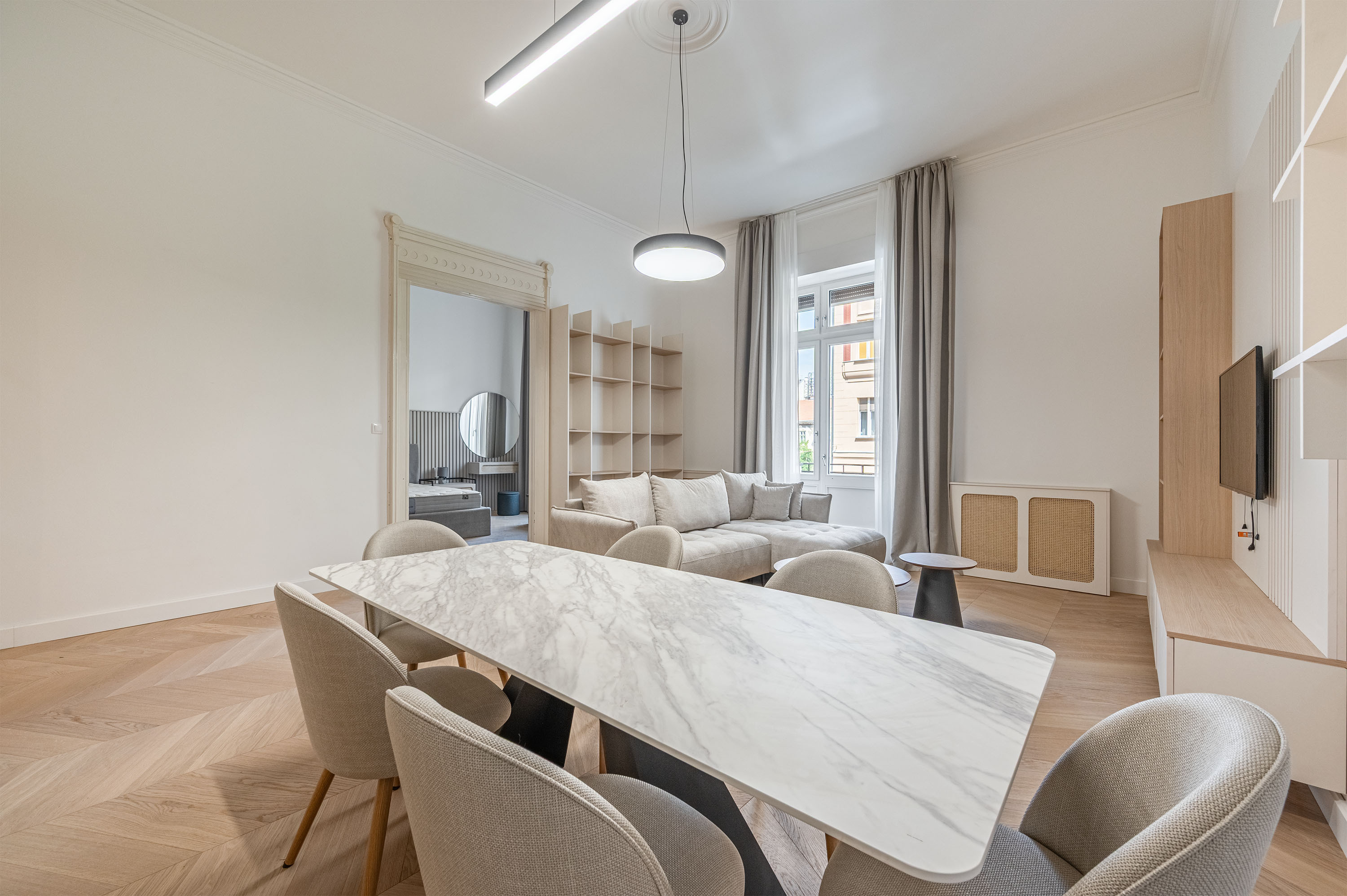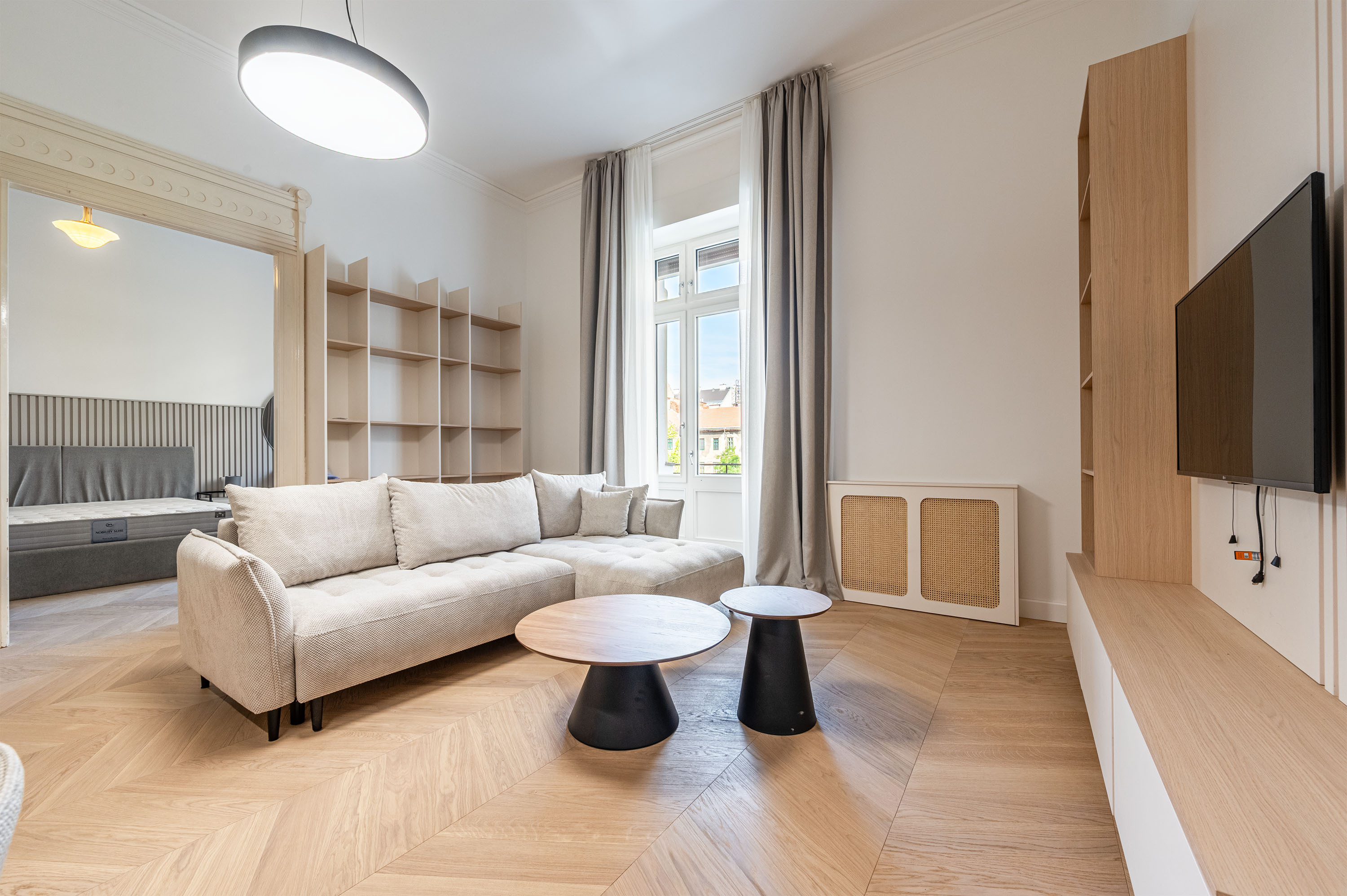 Az ingatlan az első emeleten helyezkedik el egy rendezett társasházban. A valós alapterülete 106 m² (tulajdoni lap szerint 96 m²), amelyhez egy 6 m²-es erkély is tartozik. A lakás tágas, világos és napfényes- különösen a délkeleti tájolású utcai szobákban. A bejárattal szemben található egy kisebb szoba, amely dolgozó-, gyermek- vagy vendégszobának is ideális. A tágas nappaliból egy hangulatos erkély nyílik a Hold utcára, mellette pedig a fő hálószoba kapott helyet, saját, külön bejáratú fürdőszobával. Ezen kívül külön étkezős konyha, második fürdőszoba és egy külön WC is kialakításra került. A lakás teljeskörű felújításon esett át, amely során megőrizték a polgári eleganciát, miközben modern kényelmi megoldásokkal gazdagították. A leendő bérlő lehet az első, aki használatba veszi.