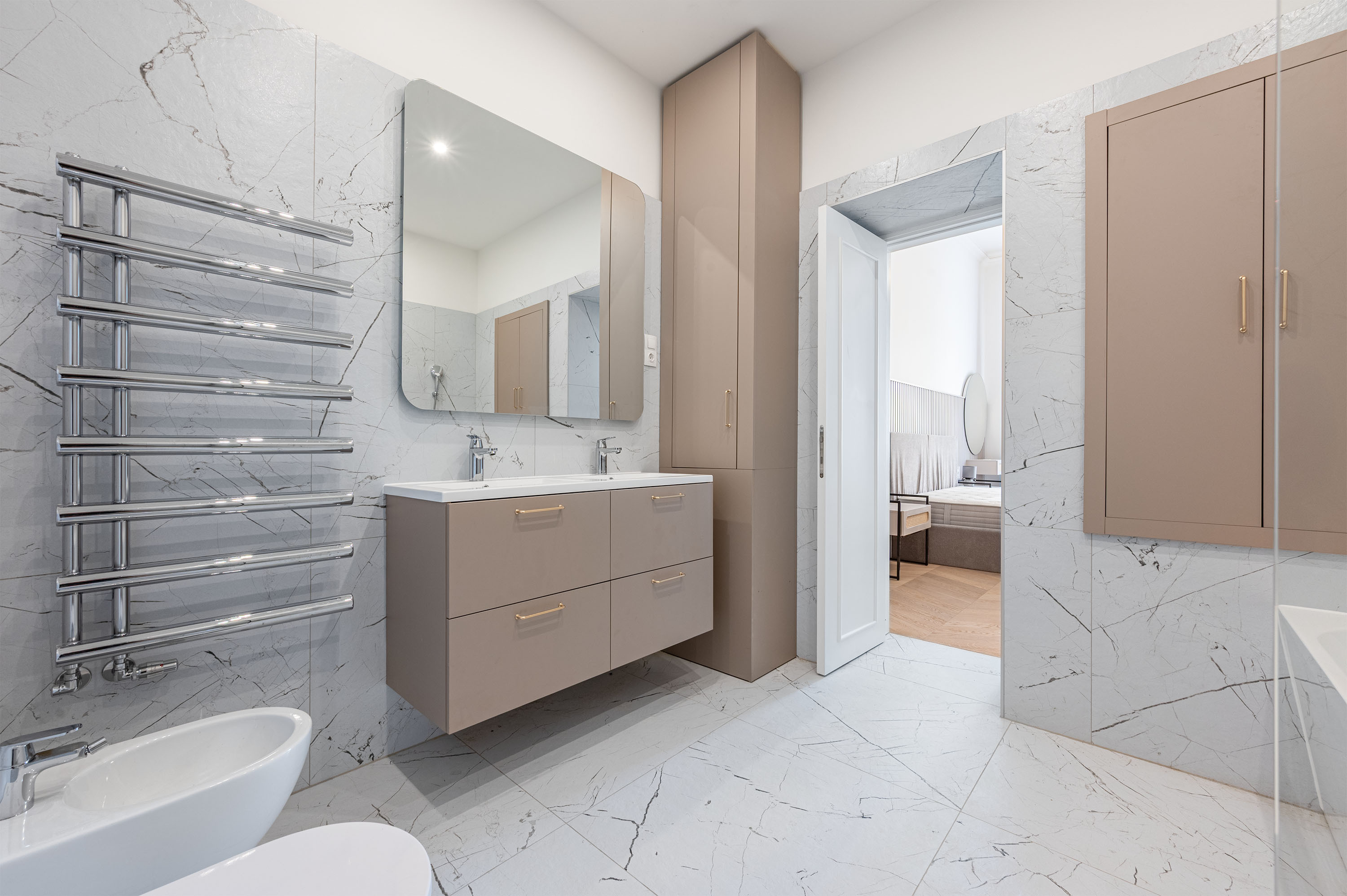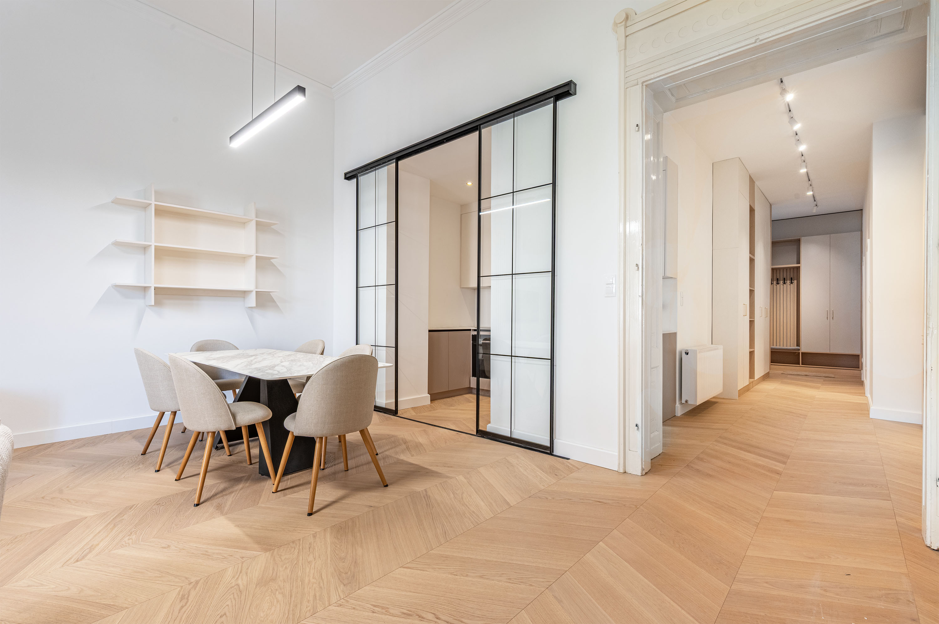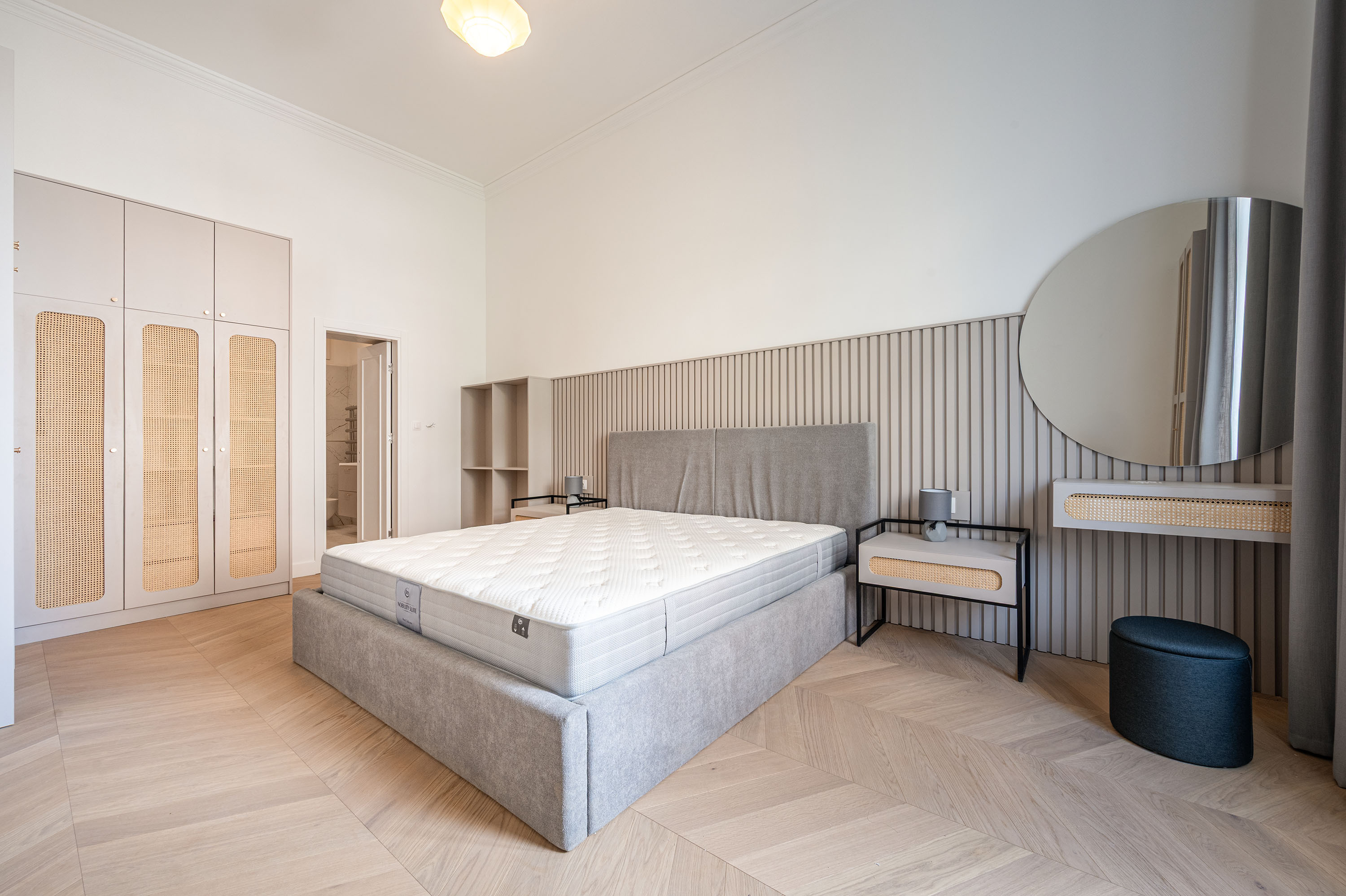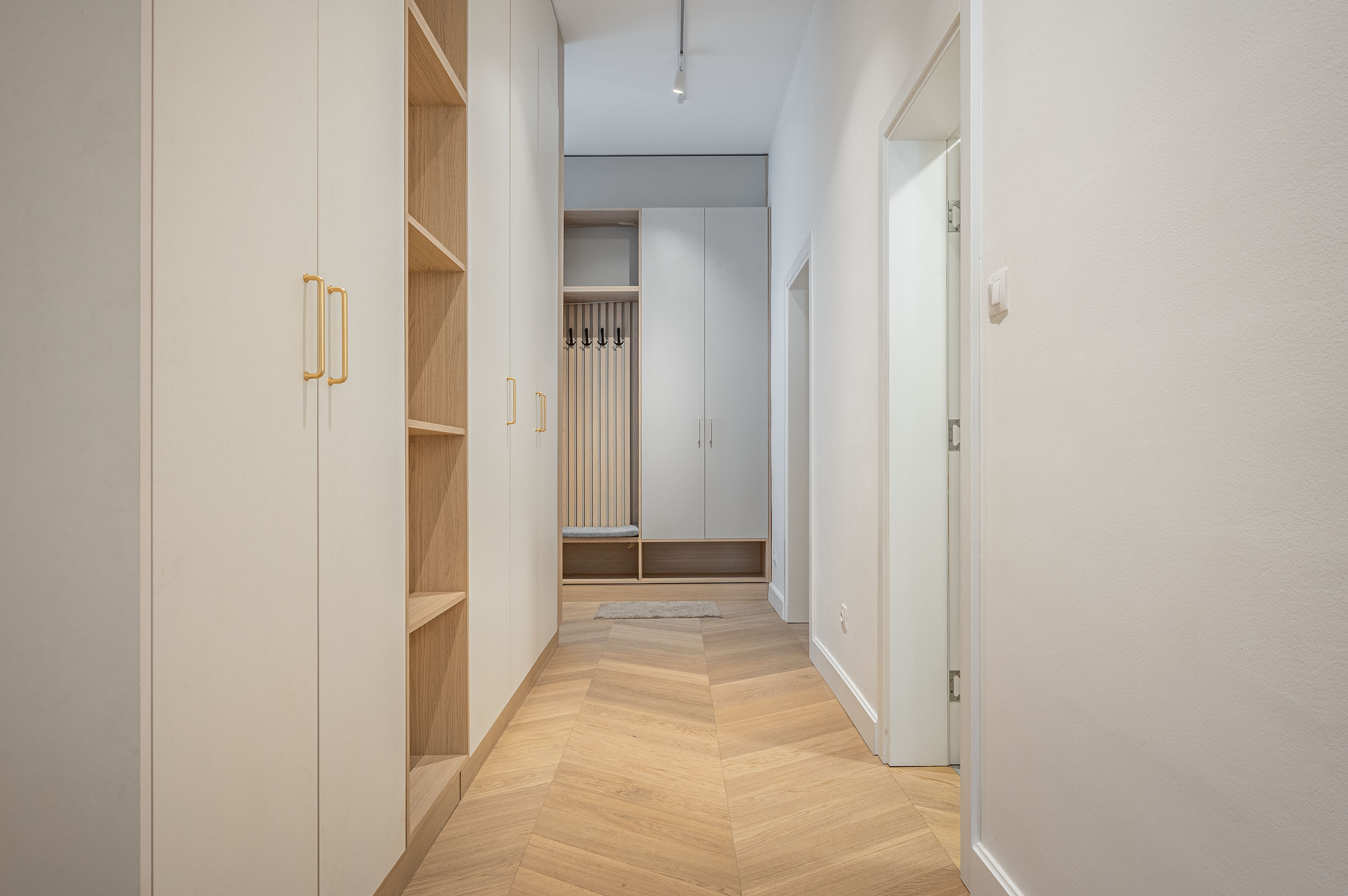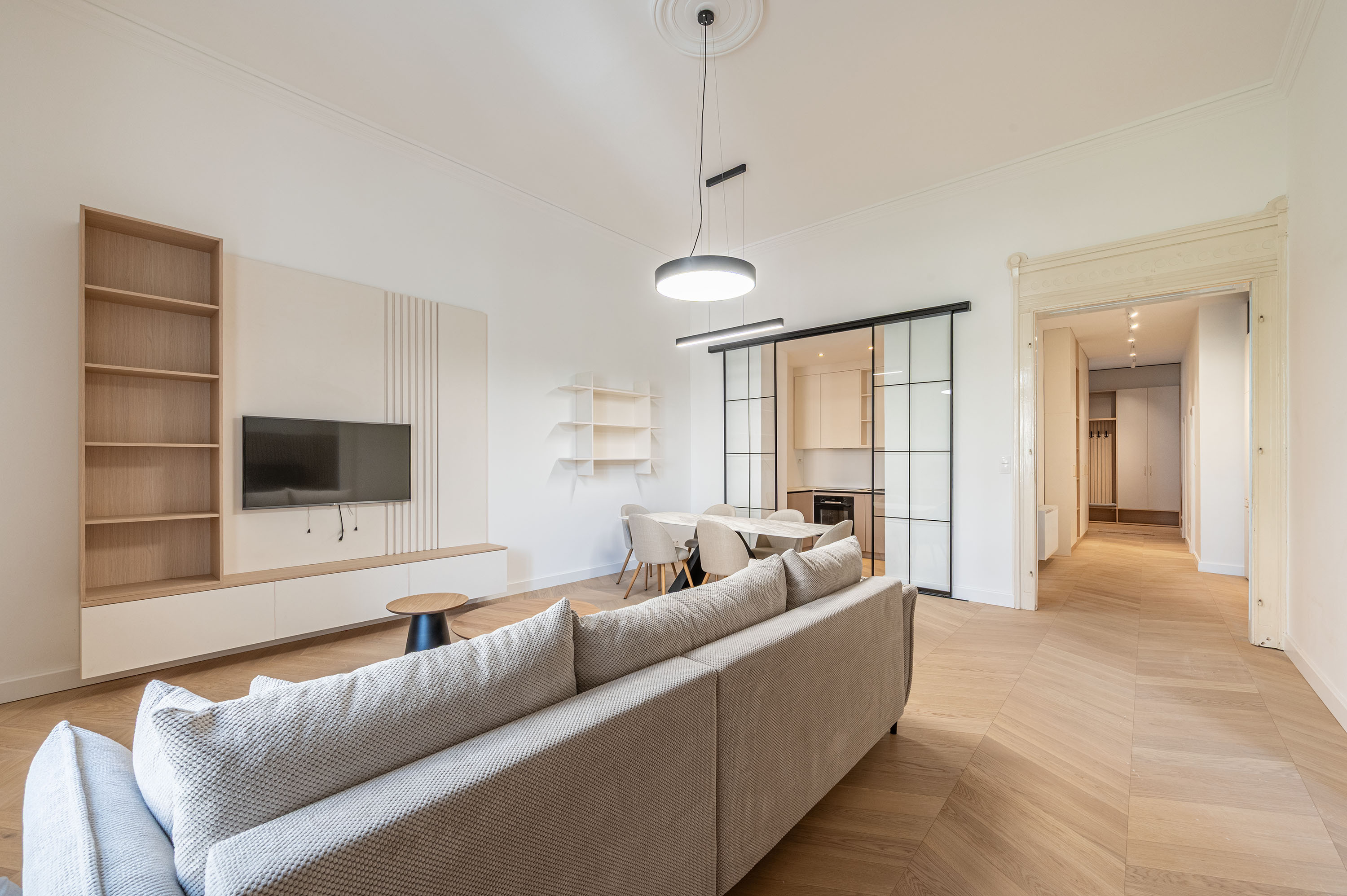 Az ingatlan az első emeleten helyezkedik el egy rendezett társasházban. A valós alapterülete 106 m² (tulajdoni lap szerint 96 m²), amelyhez egy 6 m²-es erkély is tartozik. A lakás tágas, világos és napfényes- különösen a délkeleti tájolású utcai szobákban. A bejárattal szemben található egy kisebb szoba, amely dolgozó-, gyermek- vagy vendégszobának is ideális. A tágas nappaliból egy hangulatos erkély nyílik a Hold utcára, mellette pedig a fő hálószoba kapott helyet, saját, külön bejáratú fürdőszobával. Ezen kívül külön étkezős konyha, második fürdőszoba és egy külön WC is kialakításra került. A lakás teljeskörű felújításon esett át, amely során megőrizték a polgári eleganciát, miközben modern kényelmi megoldásokkal gazdagították. A leendő bérlő lehet az első, aki használatba veszi.