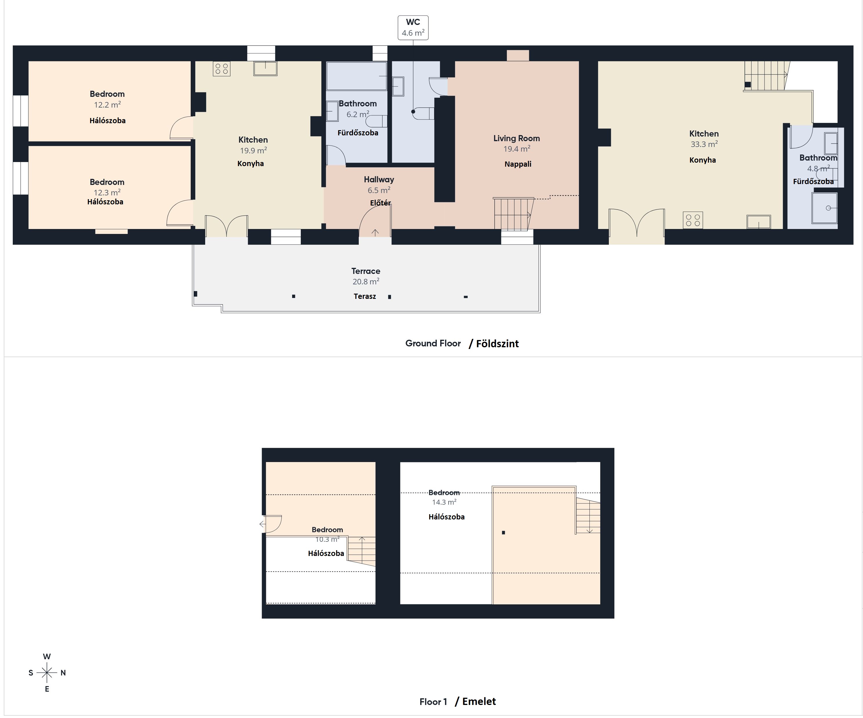 A nagyobb 106 m², míg a kisebb lakrész 38 m² alapterületű, így ideális választás lehet vendégház kialakítására vagy befektetési célra is.