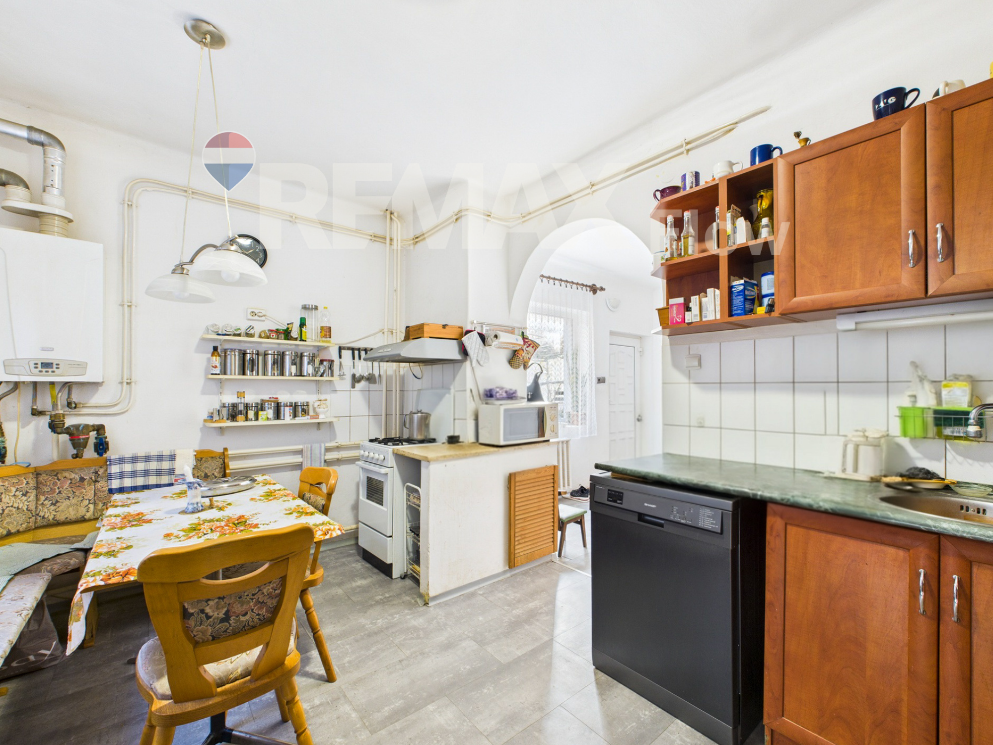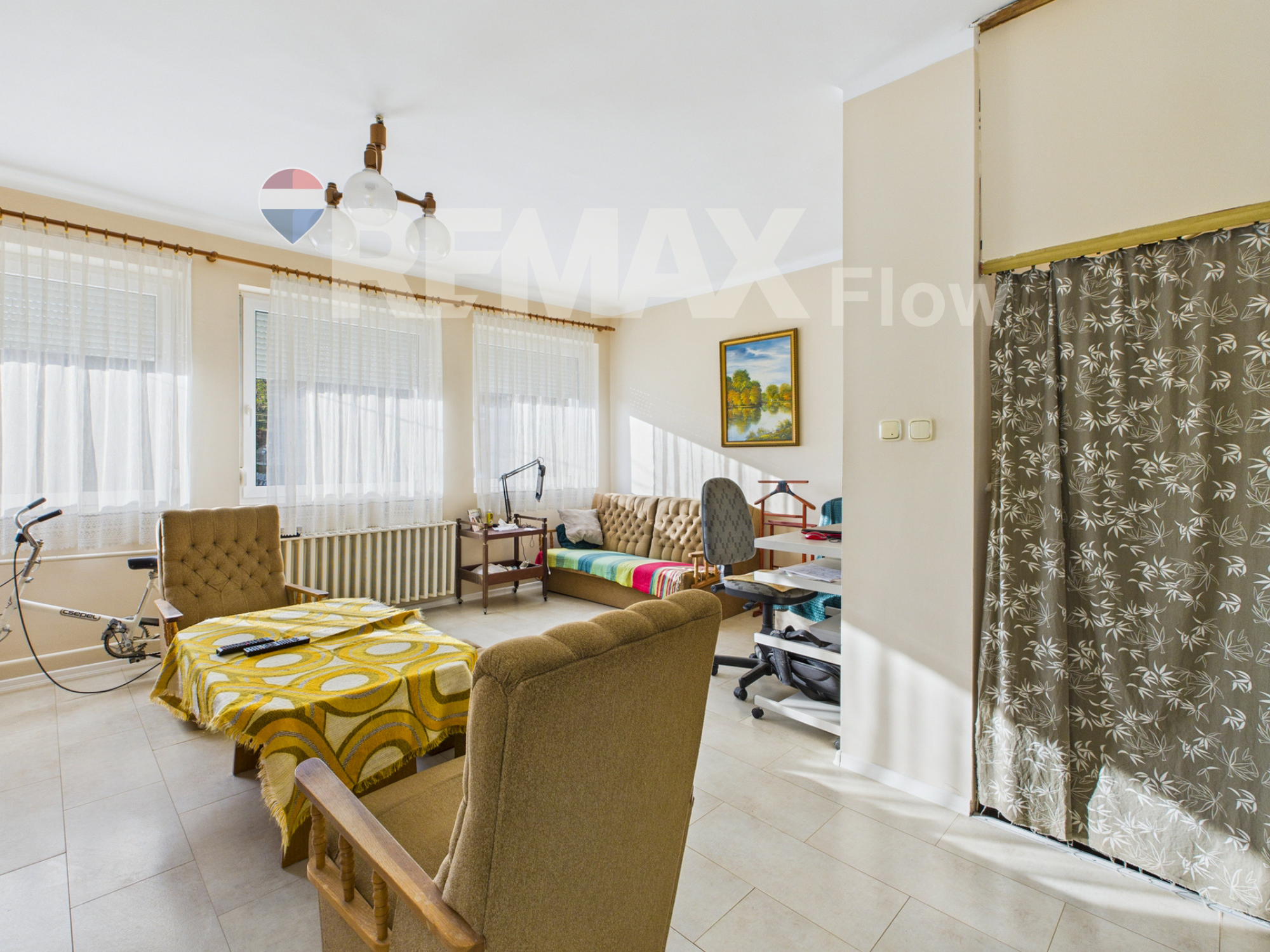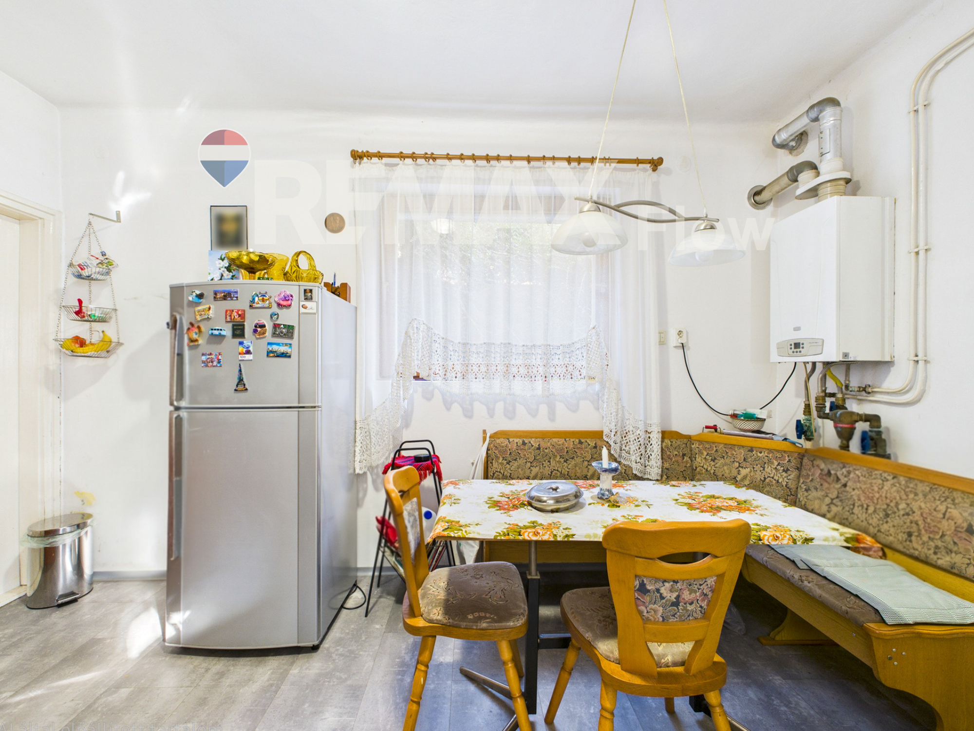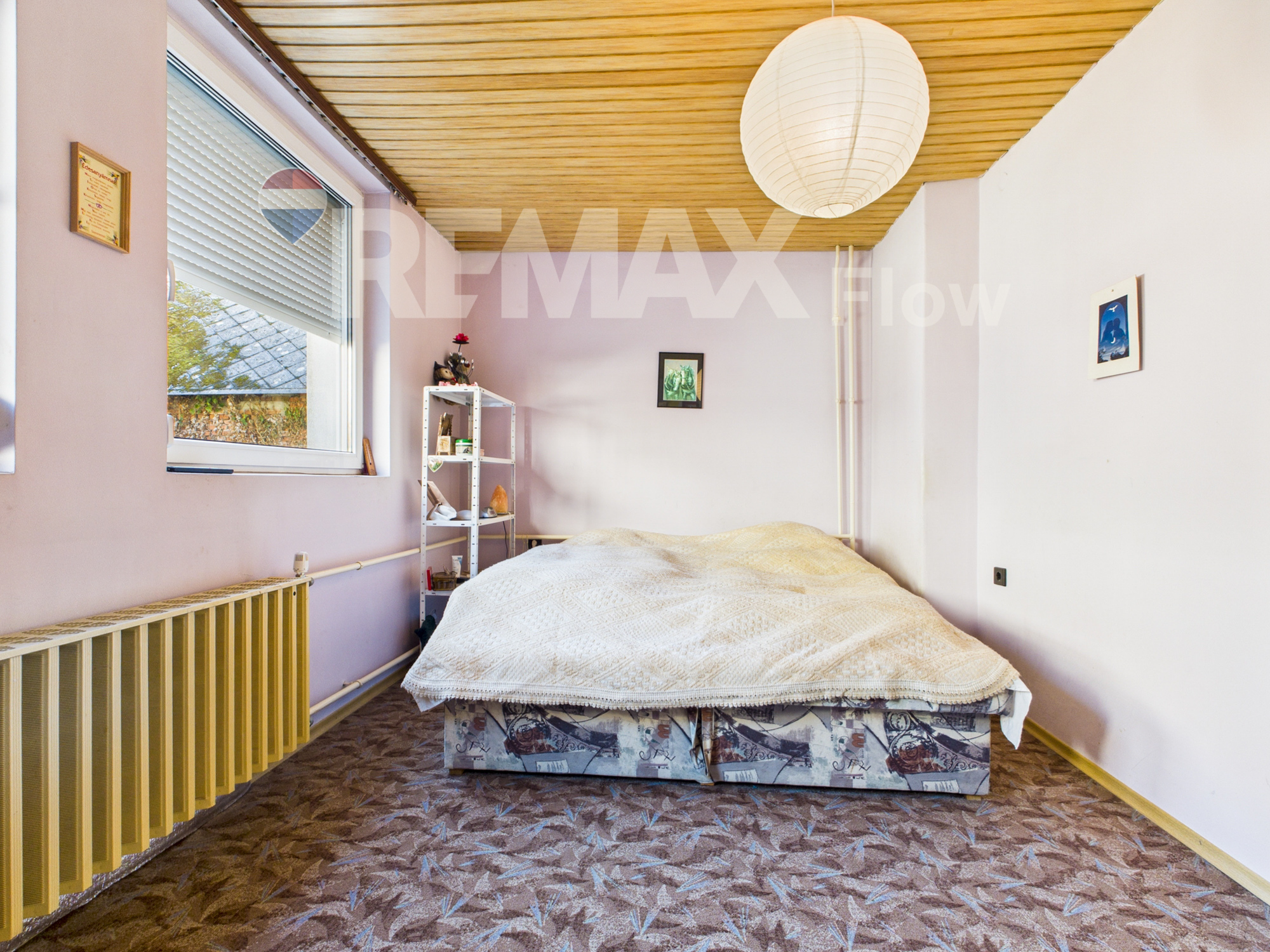 A lakószinten egy világos, tágas nappali (akár egy hálófülke is leválasztható belőle), egy étkezős konyha kamrával, egy nagy fürdőszoba és külön WC található. A tetőtérben három szoba kapott helyet, melyek közül kettő egymásból nyílik. A ház 1980-ban épült téglából, 7 cm hőszigeteléssel, műanyag nyílászárókkal és nagy ablakfelületekkel, amelyek szinte behozzák a természetet a nappaliba. A fűtést gázkazán és vegyestüzelésű kazán is biztosítja.