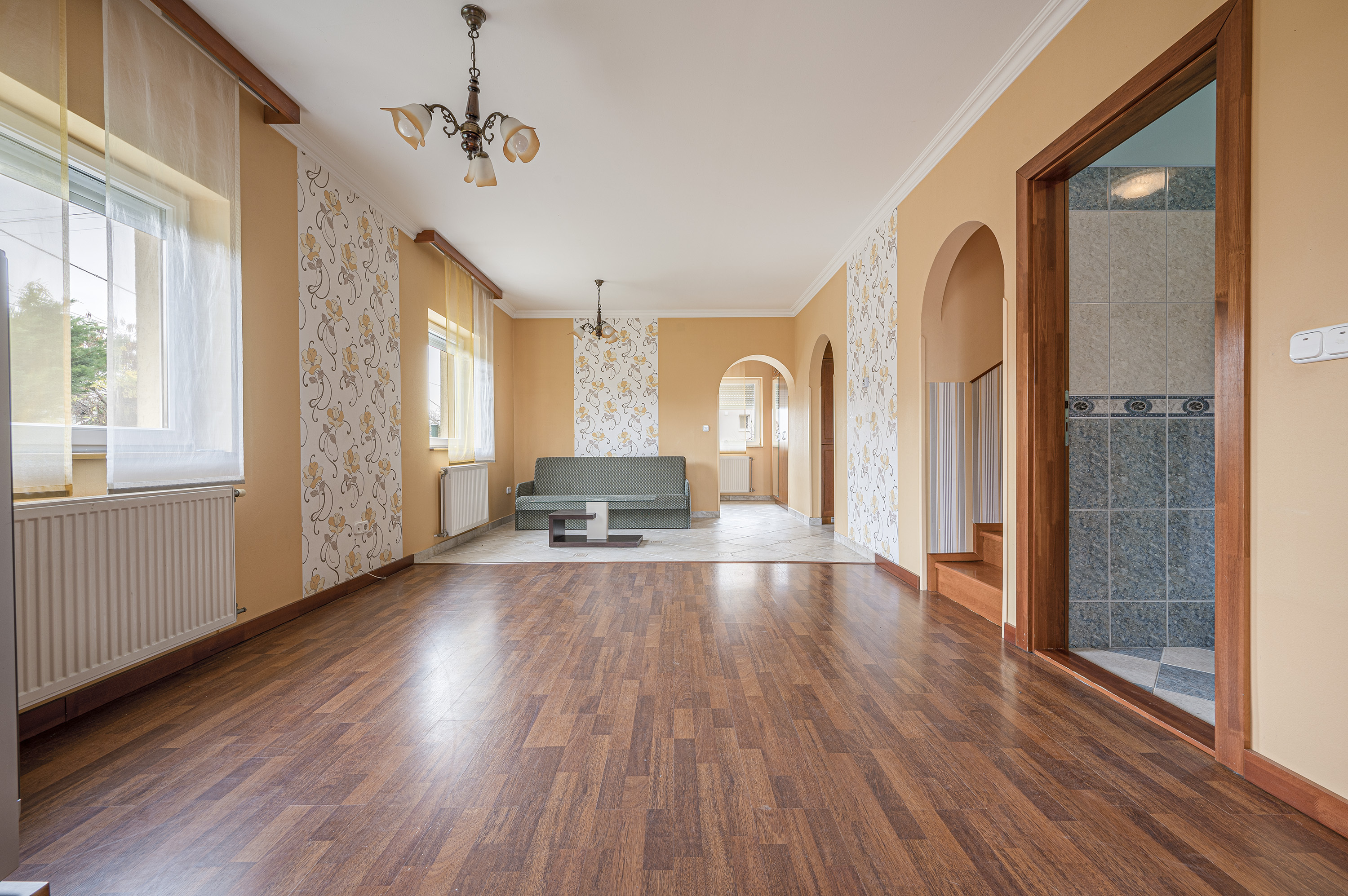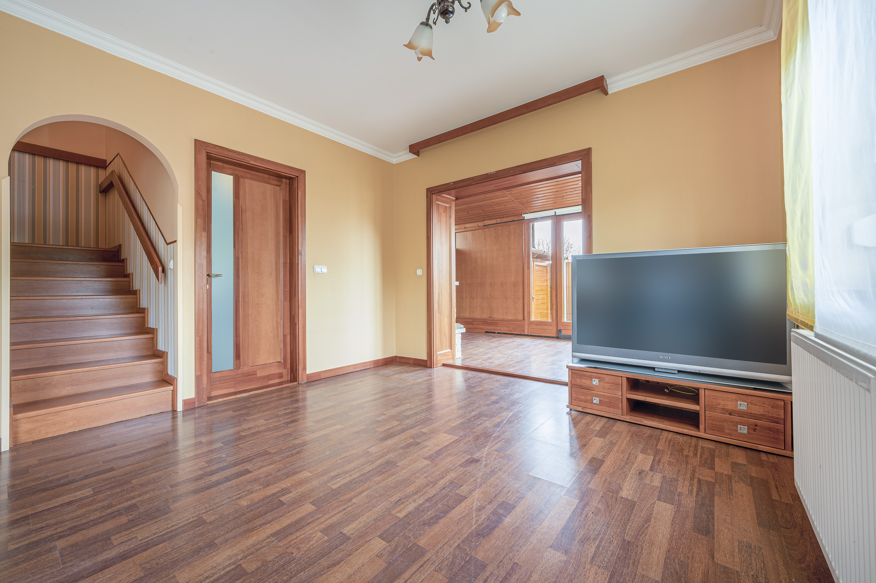 A staircase with real wood panelling by a carpenter leads upstairs, where there are three bedrooms and a bathroom with bathtub.