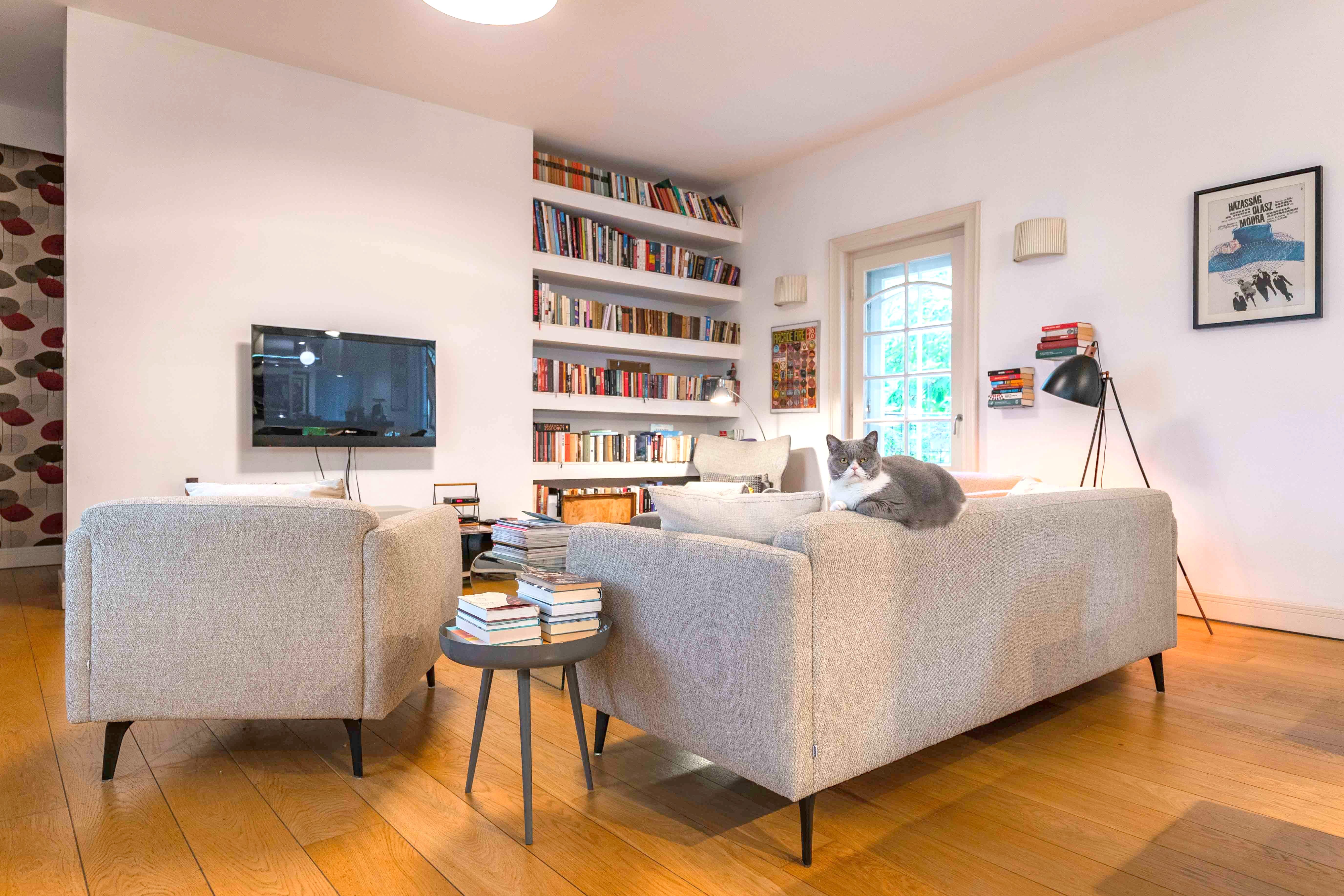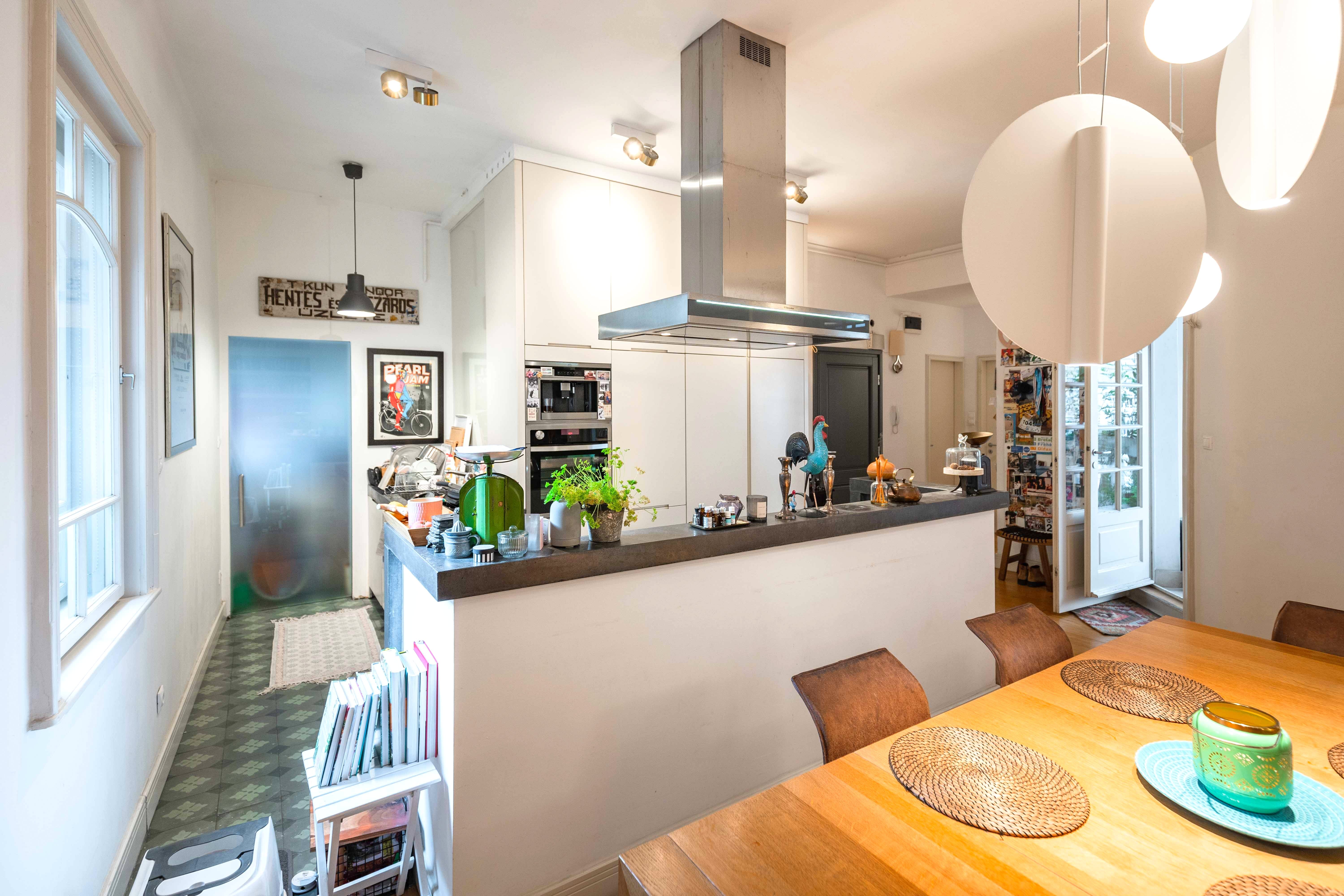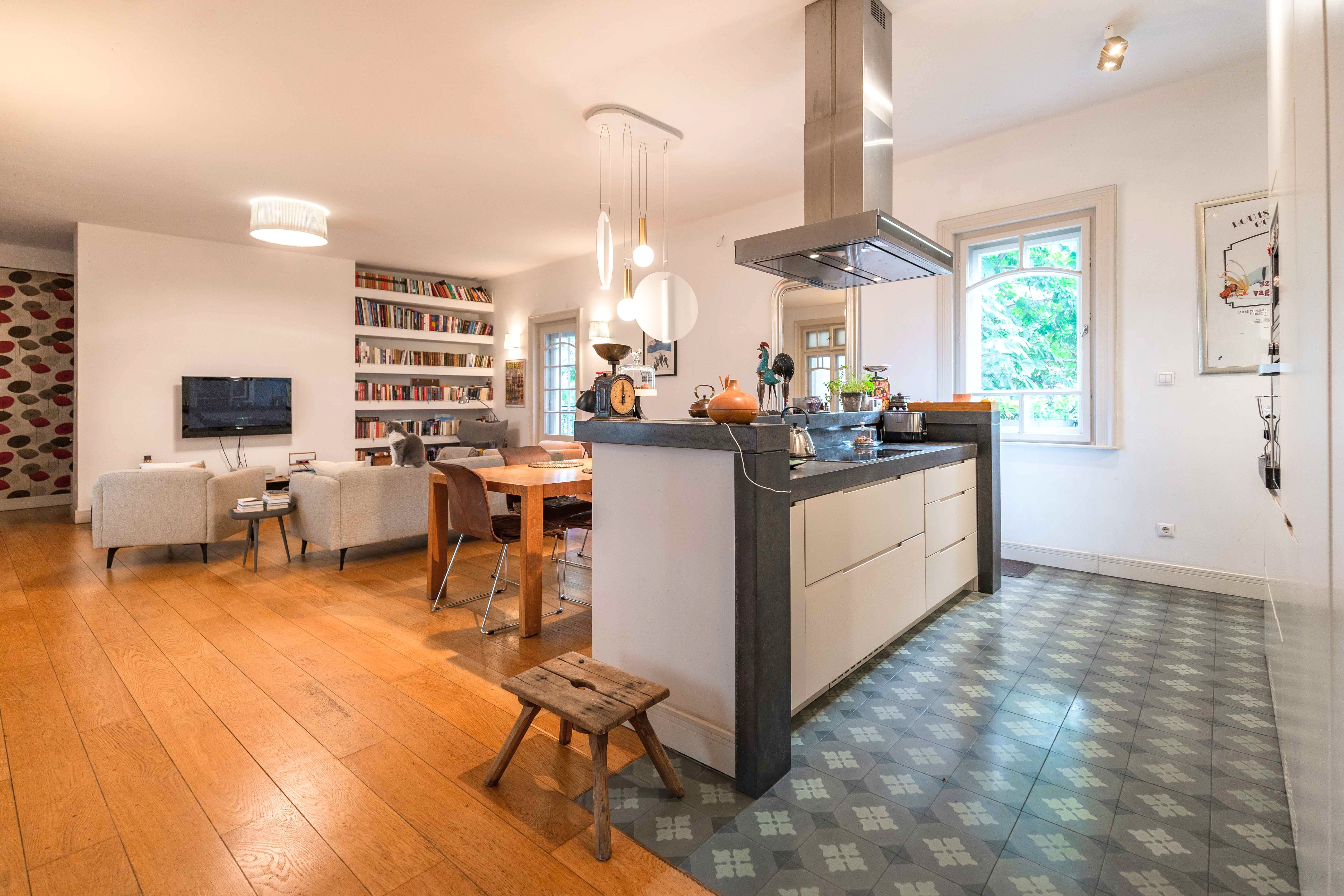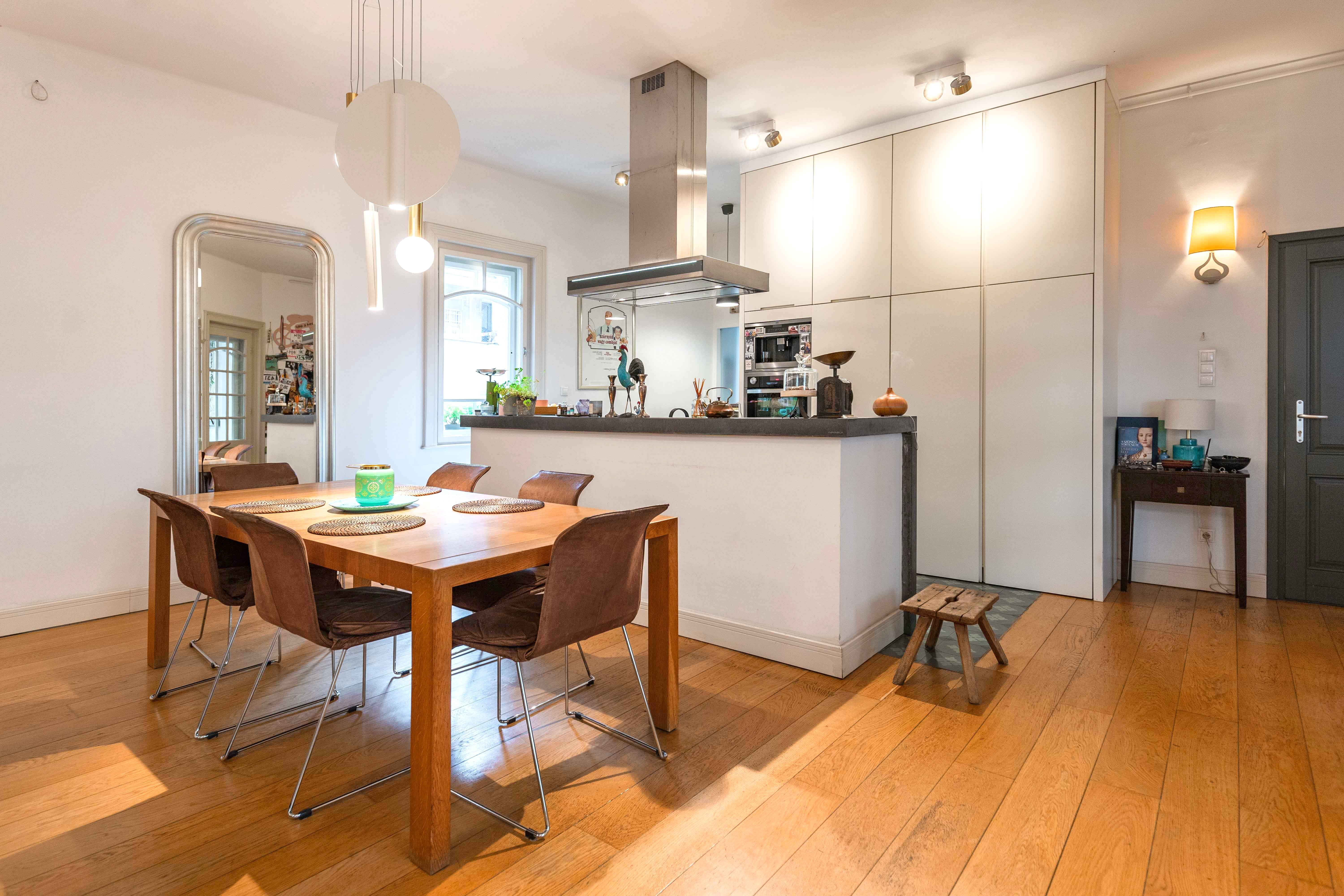 Az ingatlanba lépbe, az előszobából közvetlenül egy rendkívül tágas, 60 nm-es nyitott térbe érkezünk, az amerikai konyhás nappaliba. A helyiség polgári hangulatát megőrizték a földig érő, osztott, eredeti ablakokkal, a nagy belmagassággal és a klasszikus stílusú fa szegélylécekkel, kiegészítőkkel. Az egész ingatlanban valódi tölgyfa hajópadló került lefektetésre. A konyha az egyik legmodernebb, kortárs megoldással, IVANKA látszóbeton szigettel került kialakításra.