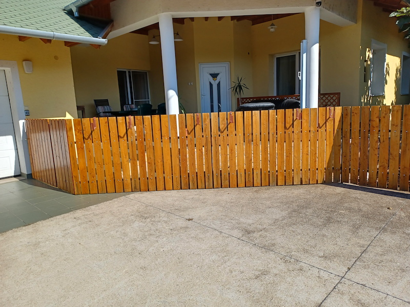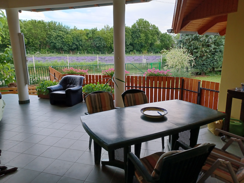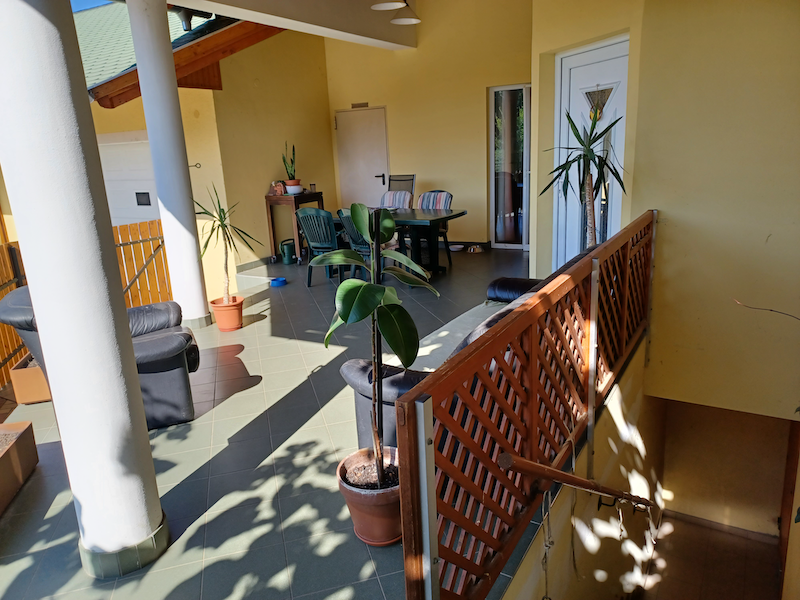 A telken egy hangulatos, fából készült fedett kiülő, mellé épített tároló, valamint egy új építésű biciklitároló található.