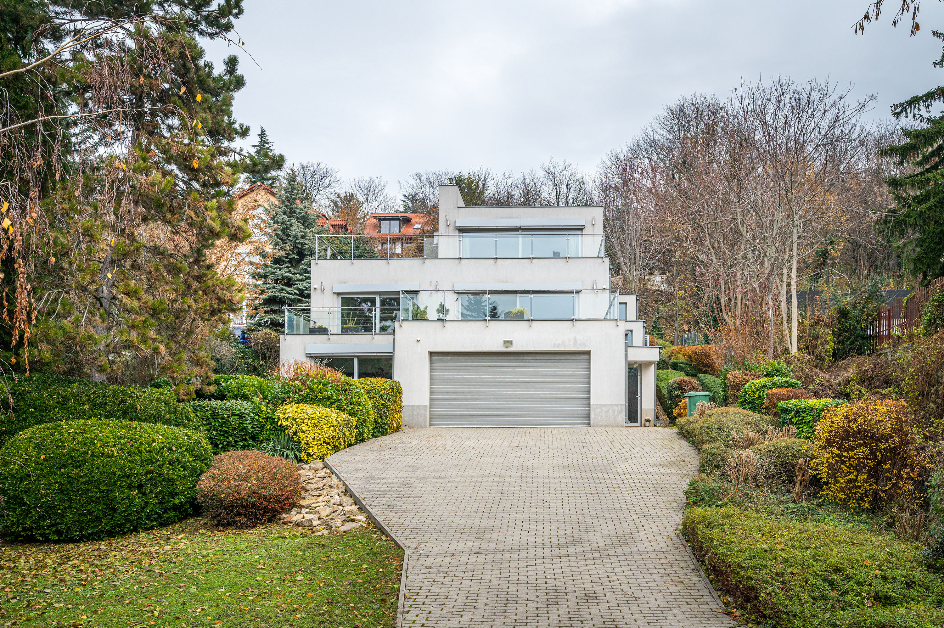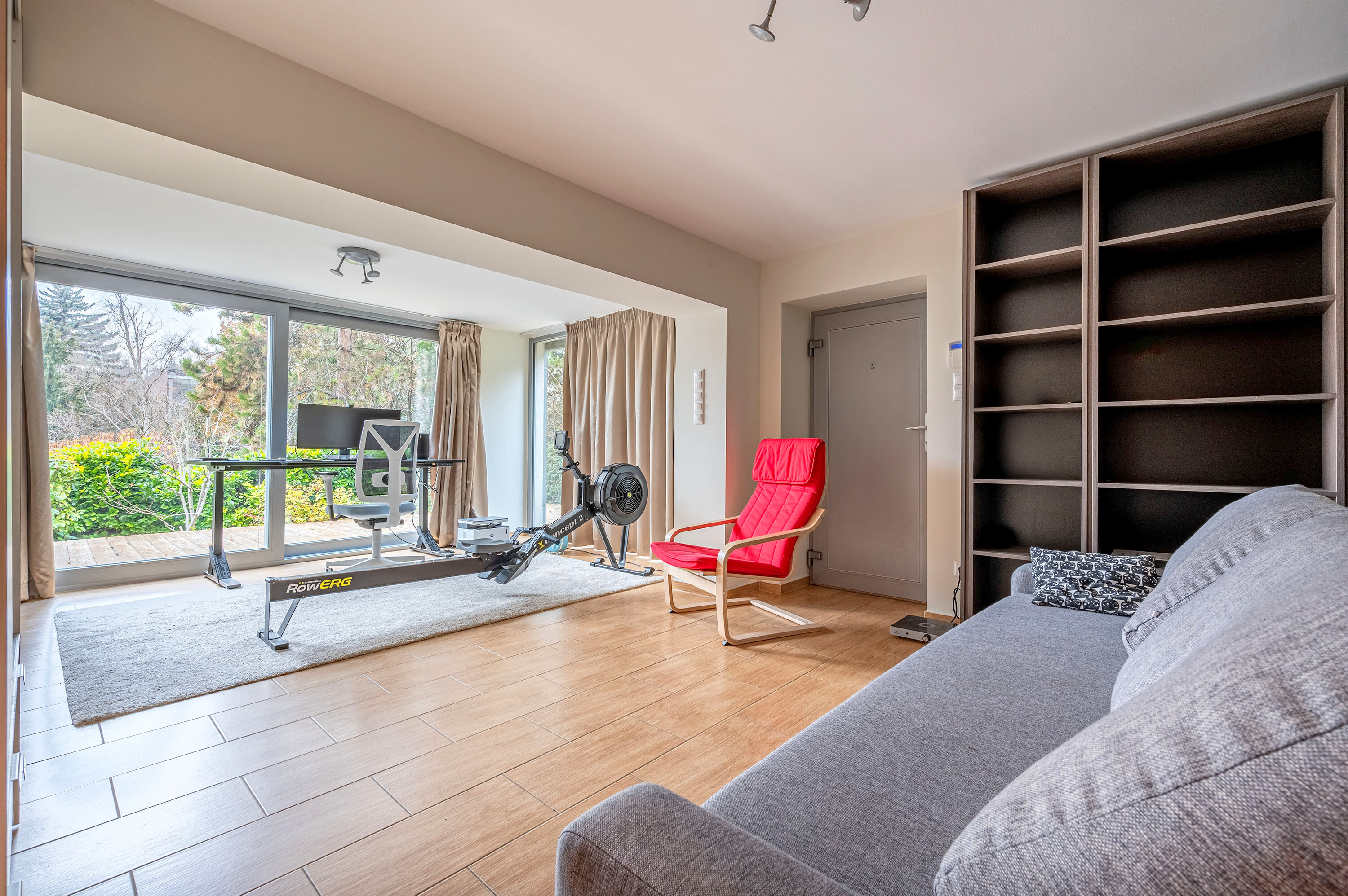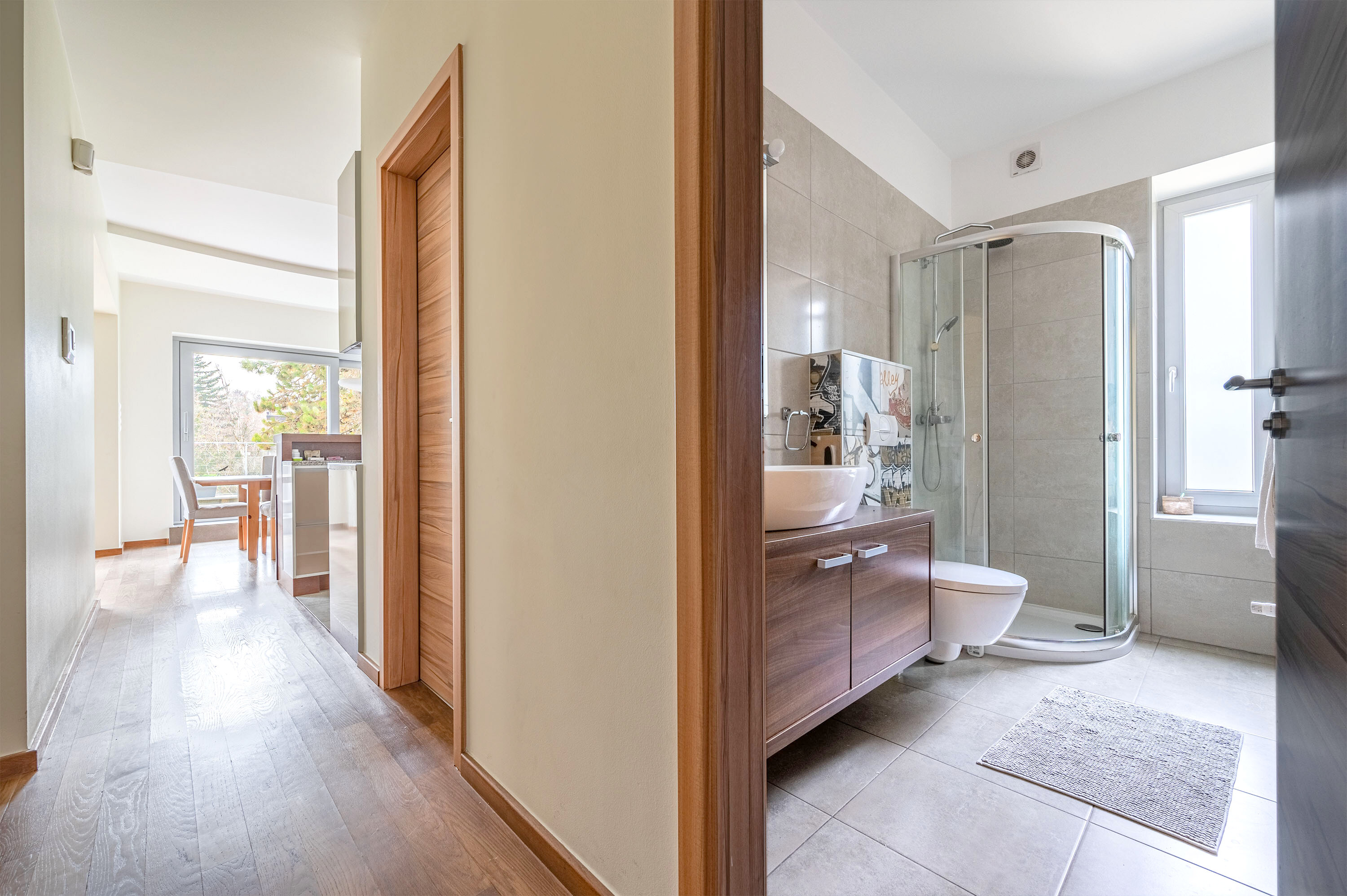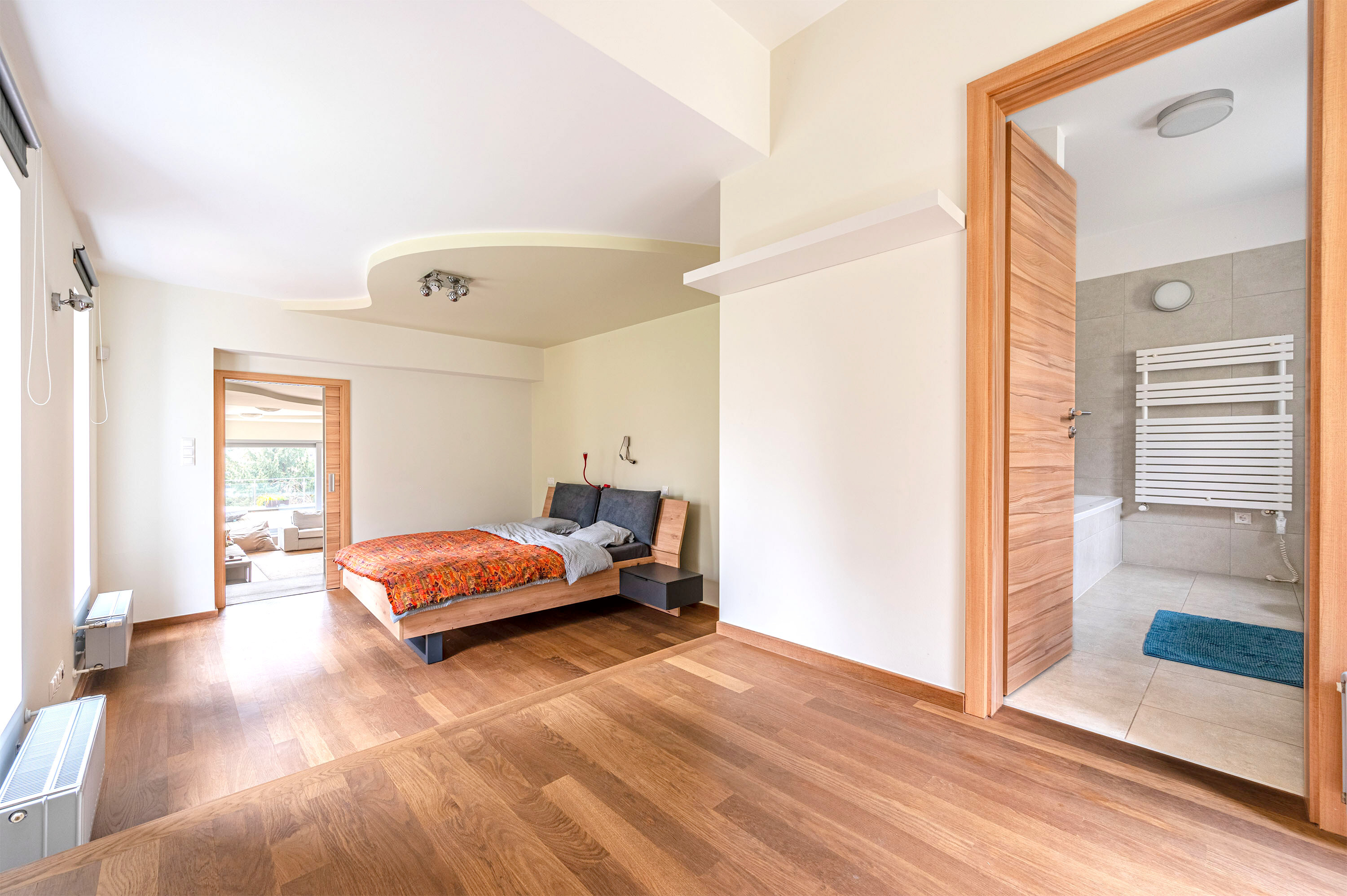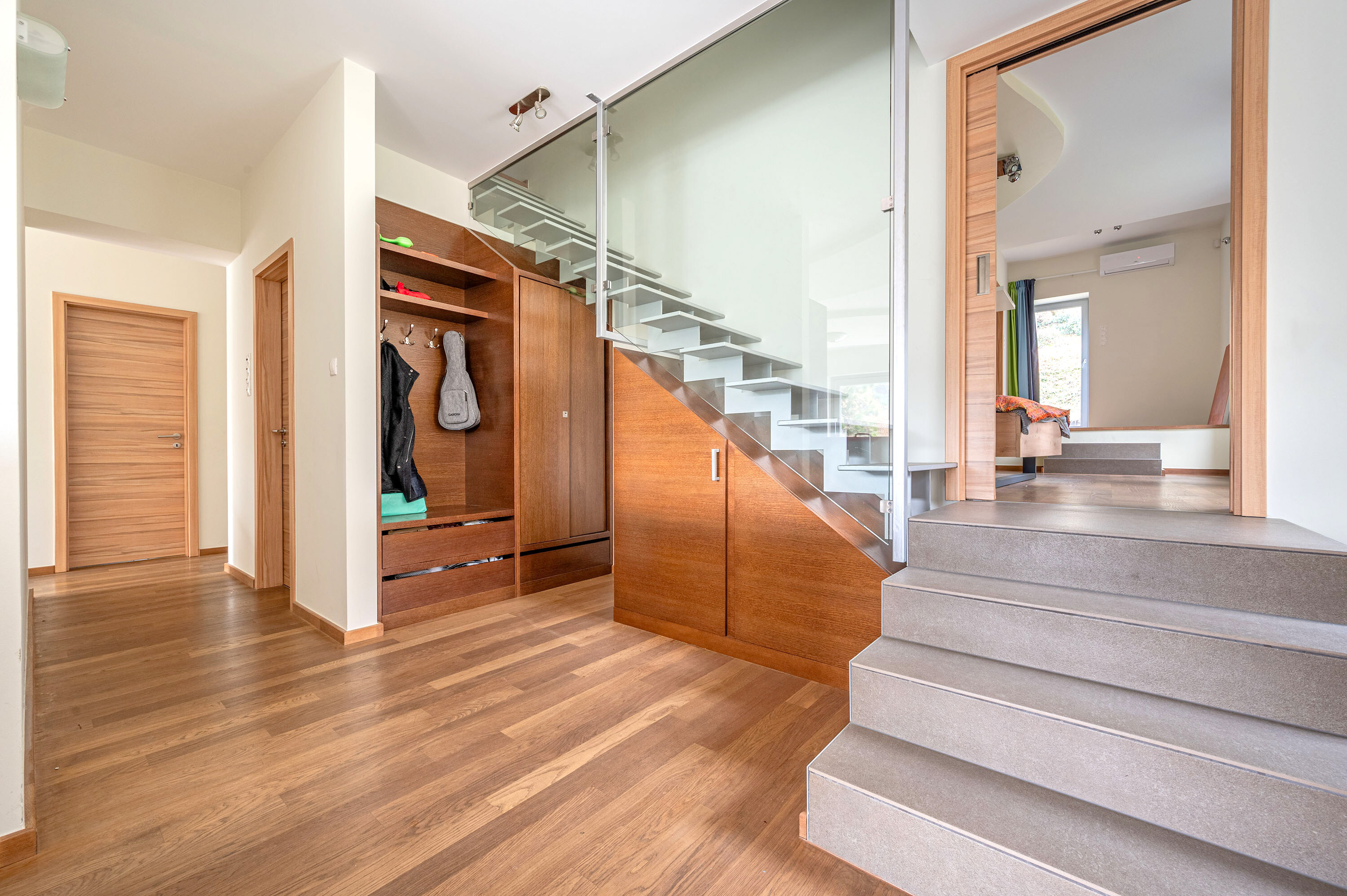 A driveway leads from the remote controlled gate up to the house, which leads to the two-car garage, from where you can enter the house. On the garage level there is a large room with huge glass windows and an ensuite bathroom. This lower level can be used as a separate guest apartment or office, with its own entrance. Also on this level is the boiler room, laundry room and an extremely large 20 sqm storage room.