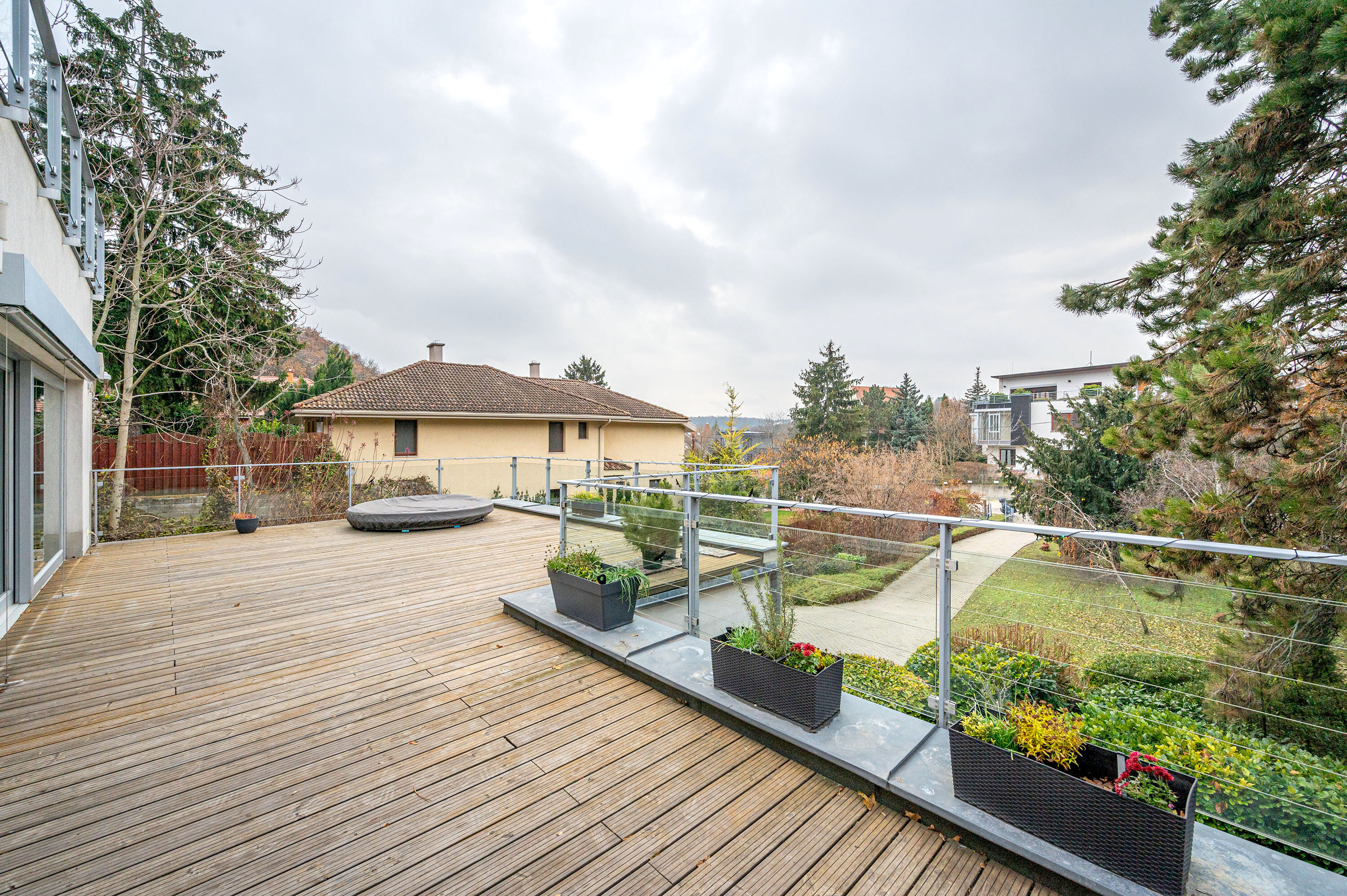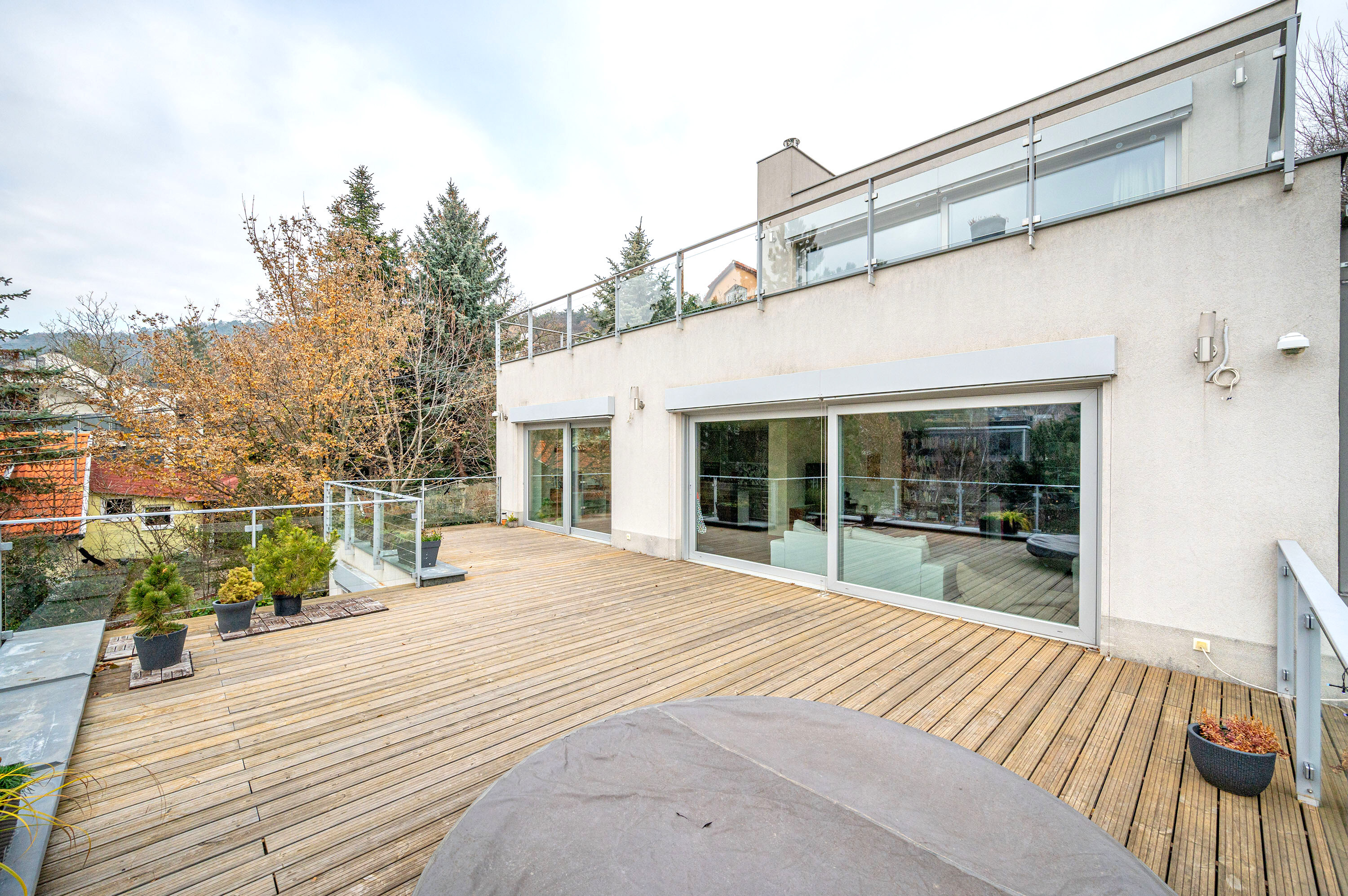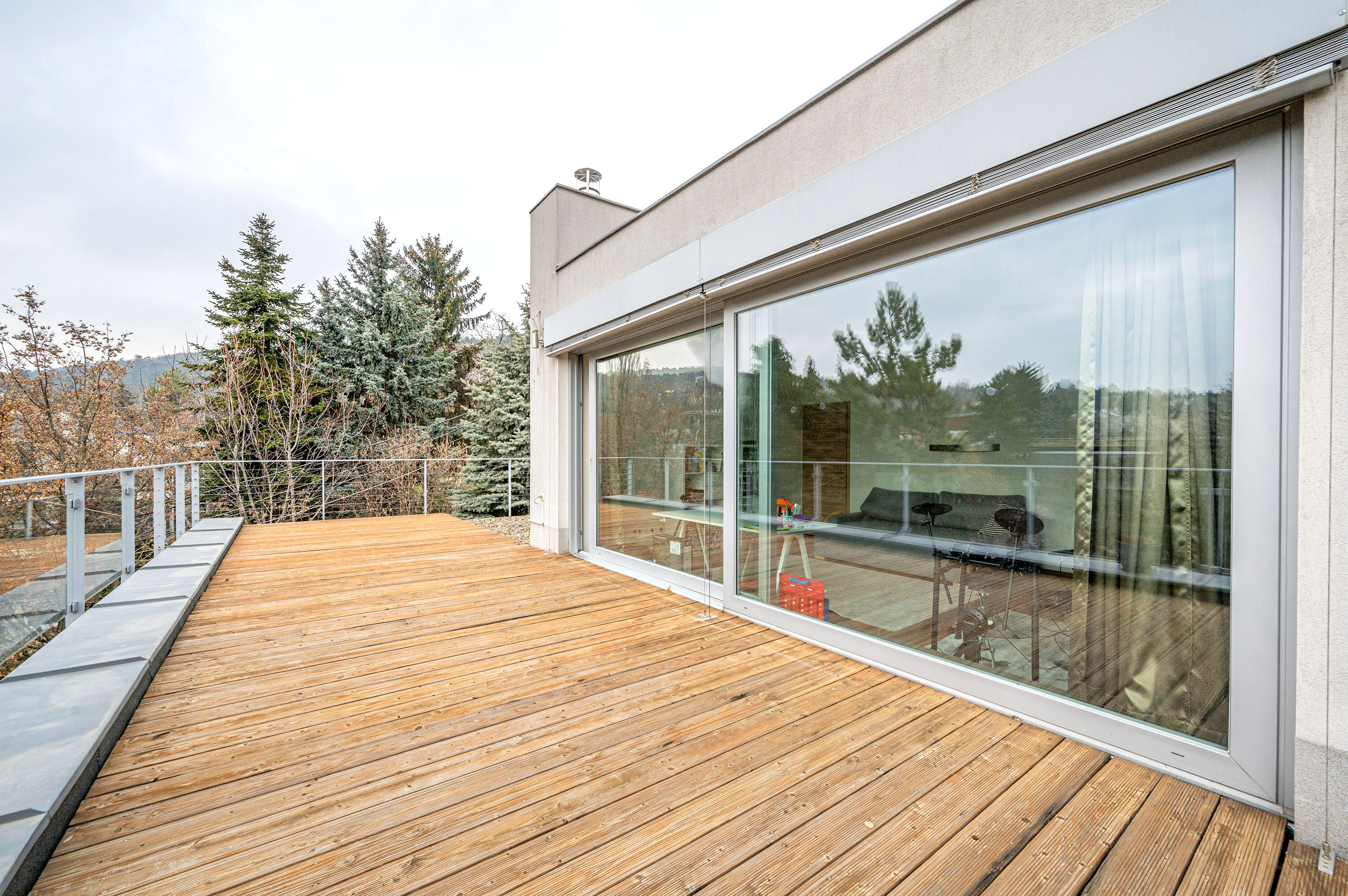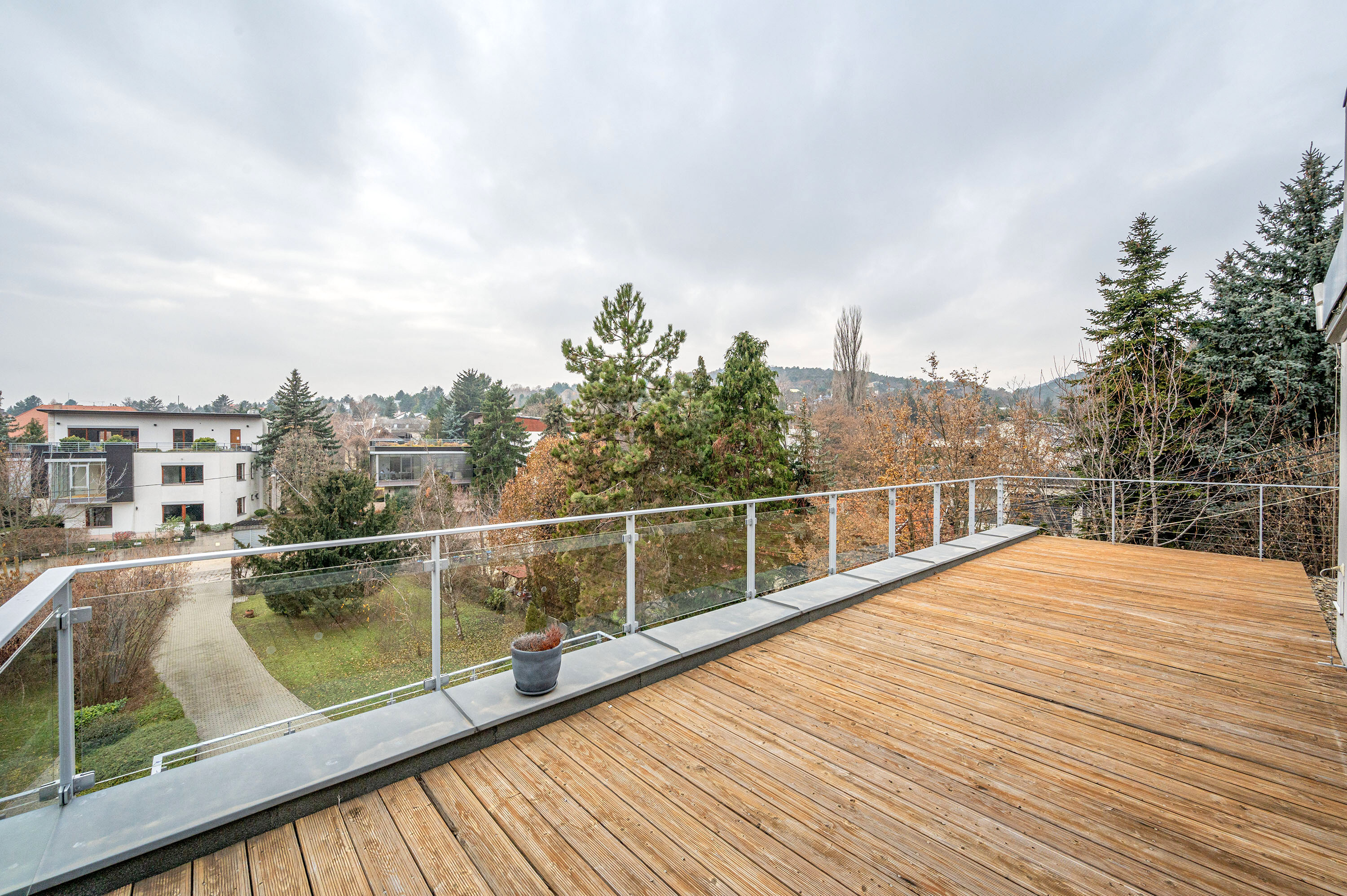 A convenient staircase leads up to the middle level from the garage or through the front door. Here we find the large living room of more than 50 sqm, American kitchen and dining room. From both rooms you can access the large terrace with wood panelling and panoramic views. All rooms of the house have large wall-to-wall glass surfaces. The property opposite the house is an office building, empty in the afternoon and evening hours, so the house retains its intimacy.
