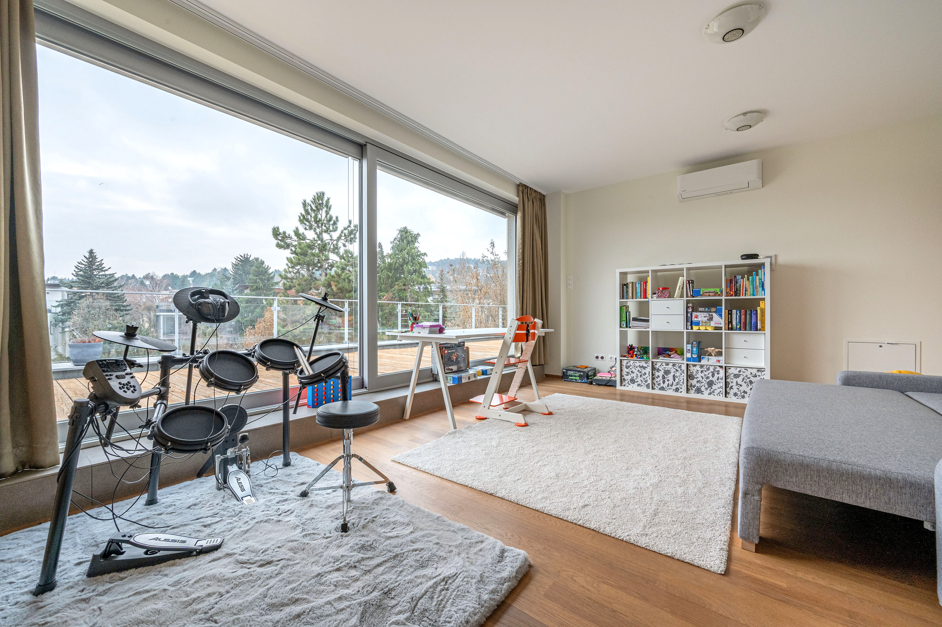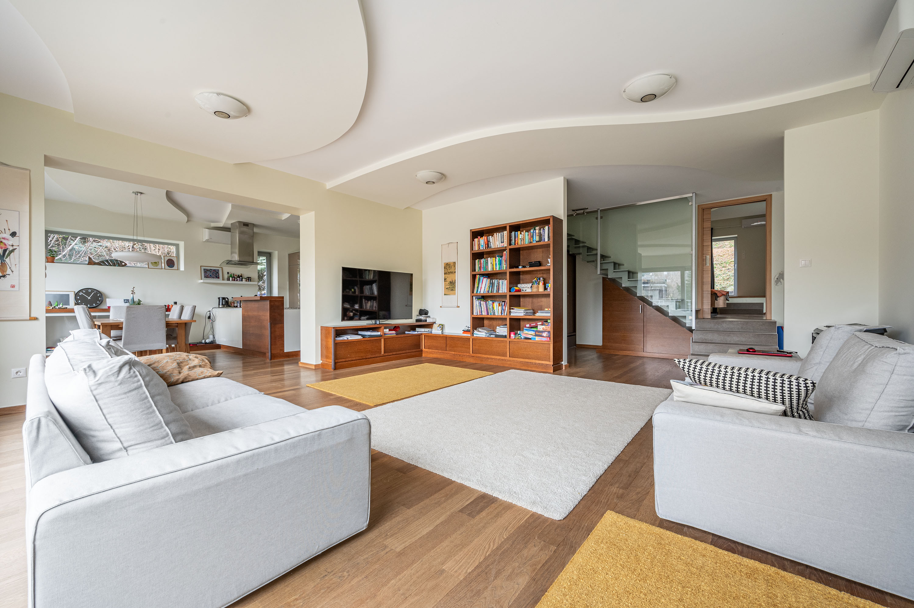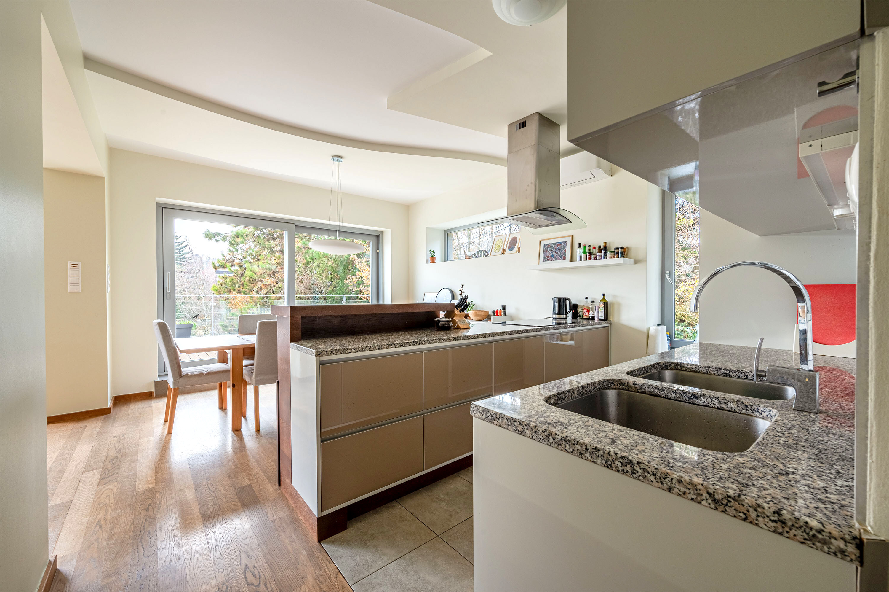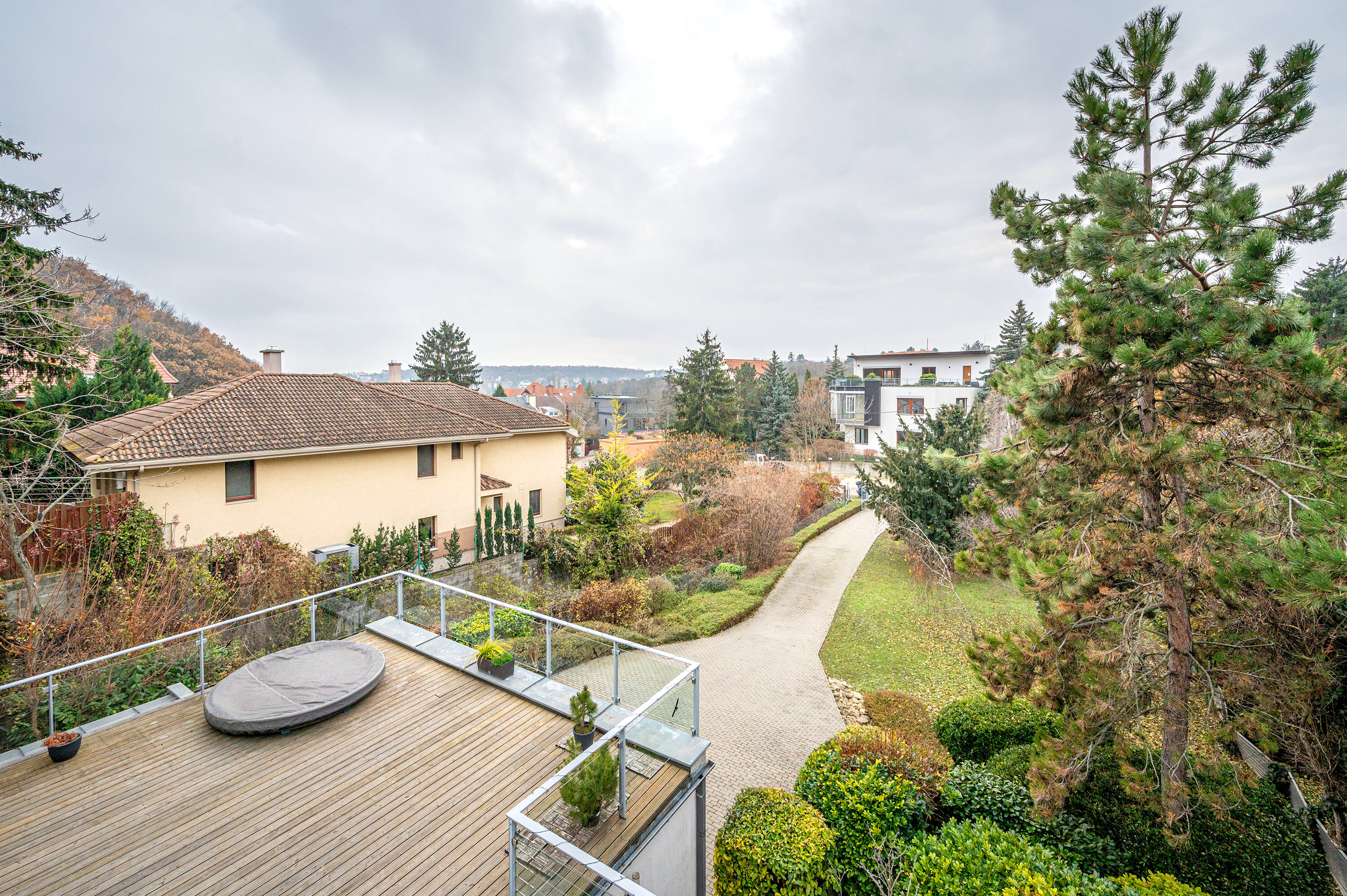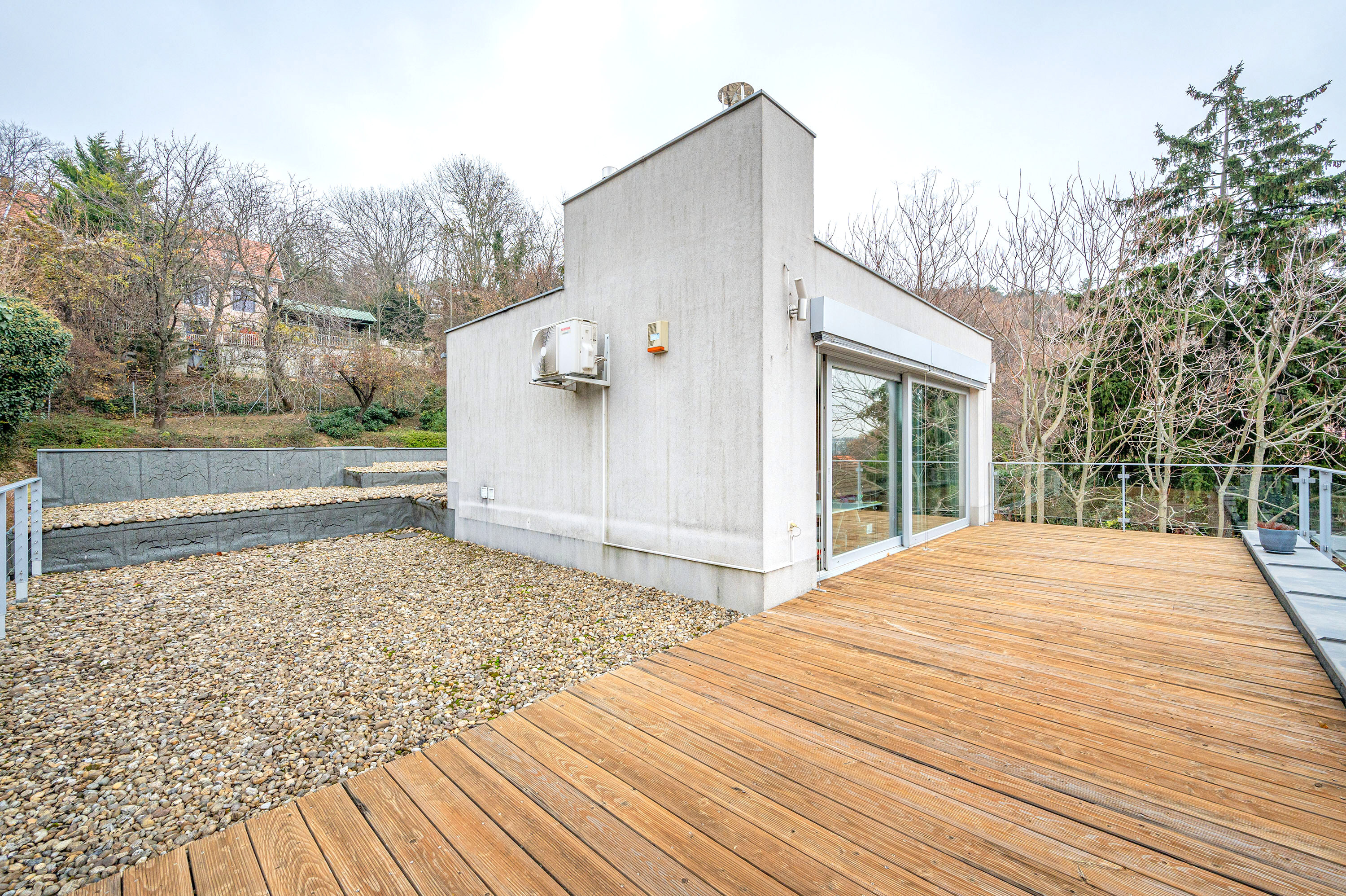 A convenient staircase leads up to the middle level from the garage or through the front door. Here we find the large living room of more than 50 sqm, American kitchen and dining room. From both rooms you can access the large terrace with wood panelling and panoramic views. All rooms of the house have large wall-to-wall glass surfaces. The property opposite the house is an office building, empty in the afternoon and evening hours, so the house retains its intimacy.