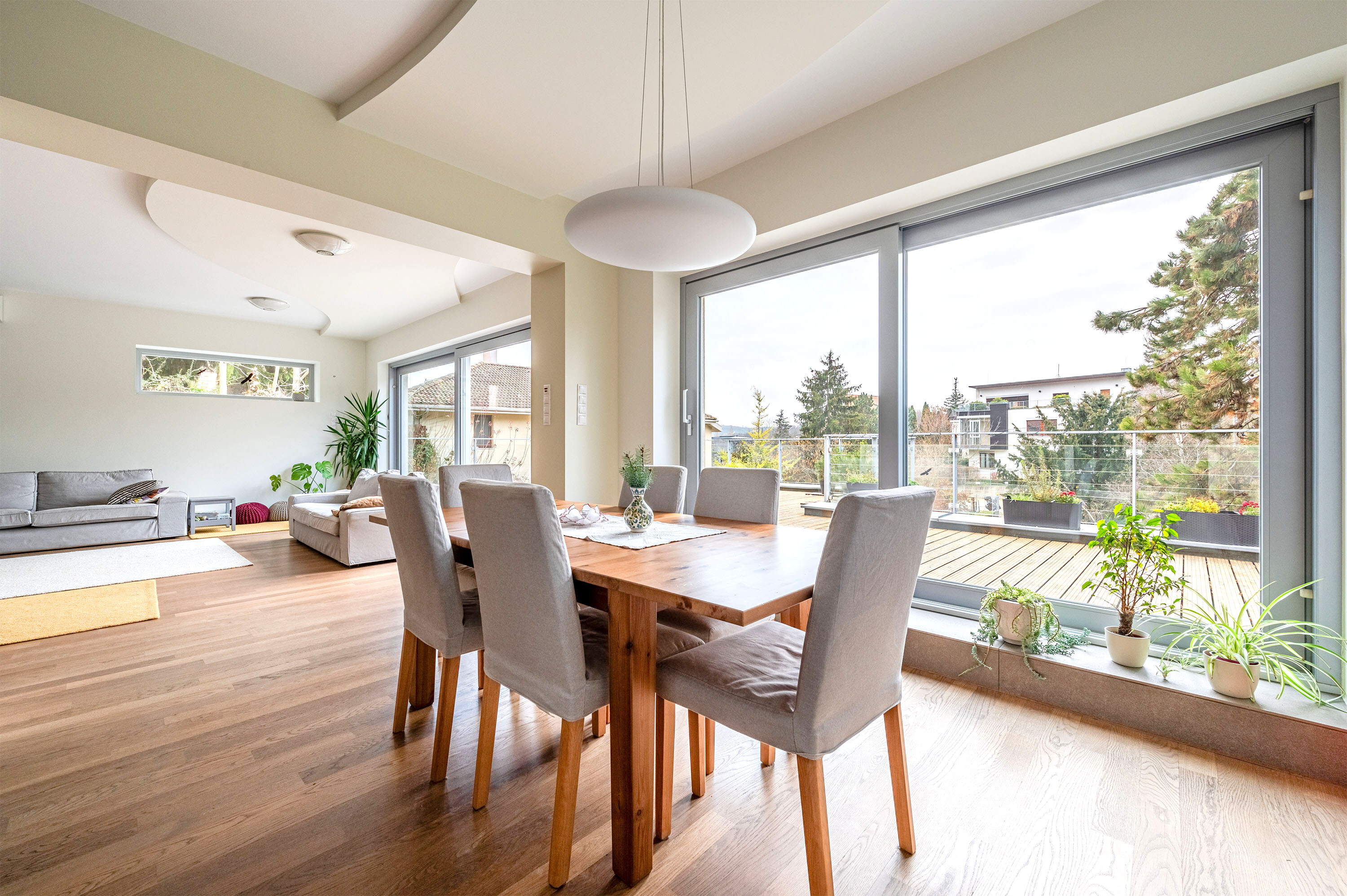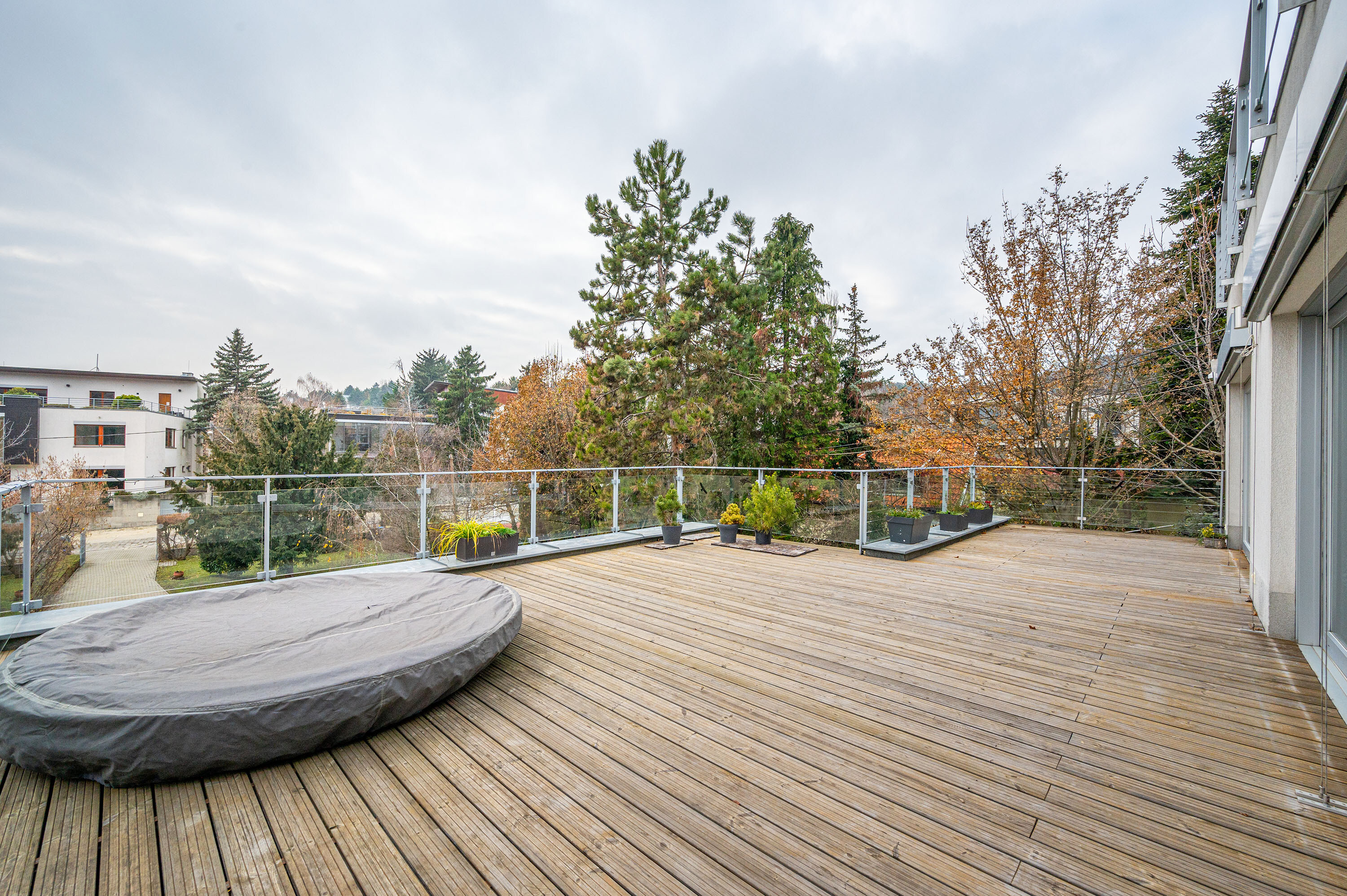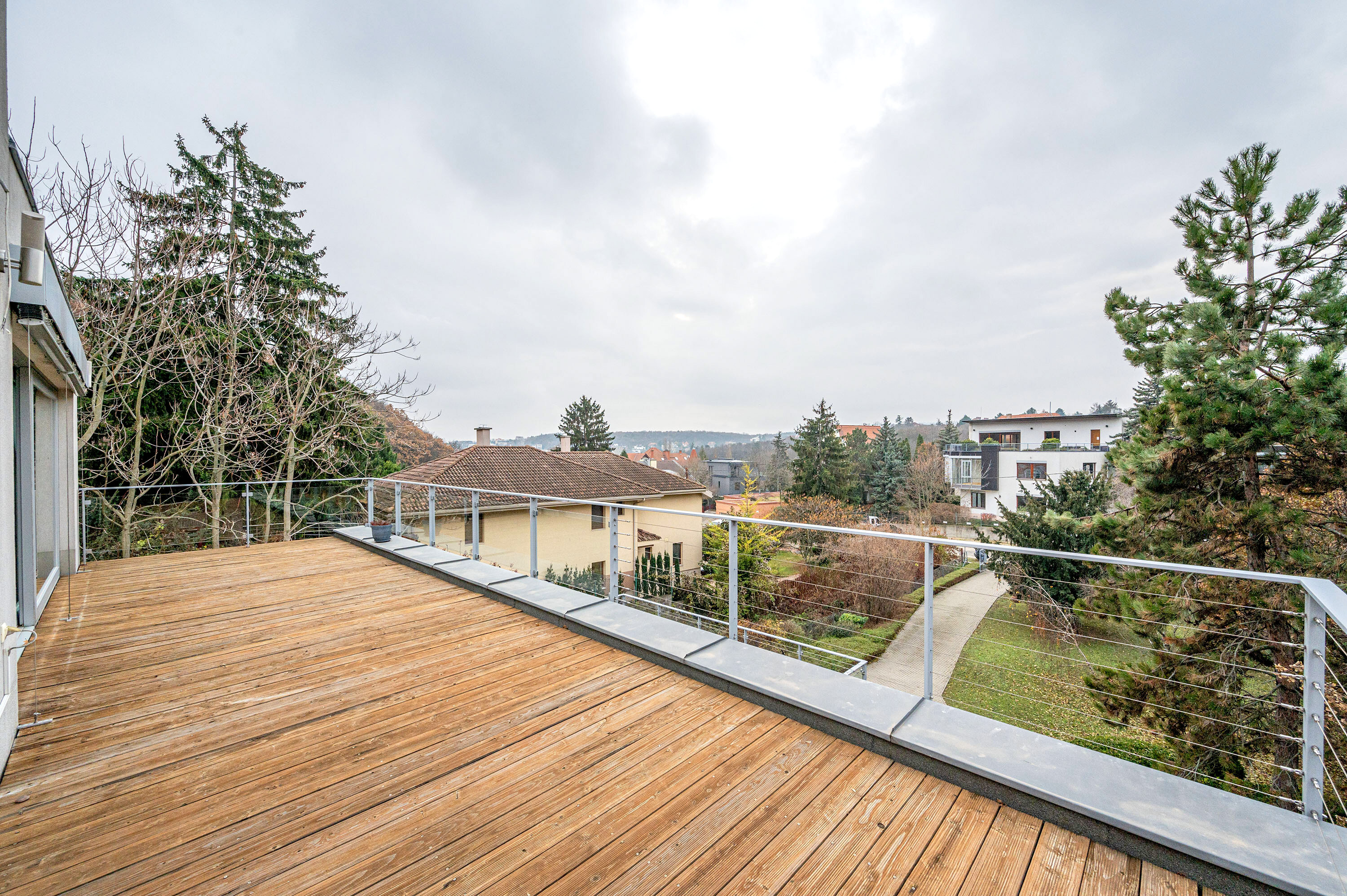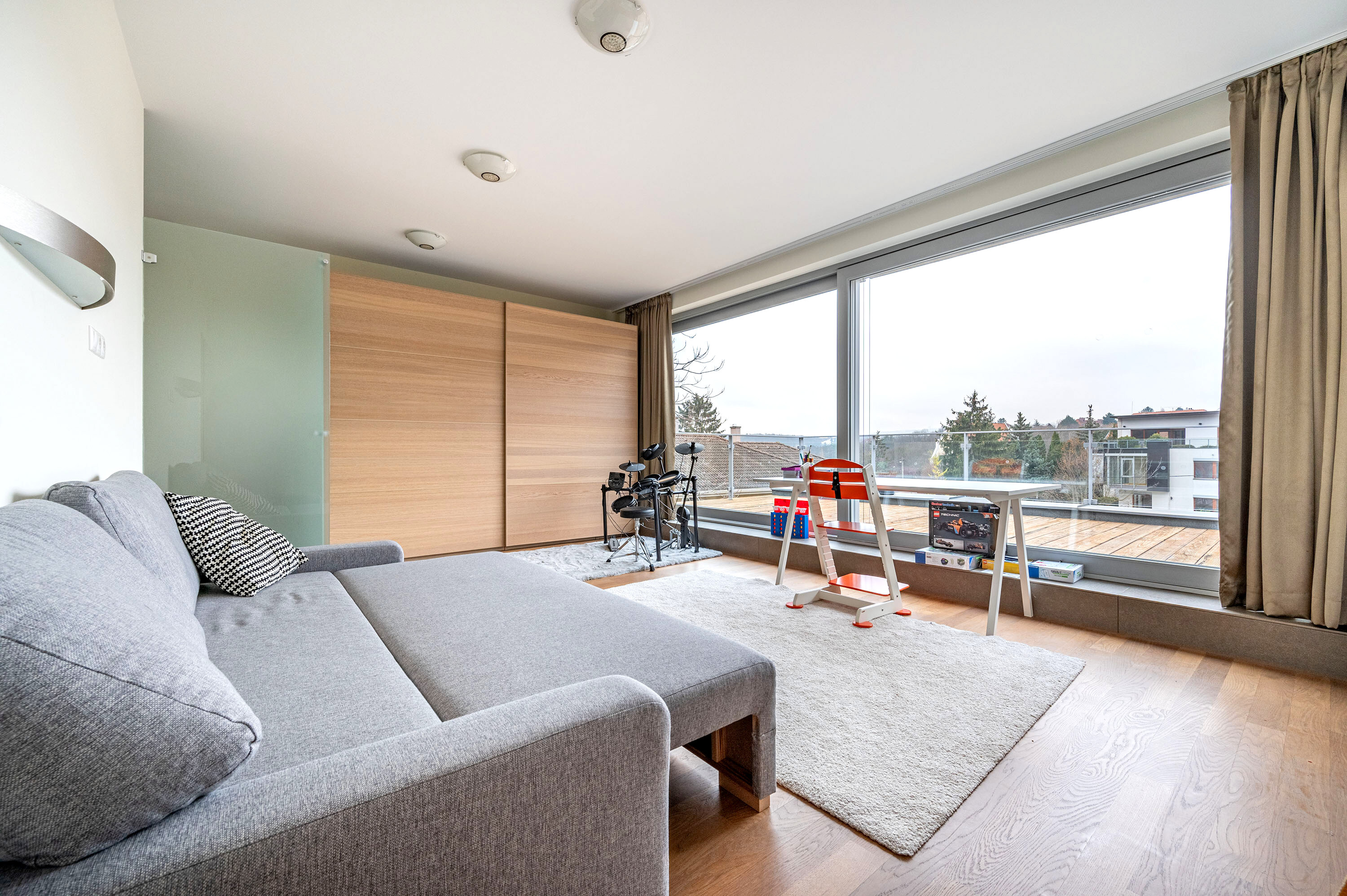 A convenient staircase leads up to the middle level from the garage or through the front door. Here we find the large living room of more than 50 sqm, American kitchen and dining room. From both rooms you can access the large terrace with wood panelling and panoramic views. All rooms of the house have large wall-to-wall glass surfaces. The property opposite the house is an office building, empty in the afternoon and evening hours, so the house retains its intimacy.