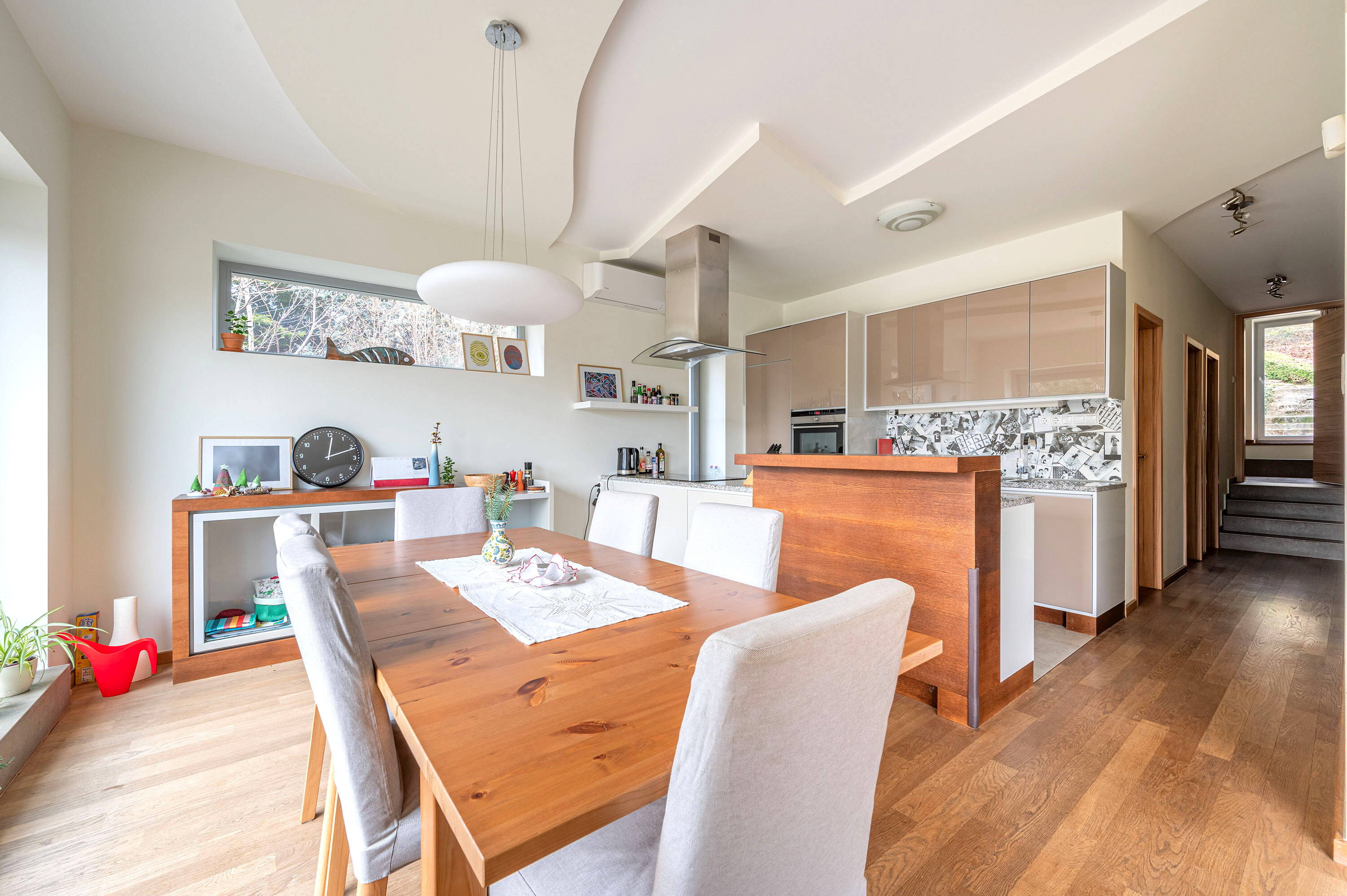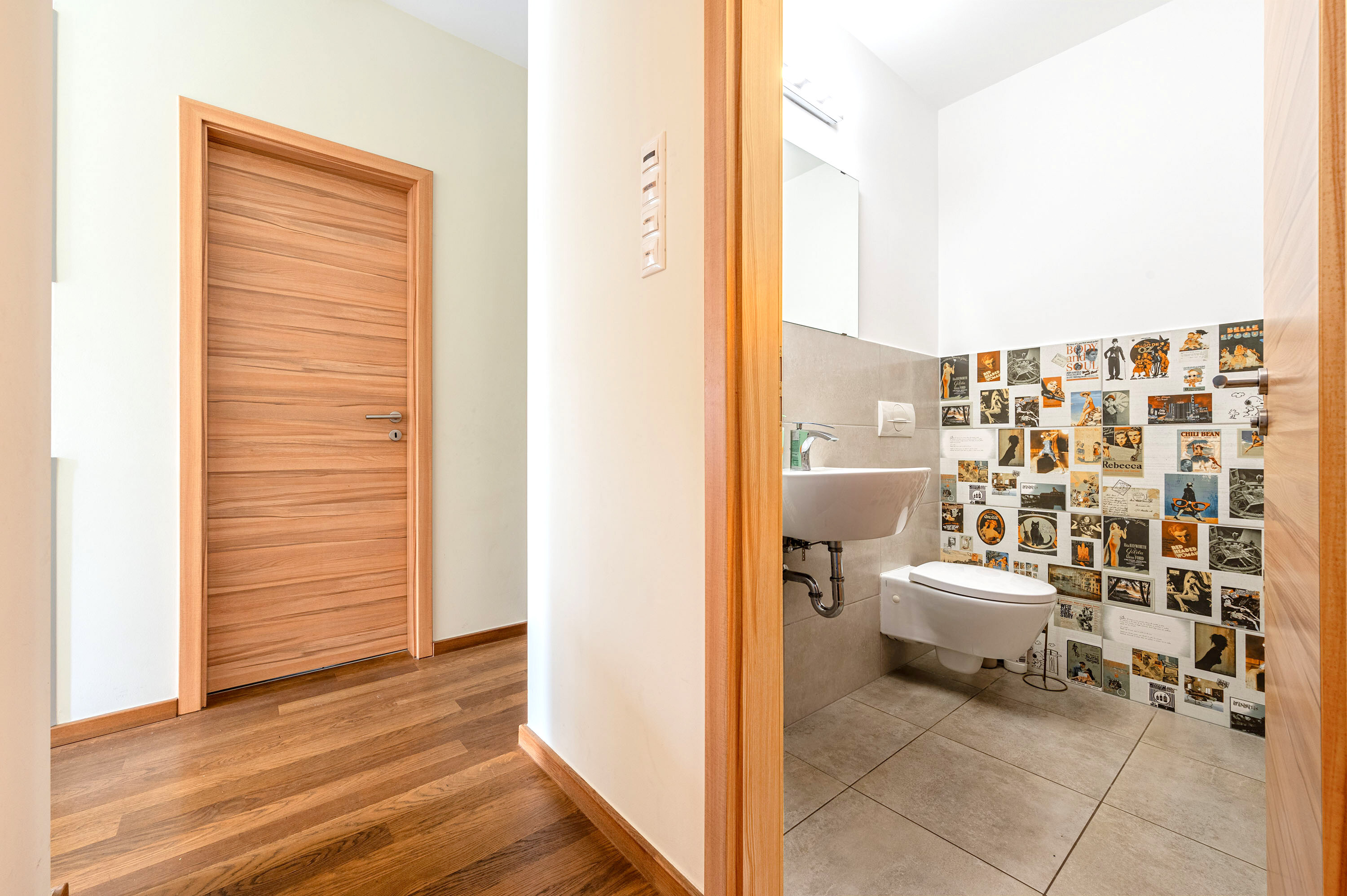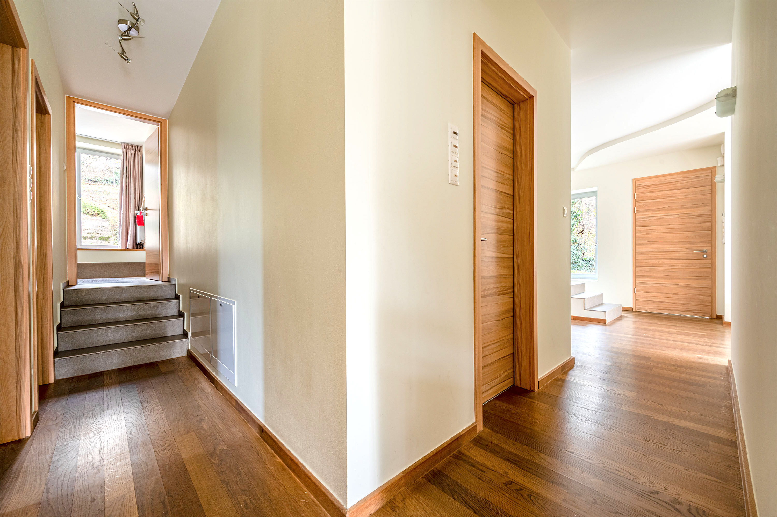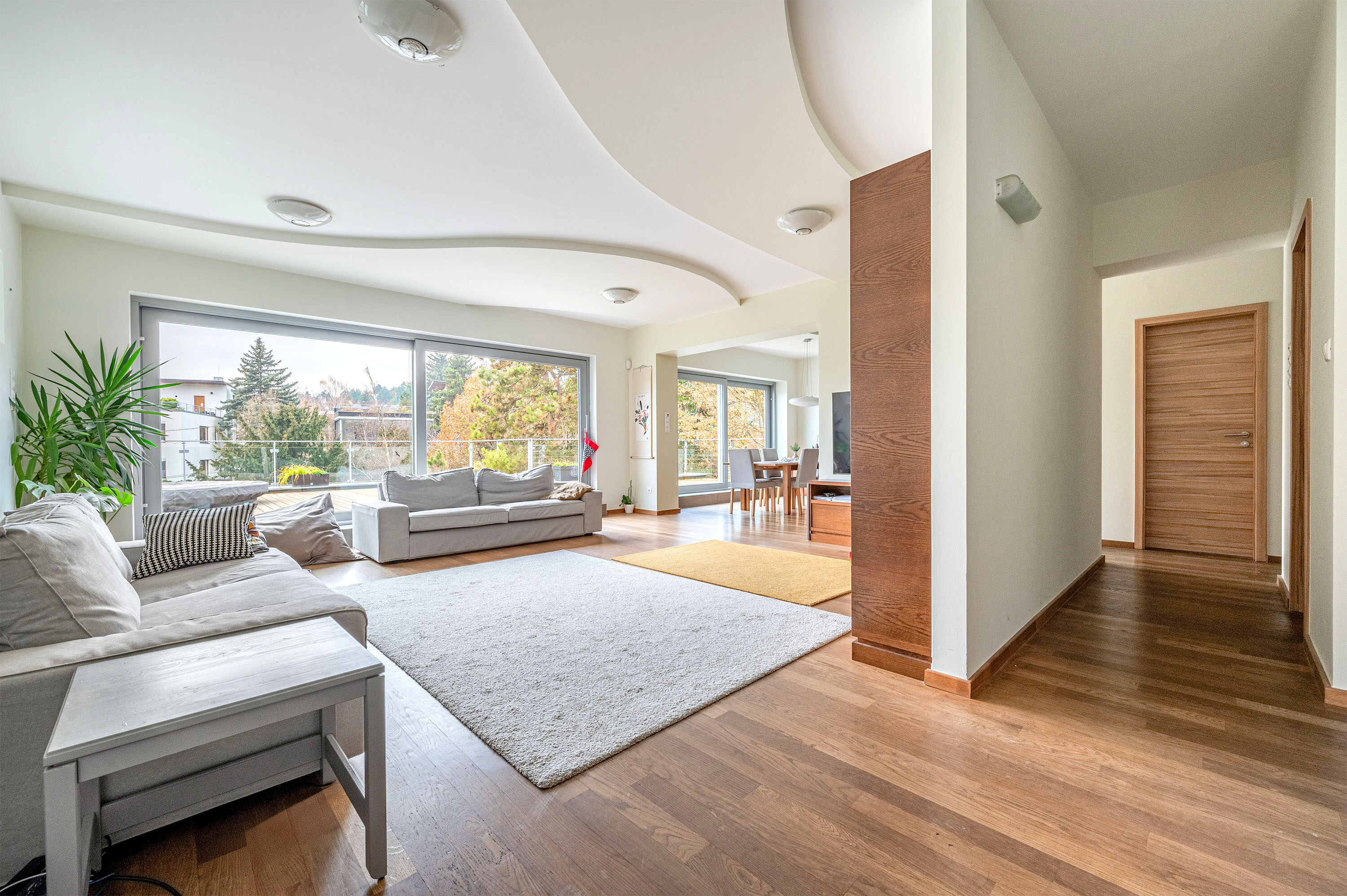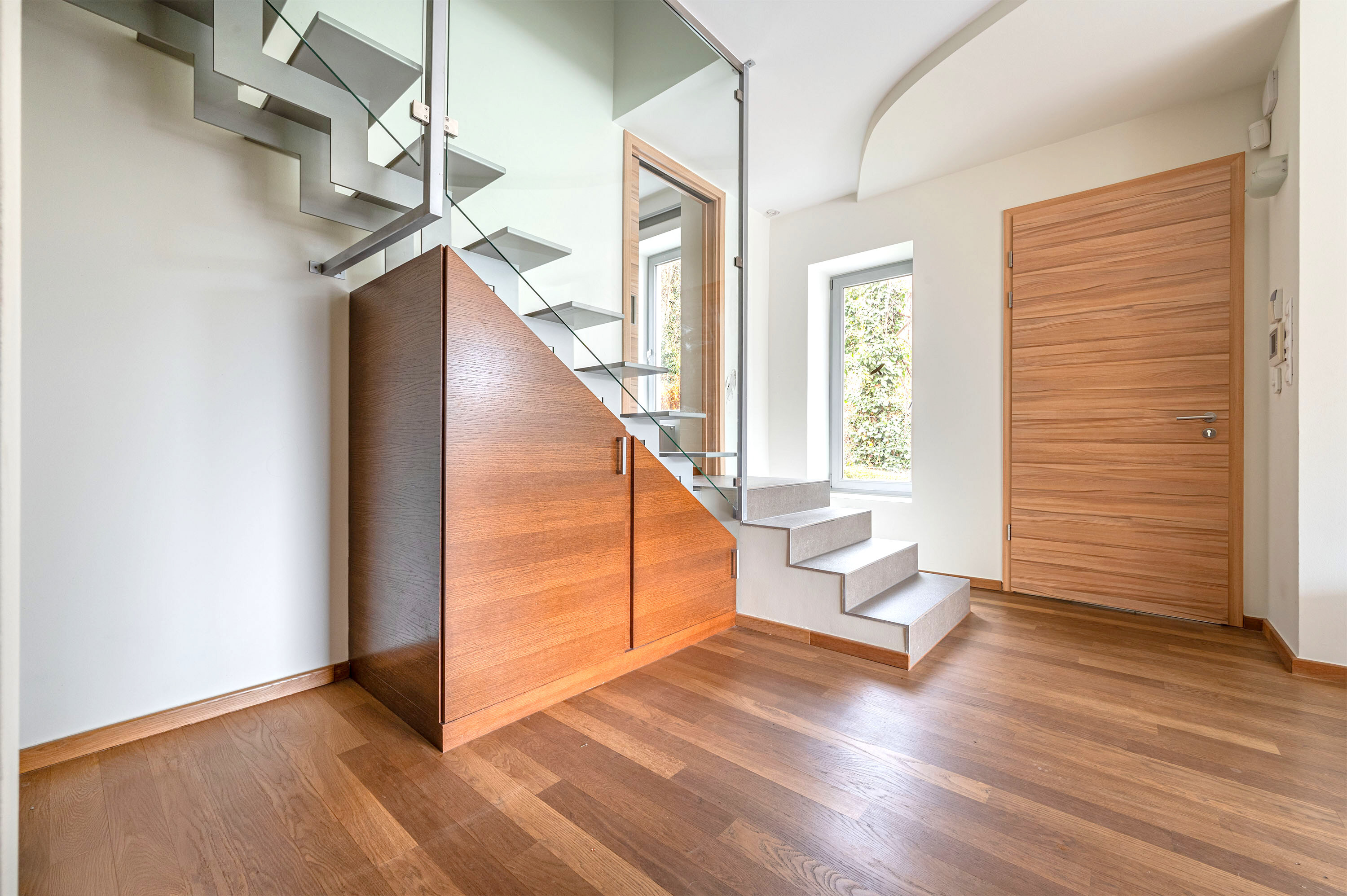 A convenient staircase leads up to the middle level from the garage or through the front door. Here we find the large living room of more than 50 sqm, American kitchen and dining room. From both rooms you can access the large terrace with wood panelling and panoramic views. All rooms of the house have large wall-to-wall glass surfaces. The property opposite the house is an office building, empty in the afternoon and evening hours, so the house retains its intimacy.