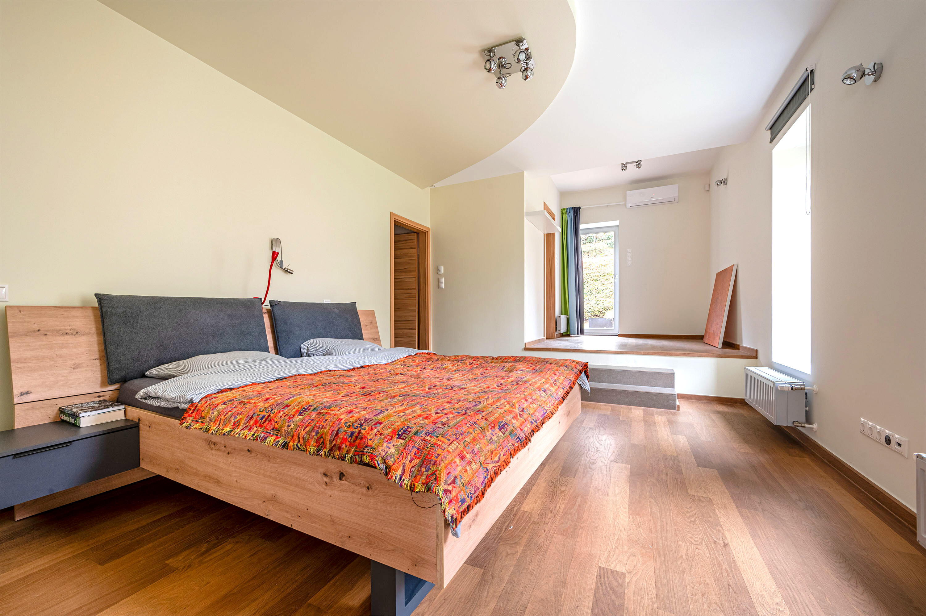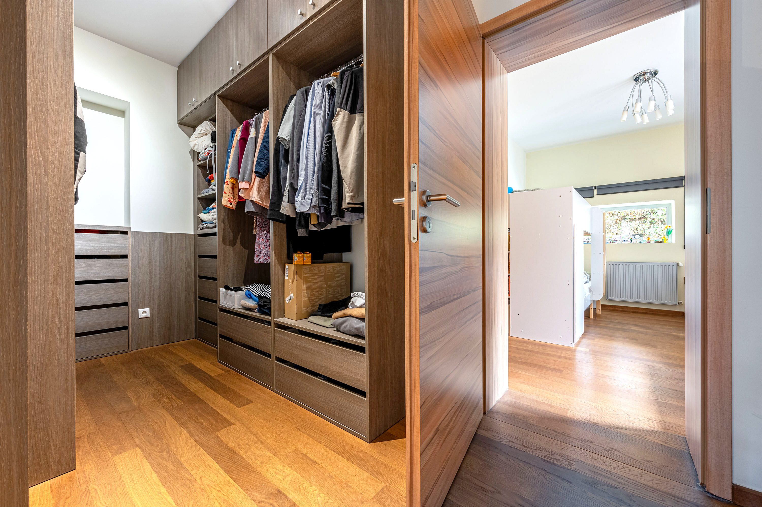 Ezen a szinten található még egy kamra, háztartási helyiség és kis szint eltolással egy hálószoba és a szülői háló is fürdőszobával és gardróbszobával.