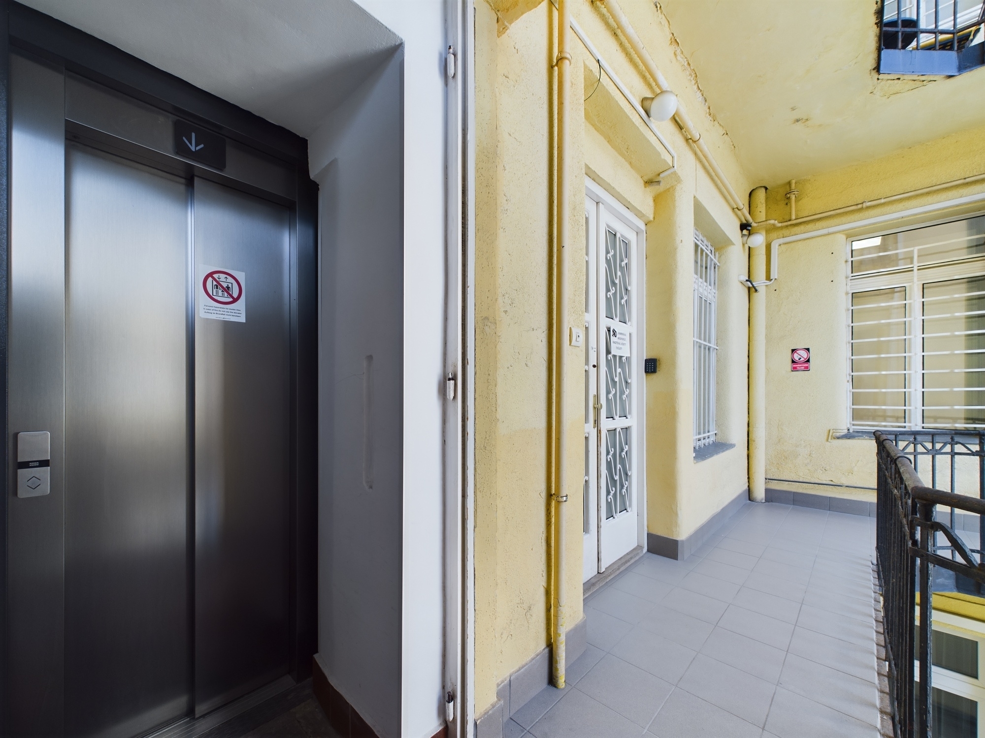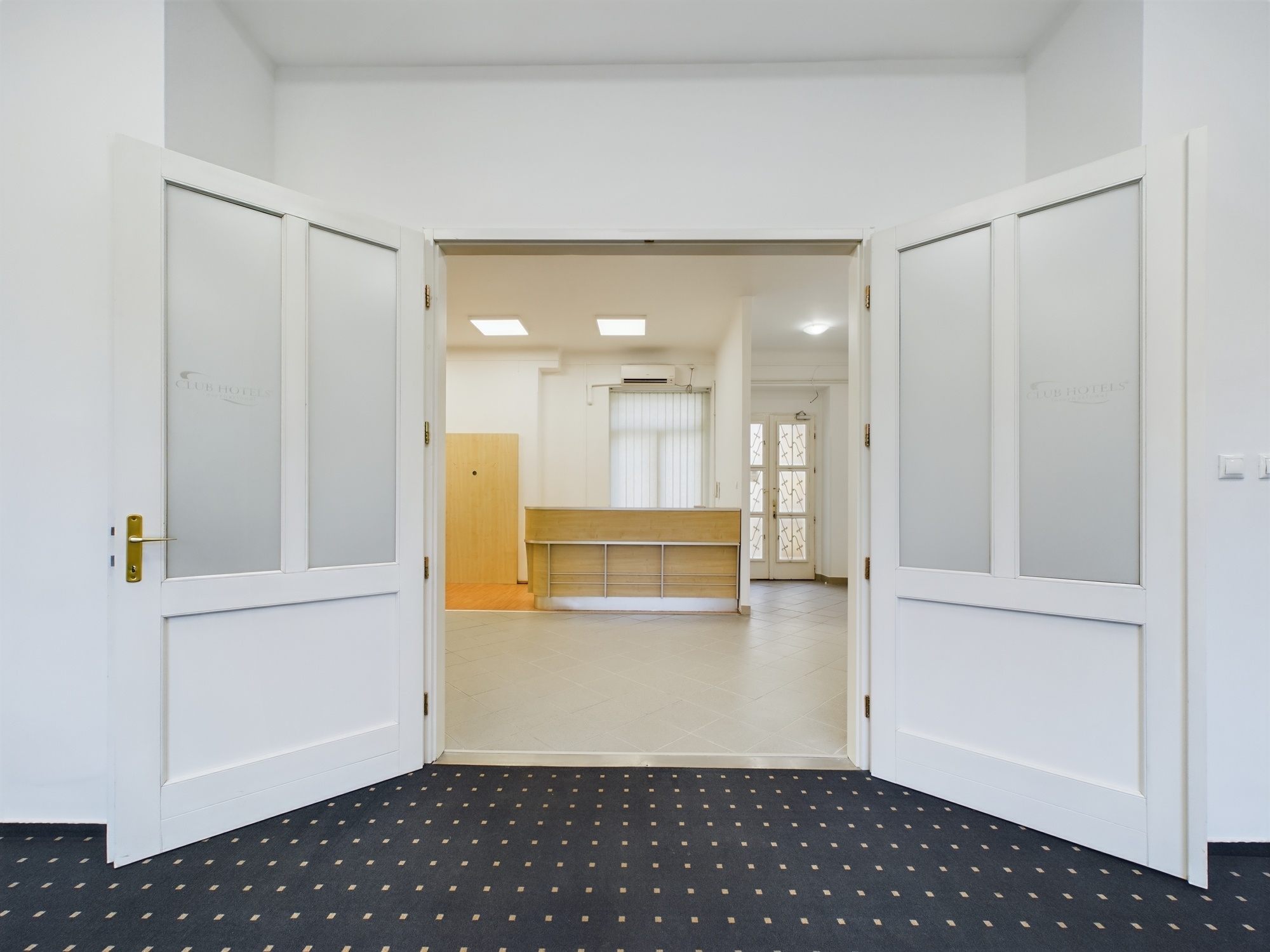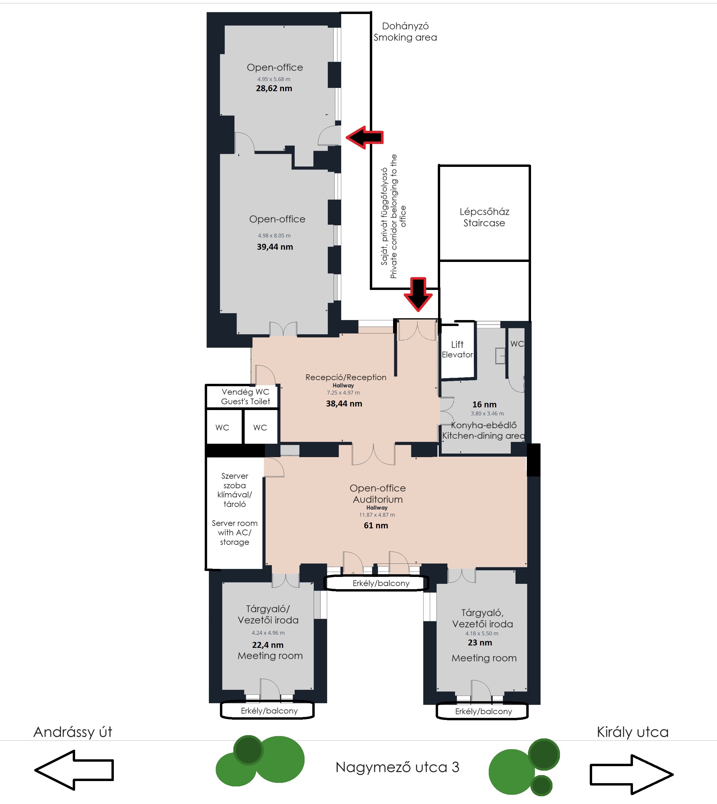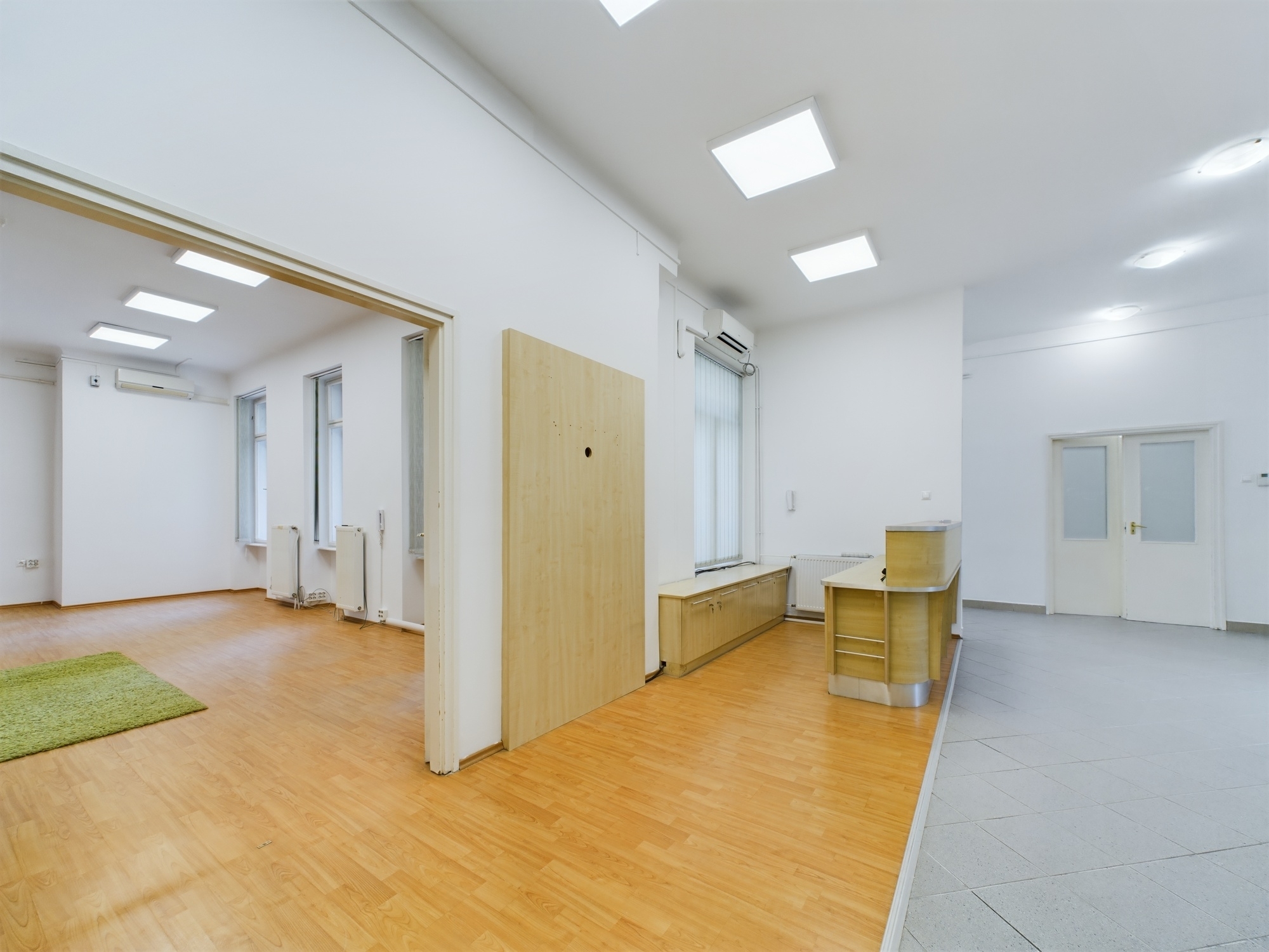 Az ingatlannak két bejárata is van, így akár külön is szeparálható, több funkciót is elbír. A főbejárat közvetlenül a lift mellett található. Itt tágas recepcióra érkezünk. Innen nyílik az összes helyiség.