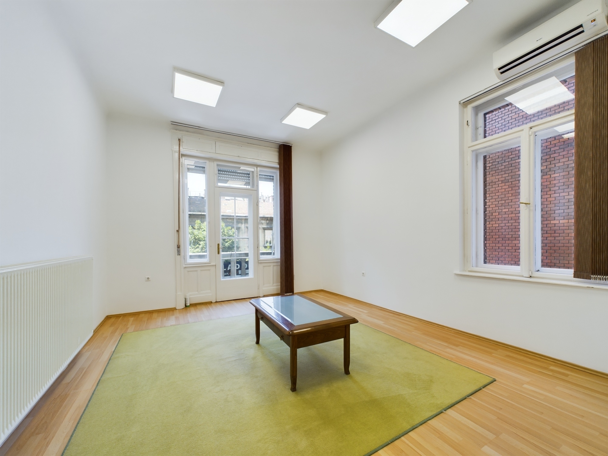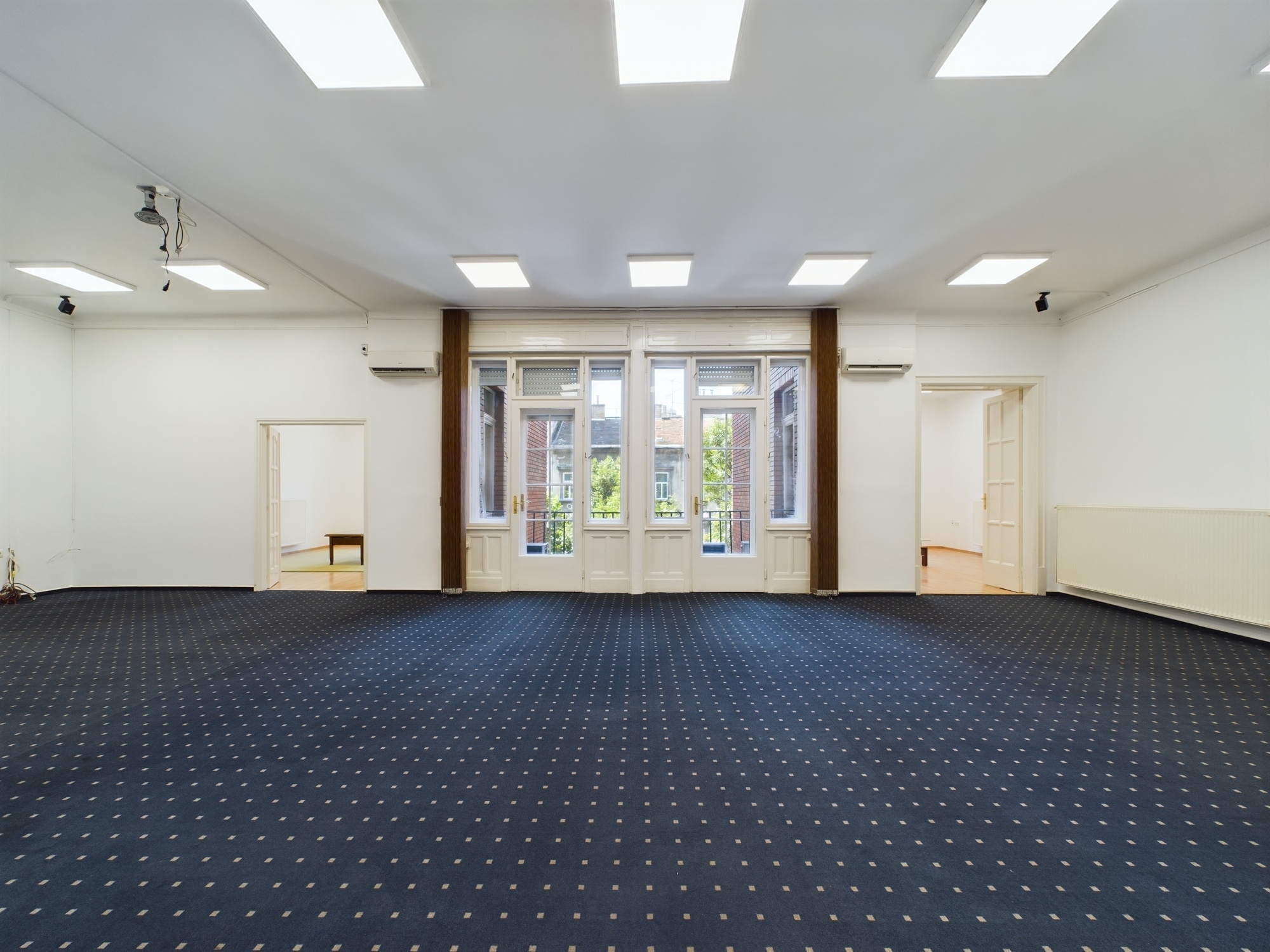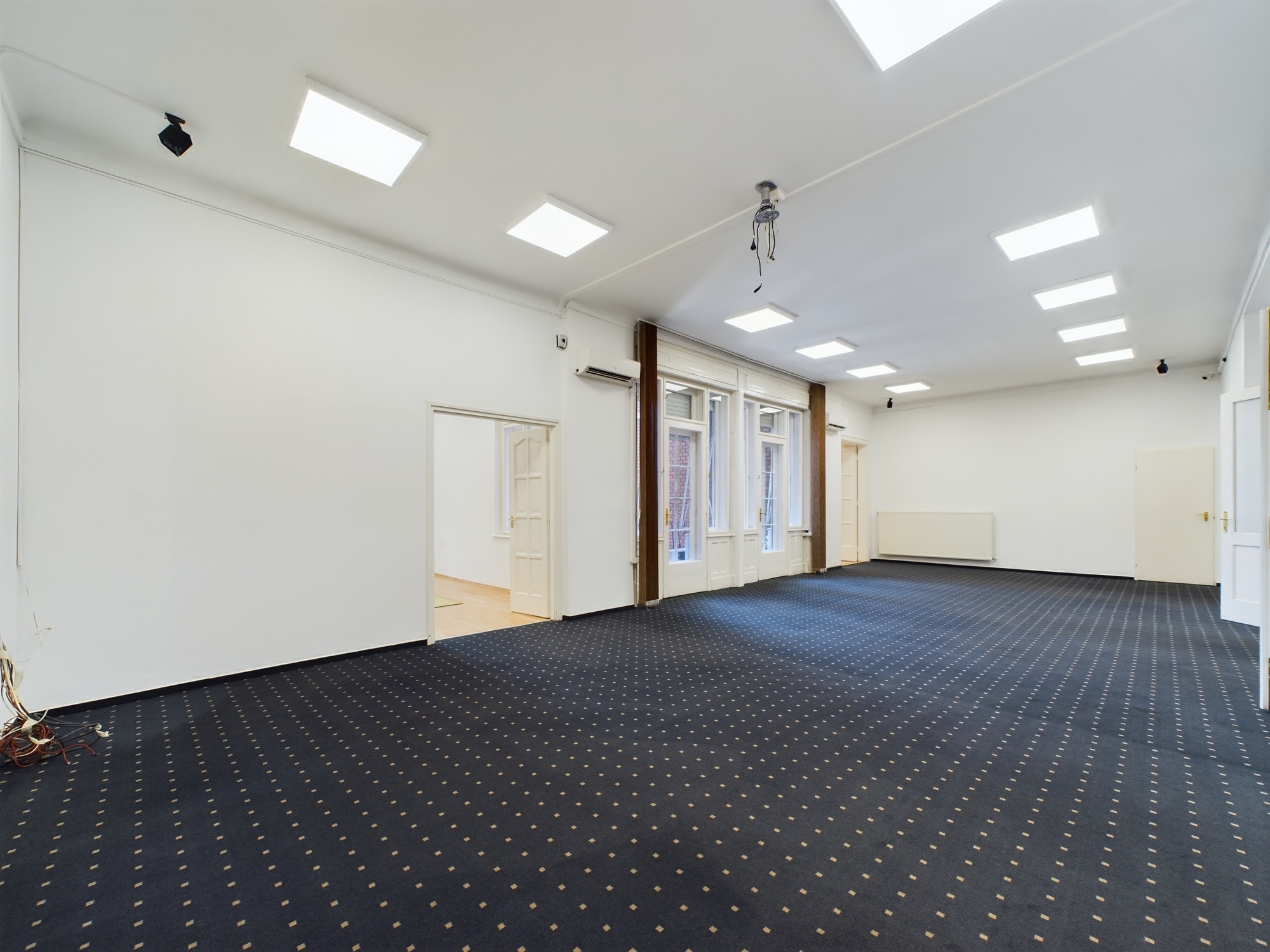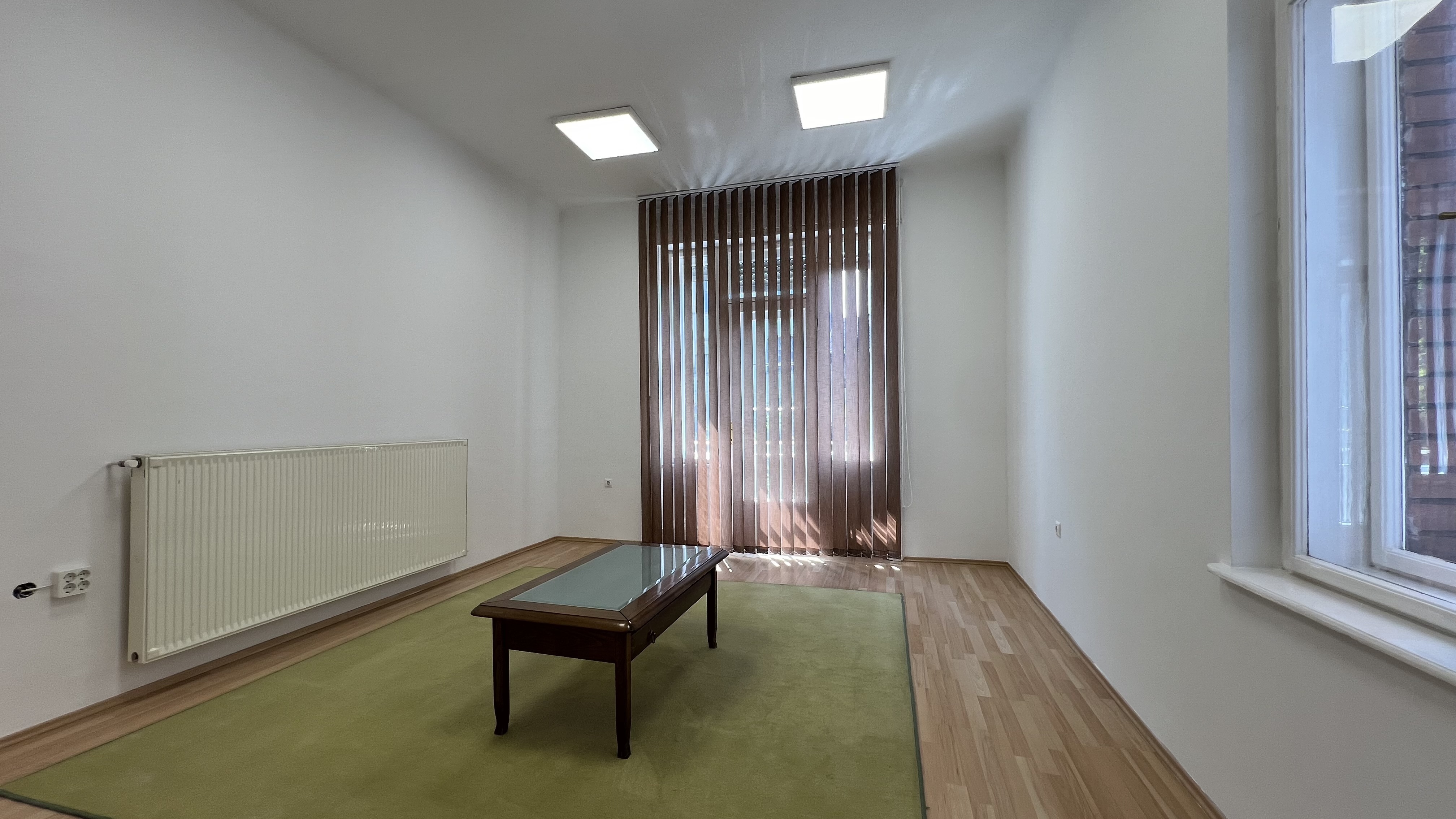 Az ingatlan központi részét található open-office vagy előadóterem 12X5 méteres, nagyon tágas, oktatási célokra is alkalmas lehet. Az innen nyíló erkélyes külön helyiségek reprezentatív jelleggel bírnak, a zöld, fákkal teli utcára néznek, napfényesek és tágasak. Alkalmasak lehetnek tárgyalóknak vagy 2-3 munkaállomásos irodáknak is.