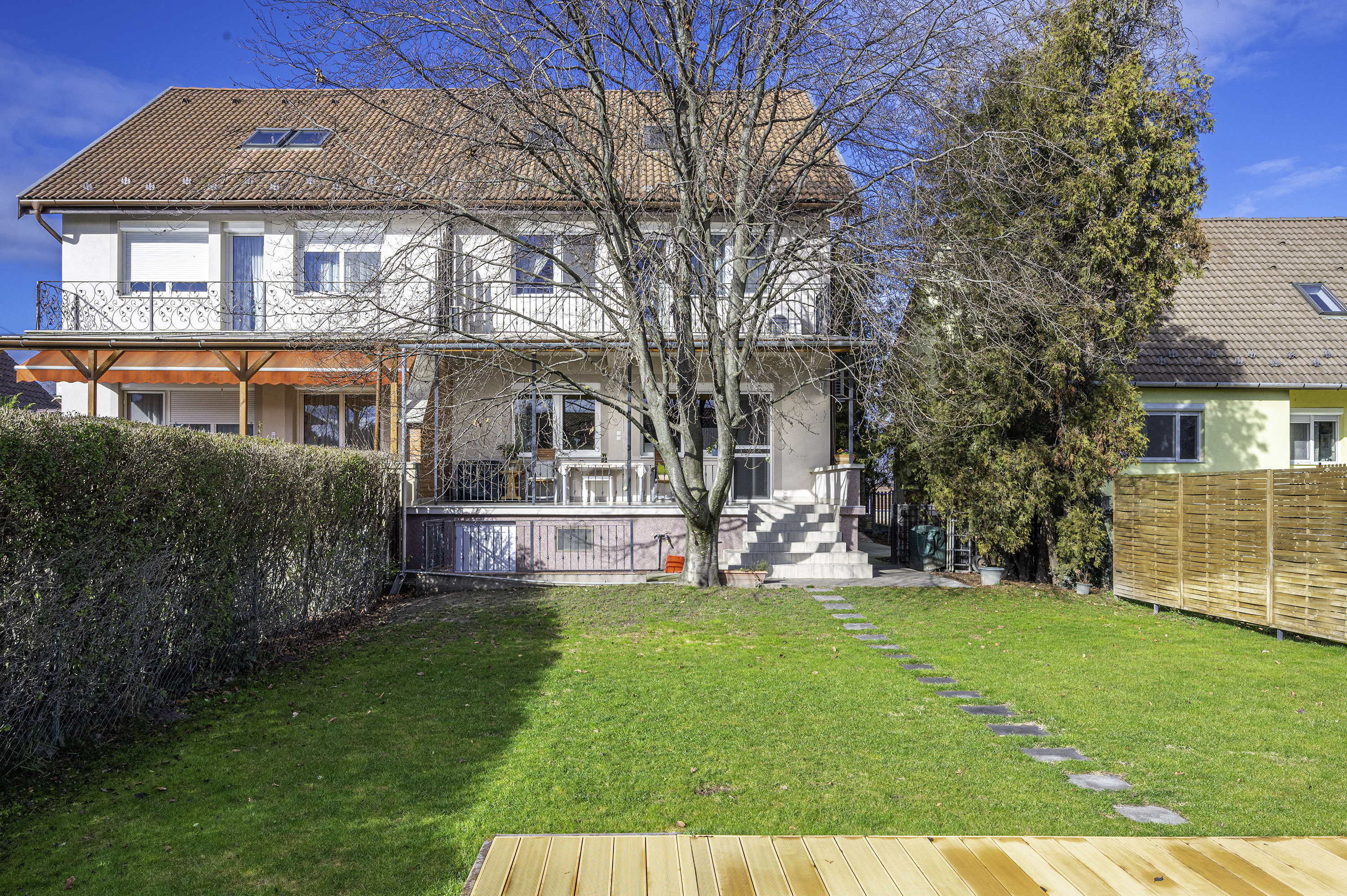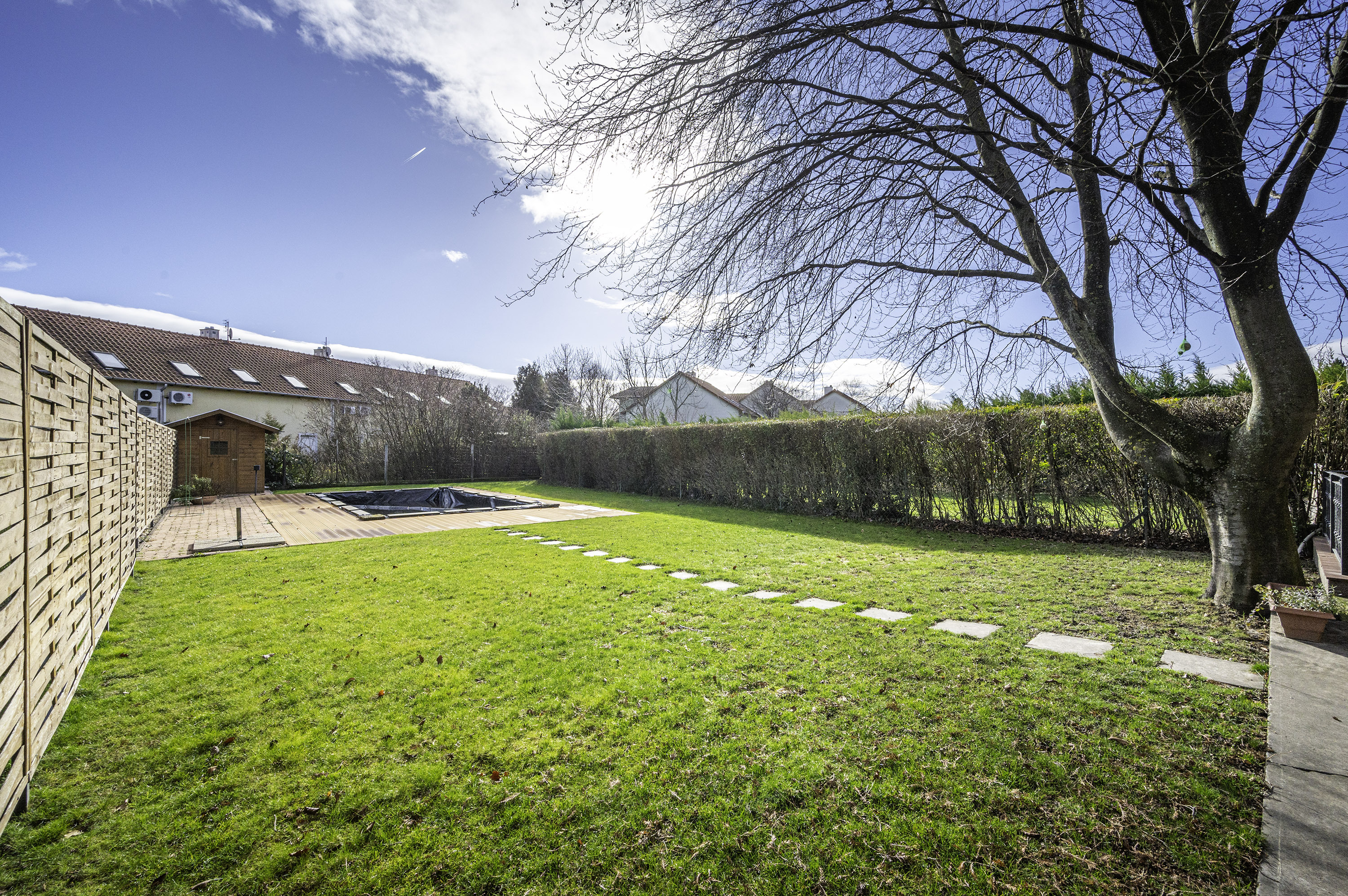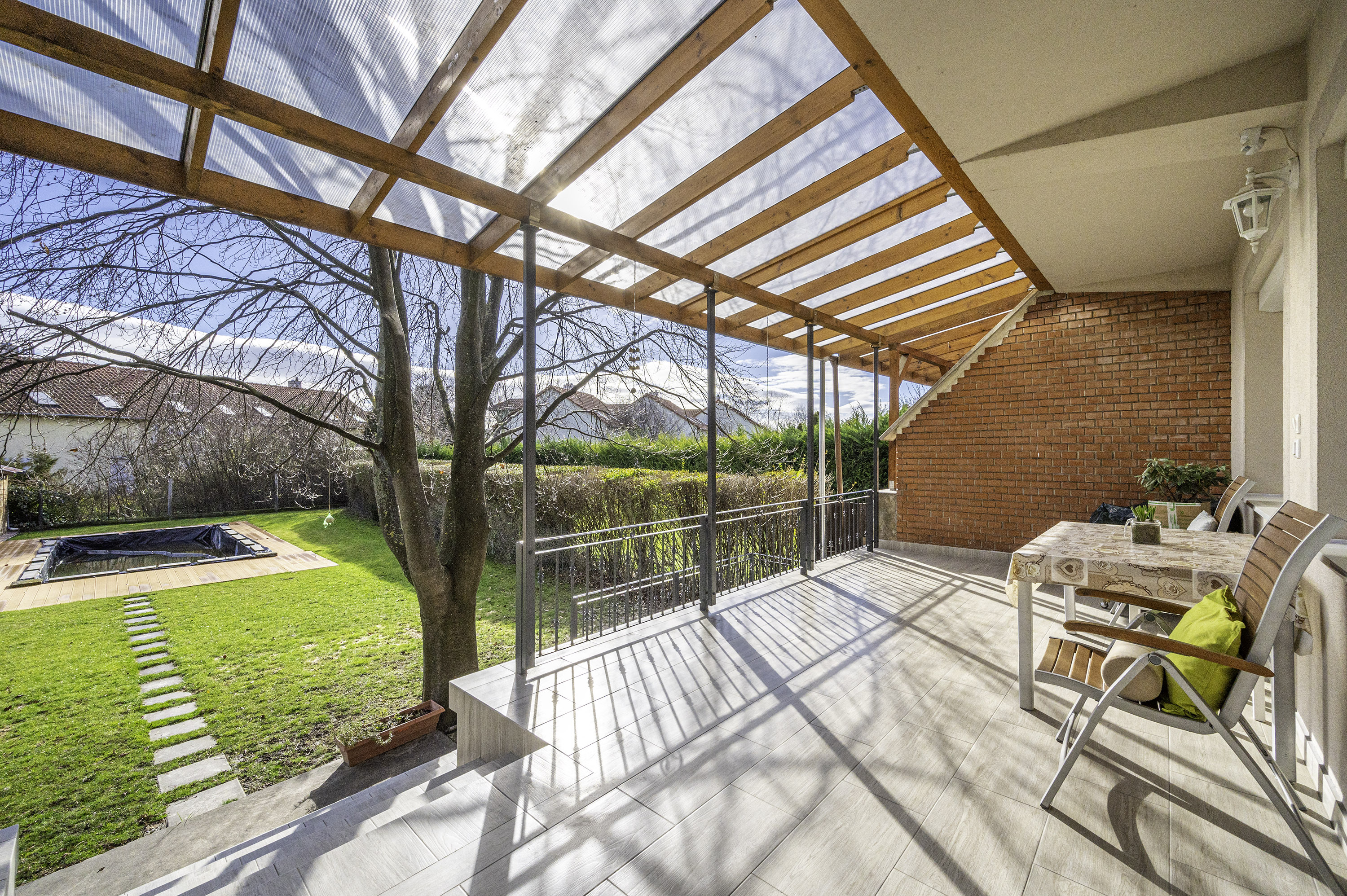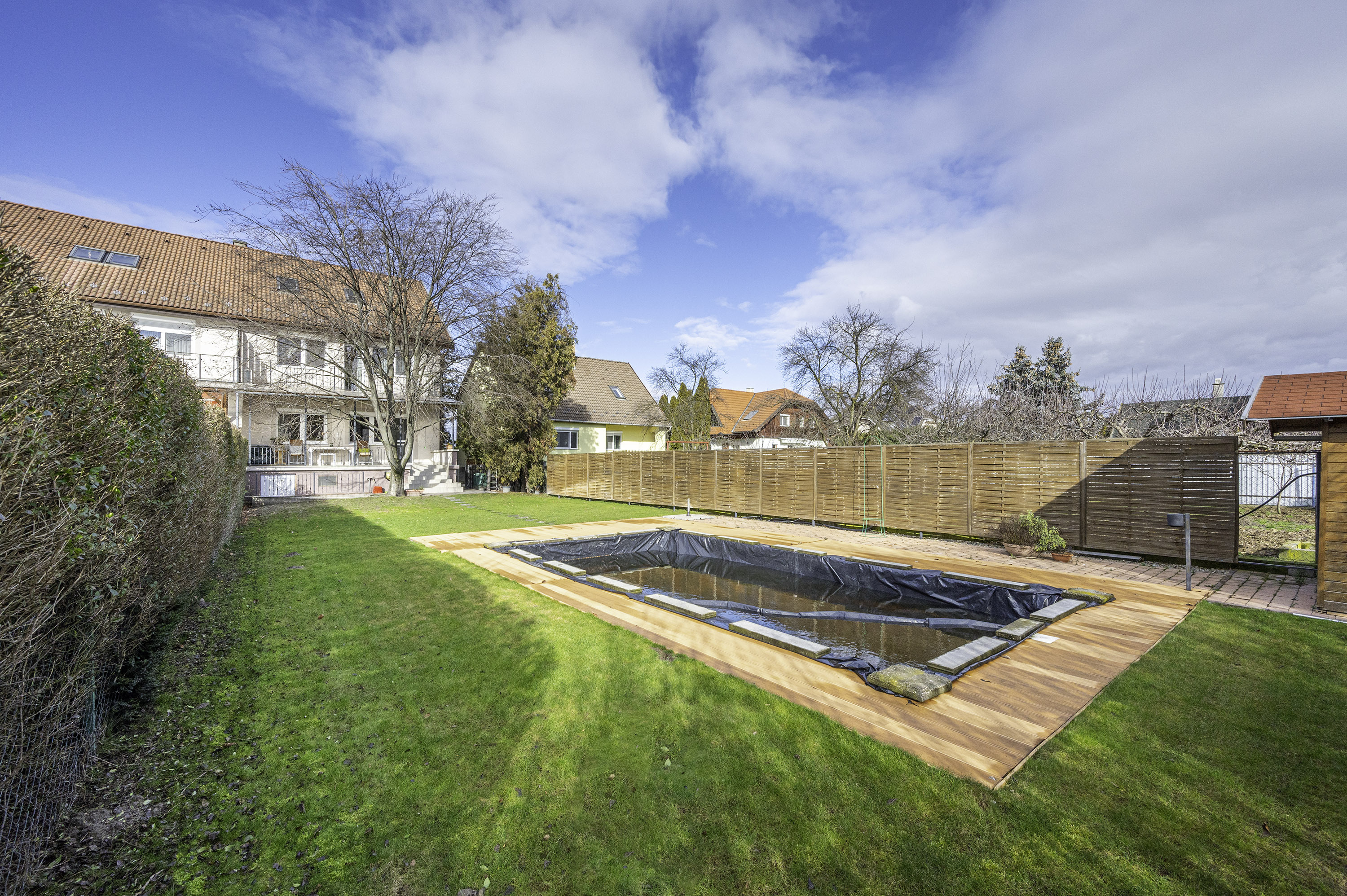 A hátsó kertben található egy nagyméretű 5 éve felújított terasz (20 m2), füvesített kertel és automata locsolórendszerrel, medencével.