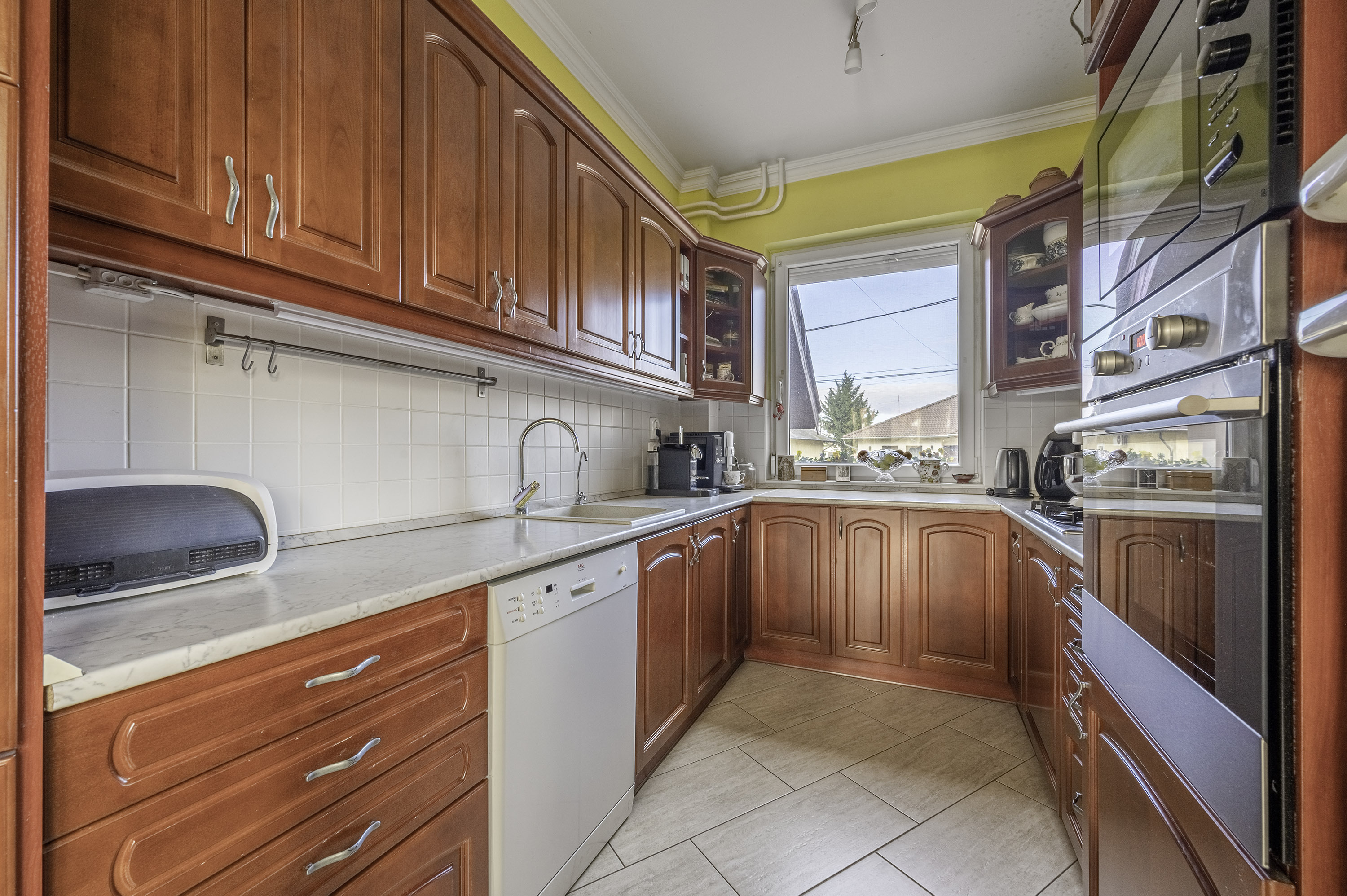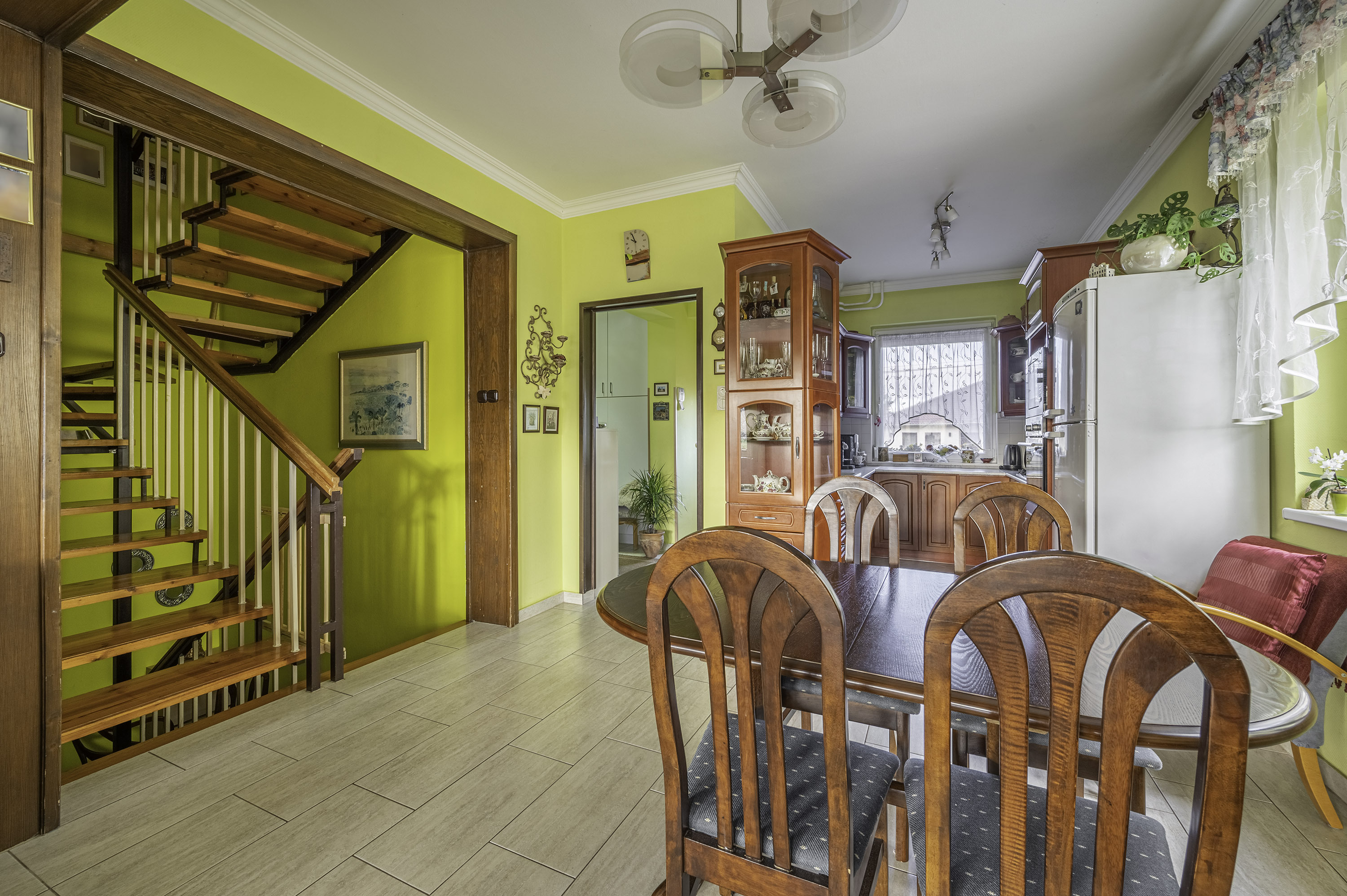 A ház alsó szintjén kapott helyet egy elszeparált ablakos világos étkező és egy konyha beépített gépekkel.