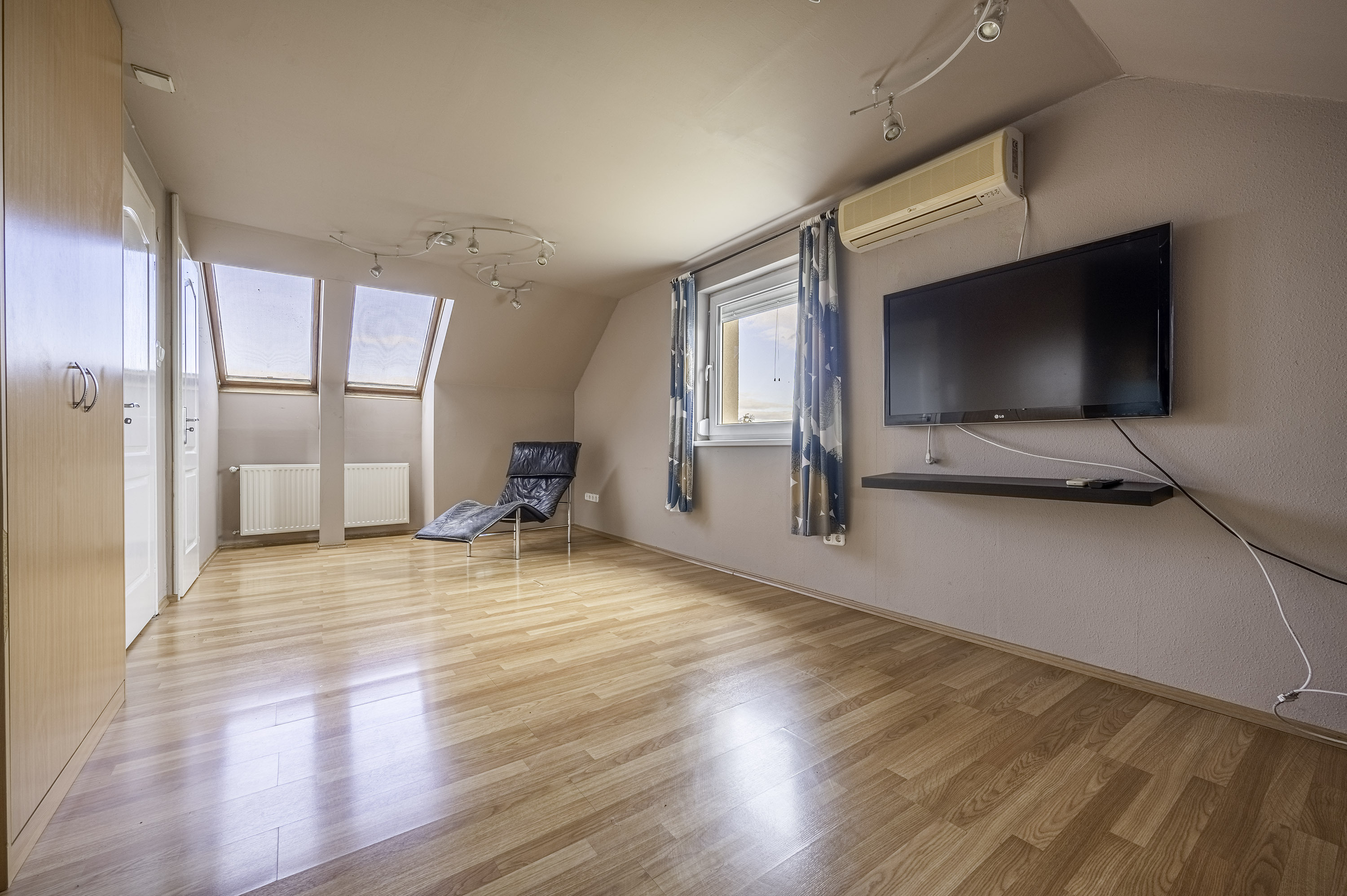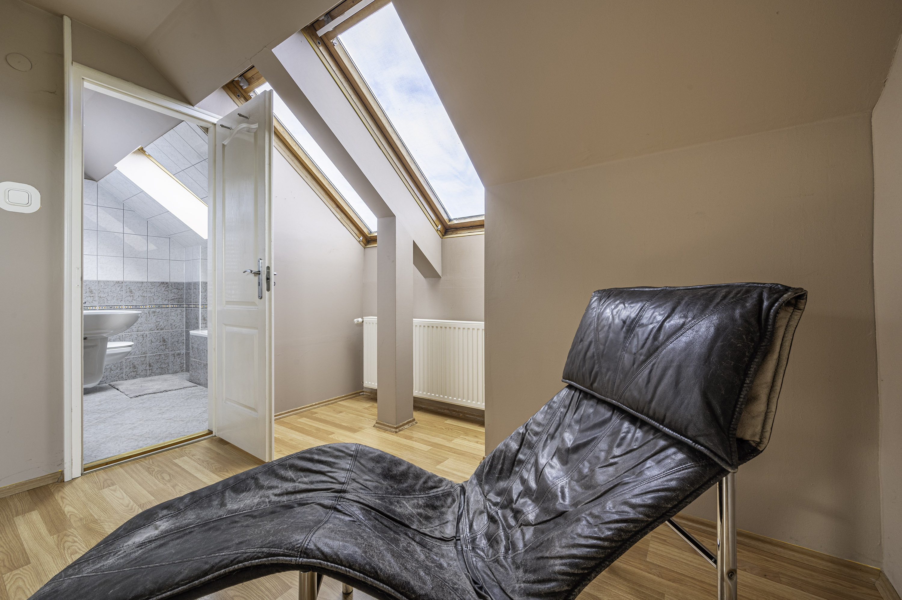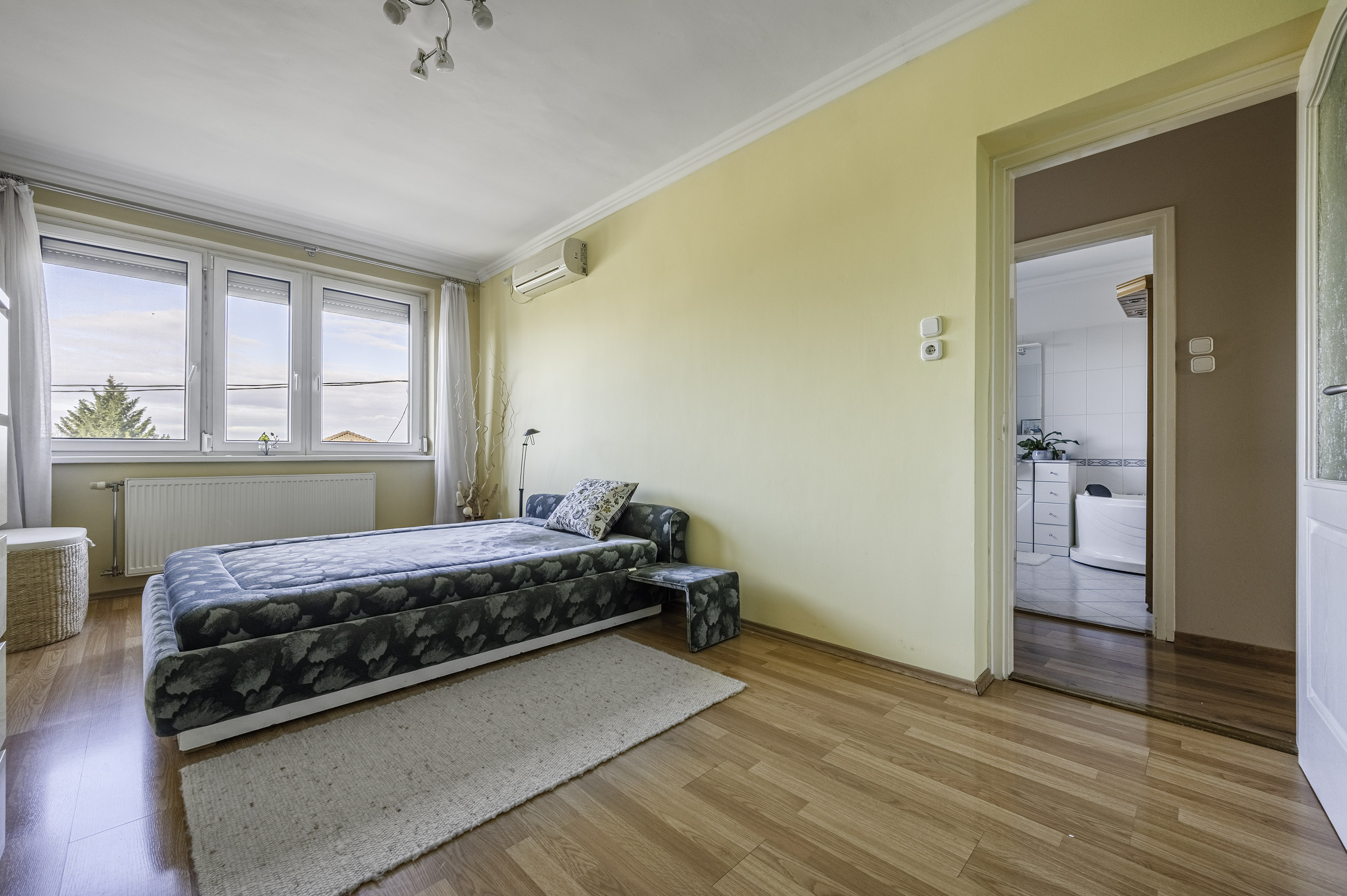 A tetőtérben kialakításra került egy tágas szoba (20m2) és egy hozzátartozó fürdőszoba káddal.
