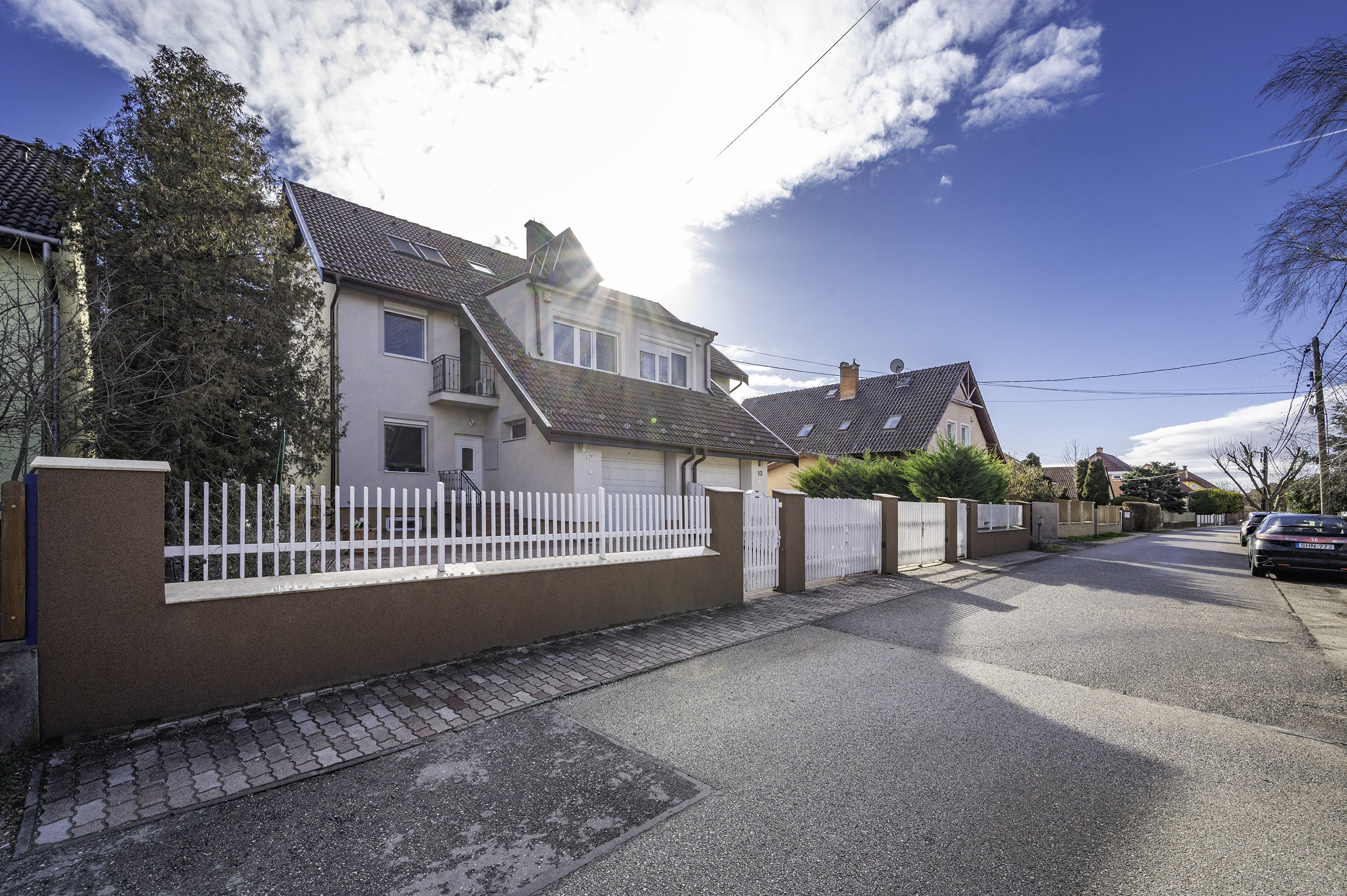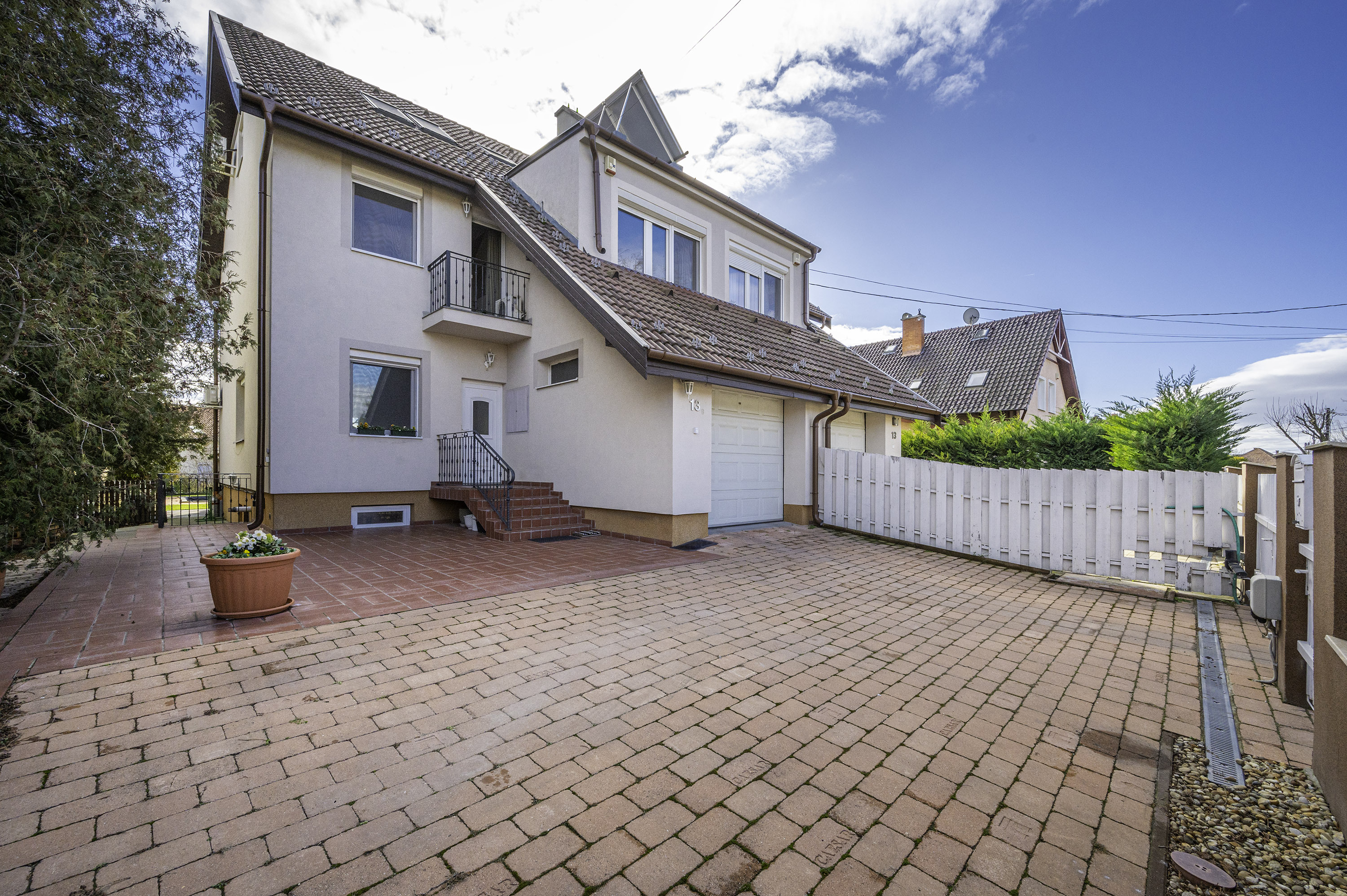 A házhoz tartozik még egy fedett garázs aknával (16,5 m2). Az első kertrészben több autó számára is van parkolóhely. A garázs és a kapú elektromosan nyílik.