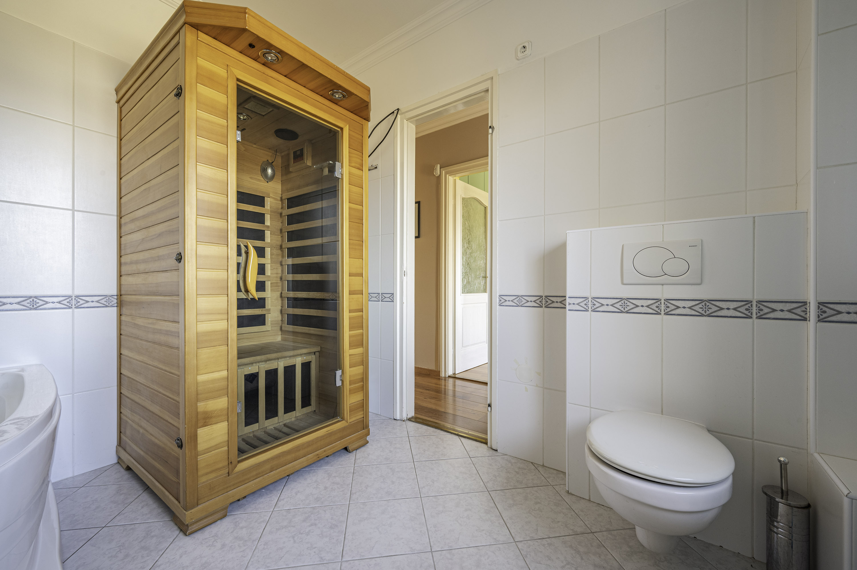 Az emeleti fürdőszobában egy szauna biztosítja a kikapcsolódást.