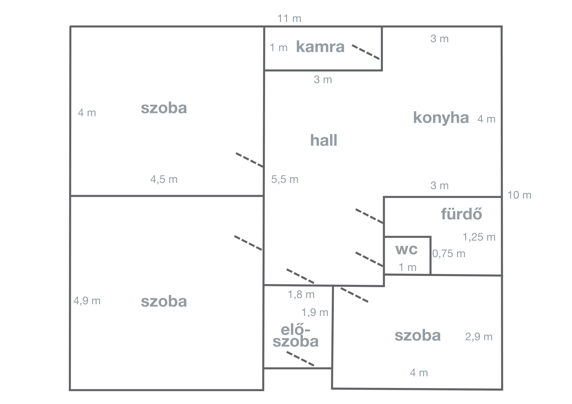 A ház helyiségei: 3 szoba, hall, konyha étkezővel, spájz, fürdőszoba, külön wc.
