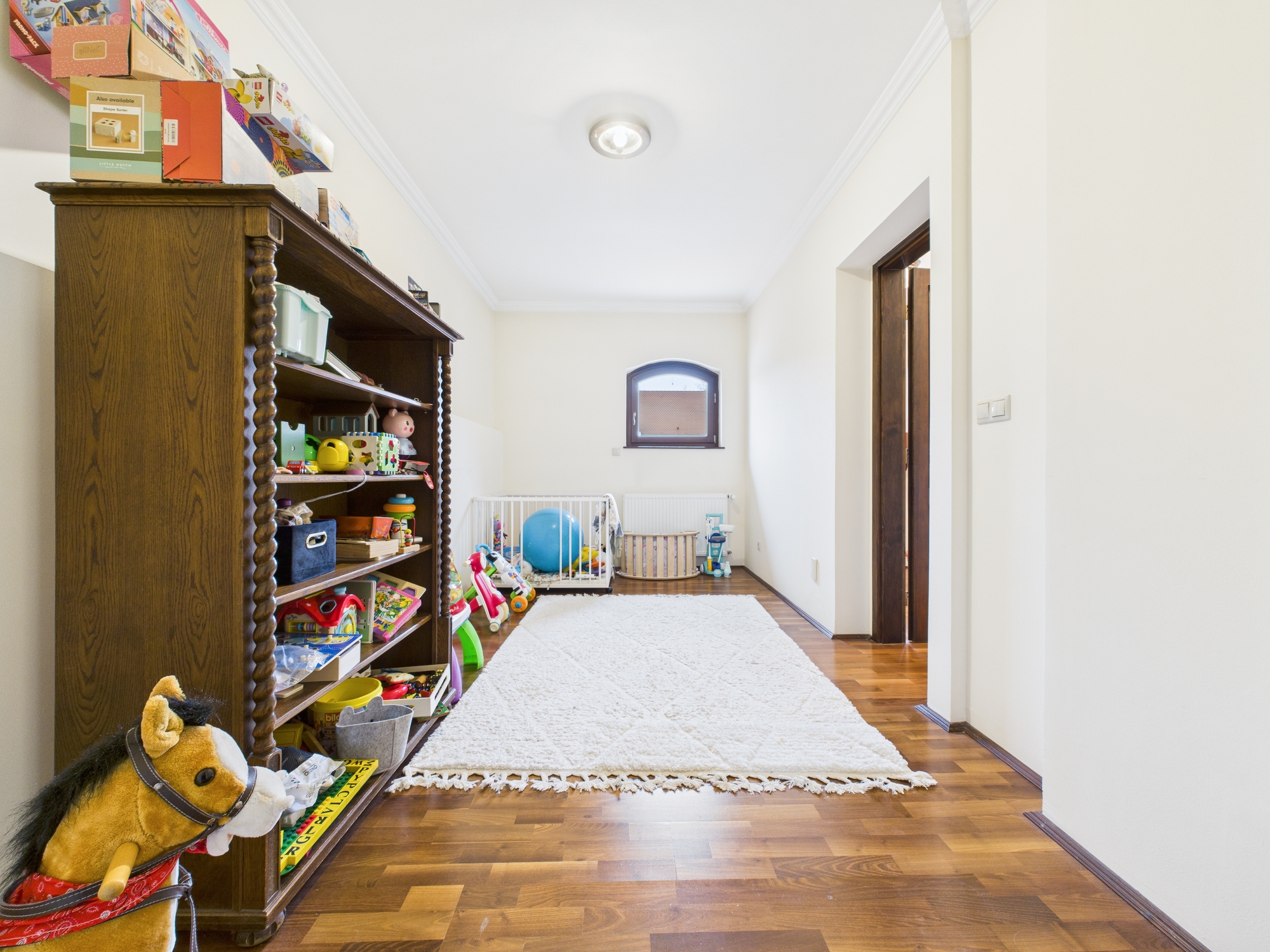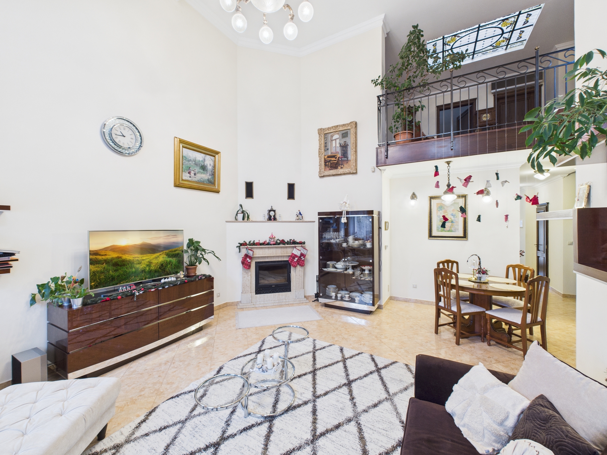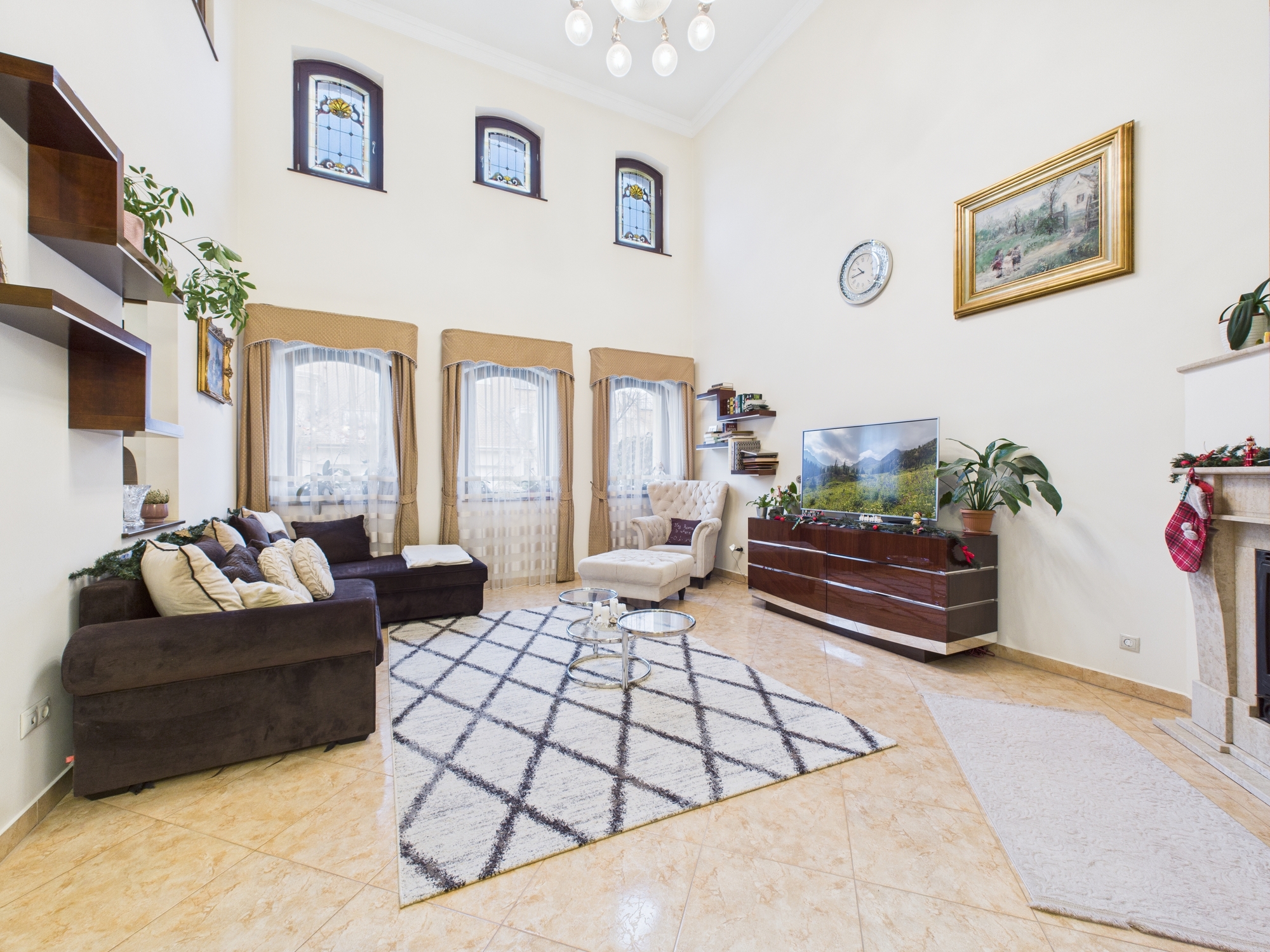 A nappali galériás kialakítású, nagy belmagasságú, ami világos, exkluzív térérzetet biztosít. A 32 m²-es fedett terasz a hátsó kert felé nyílik, ahol kültéri konyha és épített grill került kialakításra – ideális családi és baráti összejövetelekhez.
