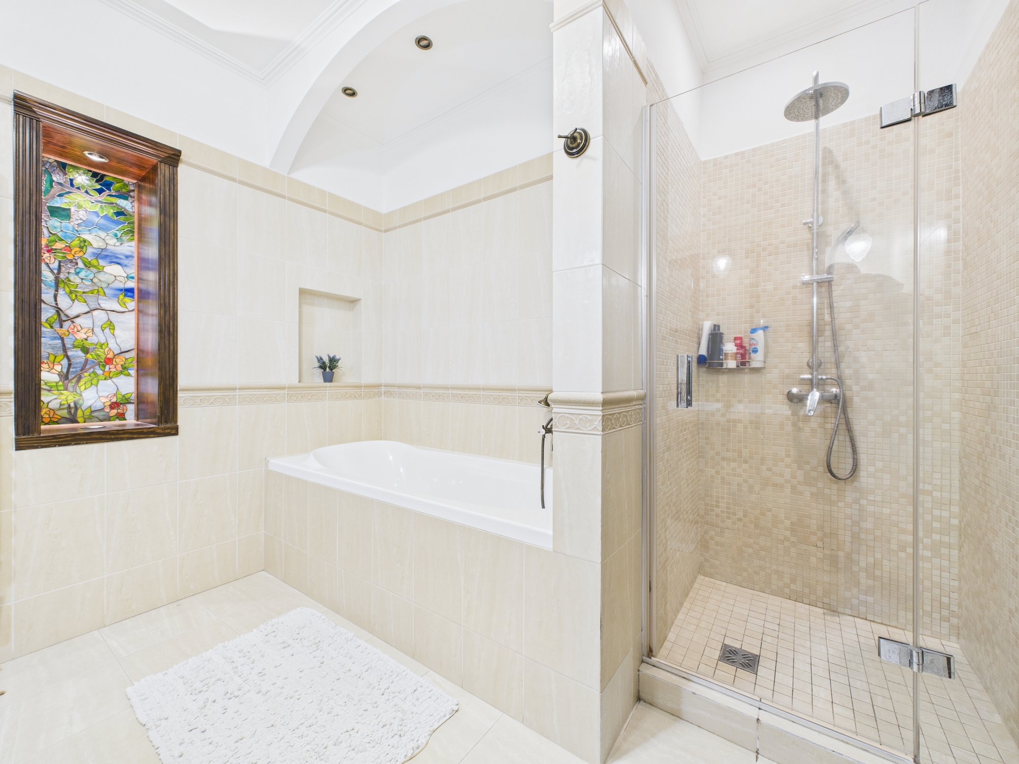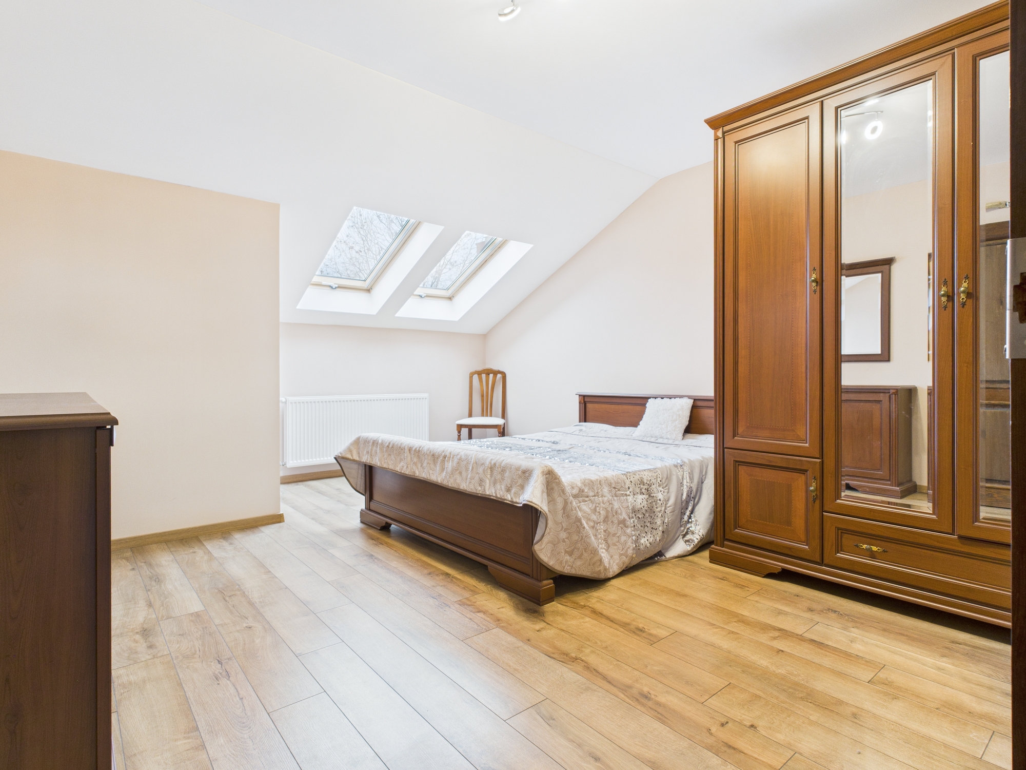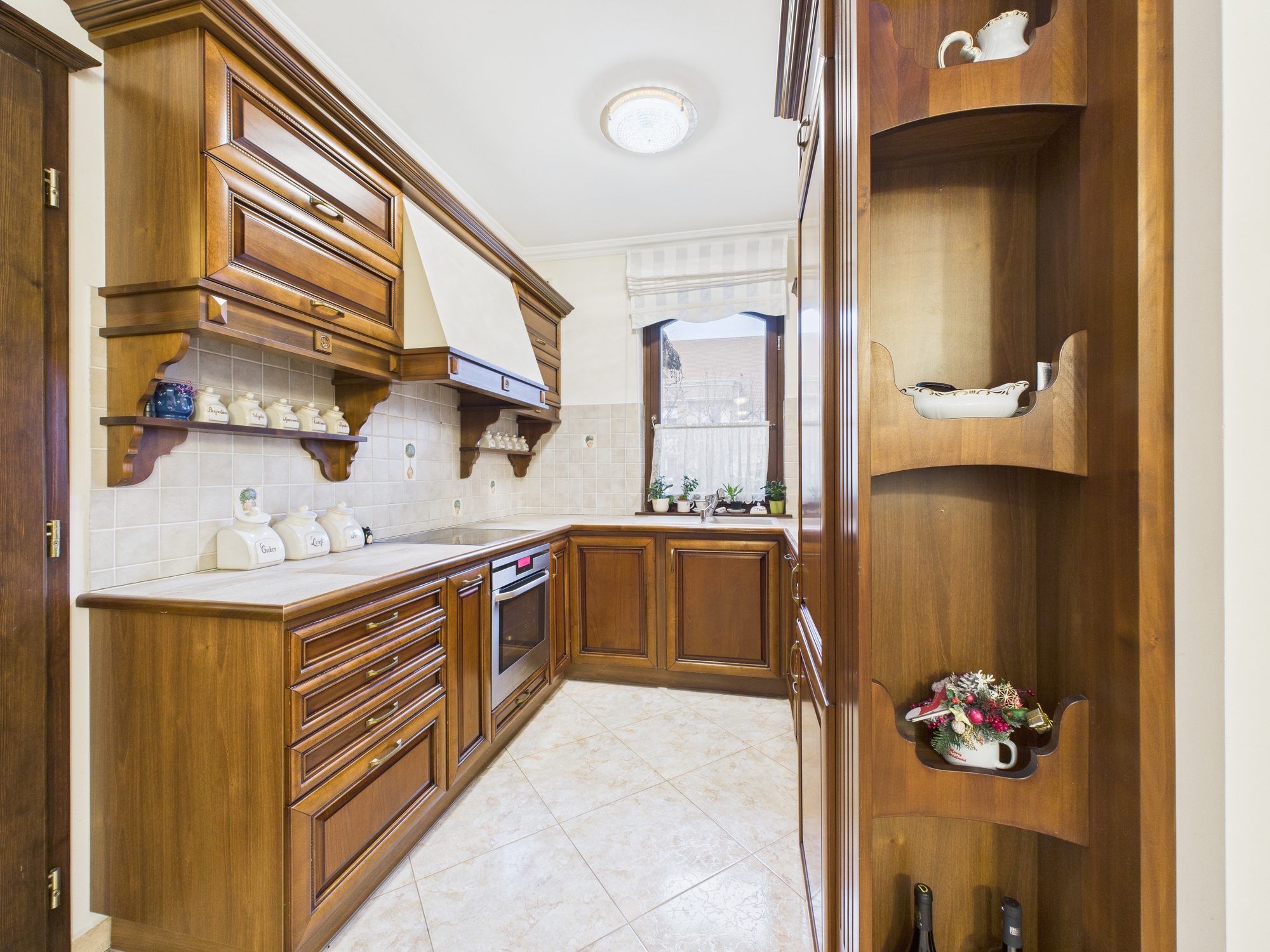 A nappali galériás kialakítású, nagy belmagasságú, ami világos, exkluzív térérzetet biztosít. A 32 m²-es fedett terasz a hátsó kert felé nyílik, ahol kültéri konyha és épített grill került kialakításra – ideális családi és baráti összejövetelekhez.