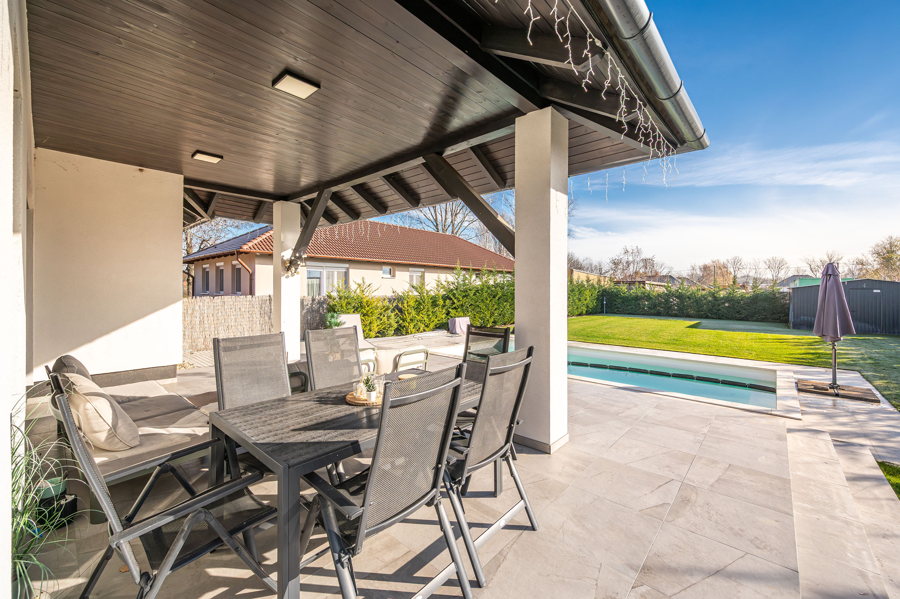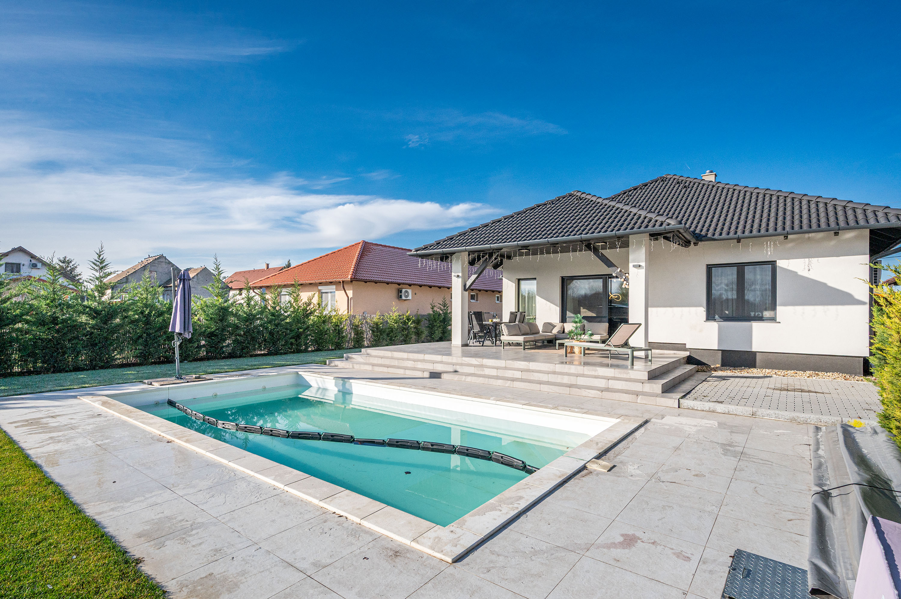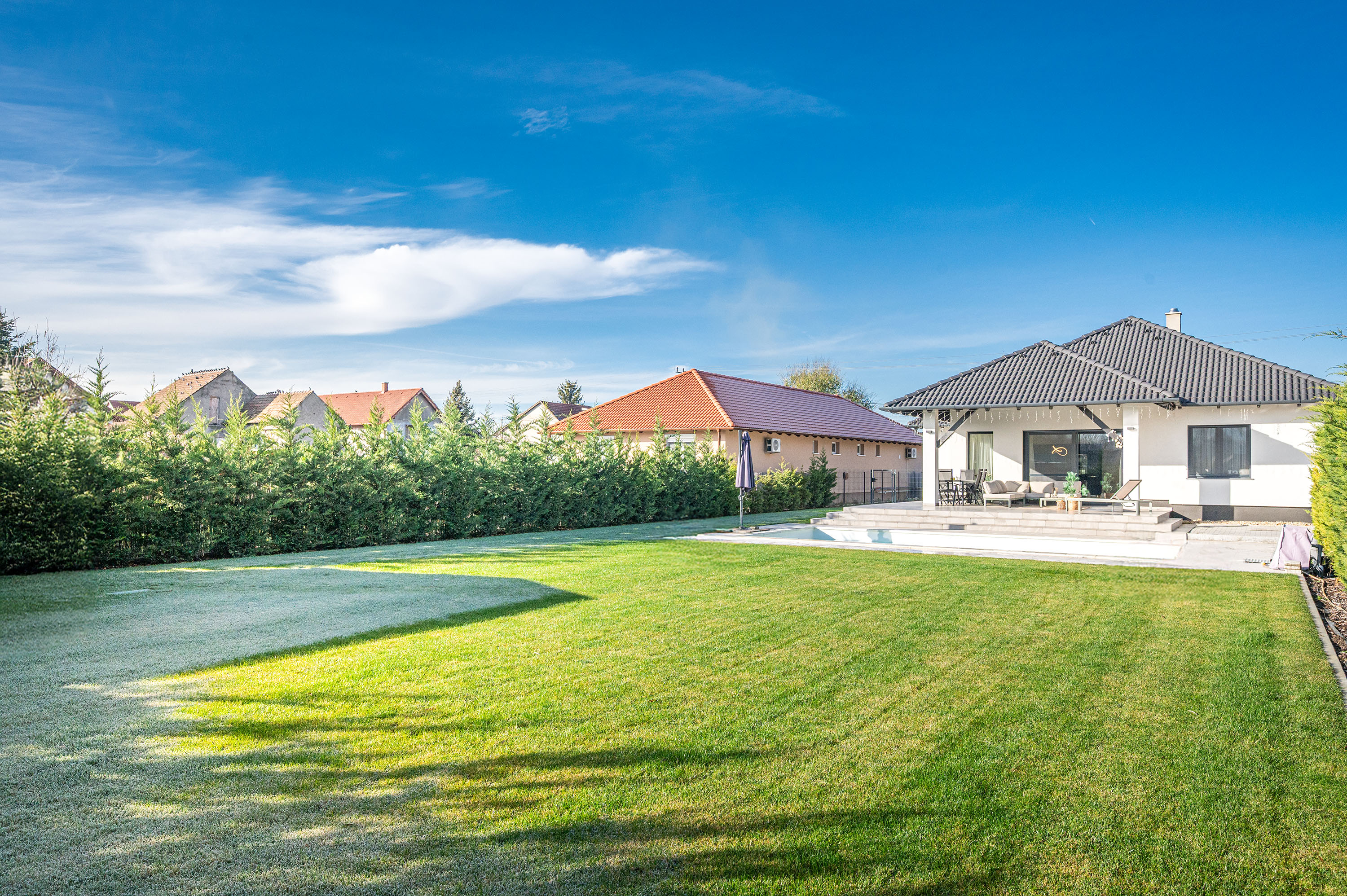 Ha olyan otthont keresel, ahol az év nagy részében a saját medencédben csobbanhatsz és kompromisszumok nélkül élvezheted a modern technológia és kényelem minden előnyét – akkor ez a 2023-ban műszakilag átadott, bruttó 261 m²-es, napelemekkel ellátott medencés családi ház Nektek épült!