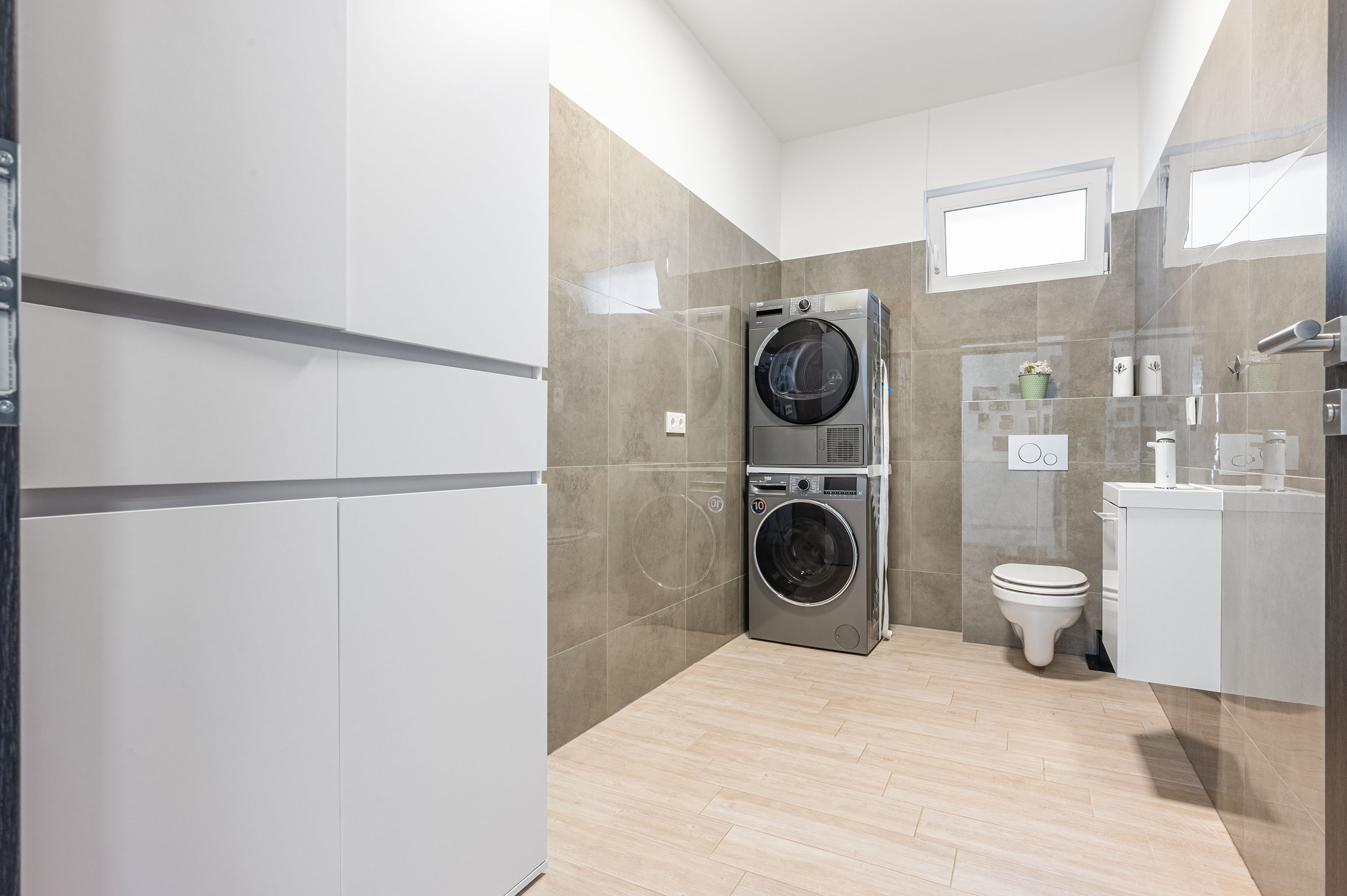 o Mosókonyha, gépház, padlófűtéses garázs. Mosókonyhában egy harmadik WC és kézmosó