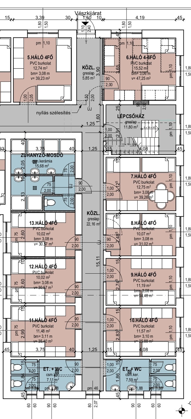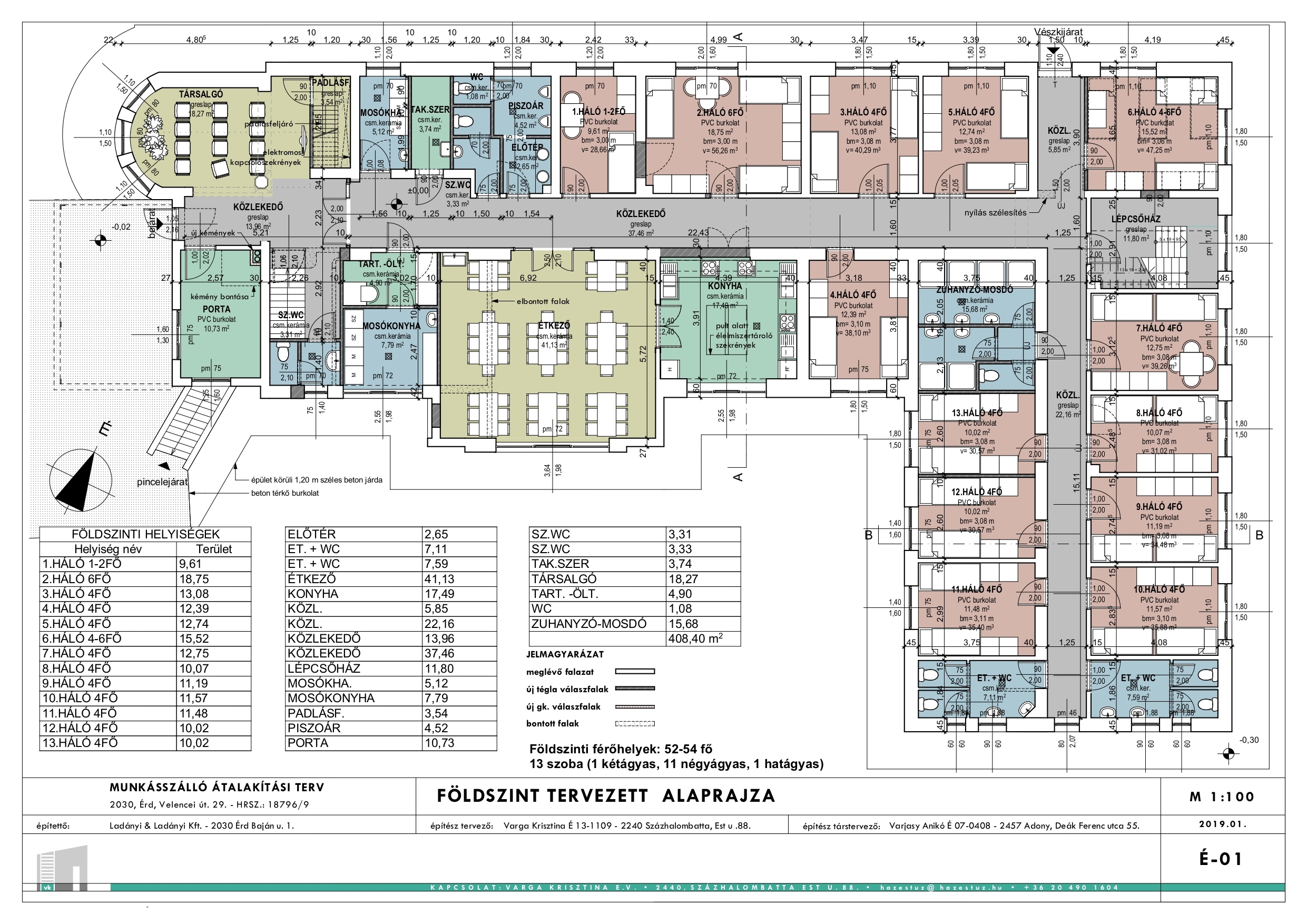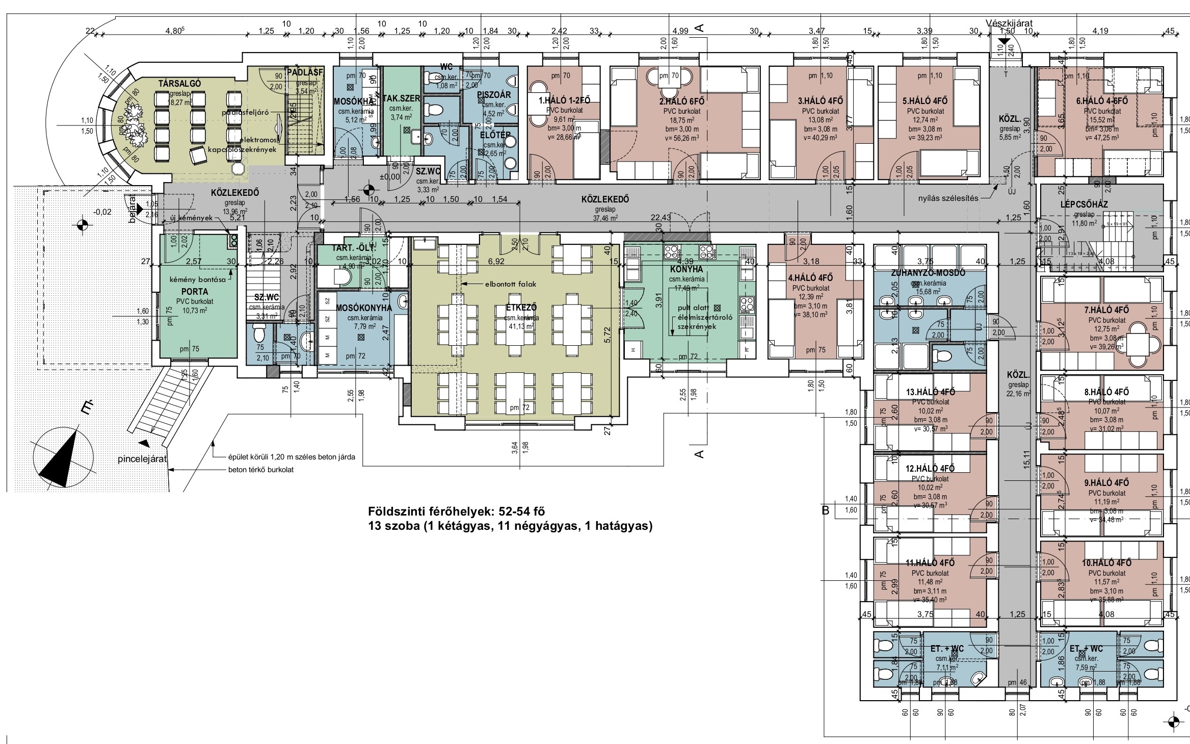 - Földszint: 408 nm, 20 szoba, üzemi konyha, ebédlő, porta, mosókonyhák, személyzeti, zuhanyzó és mellékhelyiség egységek